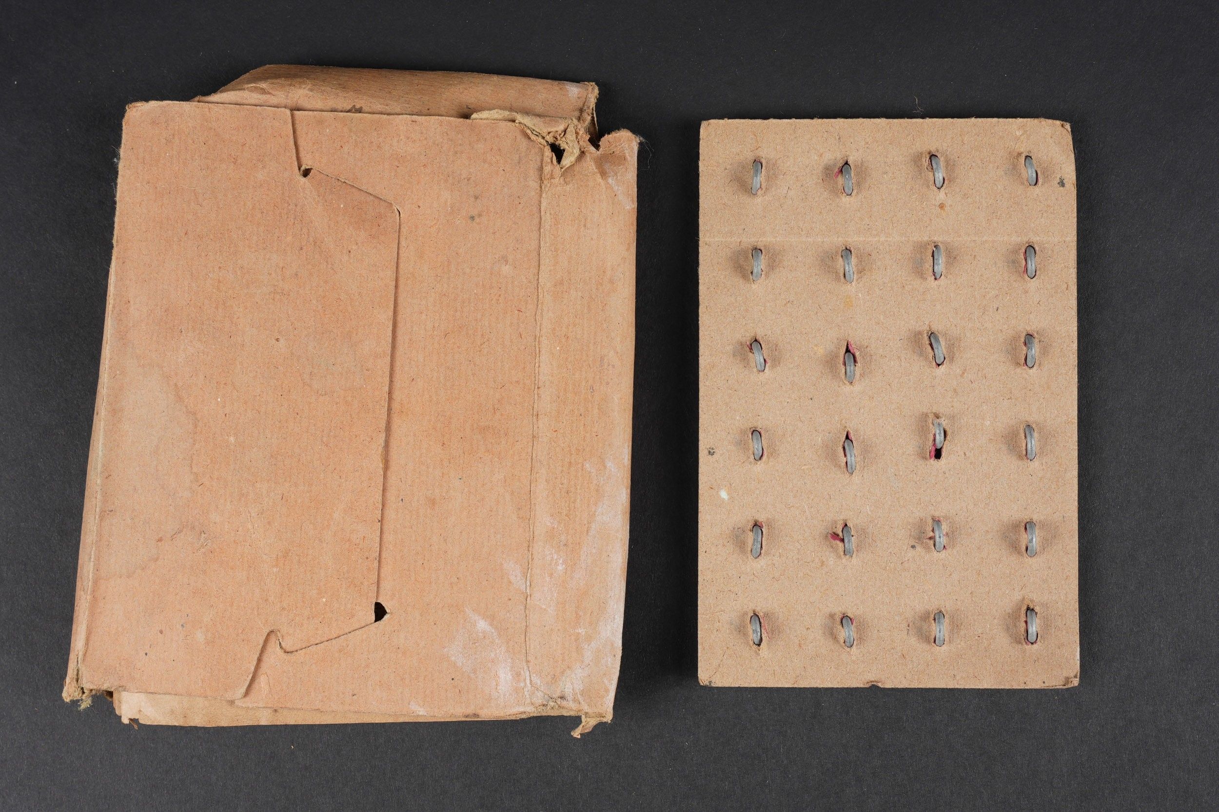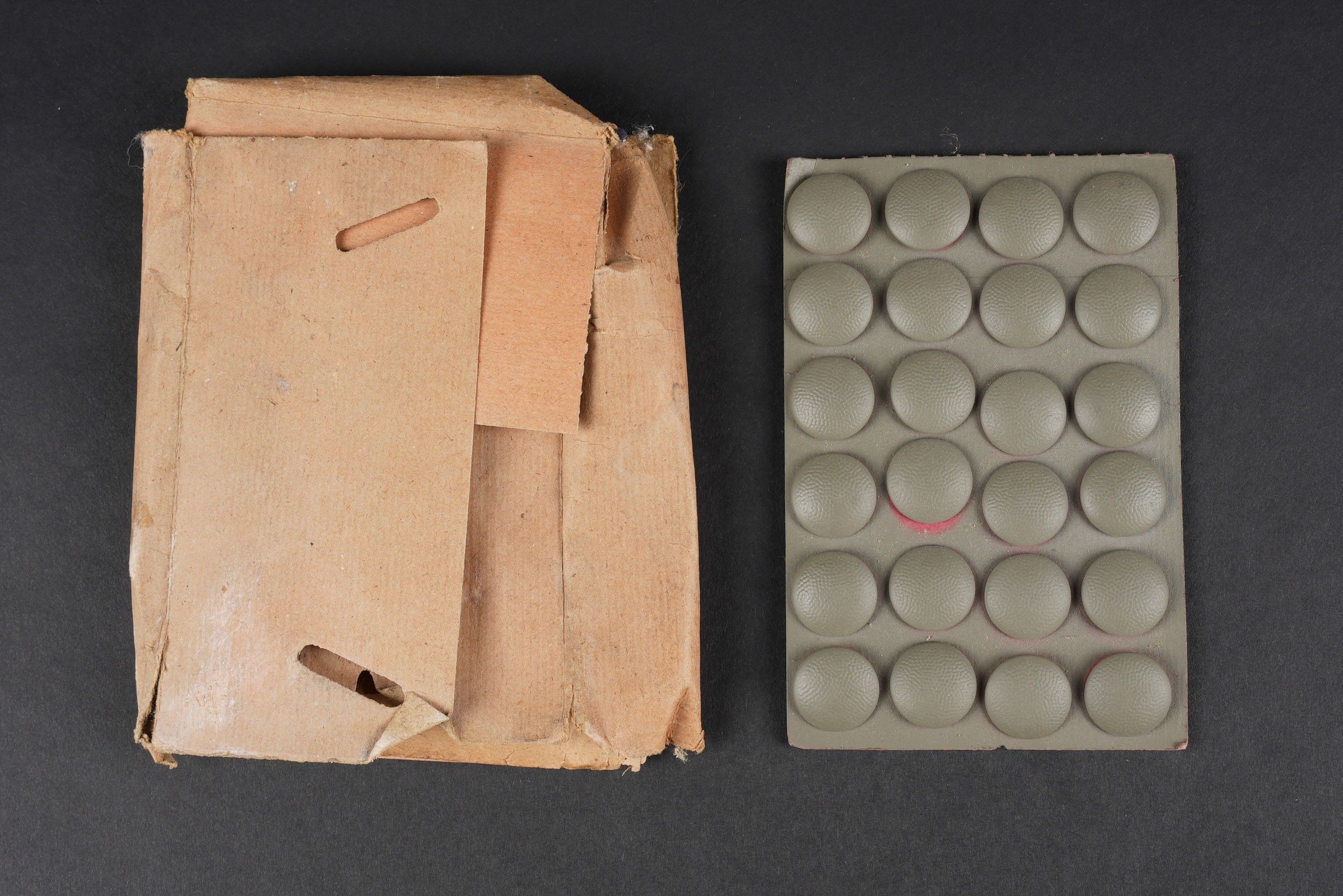German buttons. Remainder of cardboard envelope, containing a plate of 24 metal buttons, 100% original colour. Some wear and patina. Condition II+. German buttons. Remnant of a cardboard envelope containing a plate of 24 pebbled metal buttons retaining 100% of their original colour. Some wear and patina on the piece. Condition II+