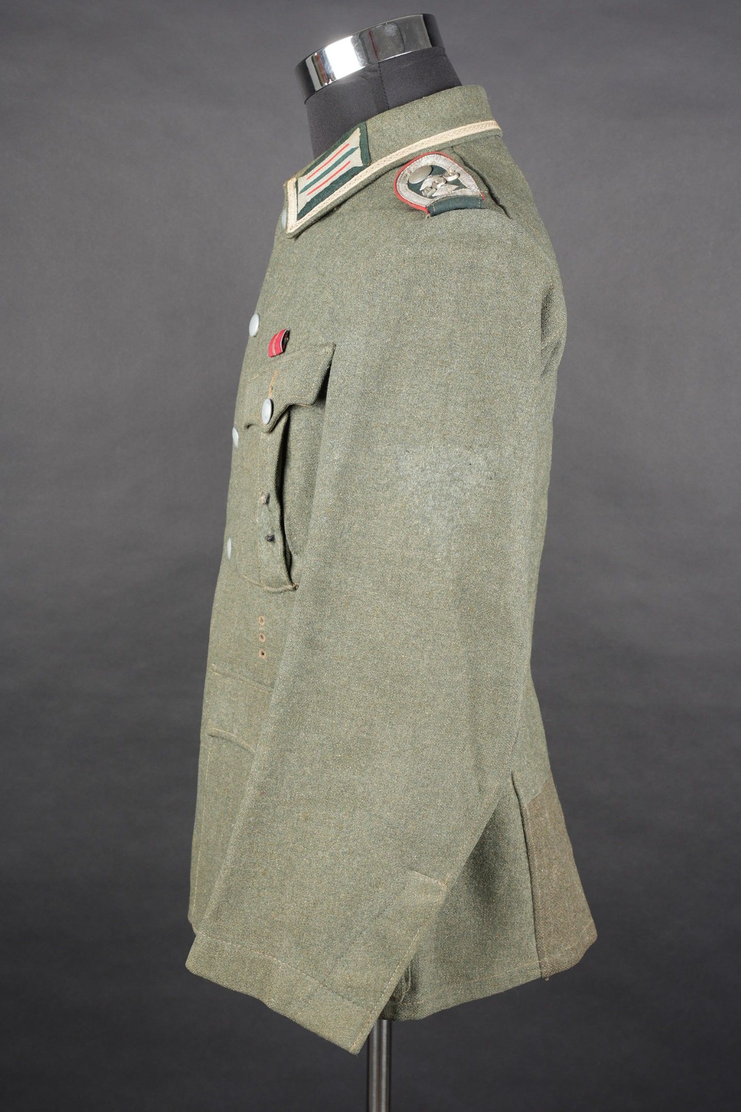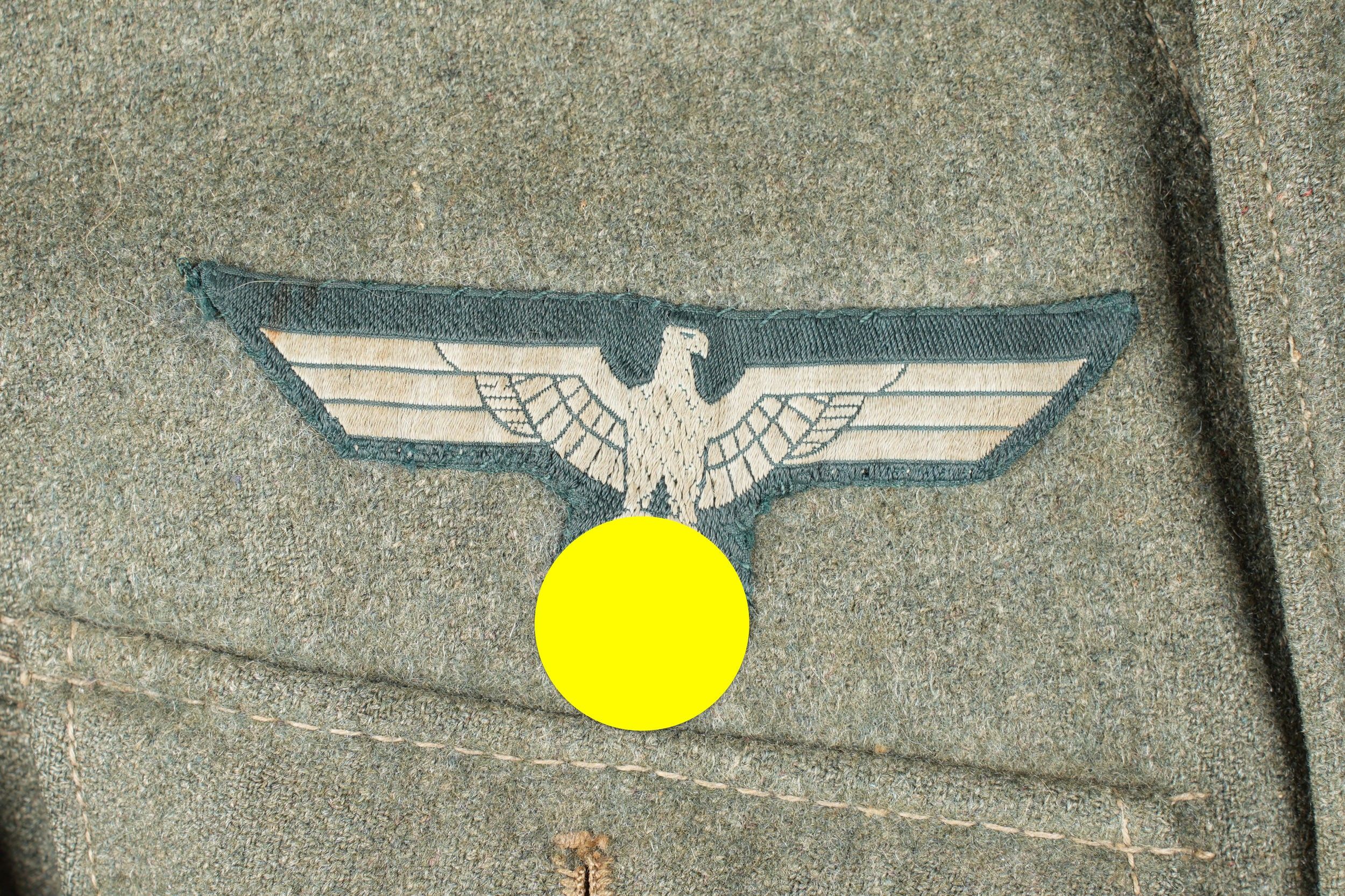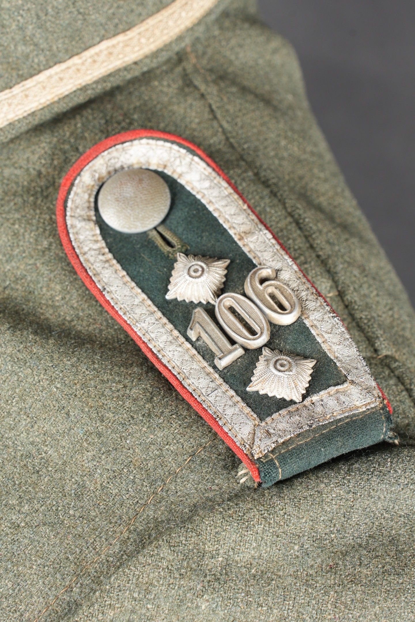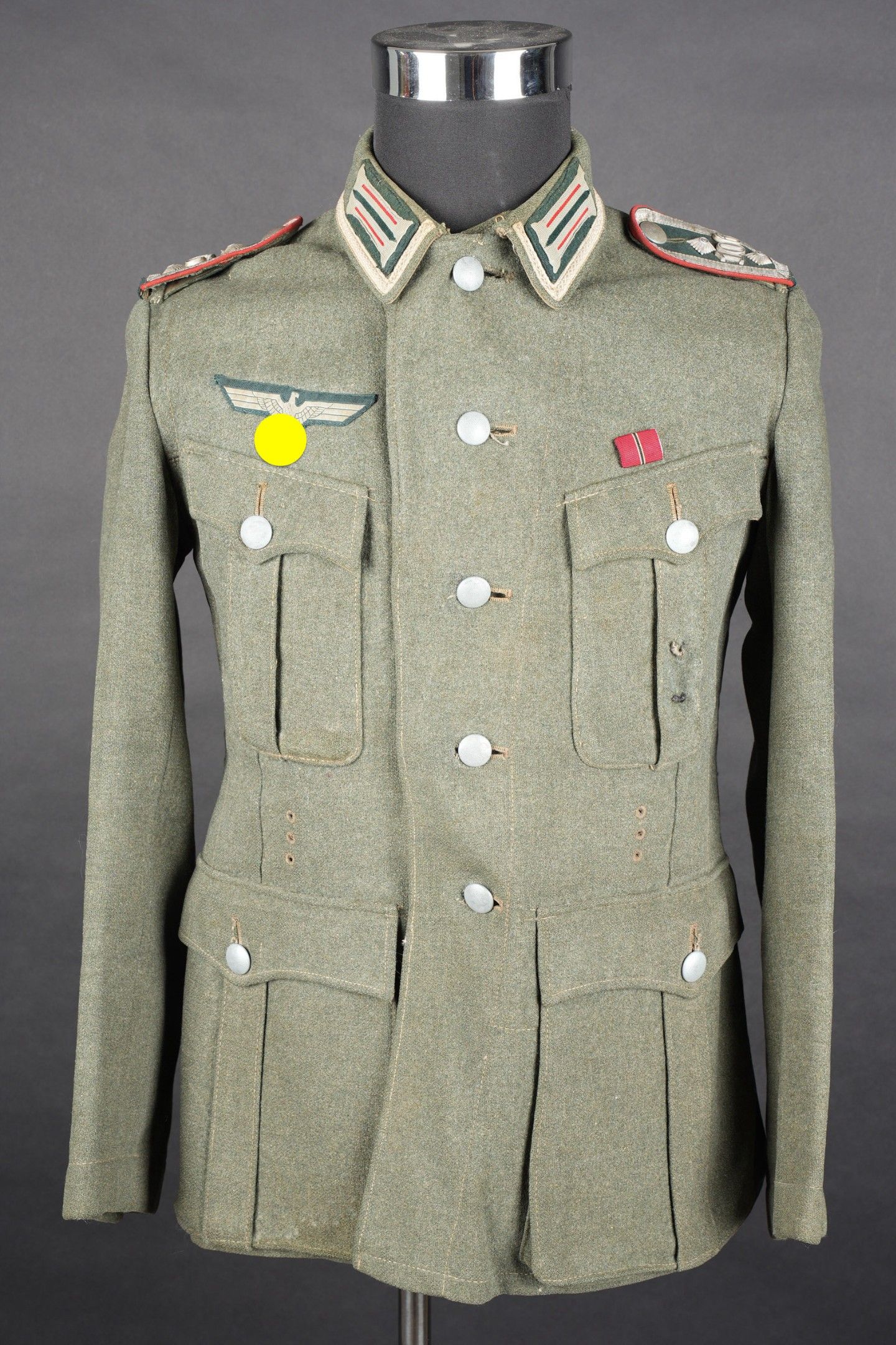 106th Heer Artillery Regiment jacket. Model 40, in Feldgrau cloth. All buttons present. Silver braid around the collar. Machine stitched artillery troop litzen. Two buttons are present under the collar. Oberfeldwebel shoulder tabs of the 106th artillery regiment. Hand-sewn Bevo chest eagle. Eastern Front Medal decoration flange. A decoration flange on the left breast pocket. Lined with brown cotton fabric. Indication of size 41 41 90 68 61 M41. Manufacturer's name partially illegible. Hand-stitched fireworks speciality badge on bottom left sleeve. There is some wear and patina to the item, as well as a few stains and discrete moth marks. Condition II+. Tunic of the 106th Artillery Regiment of the Heer, Model 40, in Feldgrau cloth. All buttons present. Silver braid around the collar. Machine-sewn artillery litzen. Two collar buttons present. Shoulder boards of an Oberfeldwebel of the 106th Artillery Regiment. Hand-sewn Bevo breast eagle. Ribbon bar for the Eastern Front Medal and another decoration bar above the left breast pocket. Brown cotton-lined interior with partially legible size markings 41 41 90 68 61 M41. Partially illegible maker marking. Artificer specialty patch hand-sewn at the lower left sleeve. Some wear and patina on the piece with light stains and moth traces. Condition II+