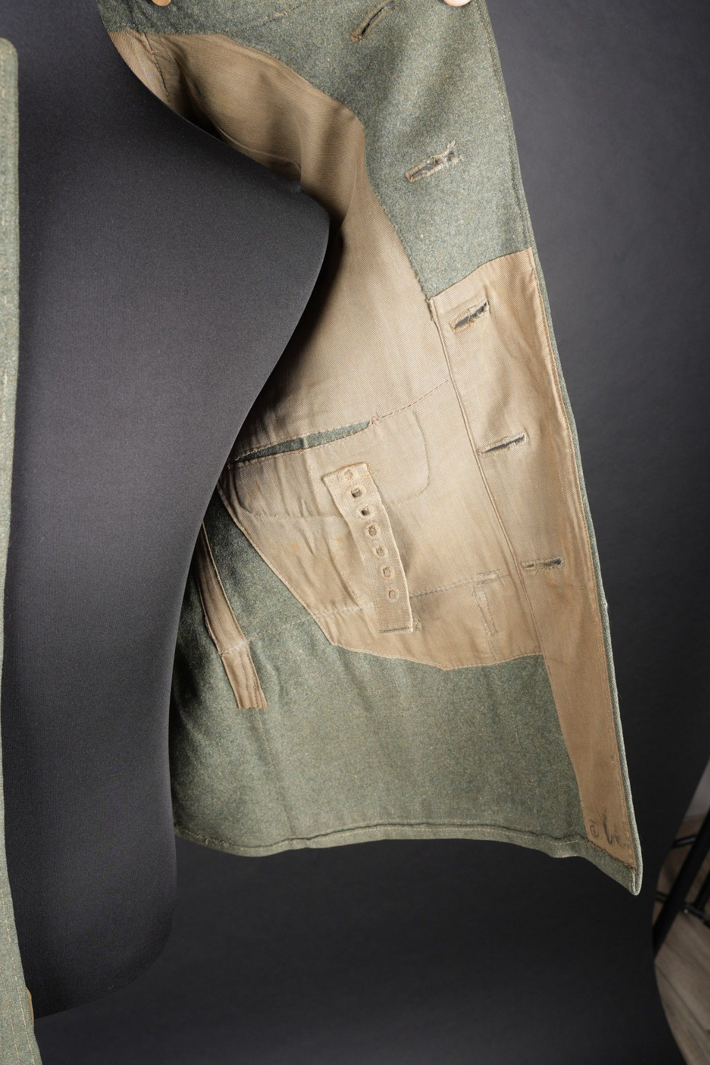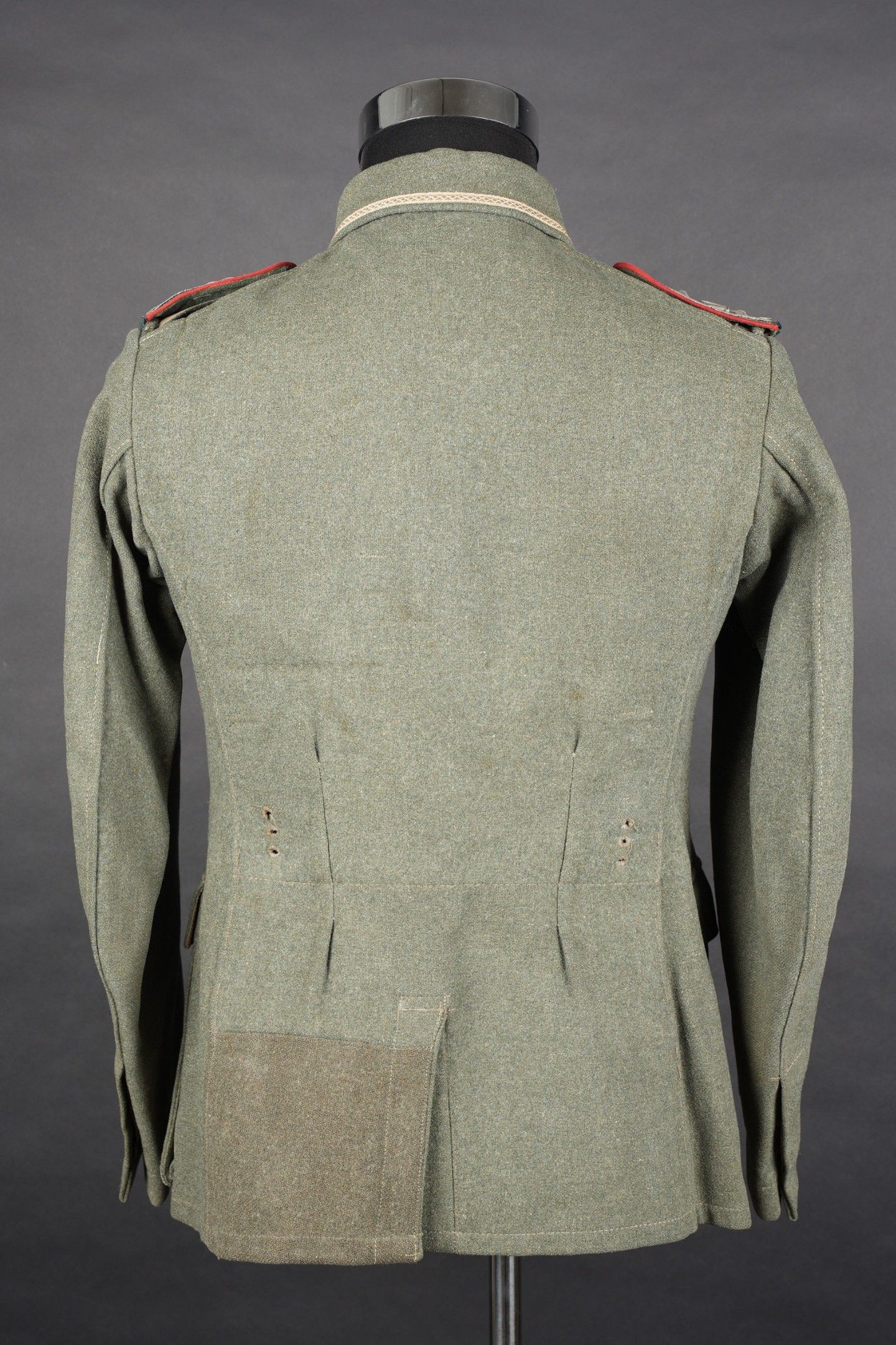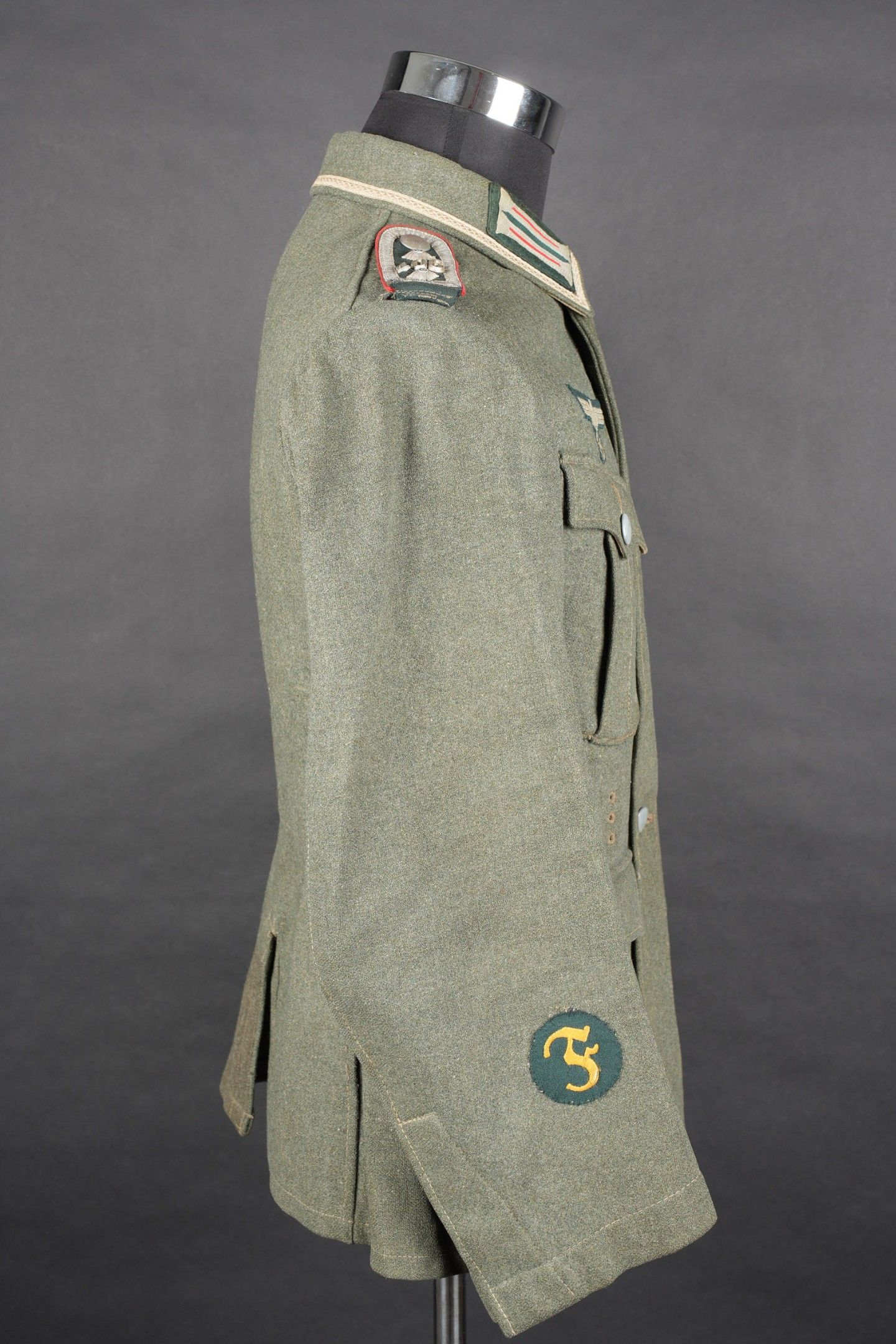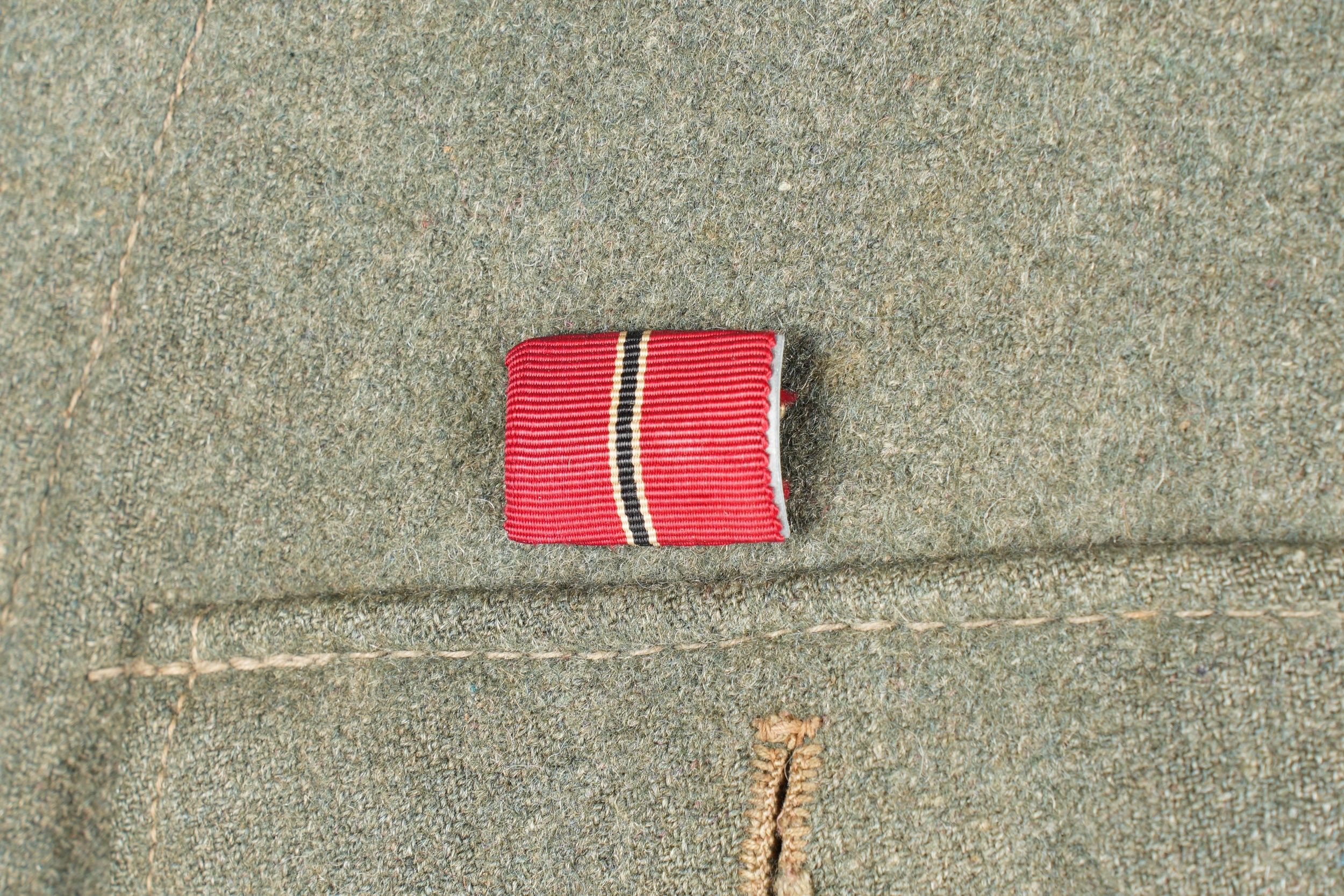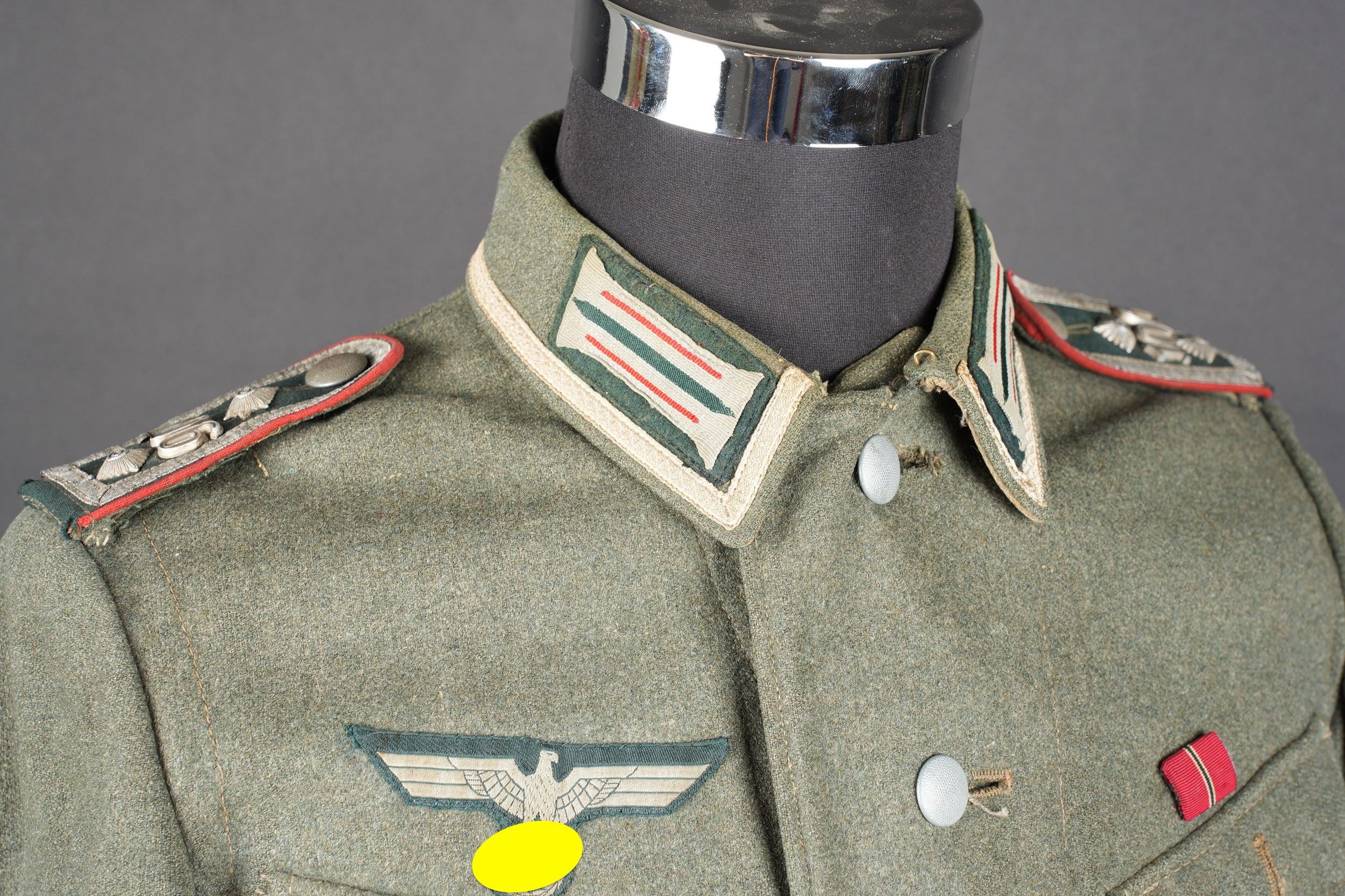 106th Heer Artillery Regiment jacket. Model 40, in Feldgrau cloth. All buttons present. Silver braid around the collar. Machine stitched artillery troop litzen. Two buttons are present under the collar. Oberfeldwebel shoulder tabs of the 106th artillery regiment. Hand-sewn Bevo chest eagle. Eastern Front Medal decoration flange. A decoration flange on the left breast pocket. Lined with brown cotton fabric. Indication of size 41 41 90 68 61 M41. Manufacturer's name partially illegible. Hand-stitched fireworks speciality badge on bottom left sleeve. There is some wear and patina to the item, as well as a few stains and discrete moth marks. Condition II+. Tunic of the 106th Artillery Regiment of the Heer, Model 40, in Feldgrau cloth. All buttons present. Silver braid around the collar. Machine-sewn artillery litzen. Two collar buttons present. Shoulder boards of an Oberfeldwebel of the 106th Artillery Regiment. Hand-sewn Bevo breast eagle. Ribbon bar for the Eastern Front Medal and another decoration bar above the left breast pocket. Brown cotton-lined interior with partially legible size markings 41 41 90 68 61 M41. Partially illegible maker marking. Artificer specialty patch hand-sewn at the lower left sleeve. Some wear and patina on the piece with light stains and moth traces. Condition II+