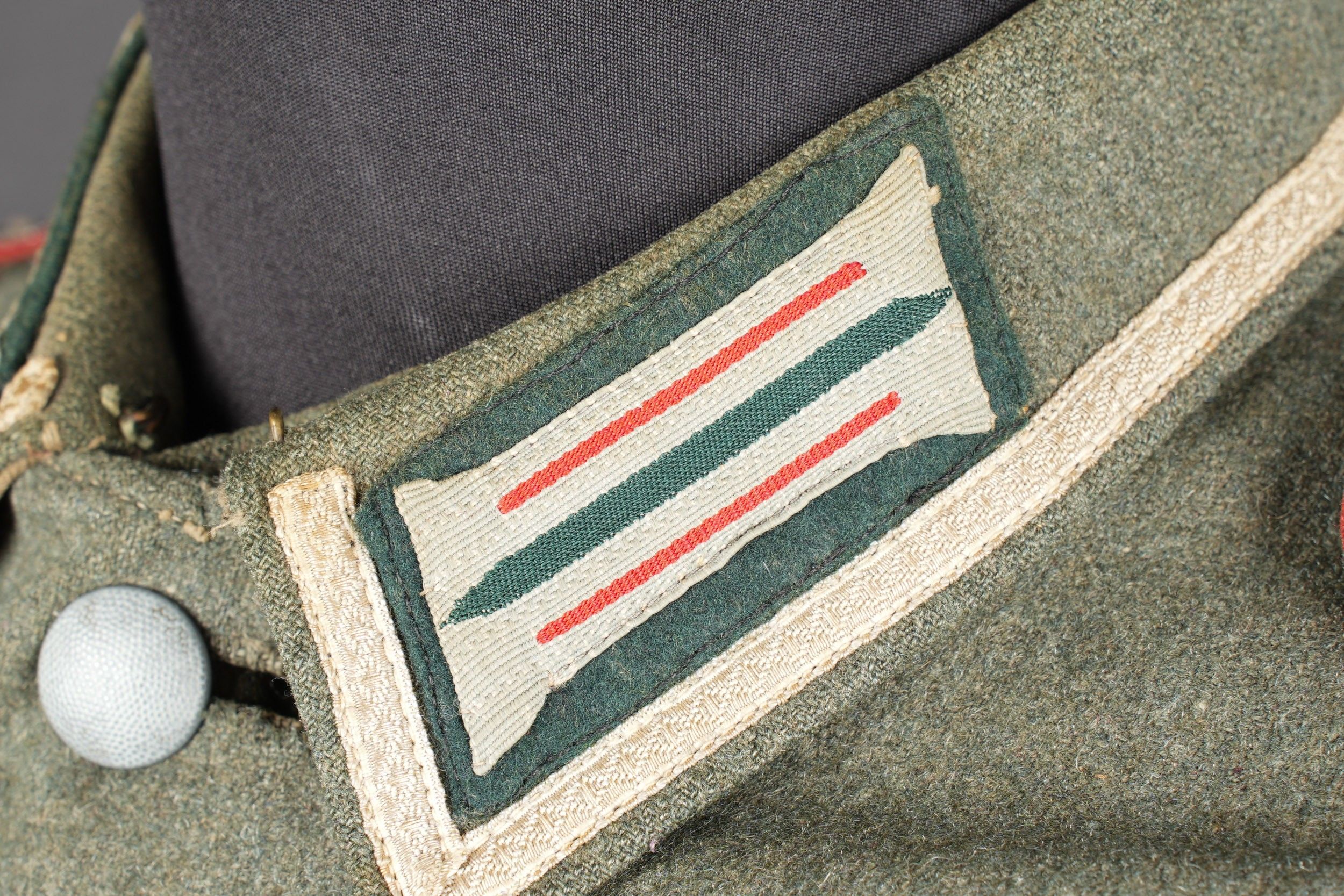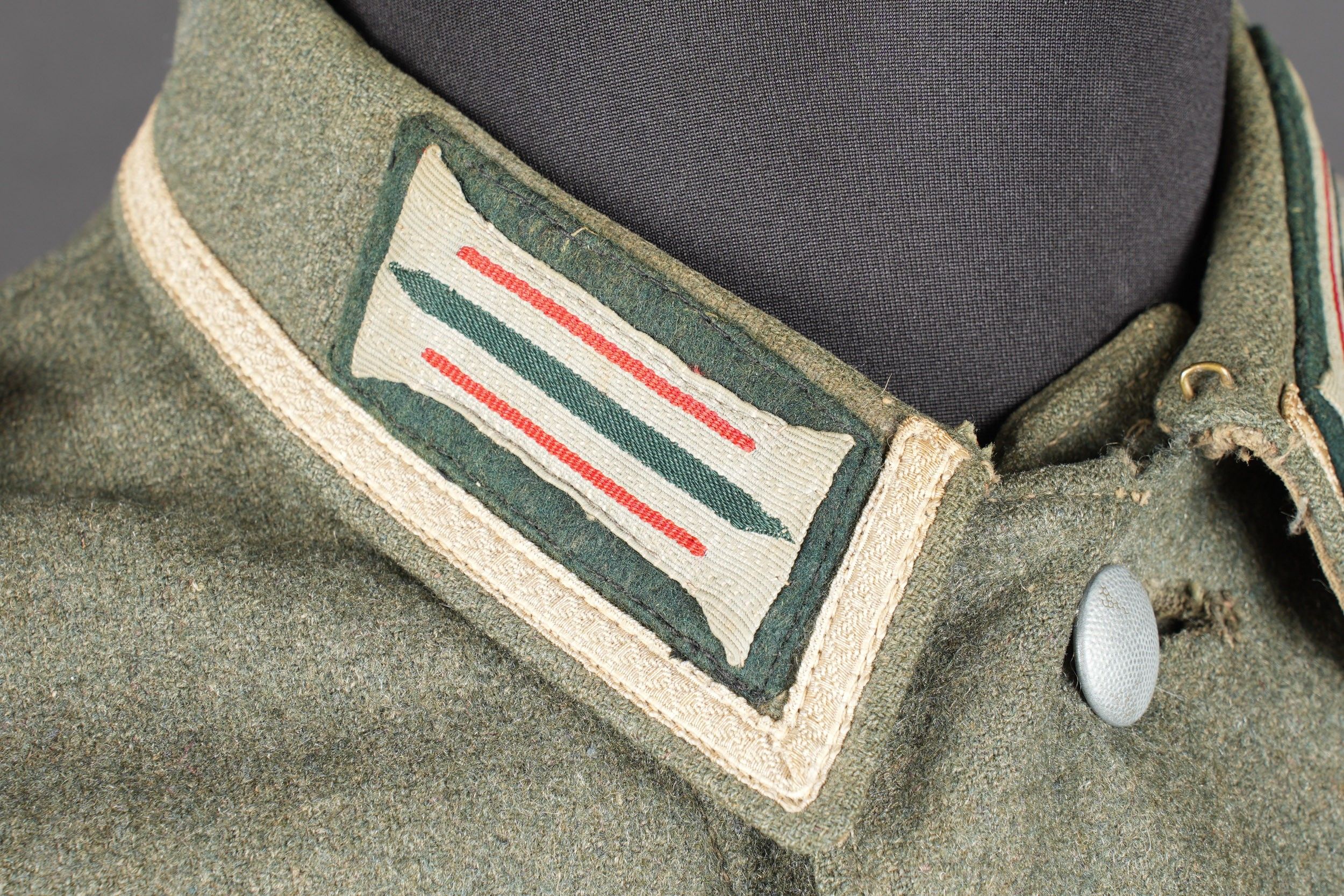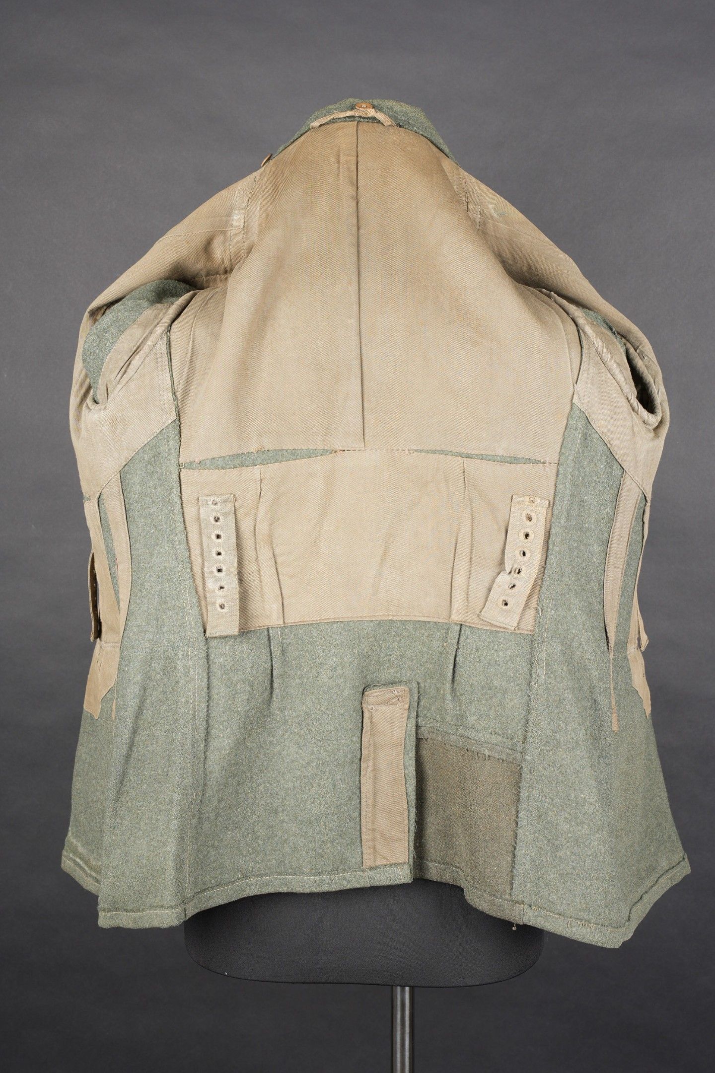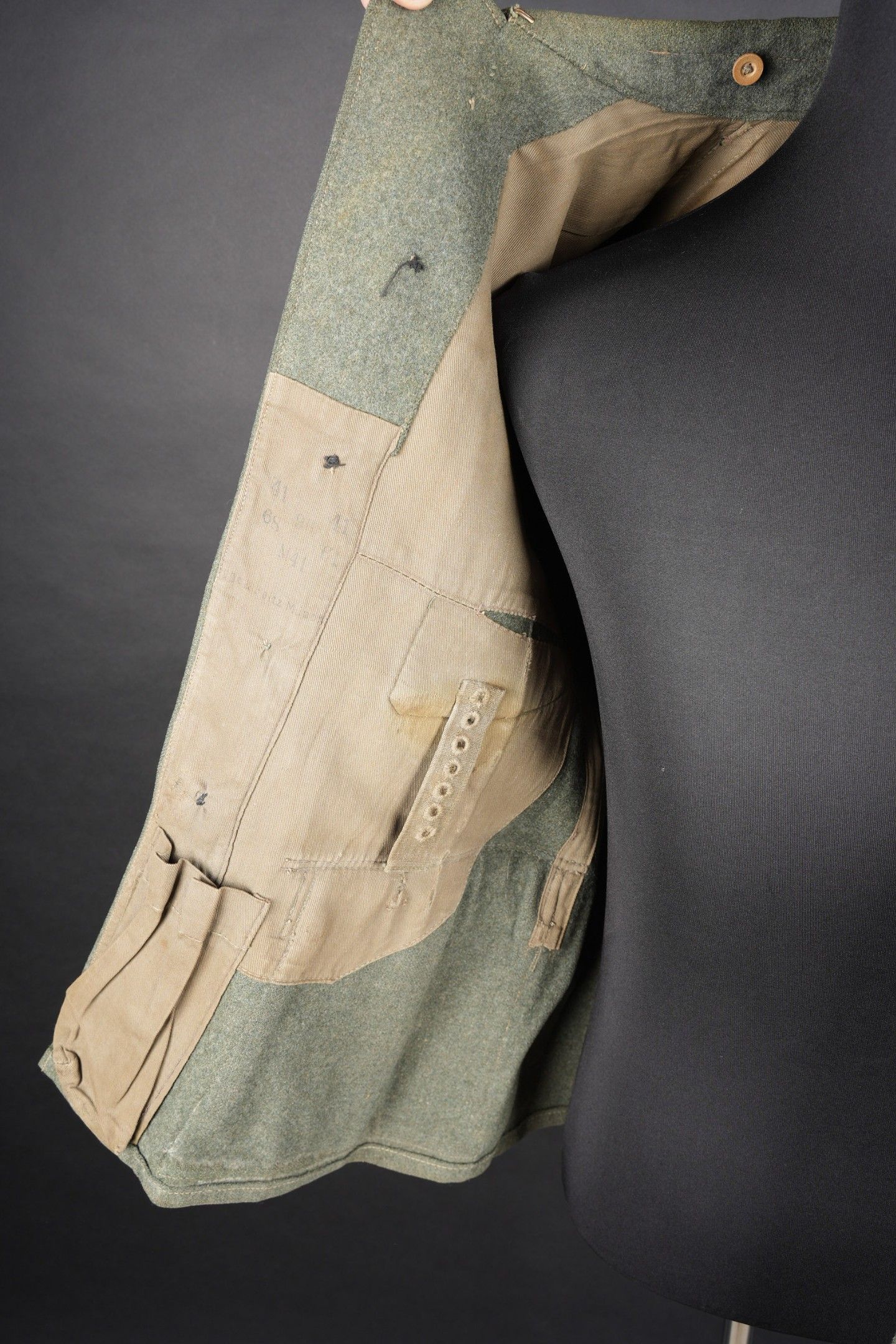 106th Heer Artillery Regiment jacket. Model 40, in Feldgrau cloth. All buttons present. Silver braid around the collar. Machine stitched artillery troop litzen. Two buttons are present under the collar. Oberfeldwebel shoulder tabs of the 106th artillery regiment. Hand-sewn Bevo chest eagle. Eastern Front Medal decoration flange. A decoration flange on the left breast pocket. Lined with brown cotton fabric. Indication of size 41 41 90 68 61 M41. Manufacturer's name partially illegible. Hand-stitched fireworks speciality badge on bottom left sleeve. There is some wear and patina to the item, as well as a few stains and discrete moth marks. Condition II+. Tunic of the 106th Artillery Regiment of the Heer, Model 40, in Feldgrau cloth. All buttons present. Silver braid around the collar. Machine-sewn artillery litzen. Two collar buttons present. Shoulder boards of an Oberfeldwebel of the 106th Artillery Regiment. Hand-sewn Bevo breast eagle. Ribbon bar for the Eastern Front Medal and another decoration bar above the left breast pocket. Brown cotton-lined interior with partially legible size markings 41 41 90 68 61 M41. Partially illegible maker marking. Artificer specialty patch hand-sewn at the lower left sleeve. Some wear and patina on the piece with light stains and moth traces. Condition II+