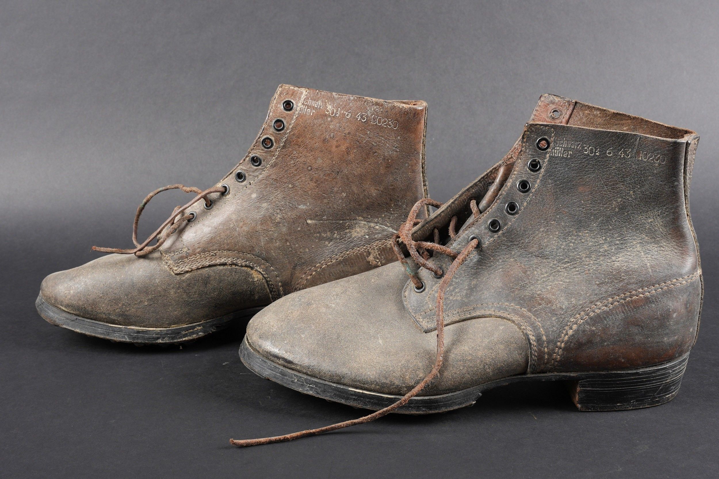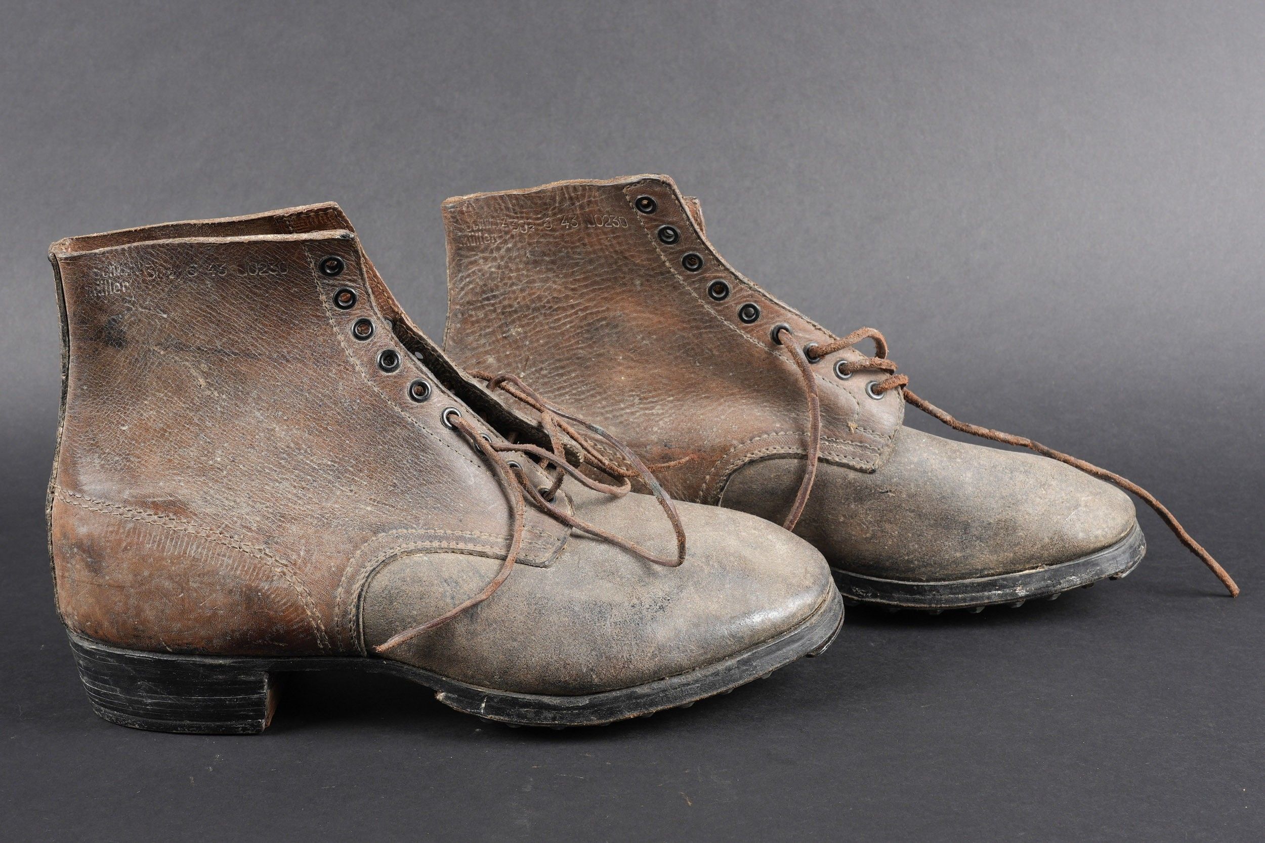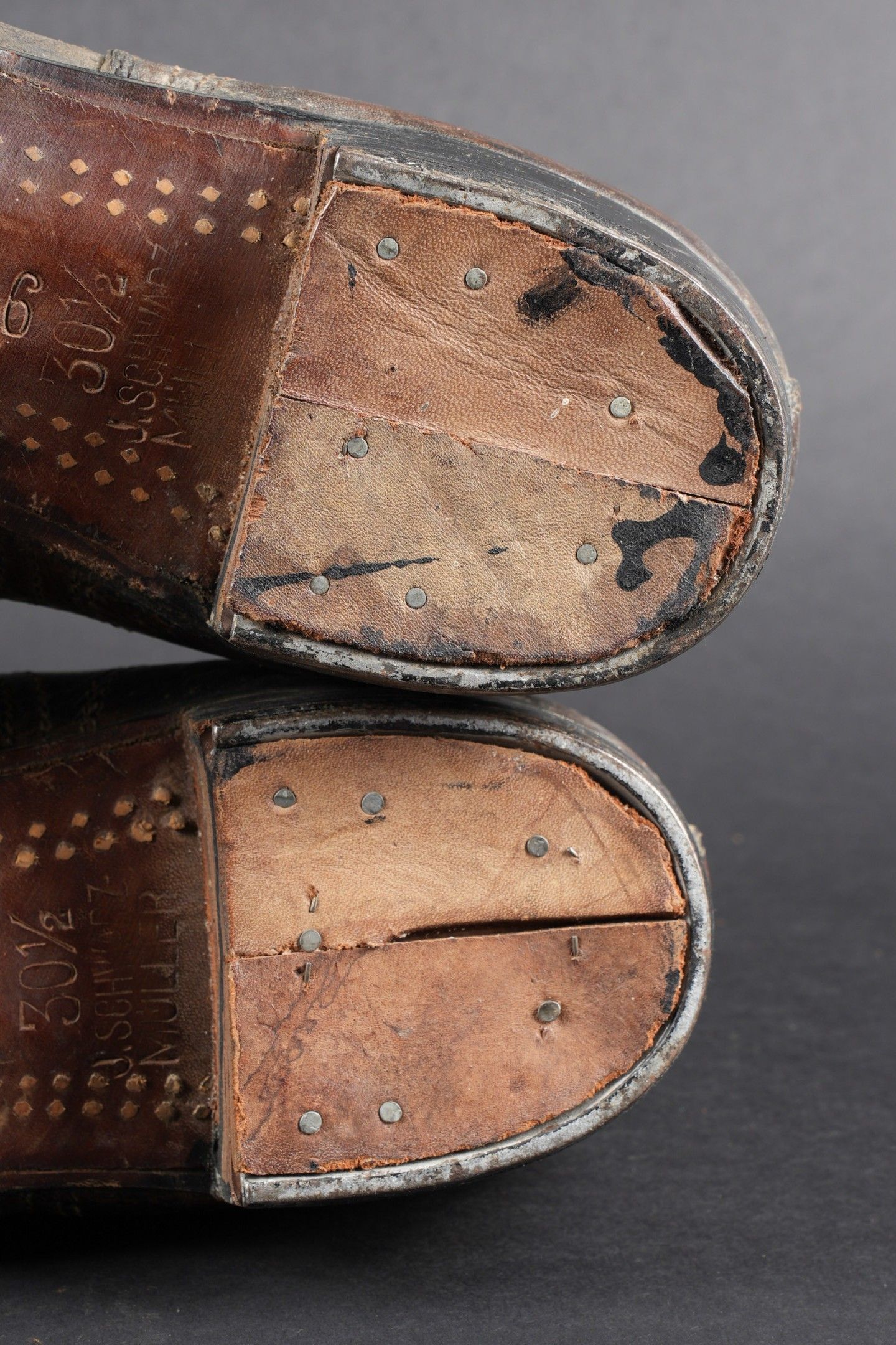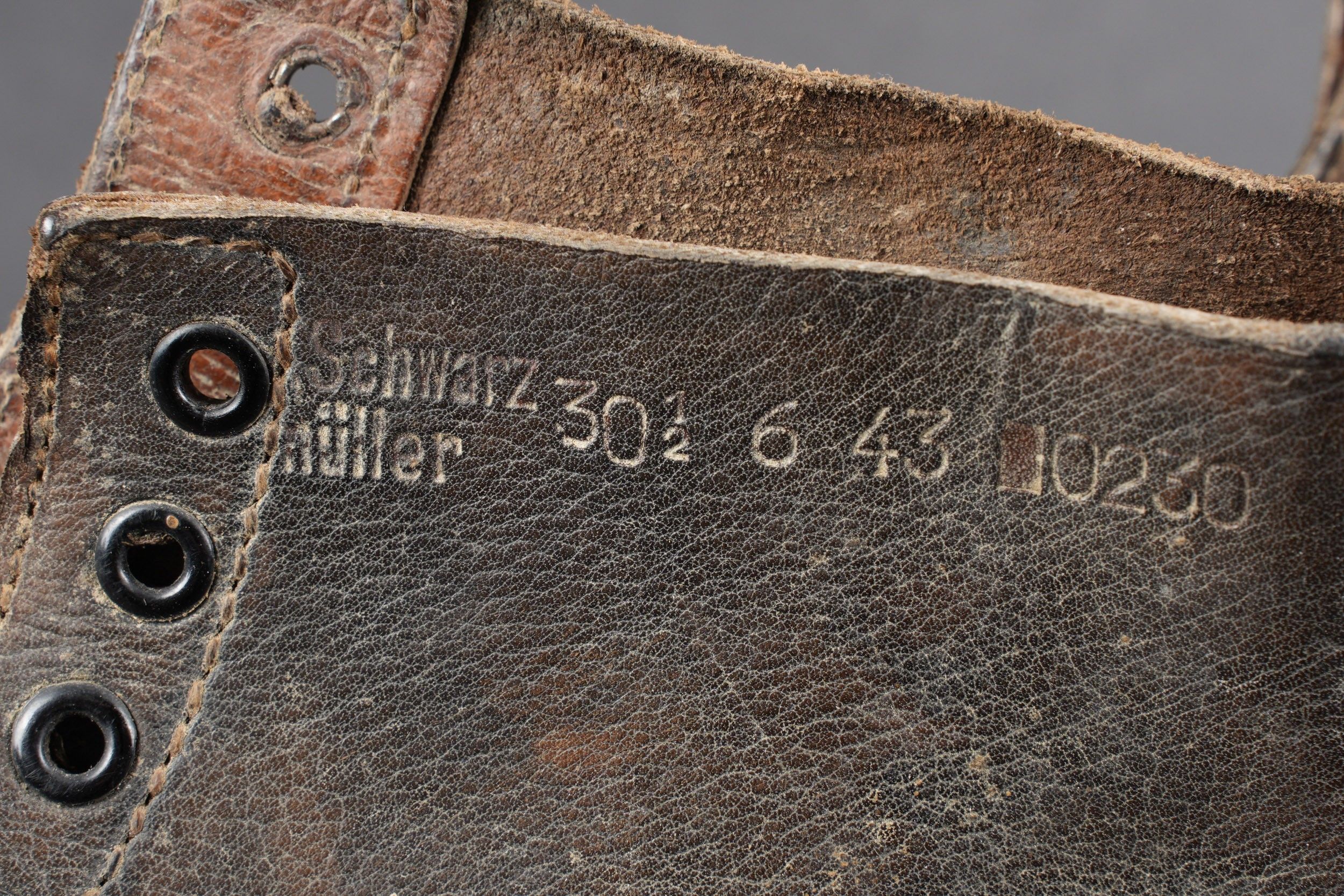 German brodequin. Homogenous pair in smooth leather. Eight lacing eyelets. The leather laces are present. Markings on the sides Schwarz Müller 30 12 6 43 0230. Studded and shod soles, shod heels. To note a light wear and patina of the parts. Condition II+. German ankle boots, matching pair in smooth leather with eight eyelets. Original leather laces present. Marked on the sides Schwarz Müller 30 12 6 43 0230. Hobnailed soles and reinforced heels. Slight wear and patina on the pieces. Condition II+