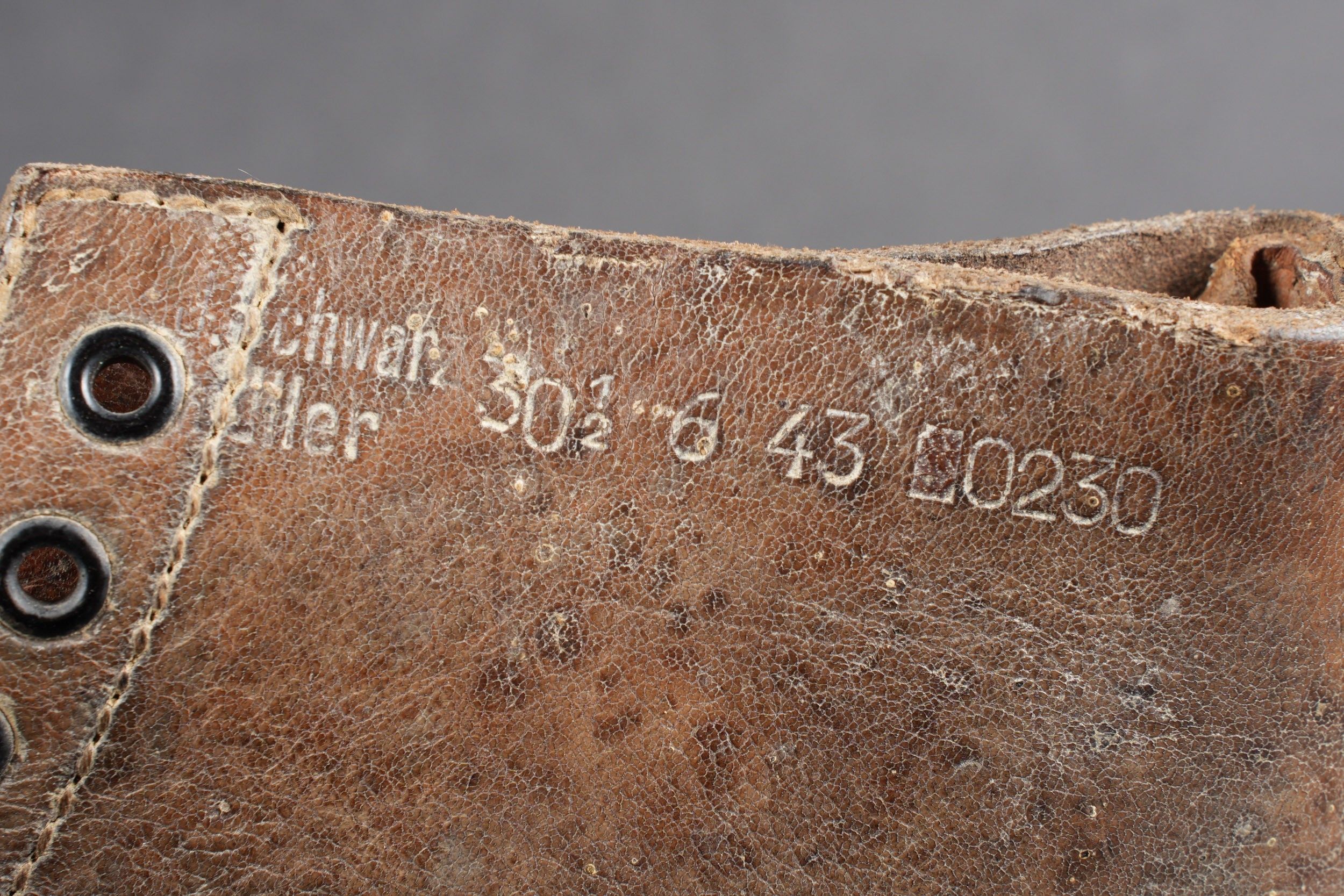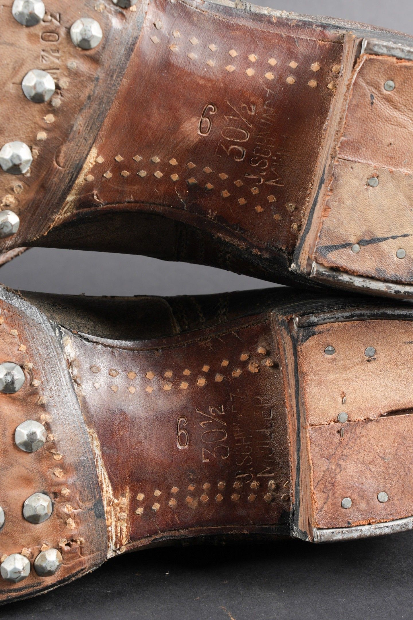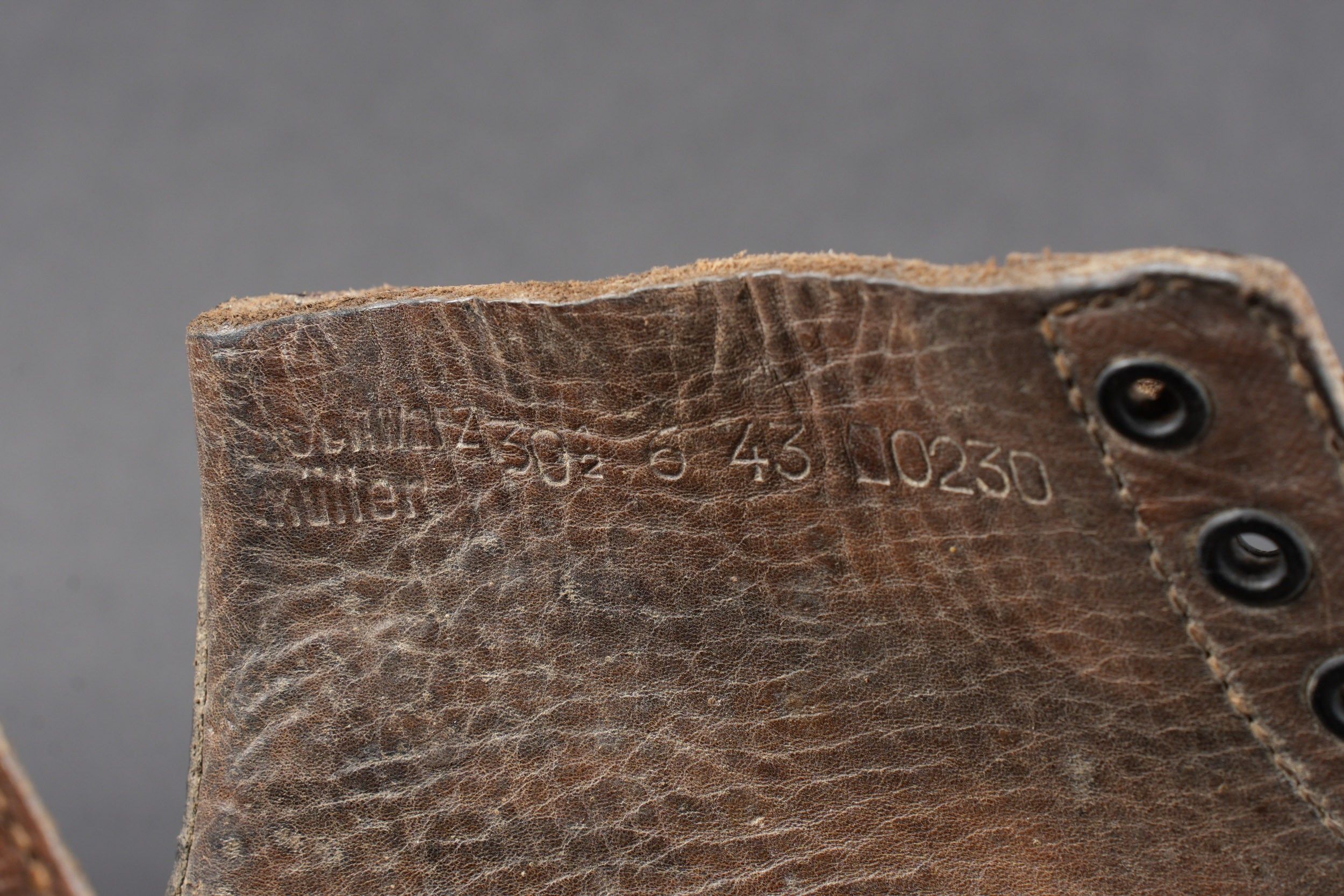 German brodequin. Homogenous pair in smooth leather. Eight lacing eyelets. The leather laces are present. Markings on the sides Schwarz Müller 30 12 6 43 0230. Studded and shod soles, shod heels. To note a light wear and patina of the parts. Condition II+. German ankle boots, matching pair in smooth leather with eight eyelets. Original leather laces present. Marked on the sides Schwarz Müller 30 12 6 43 0230. Hobnailed soles and reinforced heels. Slight wear and patina on the pieces. Condition II+