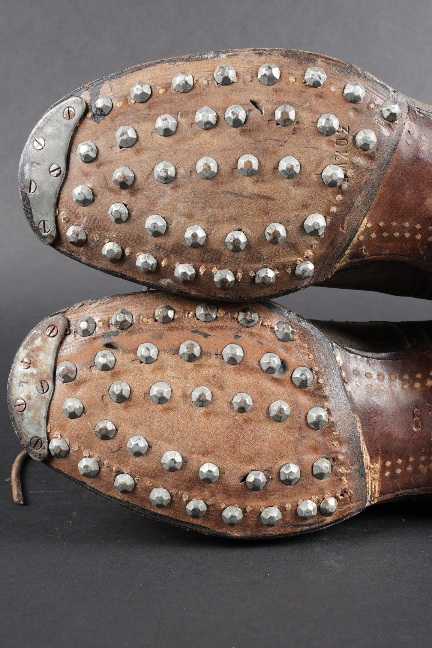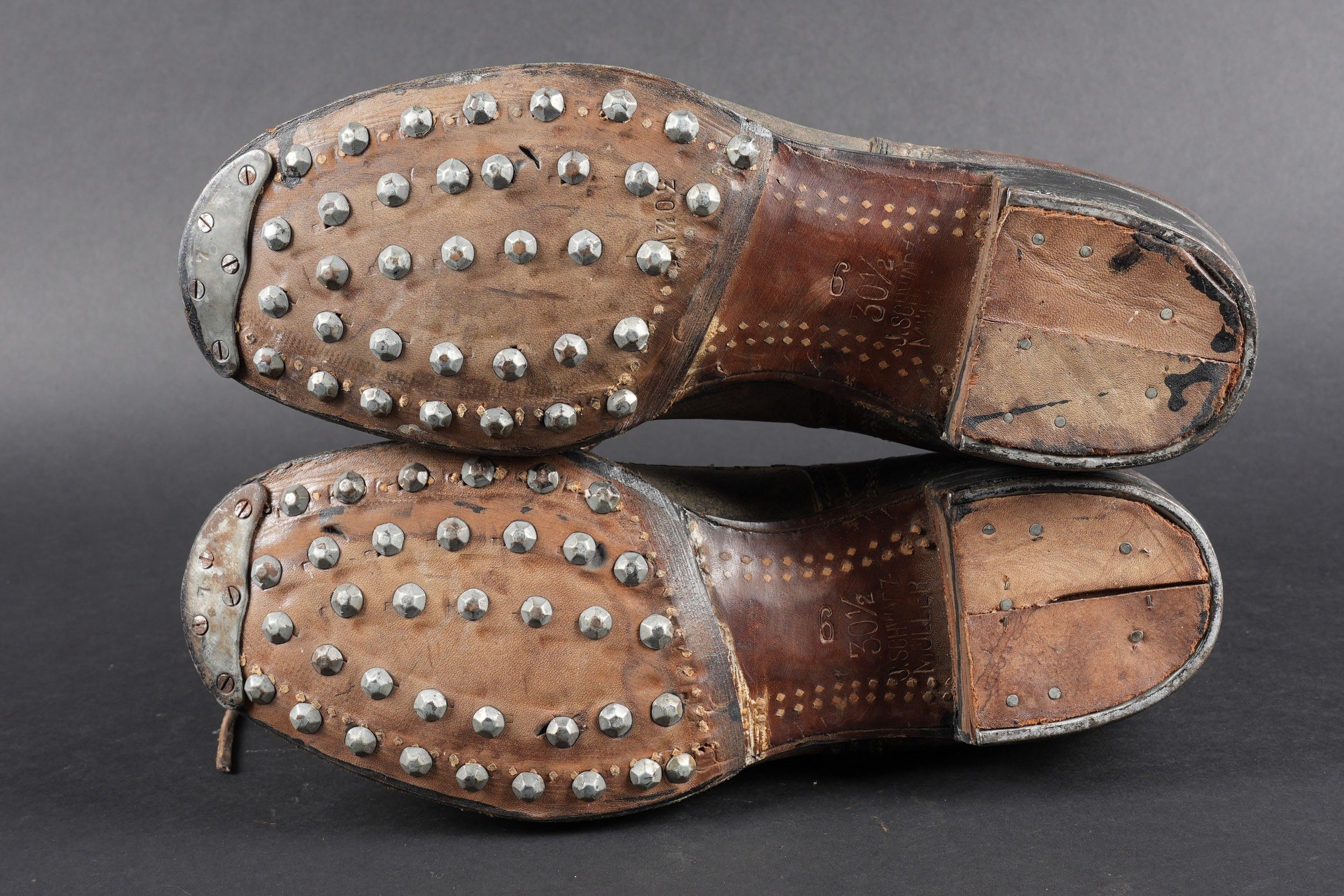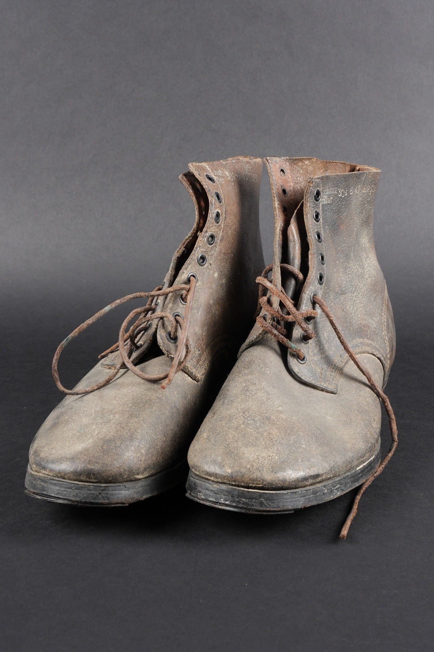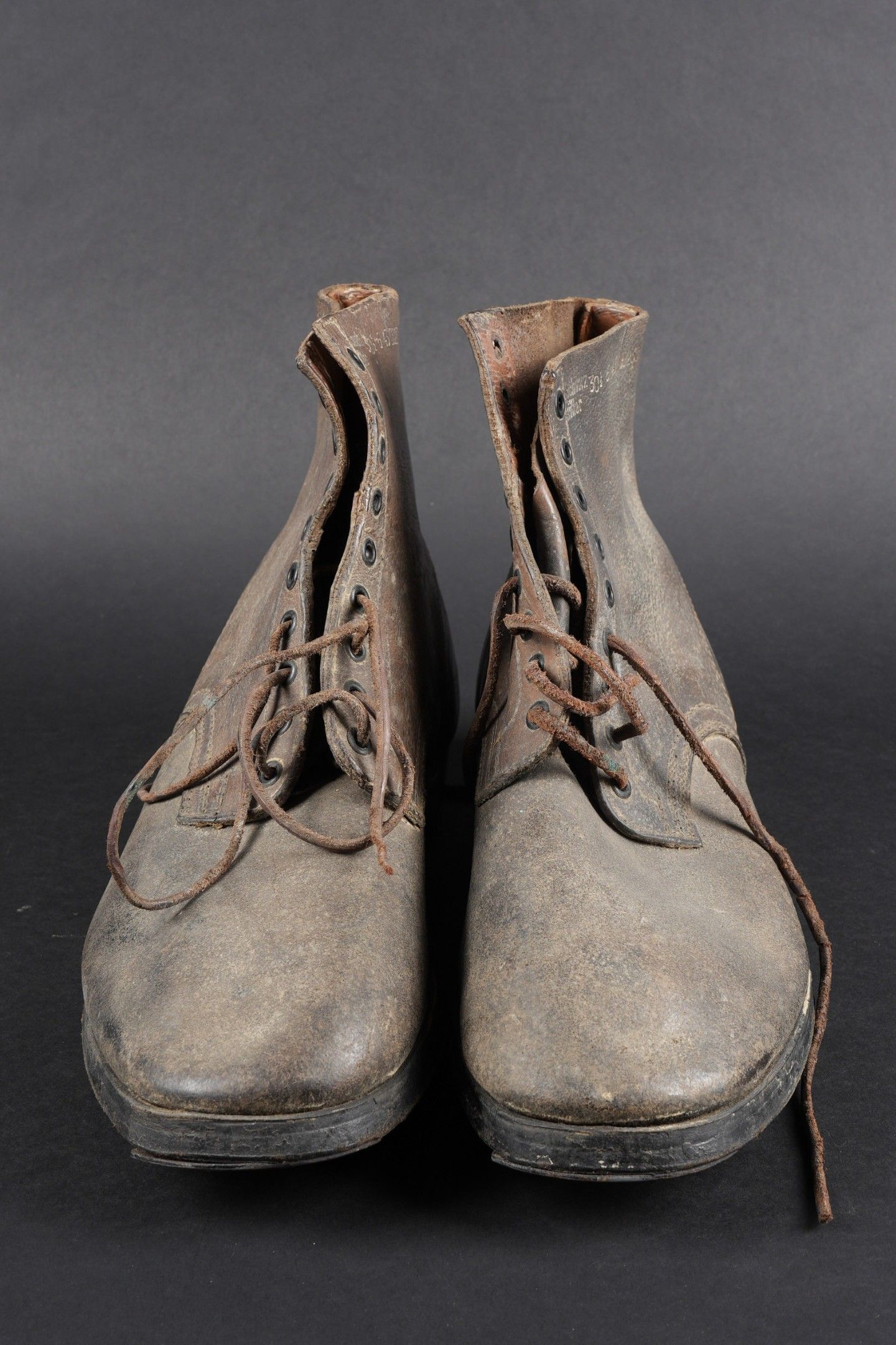 German brodequin. Homogenous pair in smooth leather. Eight lacing eyelets. The leather laces are present. Markings on the sides Schwarz Müller 30 12 6 43 0230. Studded and shod soles, shod heels. To note a light wear and patina of the parts. Condition II+. German ankle boots, matching pair in smooth leather with eight eyelets. Original leather laces present. Marked on the sides Schwarz Müller 30 12 6 43 0230. Hobnailed soles and reinforced heels. Slight wear and patina on the pieces. Condition II+