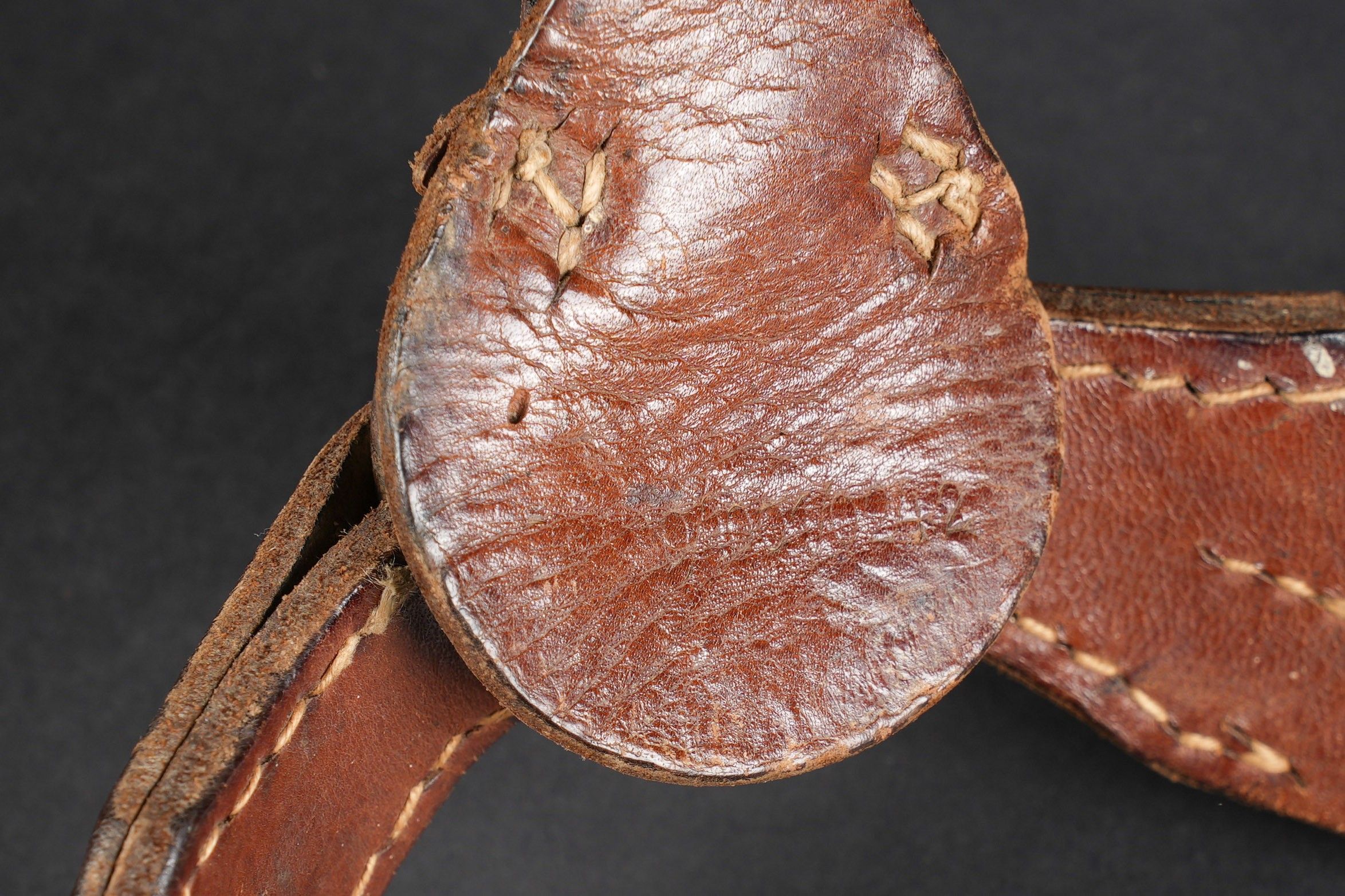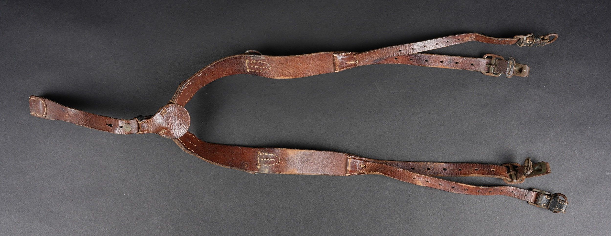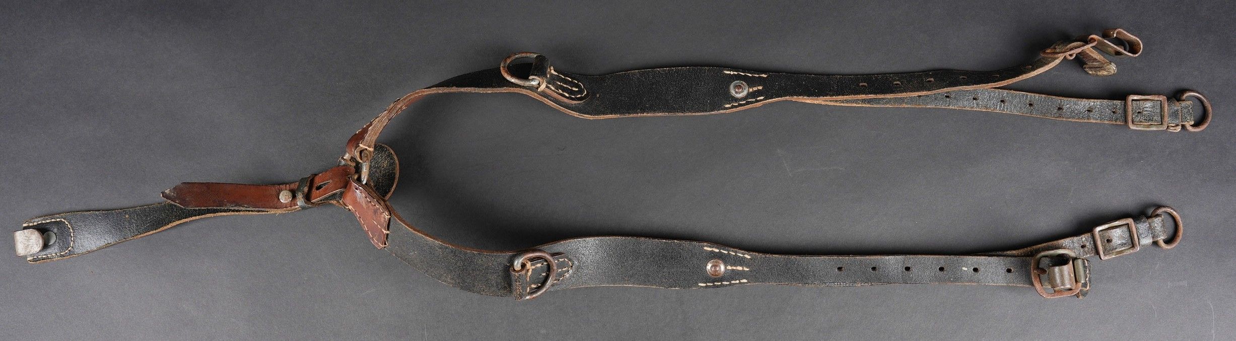 Heavy brelage. Brown and black leather, two-tone. All metal fittings are present but oxidised. Made by RBNR 010010242. Some wear and patina. Condition II+. Heavy Y-straps in two-tone brown and black leather. All metal fittings present but oxidized. Marked RBNR 010010242. Some wear and patina on the piece. Condition II+