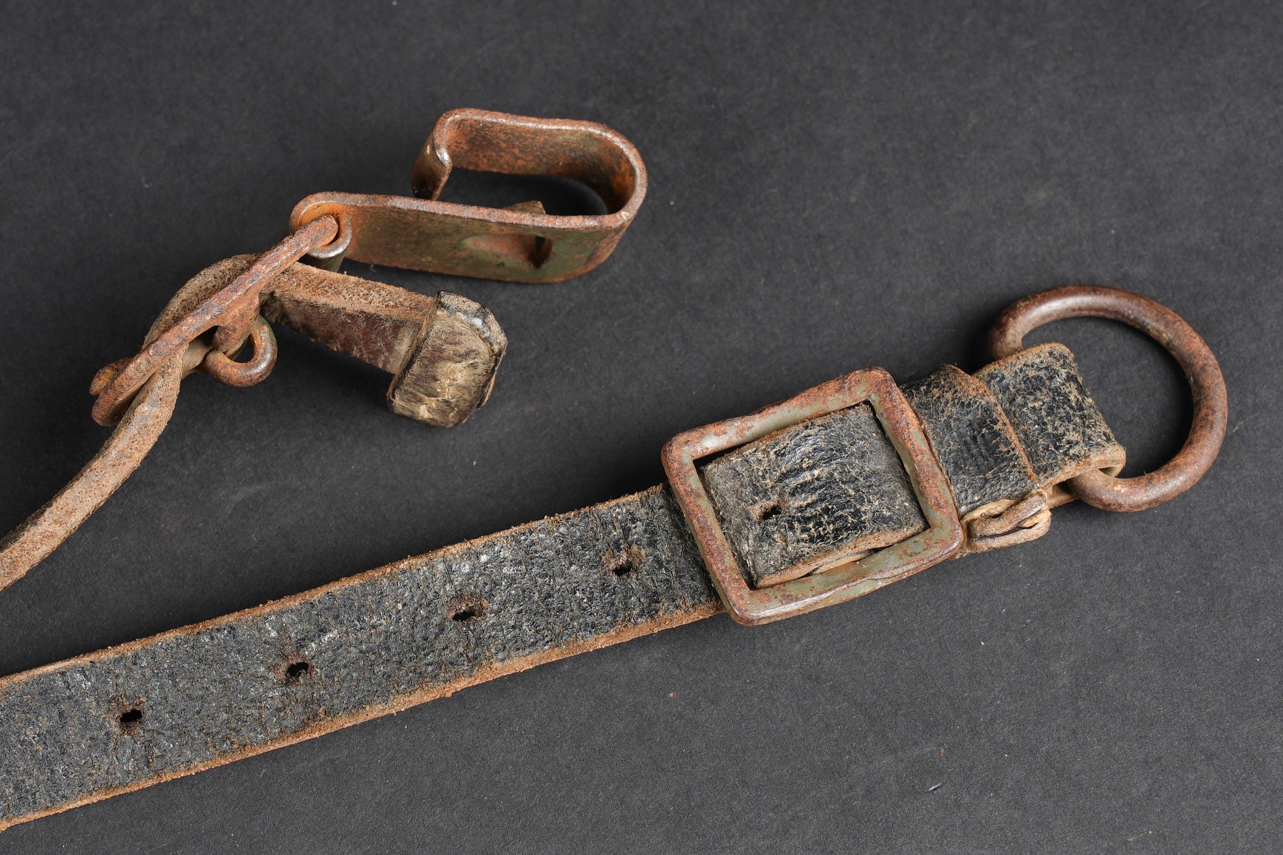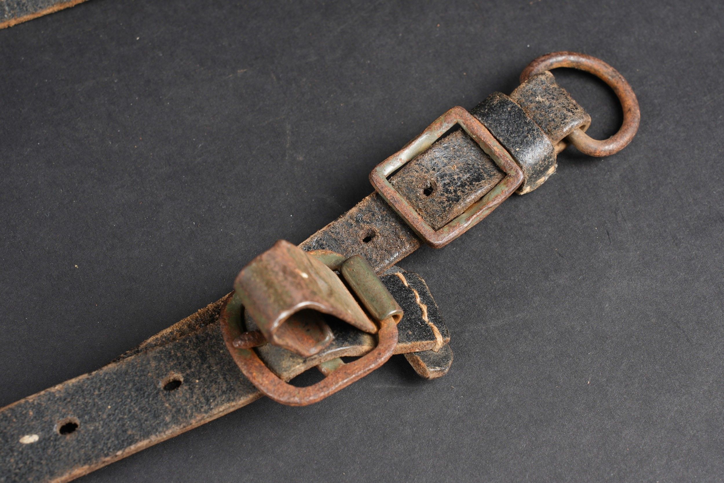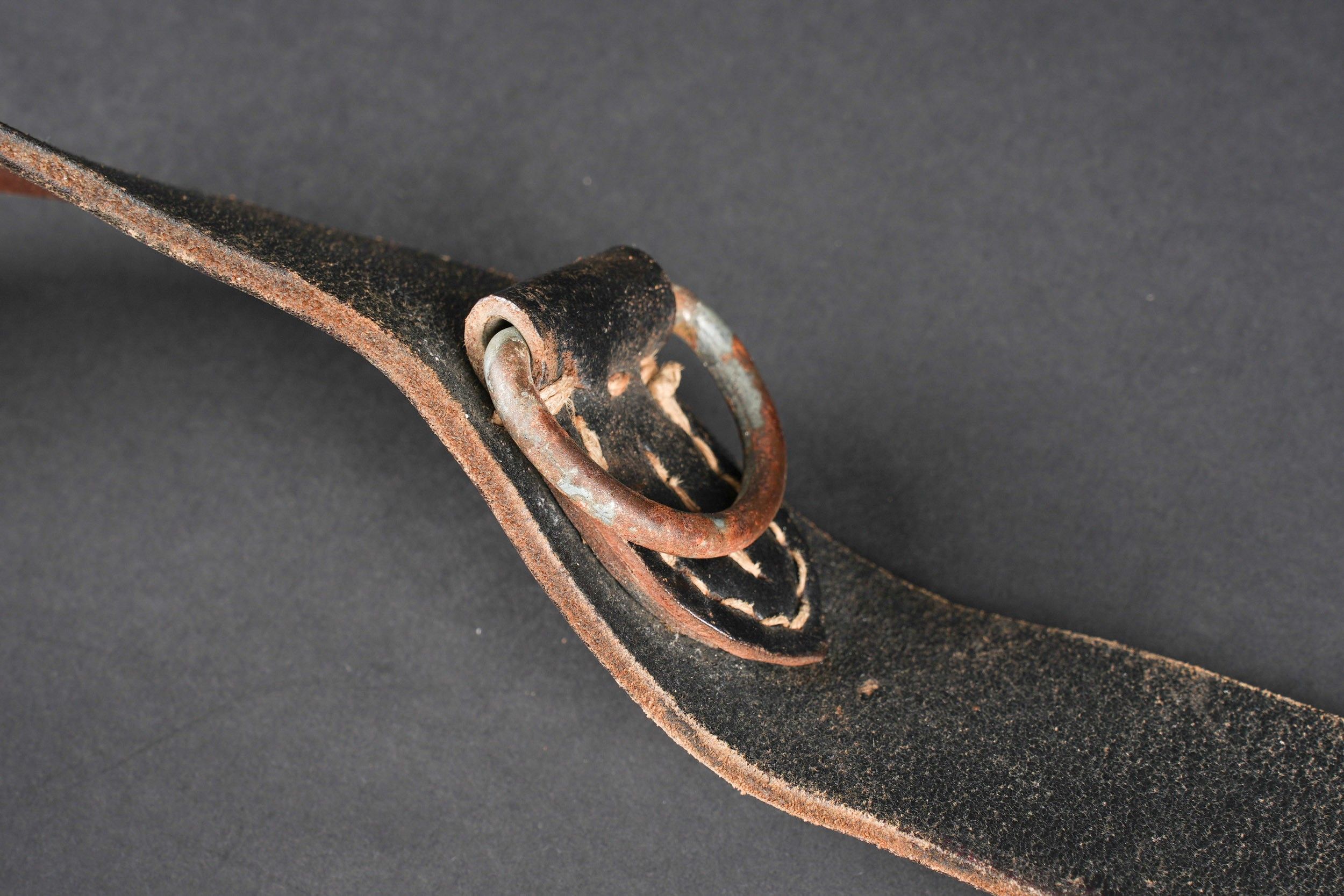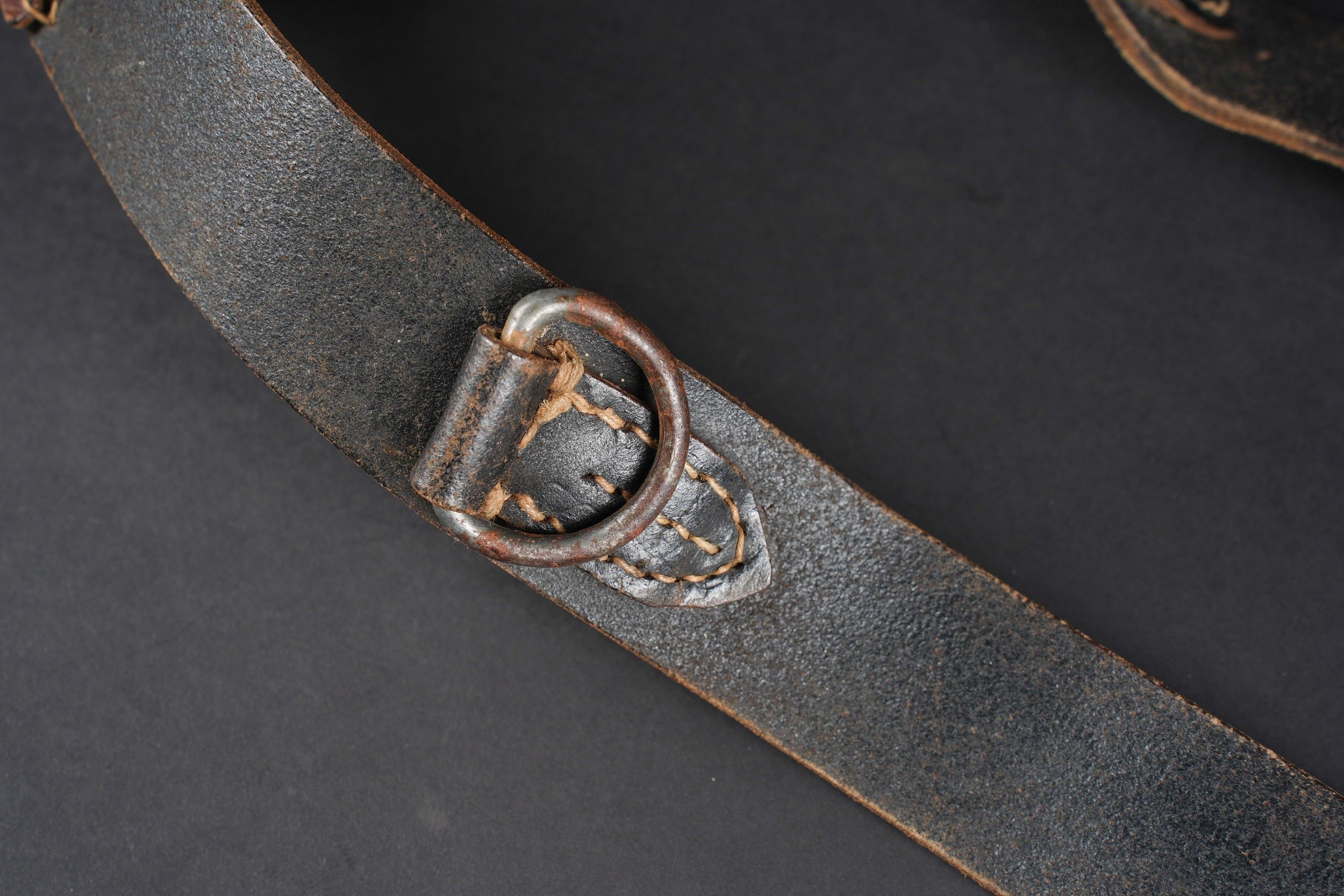 Heavy brelage. Brown and black leather, two-tone. All metal fittings are present but oxidised. Made by RBNR 010010242. Some wear and patina. Condition II+. Heavy Y-straps in two-tone brown and black leather. All metal fittings present but oxidized. Marked RBNR 010010242. Some wear and patina on the piece. Condition II+