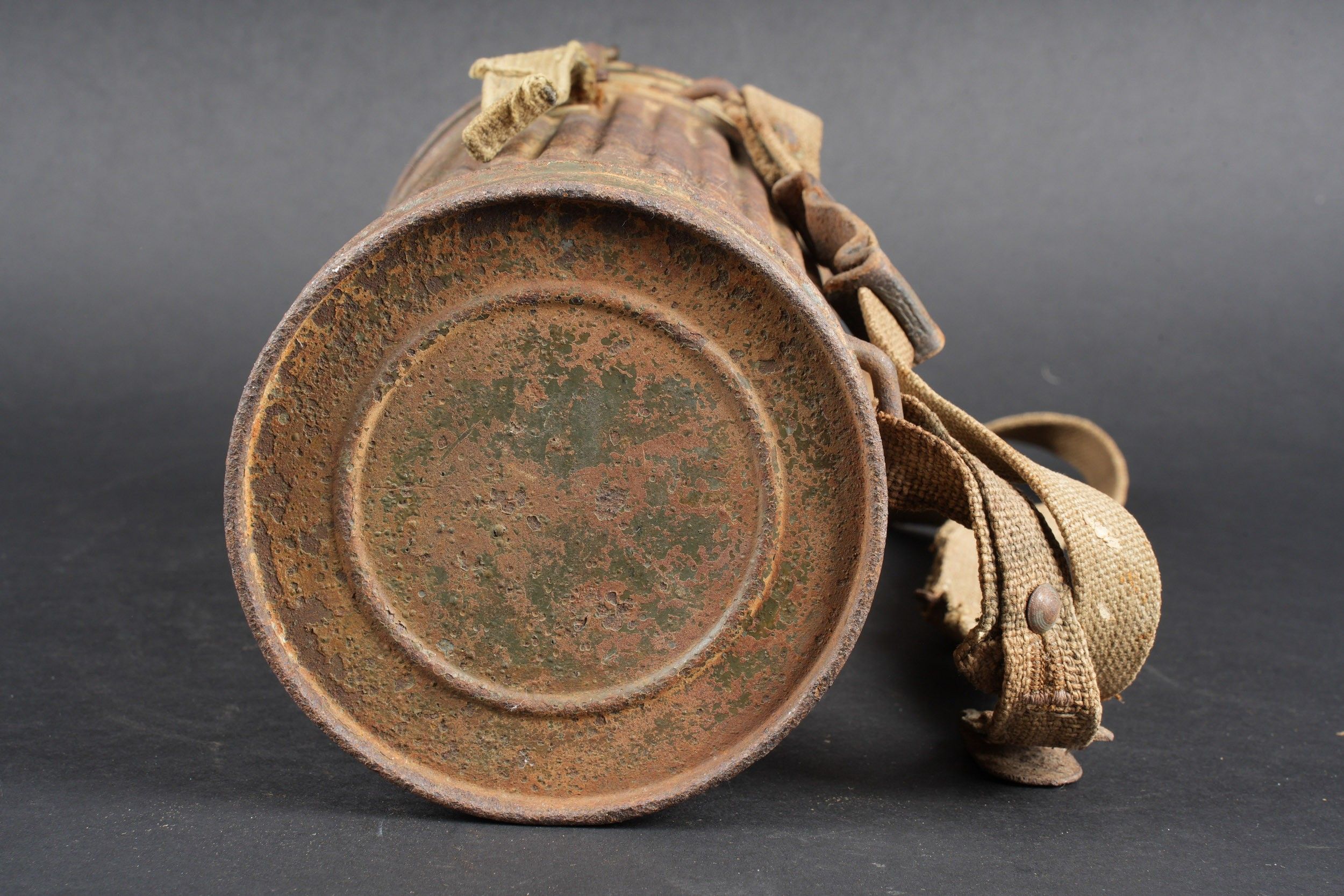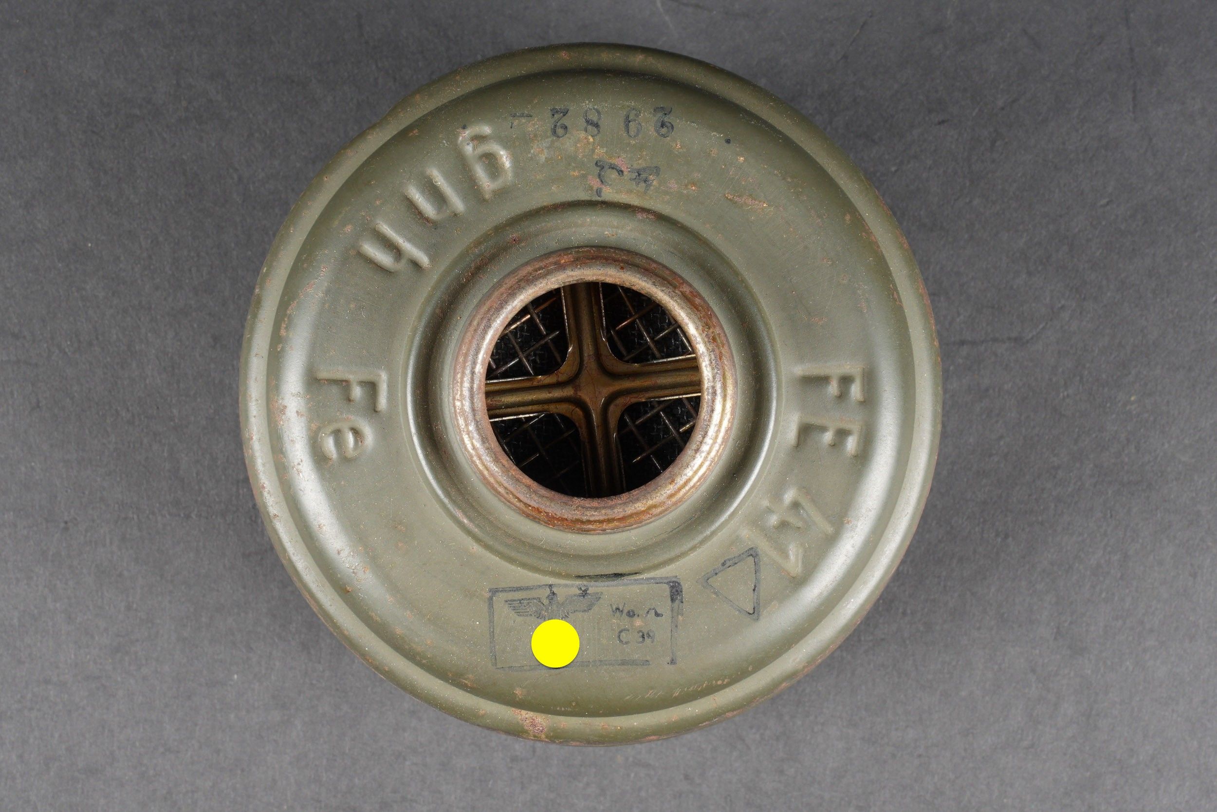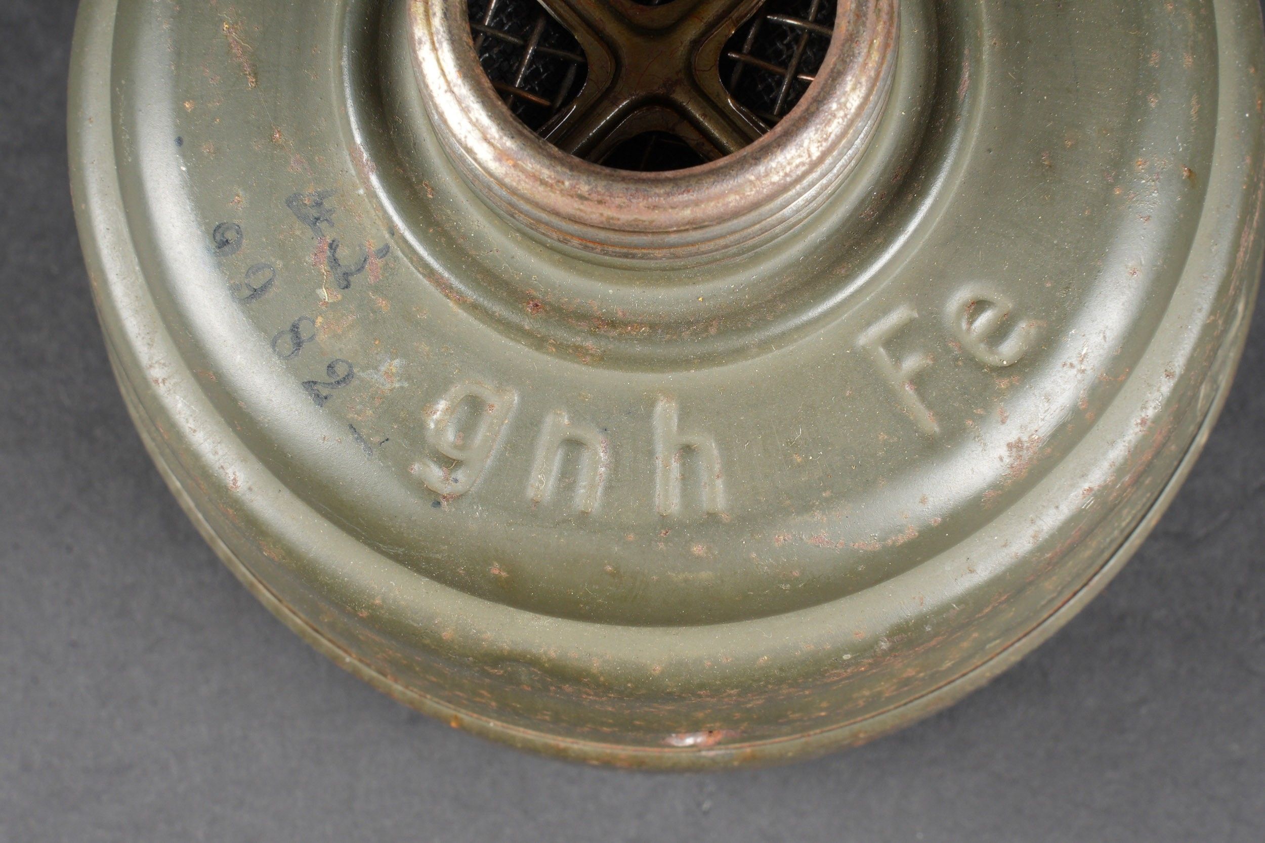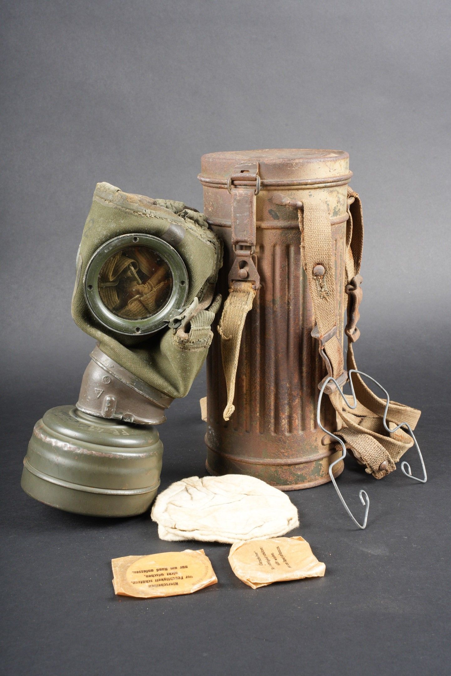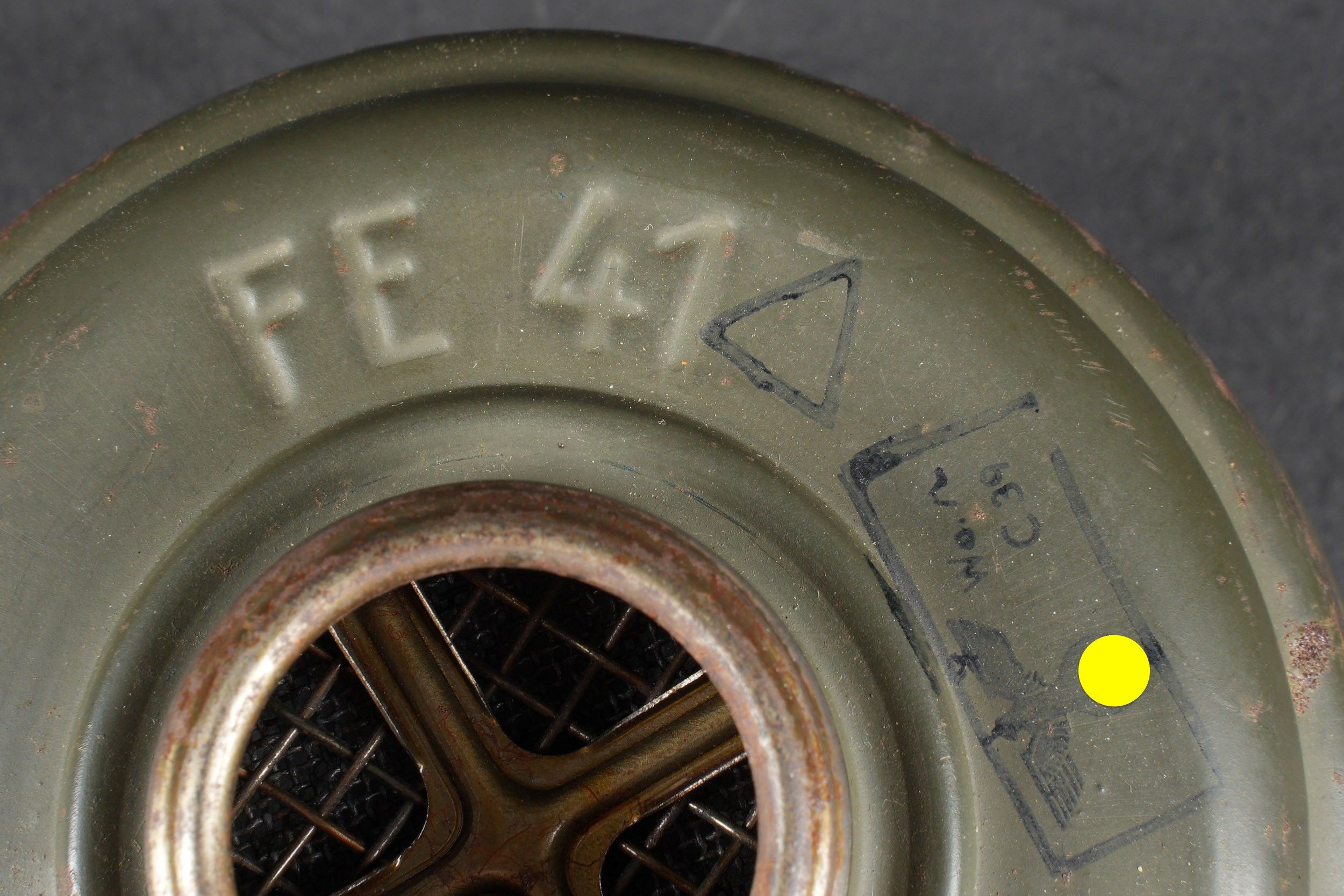 Camouflaged anti-gas mask. Long case. Made of metal. Three-tone camouflage paint, 50% ochre. Part of the case is oxidised. All straps are present. Made by DMB 1938. Spare lenses, cloth and spider are present. Canvas mask, size 2. All straps are present. FE 41 filter, in very good condition. Some wear and oxidation. Condition II+. Camouflaged gas mask set with long metal canister painted in three-tone ochregreensand camouflage about 50% remaining. Partially oxidized. All straps present. Marked DMB 1938. Includes spare lenses, cleaning cloth, and spider insert. Canvas mask, size 2, with all straps intact. Filter FE 41 in very good condition. Some wear and oxidation on the piece. Condition II+