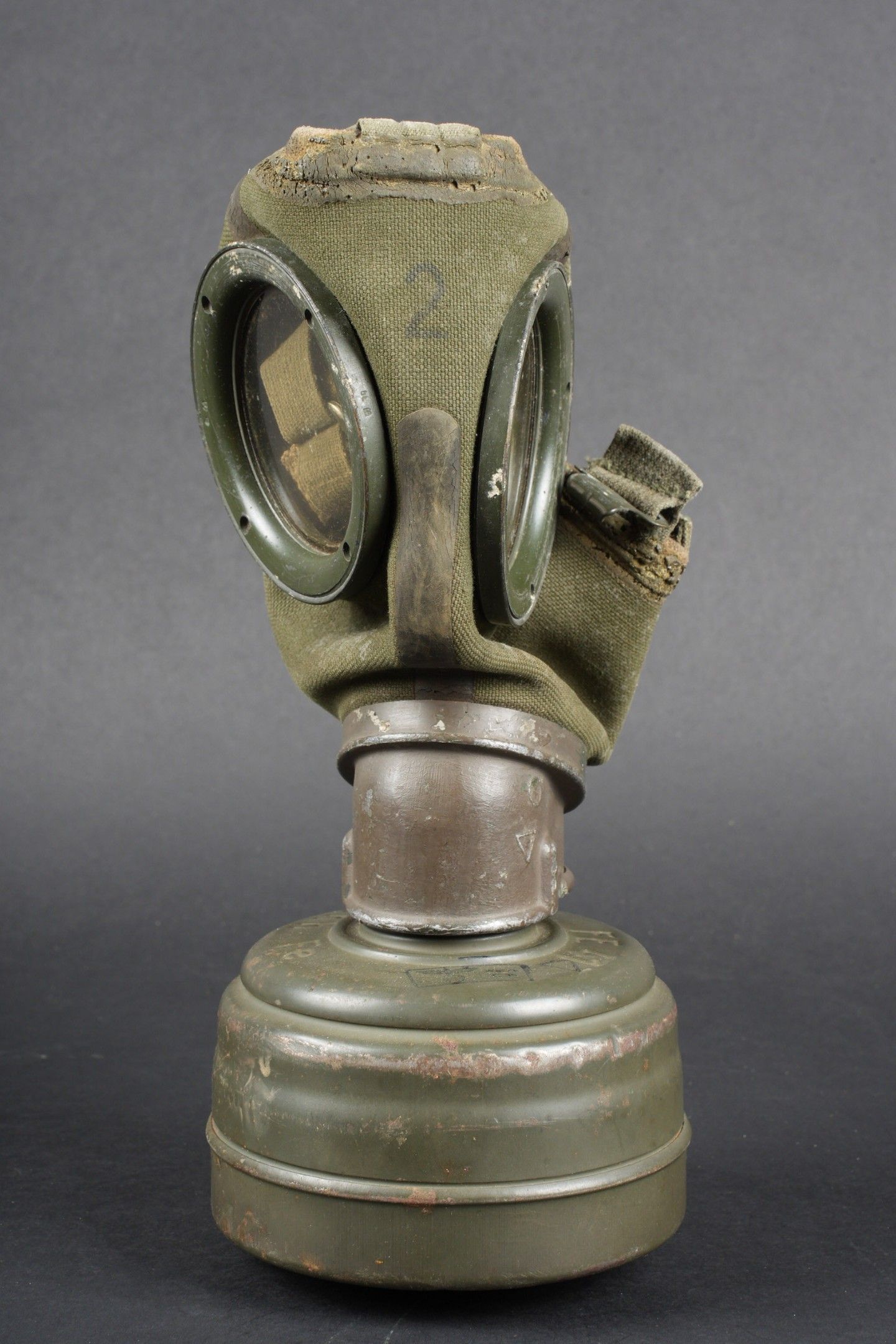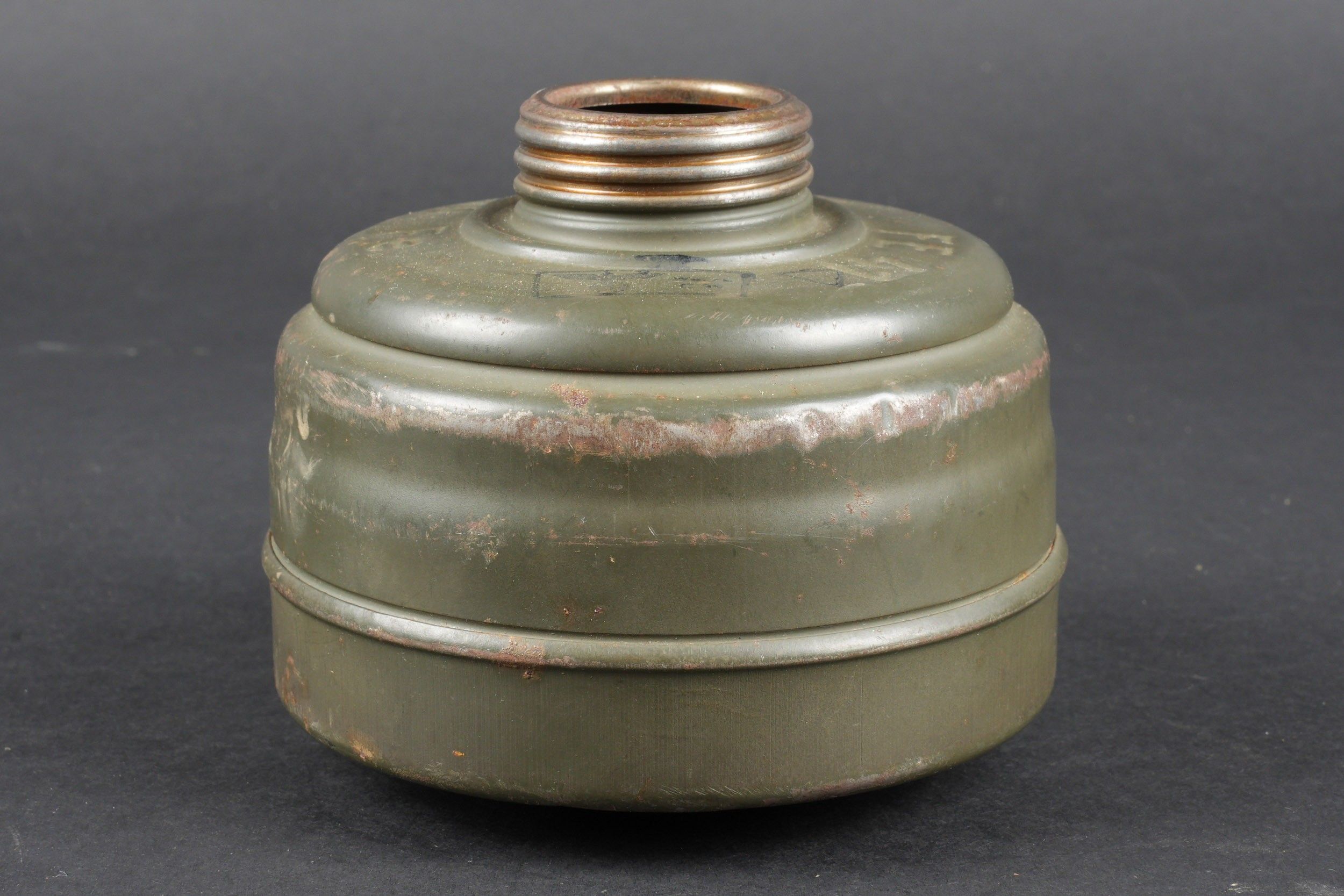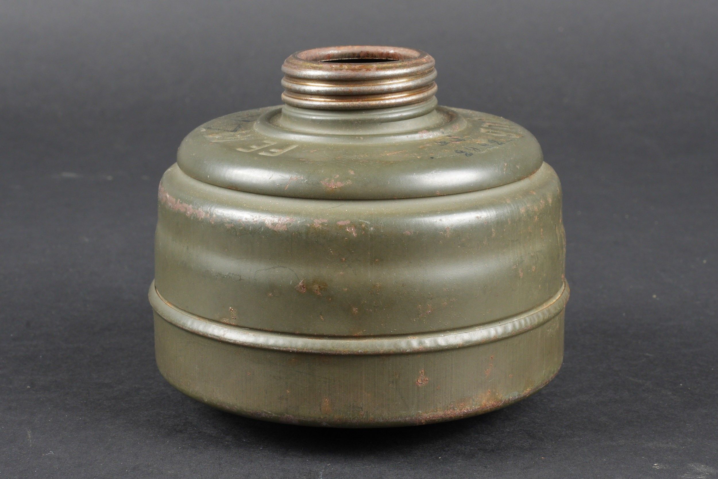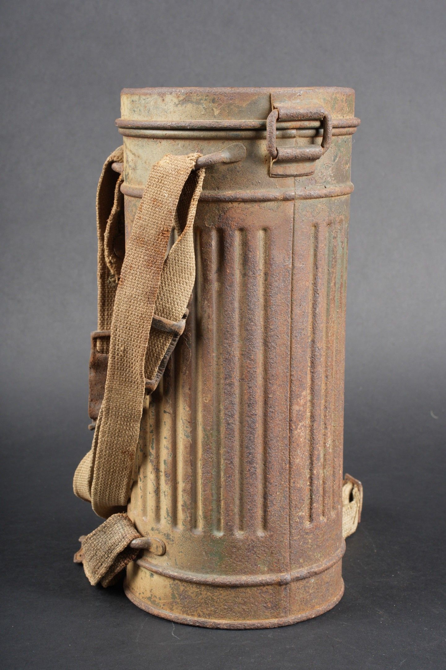 Camouflaged anti-gas mask. Long case. Made of metal. Three-tone camouflage paint, 50% ochre. Part of the case is oxidised. All straps are present. Made by DMB 1938. Spare lenses, cloth and spider are present. Canvas mask, size 2. All straps are present. FE 41 filter, in very good condition. Some wear and oxidation. Condition II+. Camouflaged gas mask set with long metal canister painted in three-tone ochregreensand camouflage about 50% remaining. Partially oxidized. All straps present. Marked DMB 1938. Includes spare lenses, cleaning cloth, and spider insert. Canvas mask, size 2, with all straps intact. Filter FE 41 in very good condition. Some wear and oxidation on the piece. Condition II+