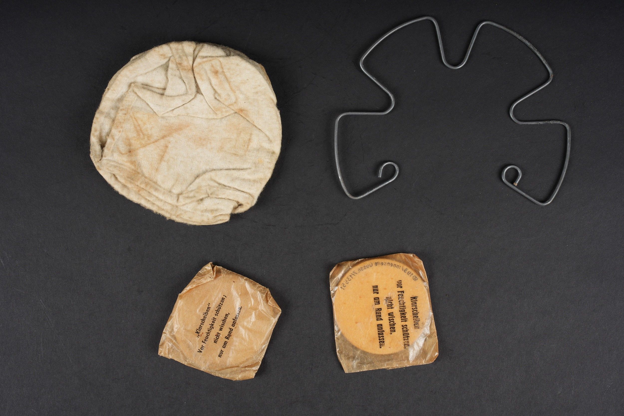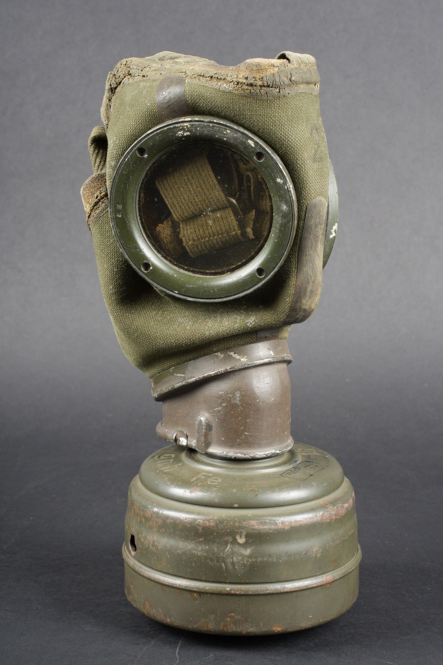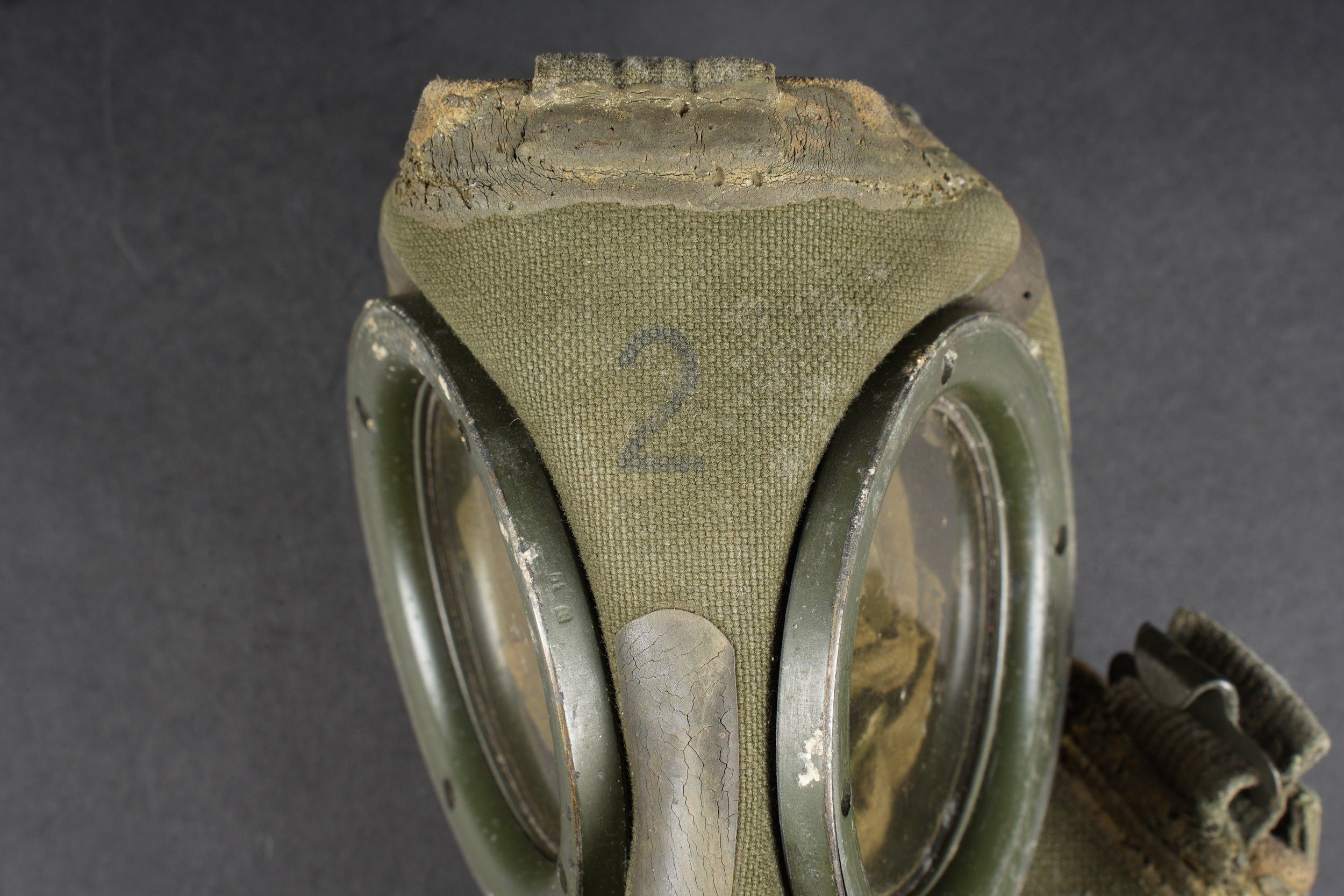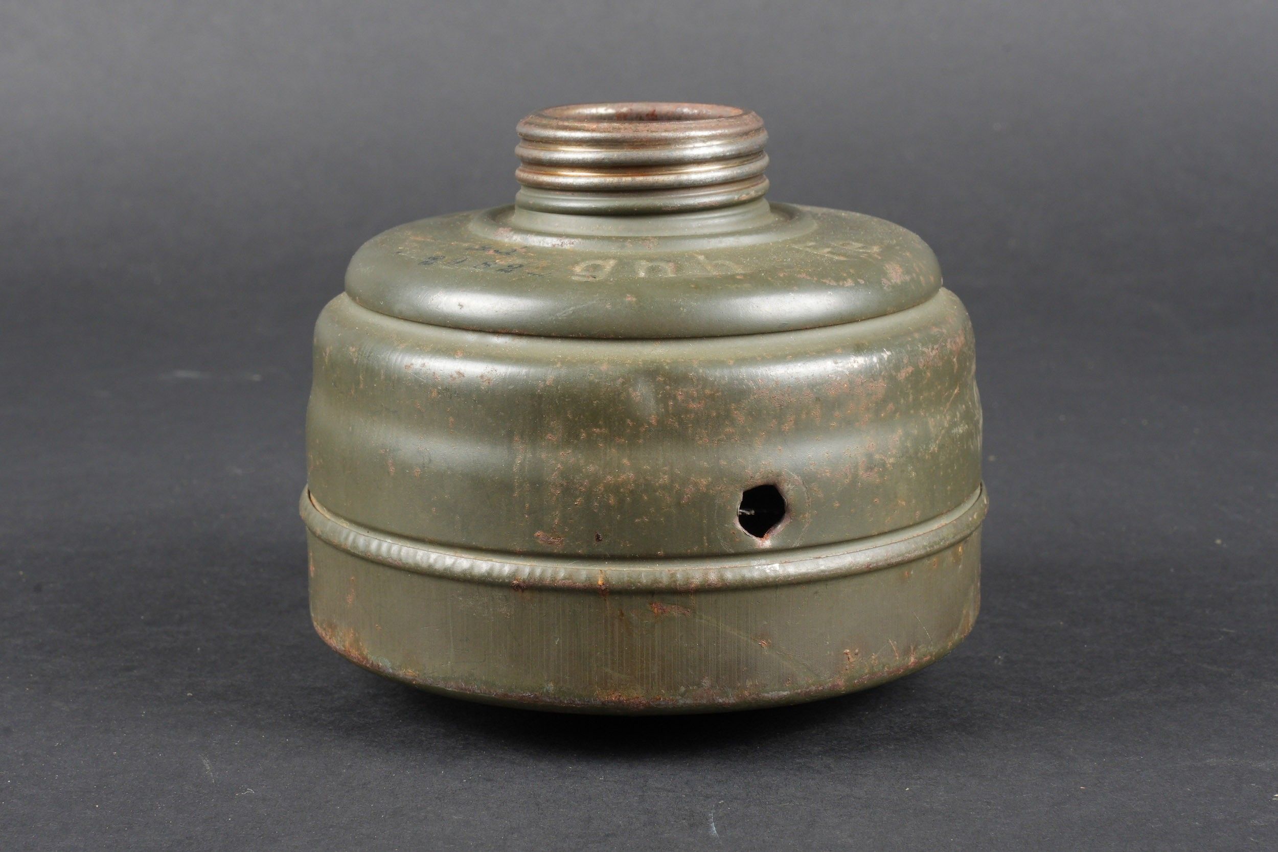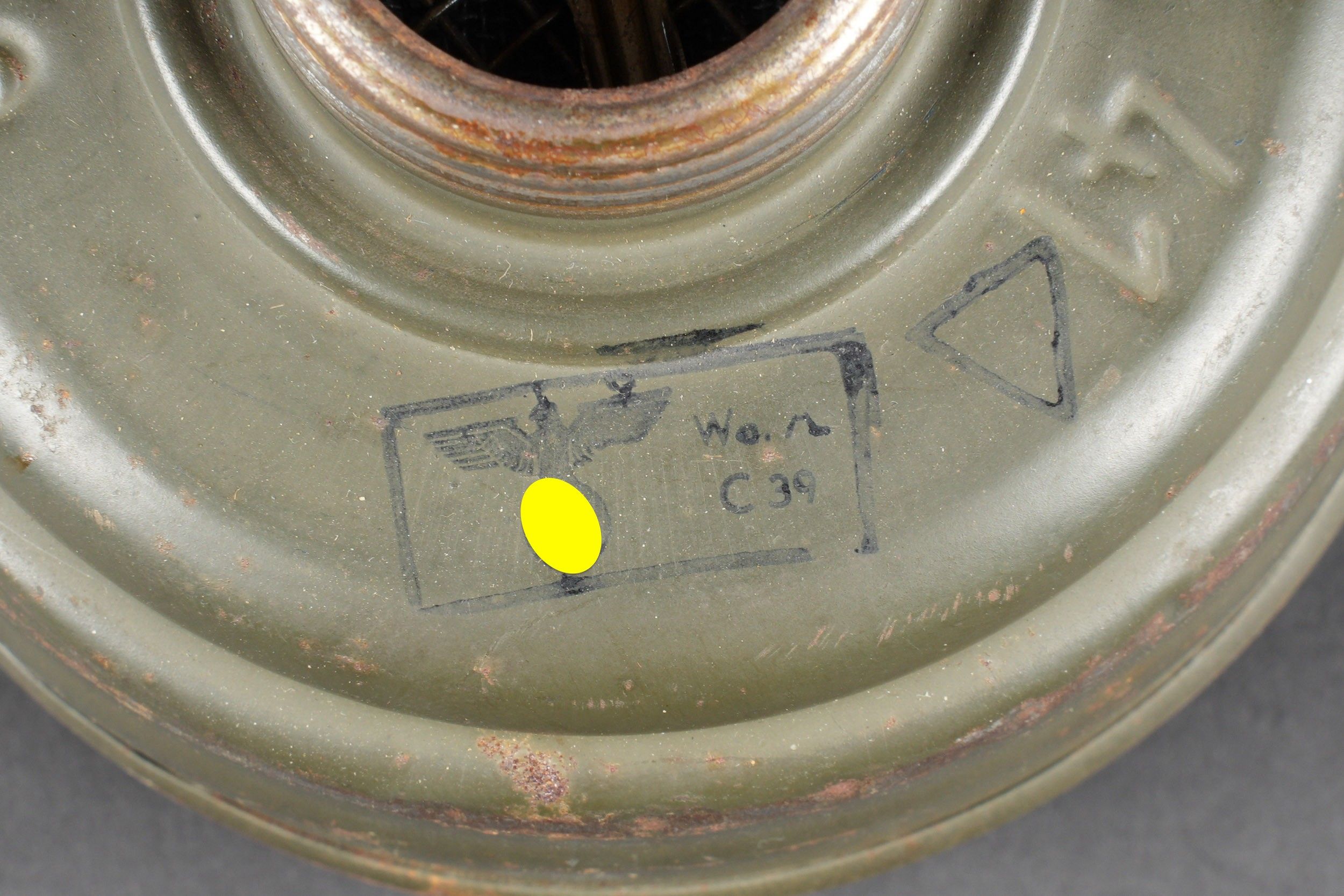 Camouflaged anti-gas mask. Long case. Made of metal. Three-tone camouflage paint, 50% ochre. Part of the case is oxidised. All straps are present. Made by DMB 1938. Spare lenses, cloth and spider are present. Canvas mask, size 2. All straps are present. FE 41 filter, in very good condition. Some wear and oxidation. Condition II+. Camouflaged gas mask set with long metal canister painted in three-tone ochregreensand camouflage about 50% remaining. Partially oxidized. All straps present. Marked DMB 1938. Includes spare lenses, cleaning cloth, and spider insert. Canvas mask, size 2, with all straps intact. Filter FE 41 in very good condition. Some wear and oxidation on the piece. Condition II+