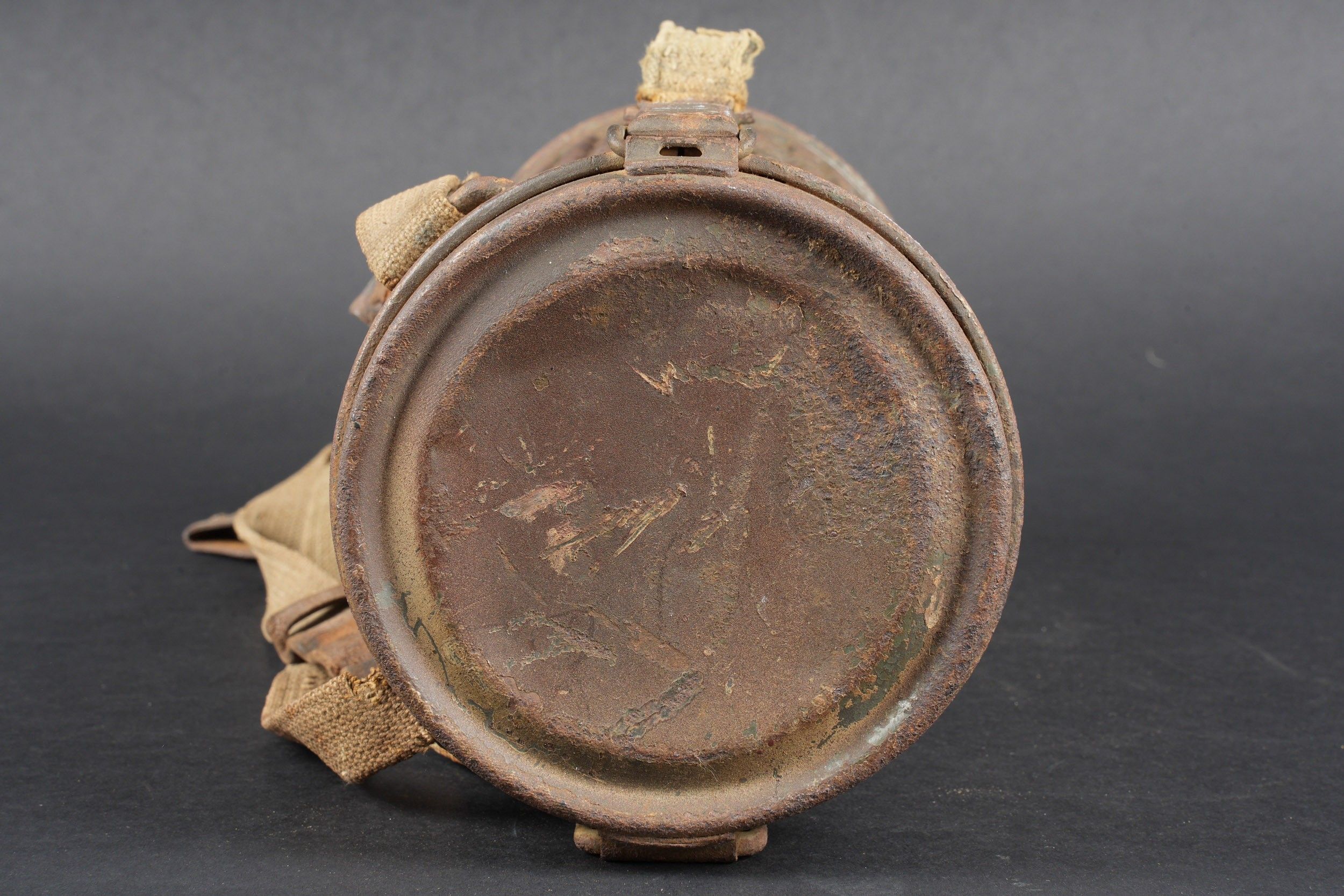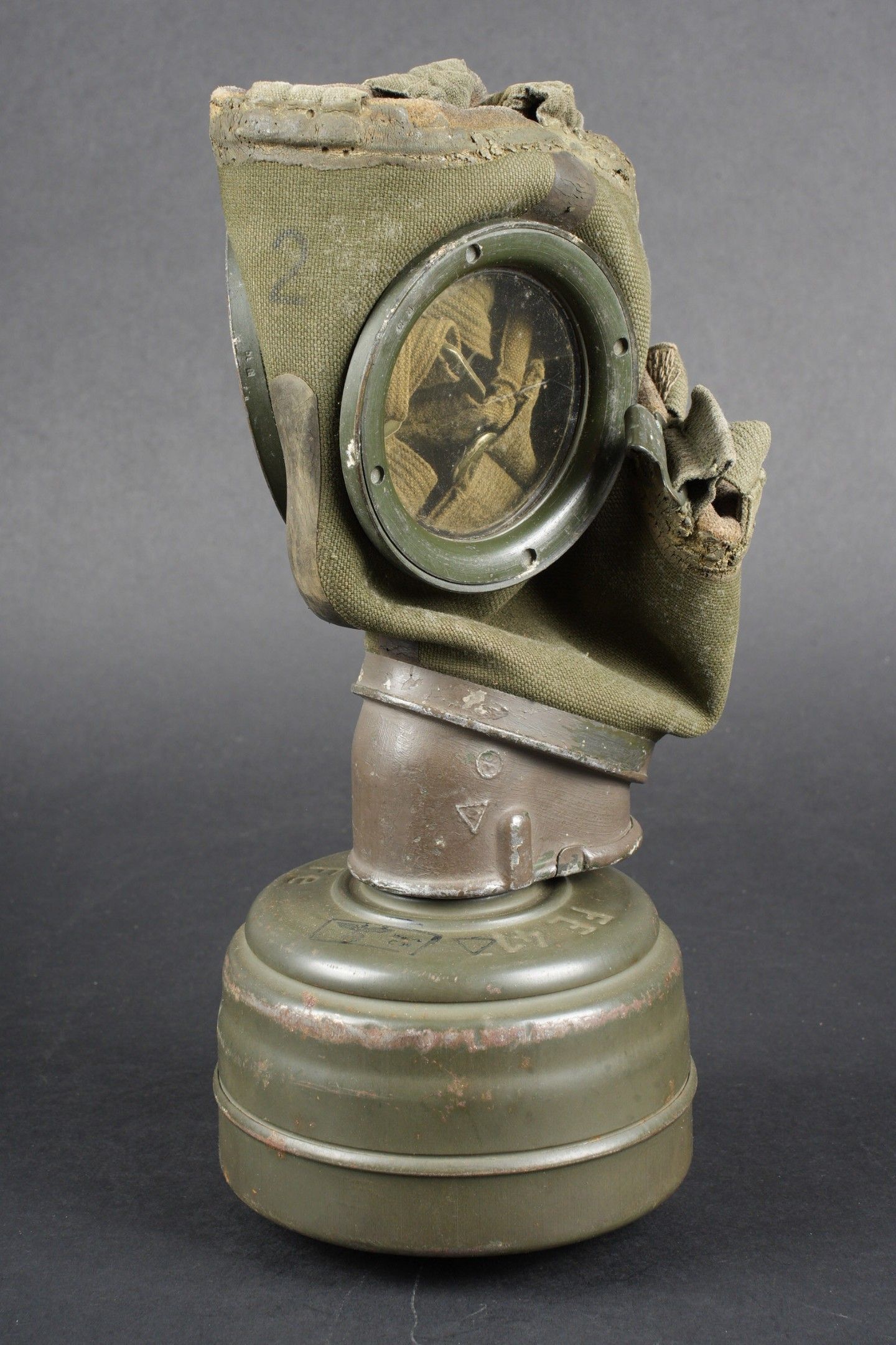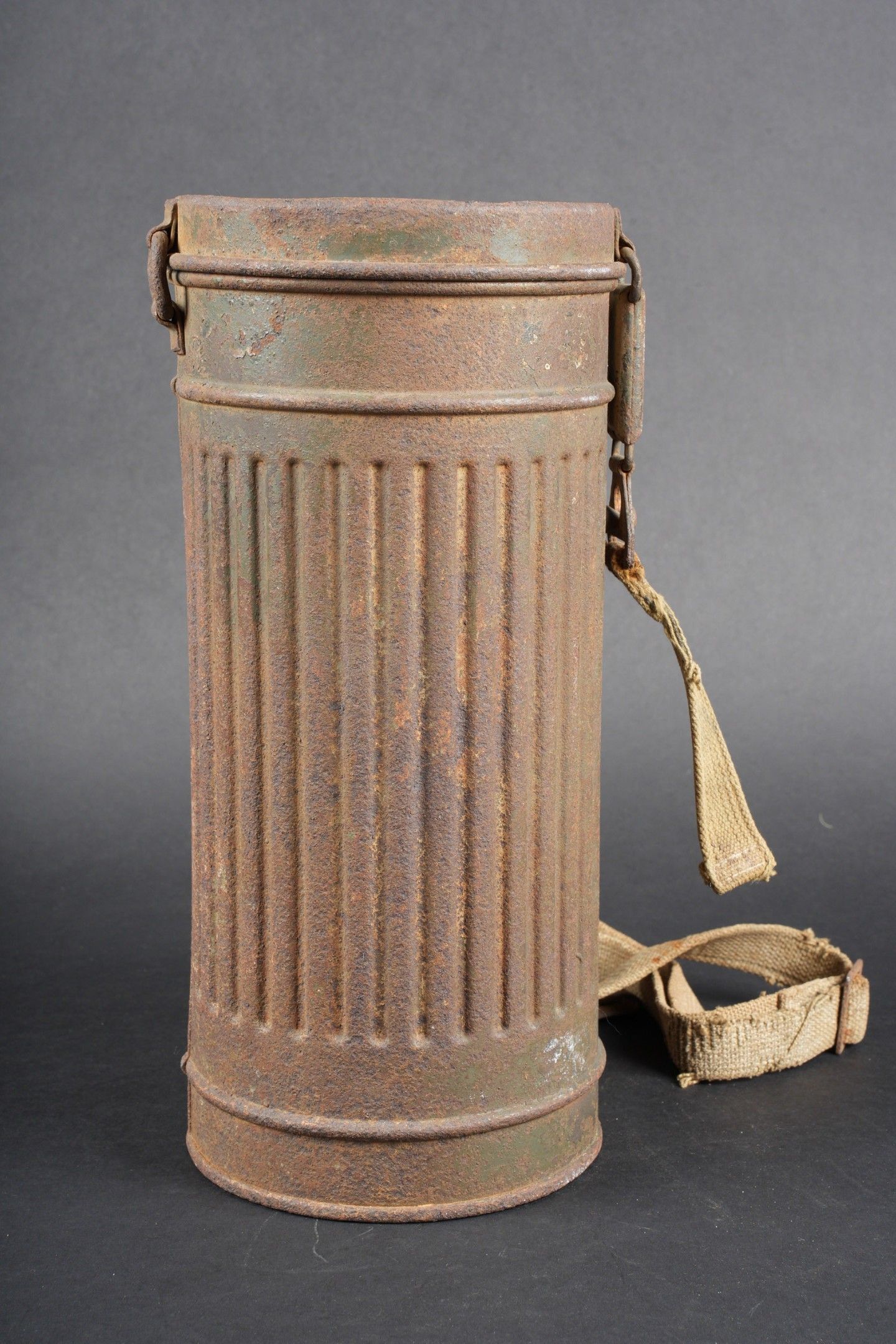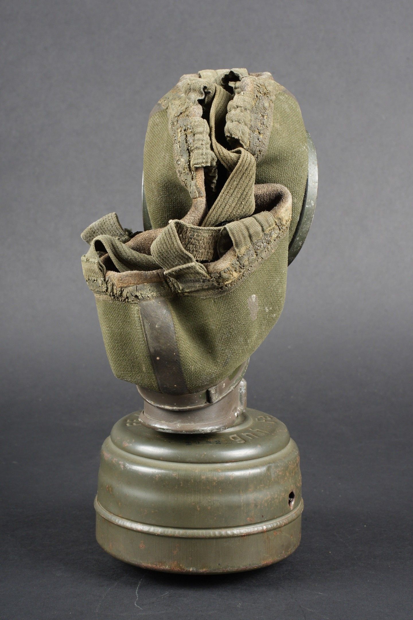 Camouflaged anti-gas mask. Long case. Made of metal. Three-tone camouflage paint, 50% ochre. Part of the case is oxidised. All straps are present. Made by DMB 1938. Spare lenses, cloth and spider are present. Canvas mask, size 2. All straps are present. FE 41 filter, in very good condition. Some wear and oxidation. Condition II+. Camouflaged gas mask set with long metal canister painted in three-tone ochregreensand camouflage about 50% remaining. Partially oxidized. All straps present. Marked DMB 1938. Includes spare lenses, cleaning cloth, and spider insert. Canvas mask, size 2, with all straps intact. Filter FE 41 in very good condition. Some wear and oxidation on the piece. Condition II+