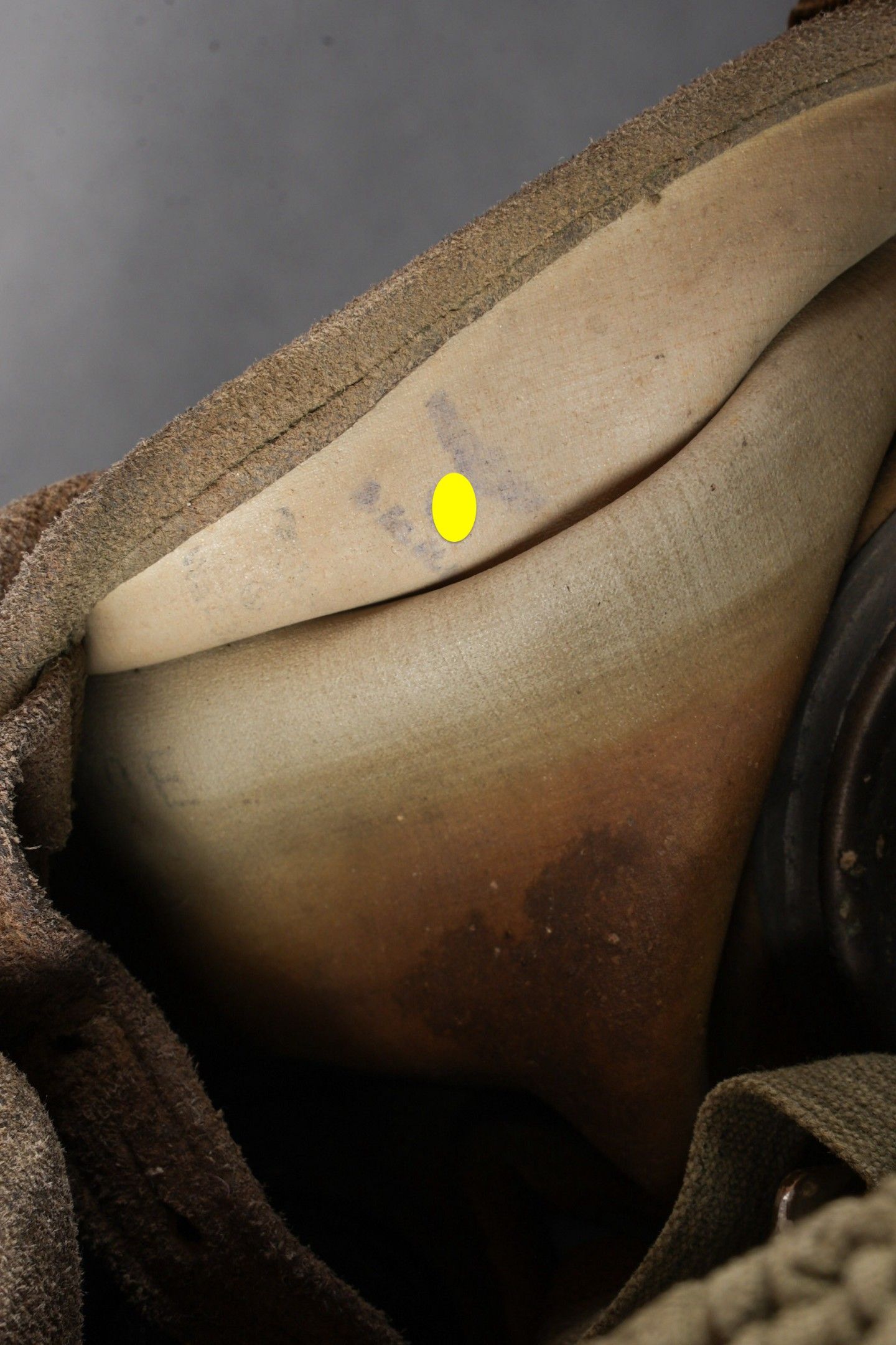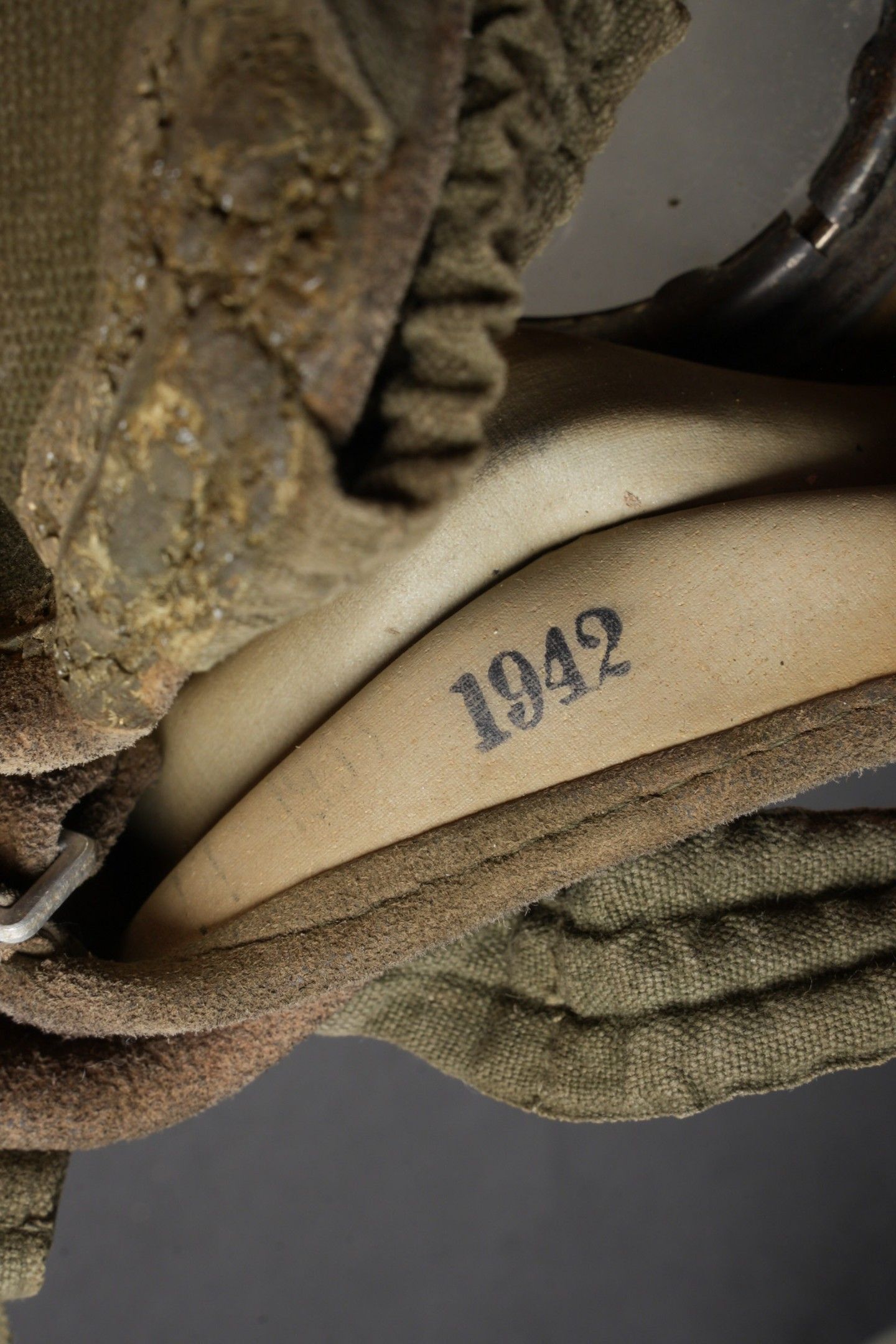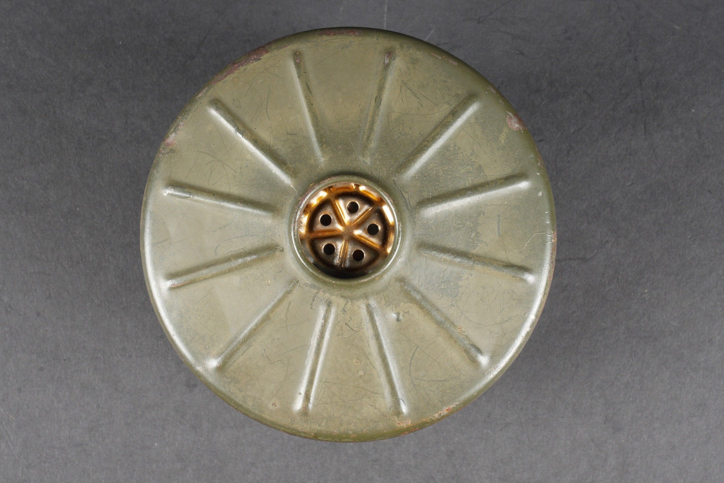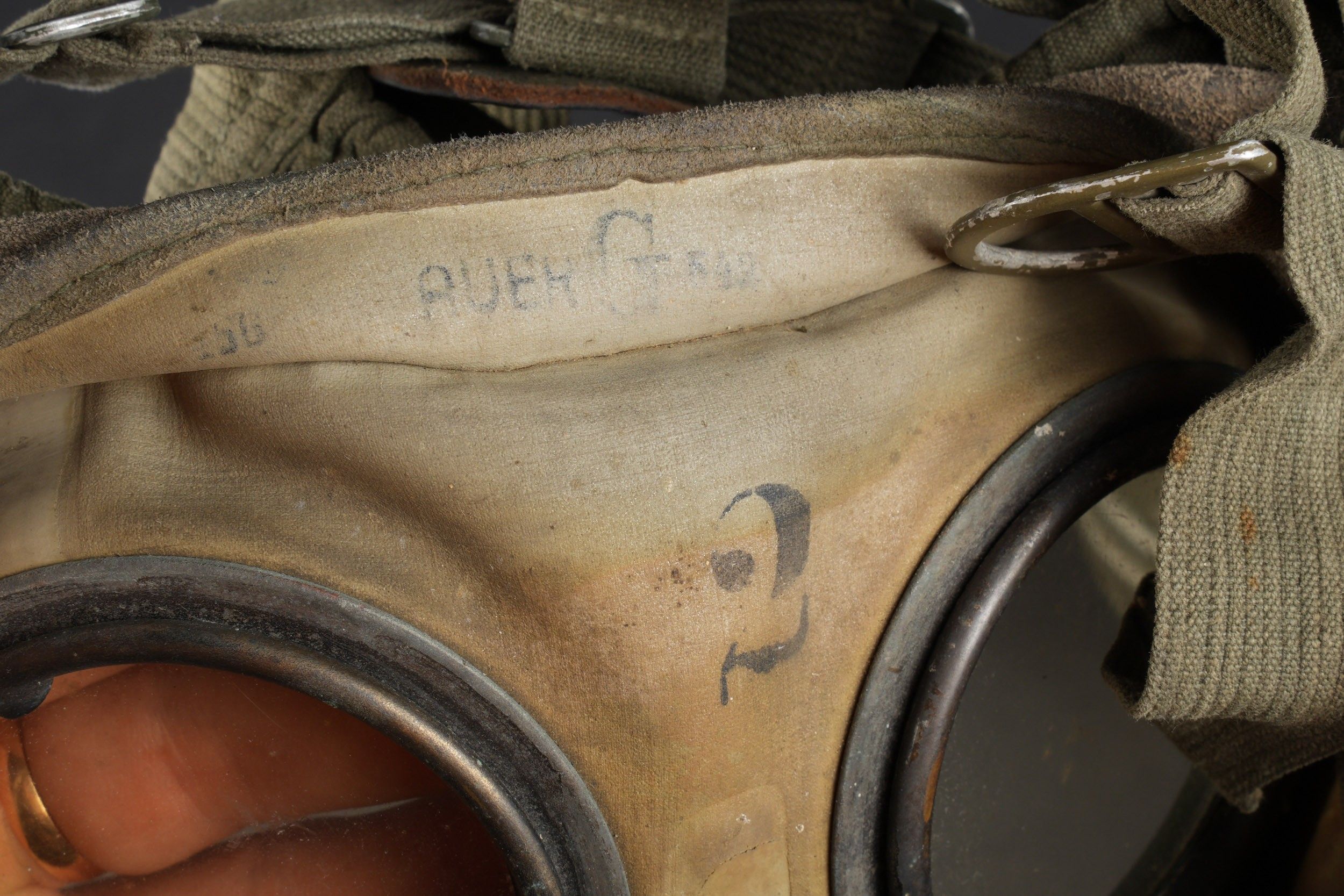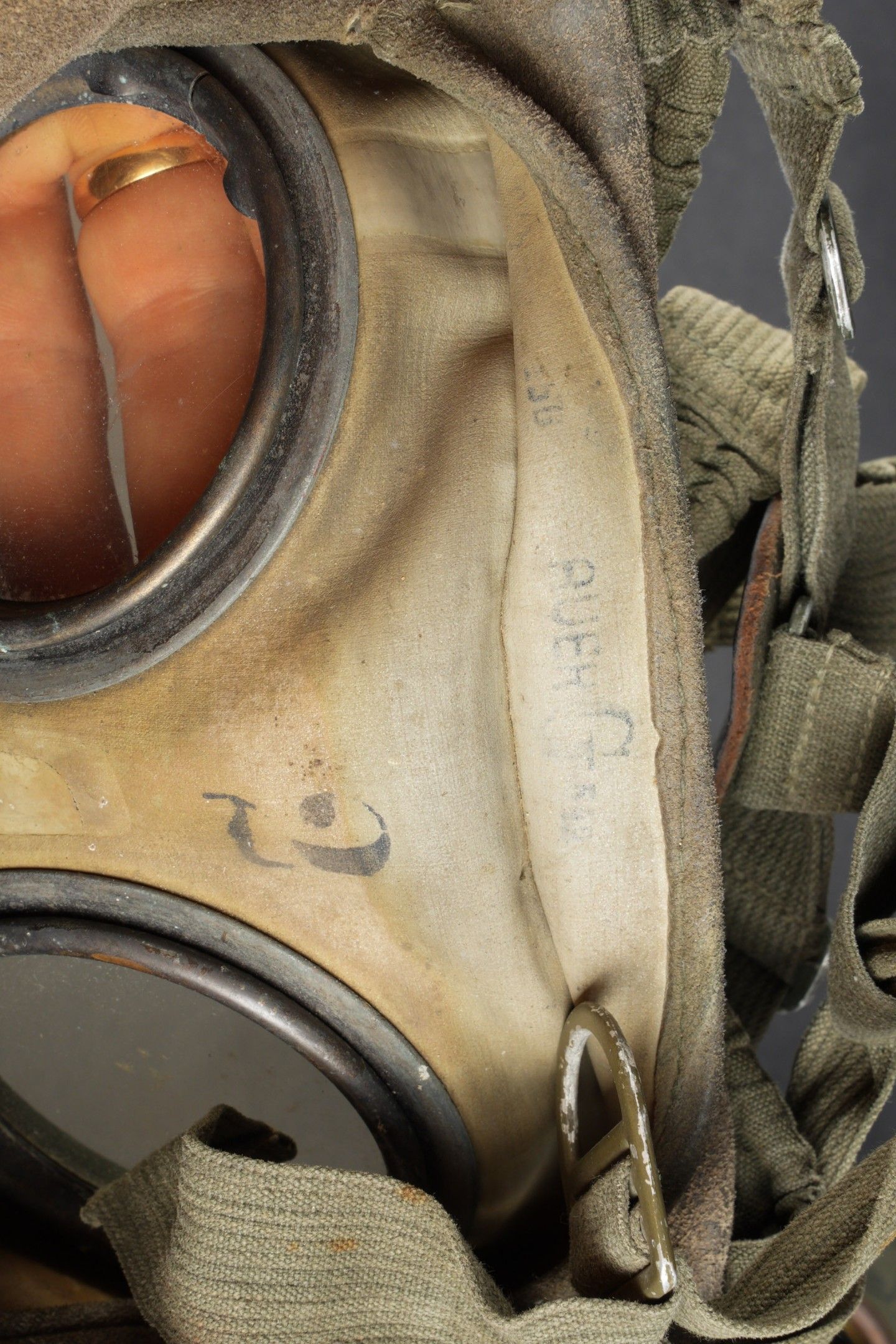 Camouflaged anti-gas mask. Long case. Made of metal. Three-tone camouflage paint, 50% ochre. Part of the case is oxidised. All straps are present. Made by DMB 1938. Spare lenses, cloth and spider are present. Canvas mask, size 2. All straps are present. FE 41 filter, in very good condition. Some wear and oxidation. Condition II+. Camouflaged gas mask set with long metal canister painted in three-tone ochregreensand camouflage about 50% remaining. Partially oxidized. All straps present. Marked DMB 1938. Includes spare lenses, cleaning cloth, and spider insert. Canvas mask, size 2, with all straps intact. Filter FE 41 in very good condition. Some wear and oxidation on the piece. Condition II+