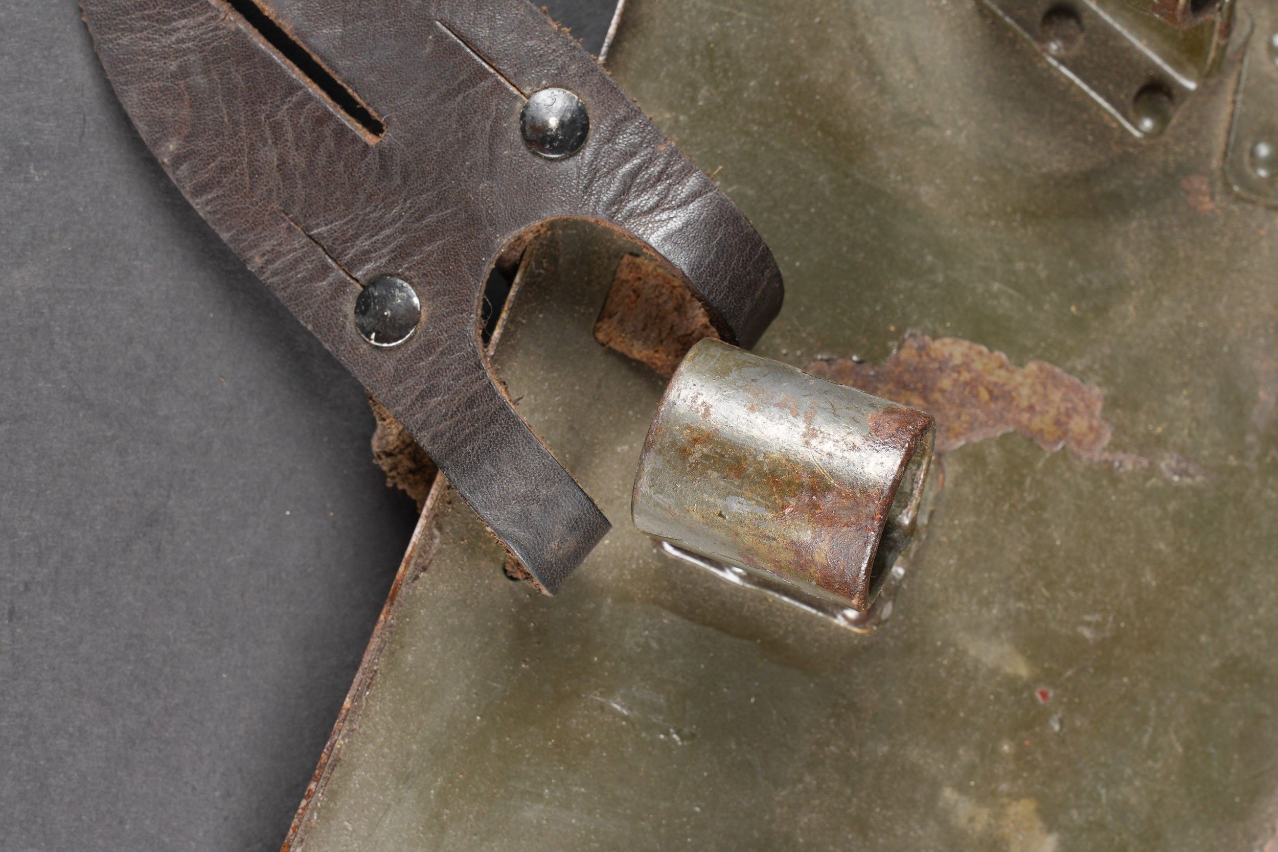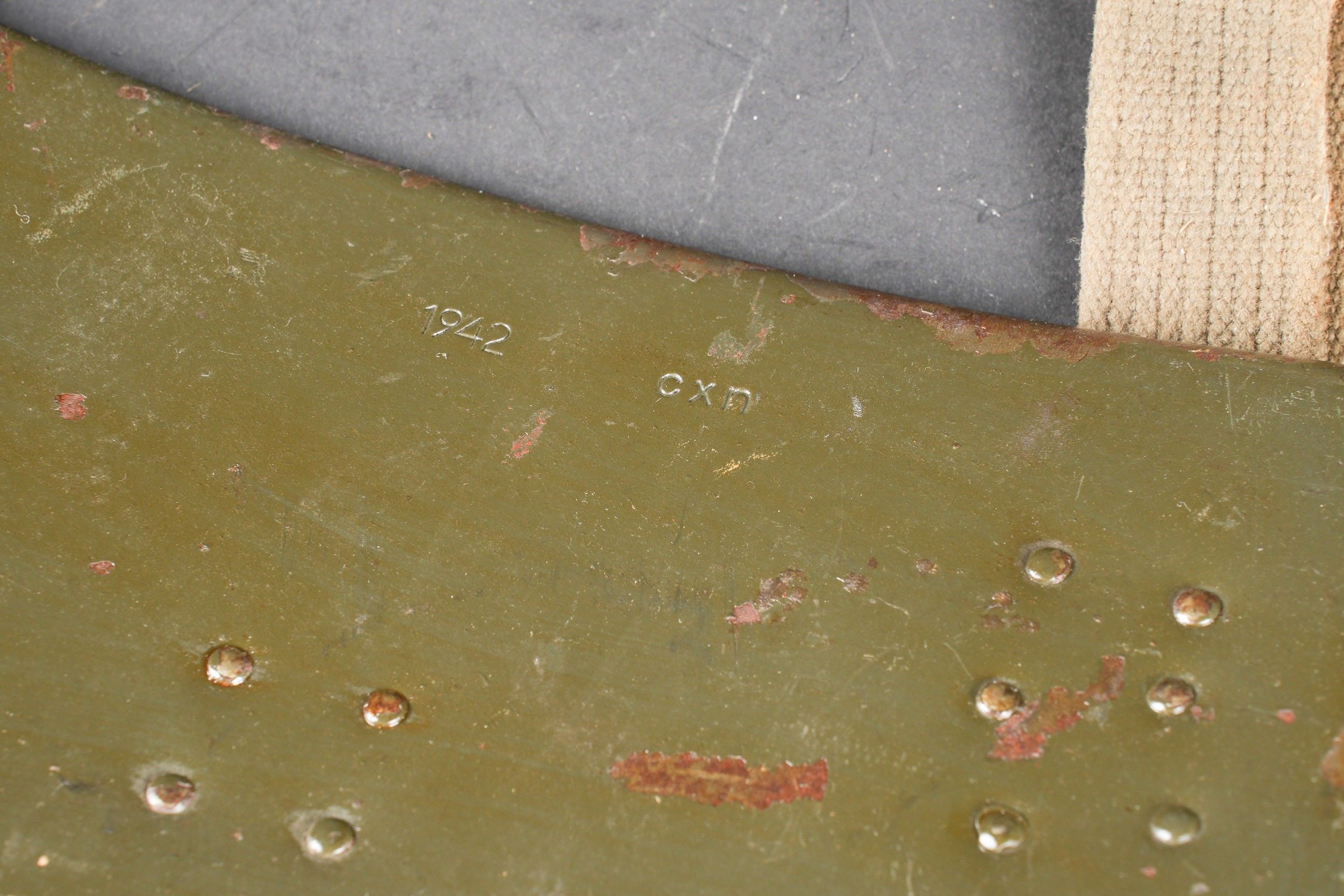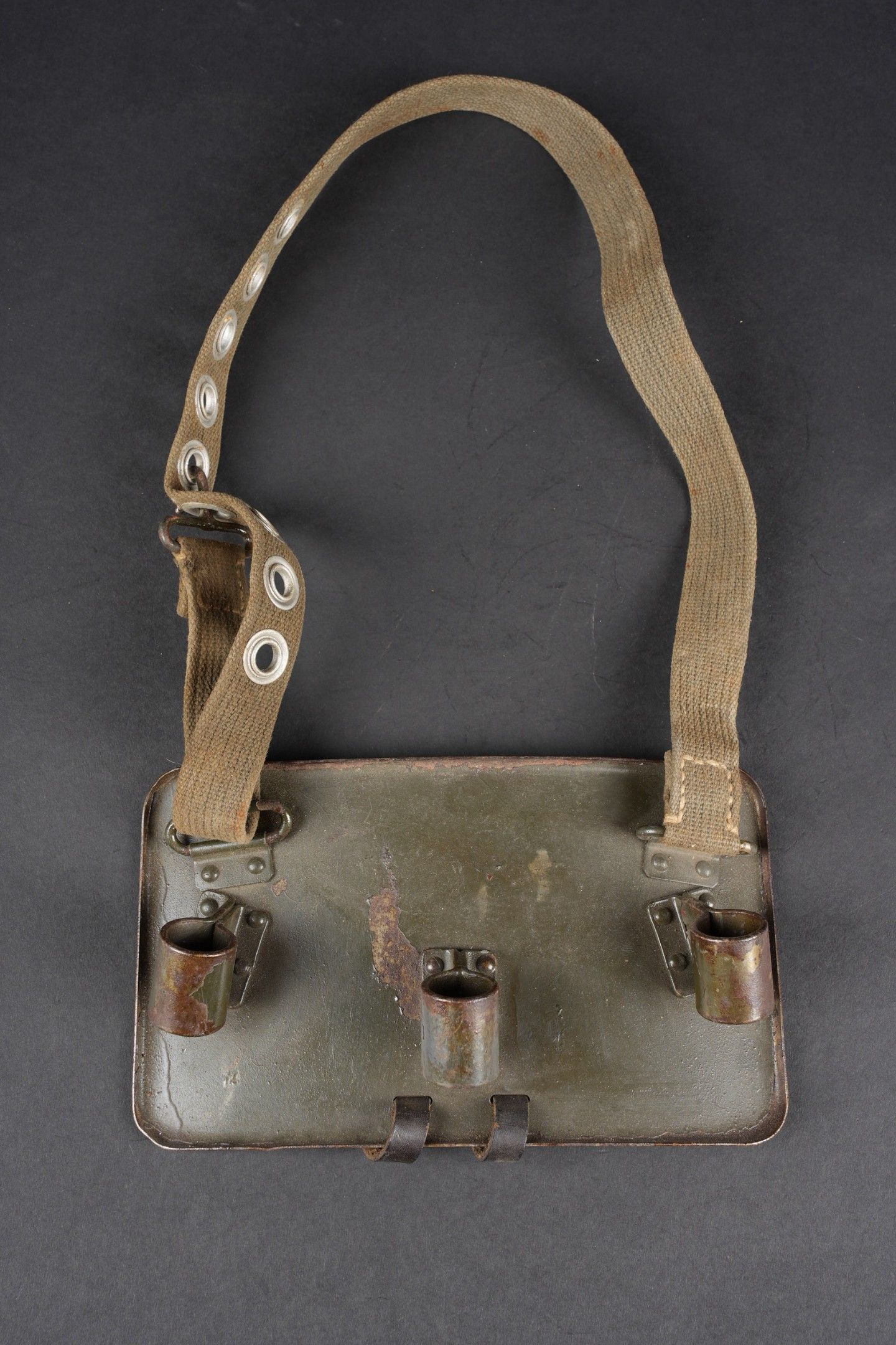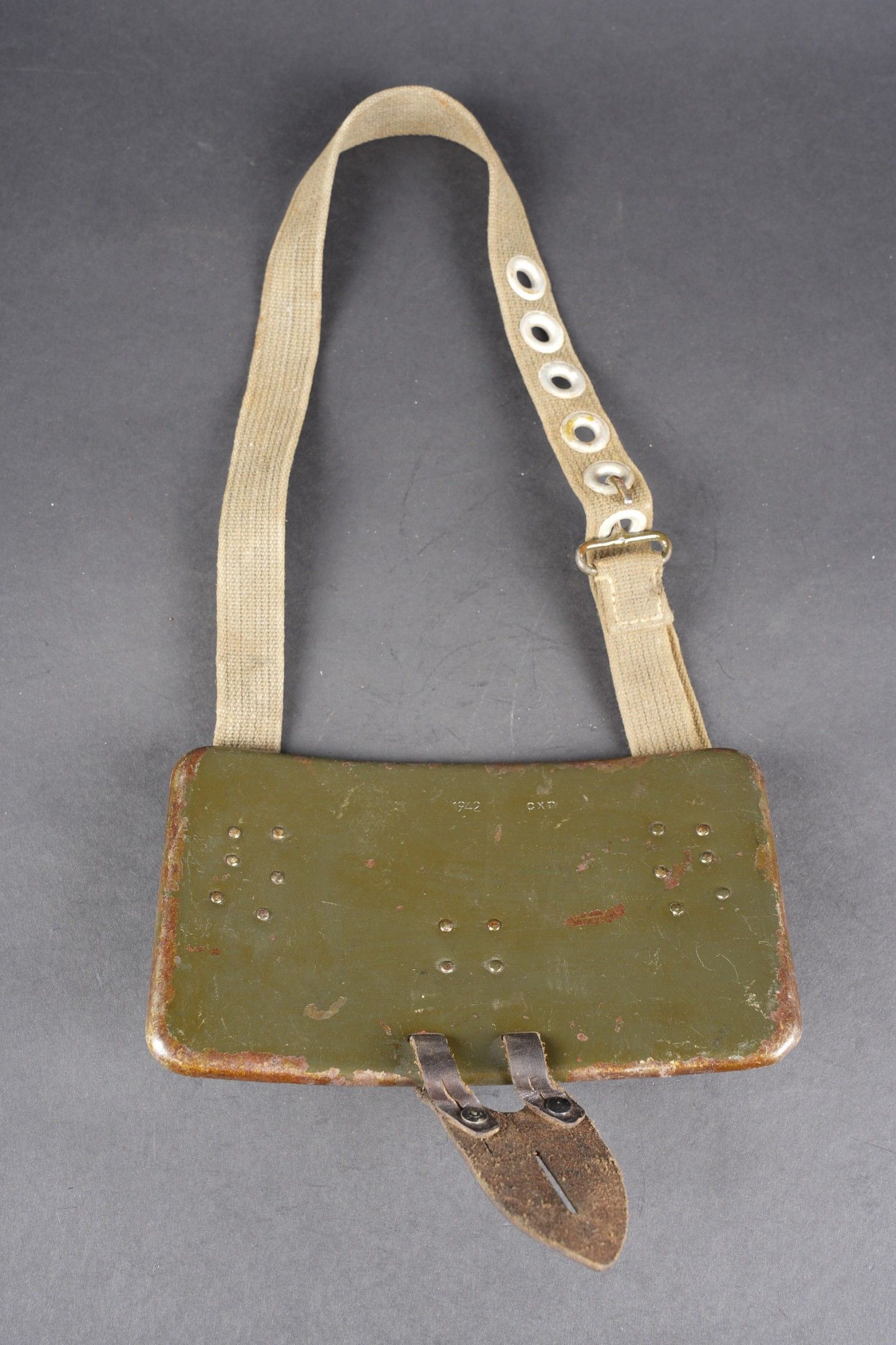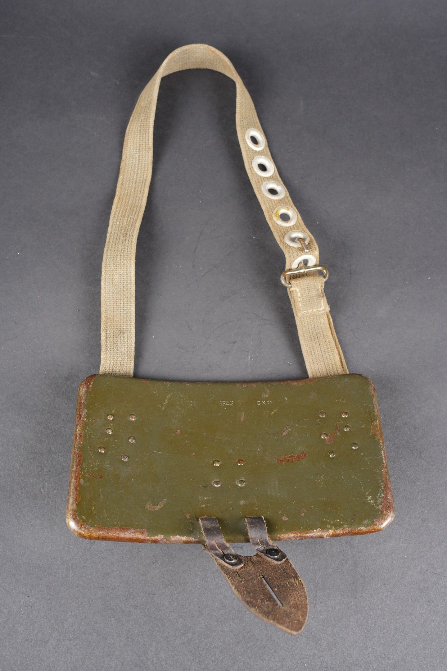 Chest support for German rangefinder tripod. Metal plate, 70% Feldgrau paint. Made by CNX 1942. Leather tab for attaching to buttonhole, complete. The adjustable strap is complete. Some wear and patina. Condition II+. German rangefinder chest support. Metal plate with 70% of original Feldgrau paint. Made by CNX, dated 1942. Leather strap for buttonhole attachment complete. Adjustable strap intact. Some wear and patina on the piece. Condition II+