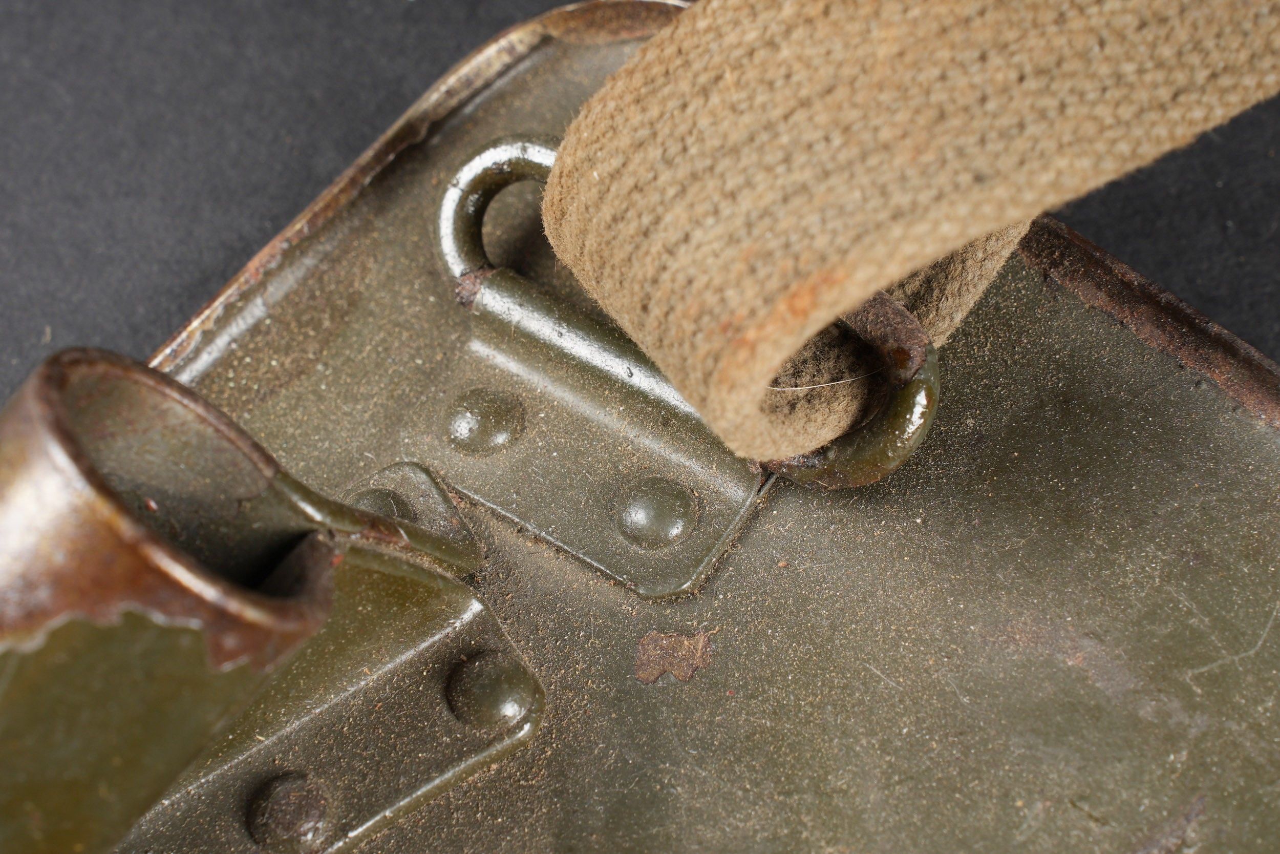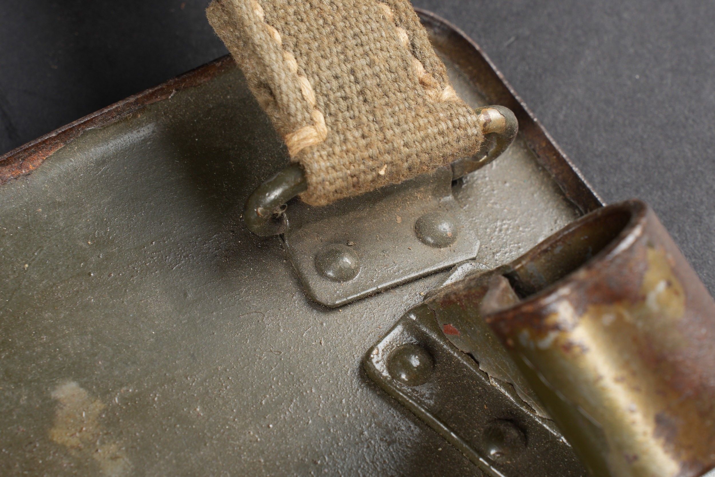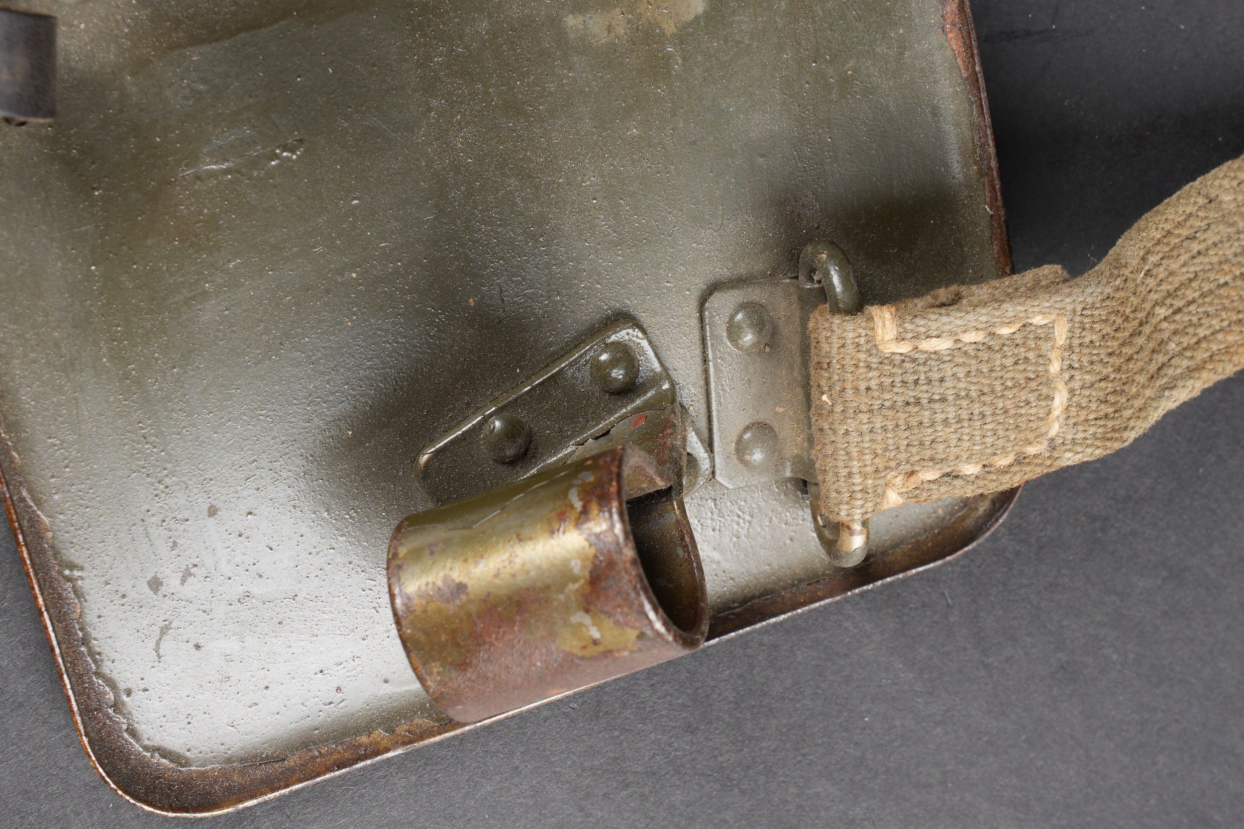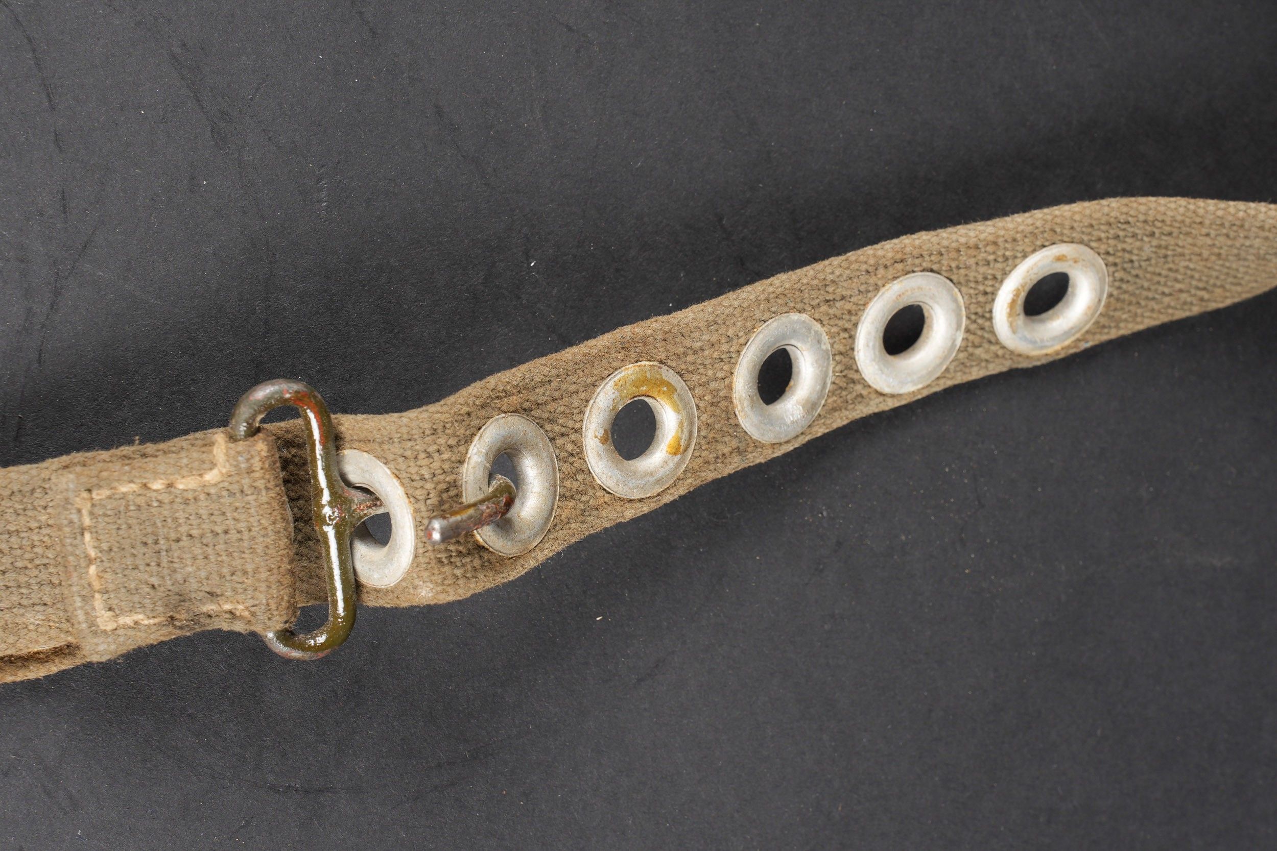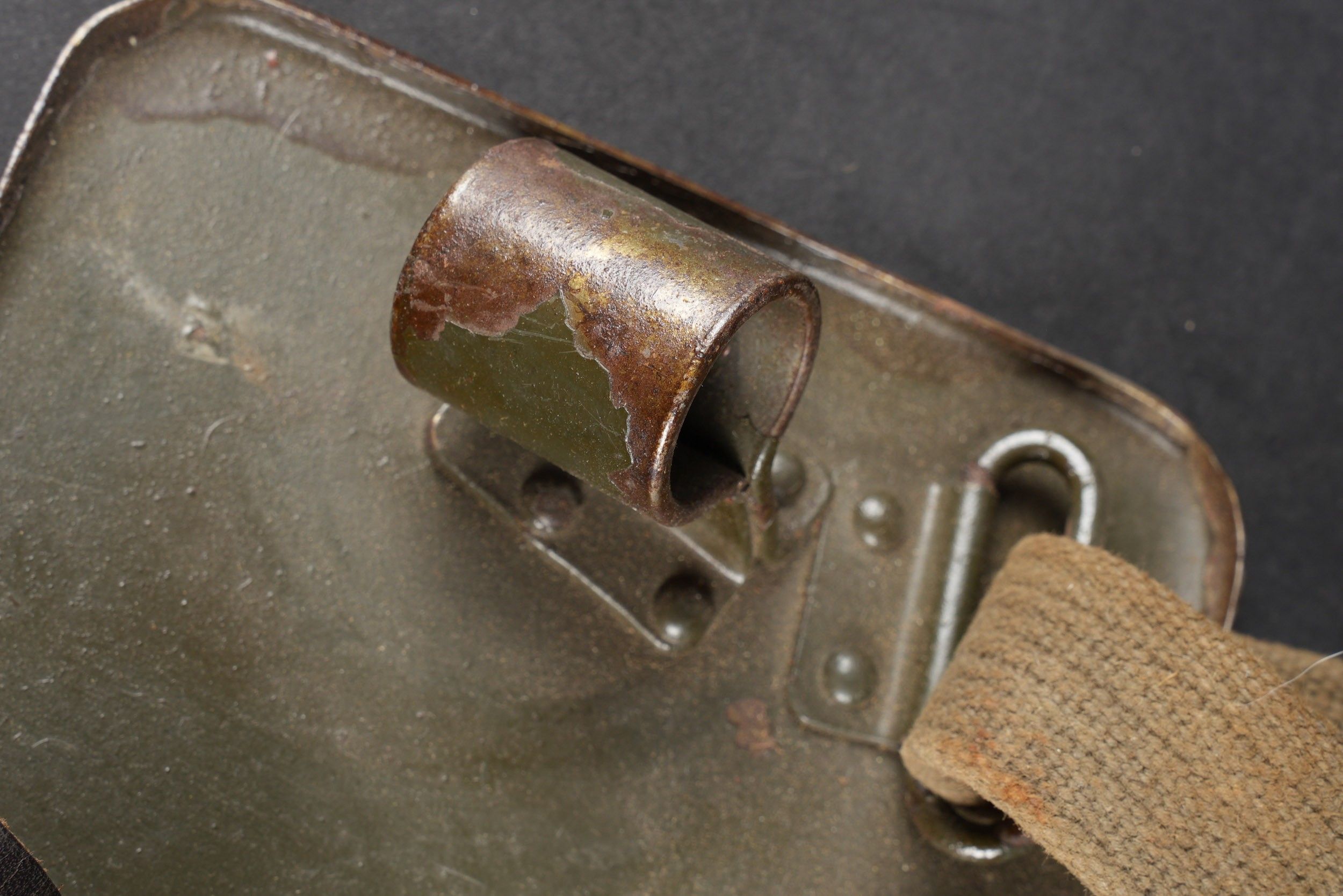 Chest support for German rangefinder tripod. Metal plate, 70% Feldgrau paint. Made by CNX 1942. Leather tab for attaching to buttonhole, complete. The adjustable strap is complete. Some wear and patina. Condition II+. German rangefinder chest support. Metal plate with 70% of original Feldgrau paint. Made by CNX, dated 1942. Leather strap for buttonhole attachment complete. Adjustable strap intact. Some wear and patina on the piece. Condition II+