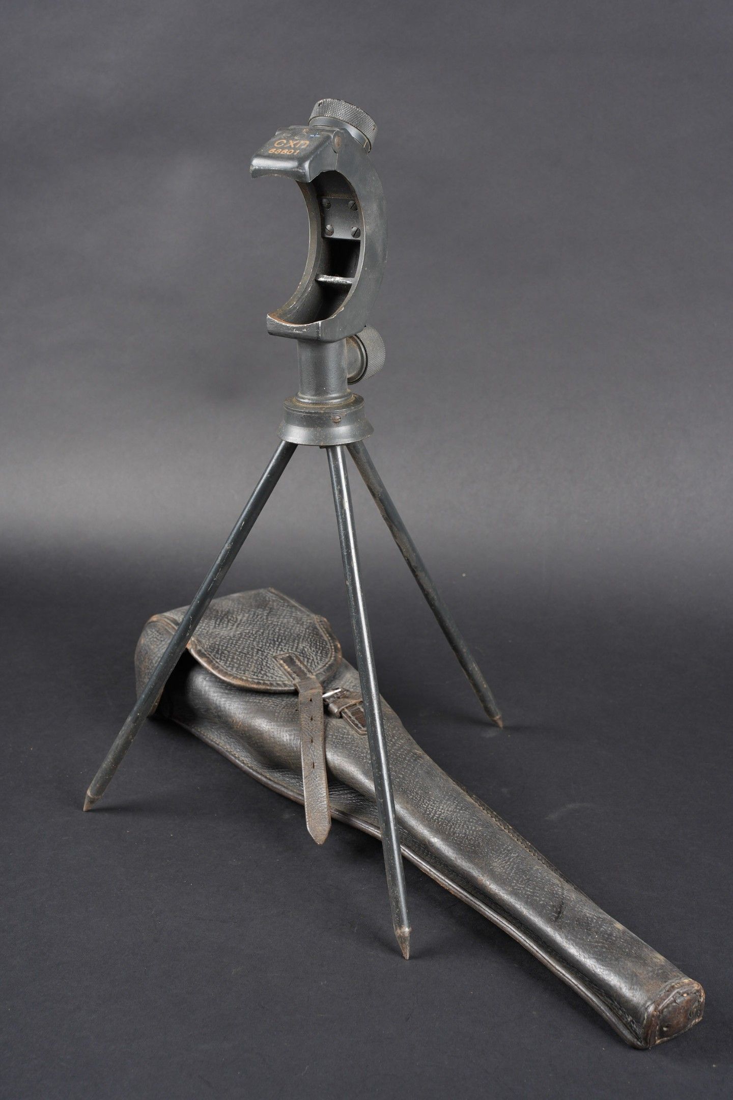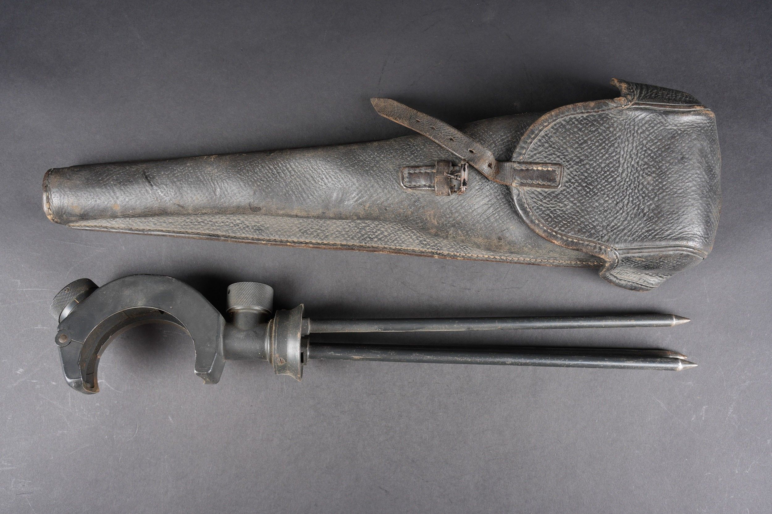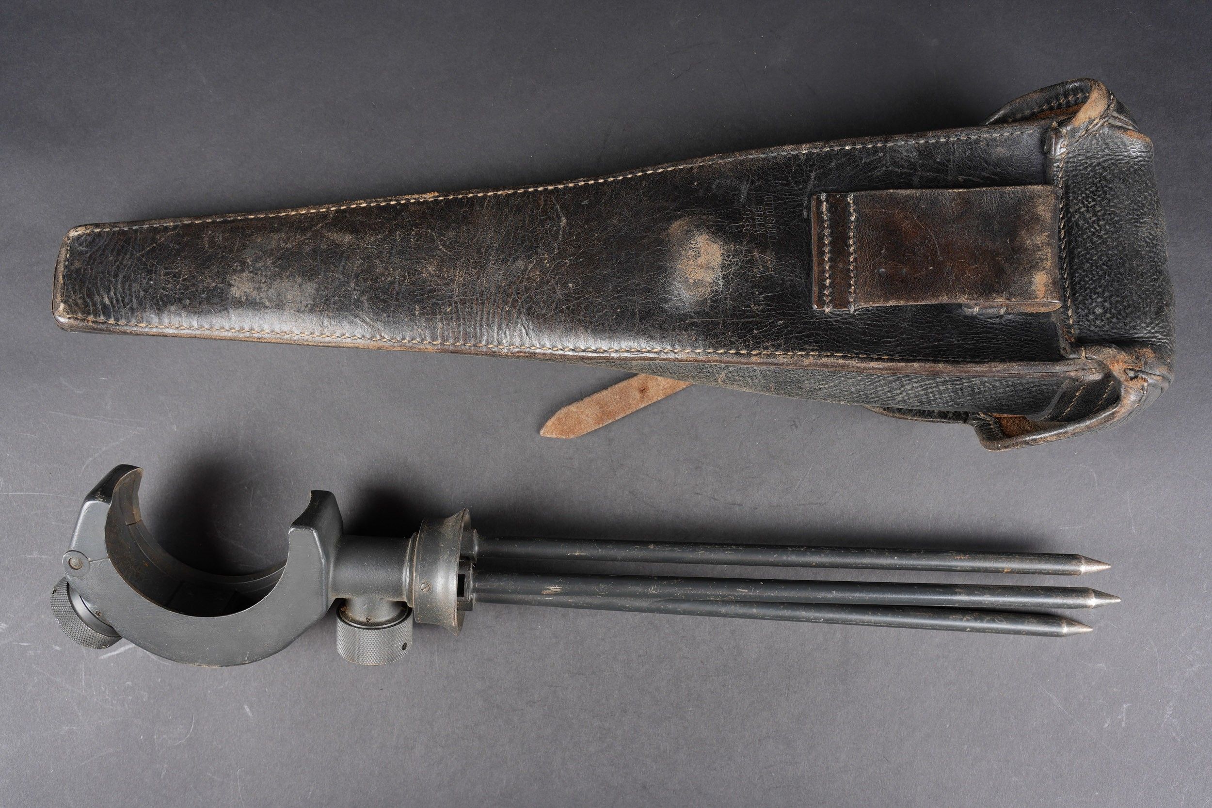 German rangefinder tripod. Made of metal. Feet are adjustable. All moving parts are functional. Manufacture CNX 68601, O+, with Waa eagle. 90% Feldgrau paint. Rare thick black leather cover. The closing strap is functional. The belt loop is complete. Made by Otto Sindel Berlin 1936, with Reichsamt eagle. Some wear and patina. Condition II+. German rangefinder tripod in metal with adjustable legs. All moving parts functional. Marked CNX 68601, O+, with Waa eagle. 90% of original Feldgrau paint. Rare heavy black leather carrying case with functional closure strap and complete belt loop. Made by Otto Sindel, Berlin, 1936, with Reichsamt eagle. Some wear and patina on the piece. Condition II+