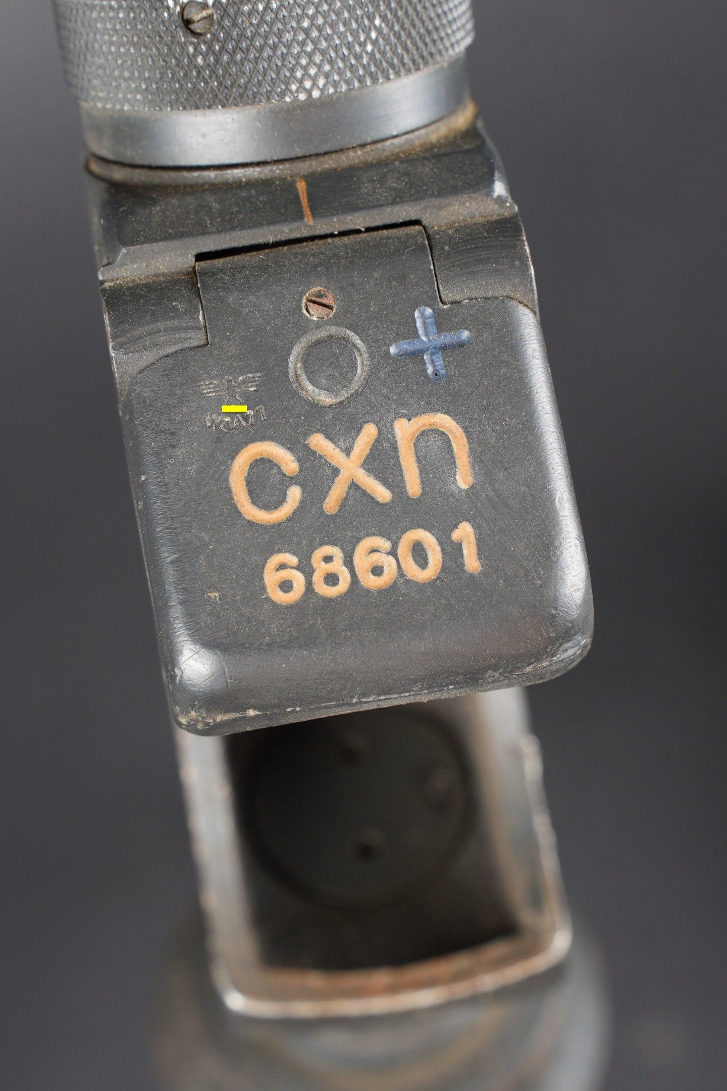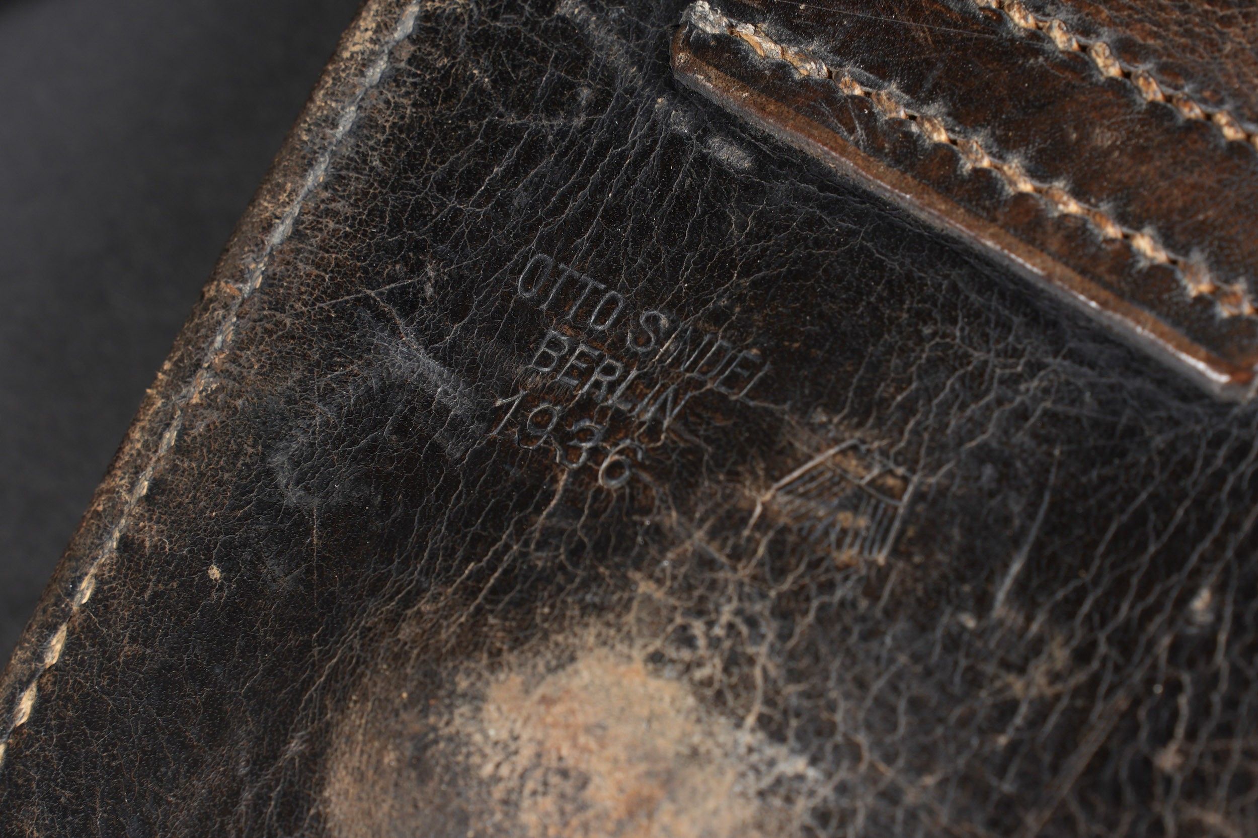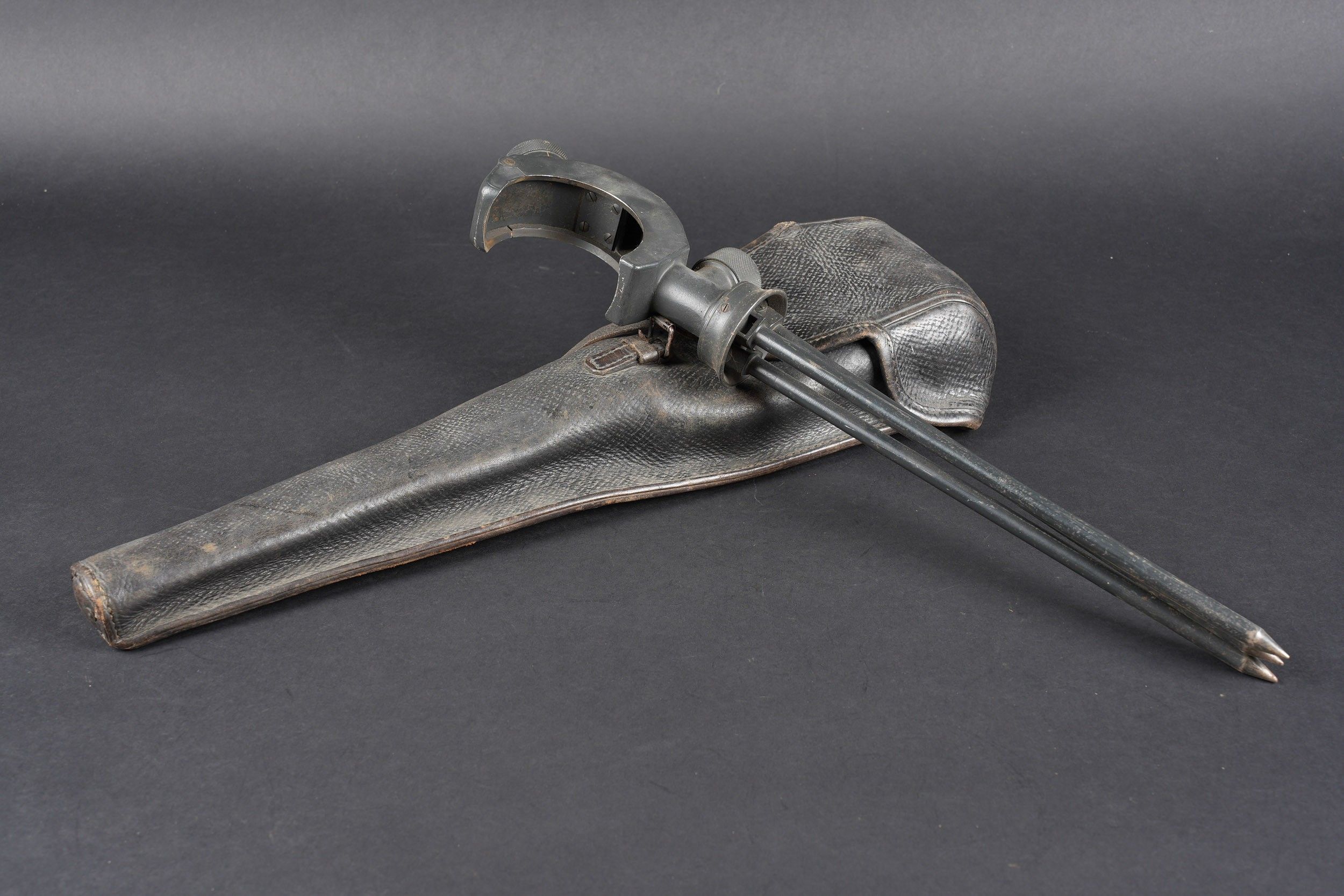 German rangefinder tripod. Made of metal. Feet are adjustable. All moving parts are functional. Manufacture CNX 68601, O+, with Waa eagle. 90% Feldgrau paint. Rare thick black leather cover. The closing strap is functional. The belt loop is complete. Made by Otto Sindel Berlin 1936, with Reichsamt eagle. Some wear and patina. Condition II+. German rangefinder tripod in metal with adjustable legs. All moving parts functional. Marked CNX 68601, O+, with Waa eagle. 90% of original Feldgrau paint. Rare heavy black leather carrying case with functional closure strap and complete belt loop. Made by Otto Sindel, Berlin, 1936, with Reichsamt eagle. Some wear and patina on the piece. Condition II+