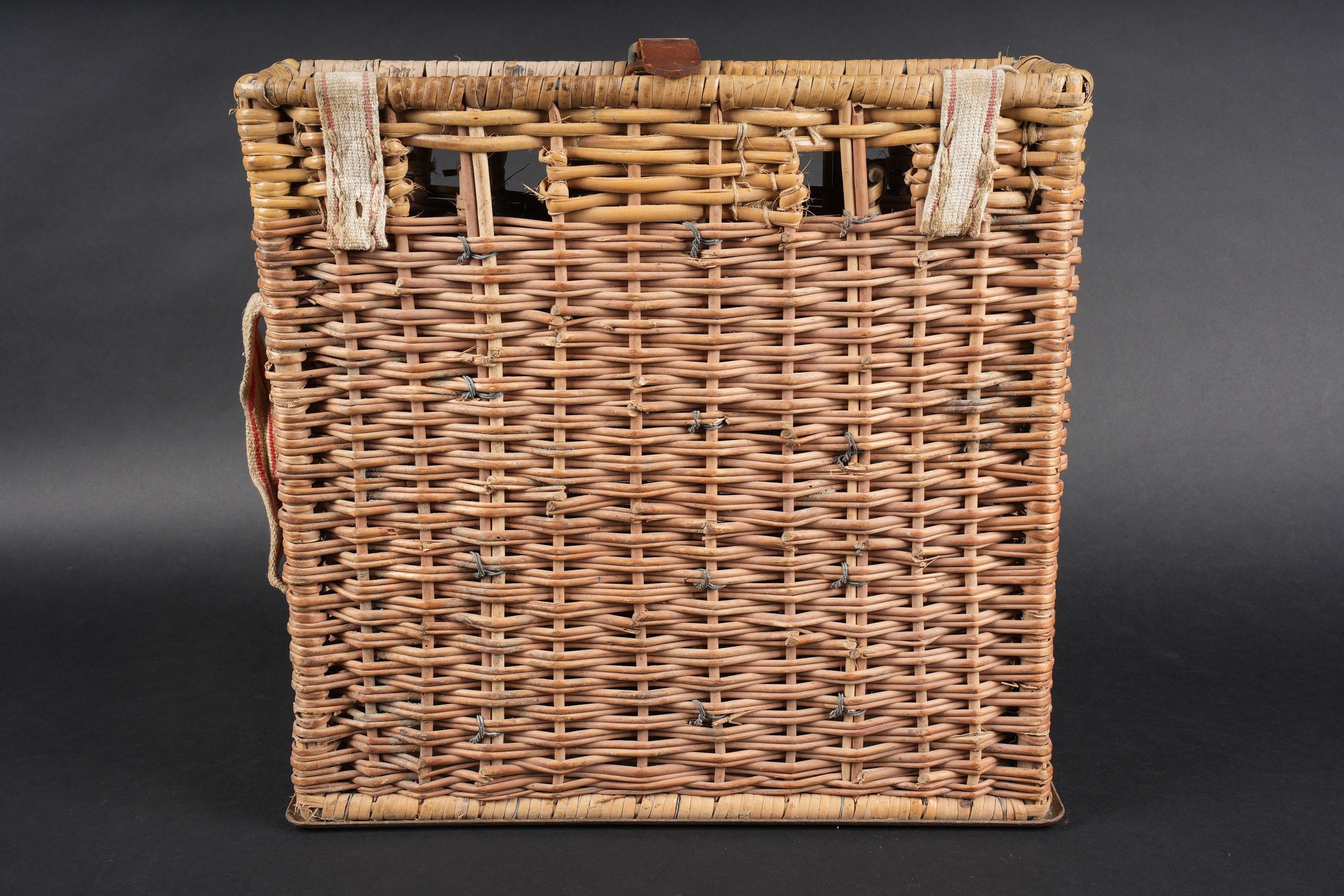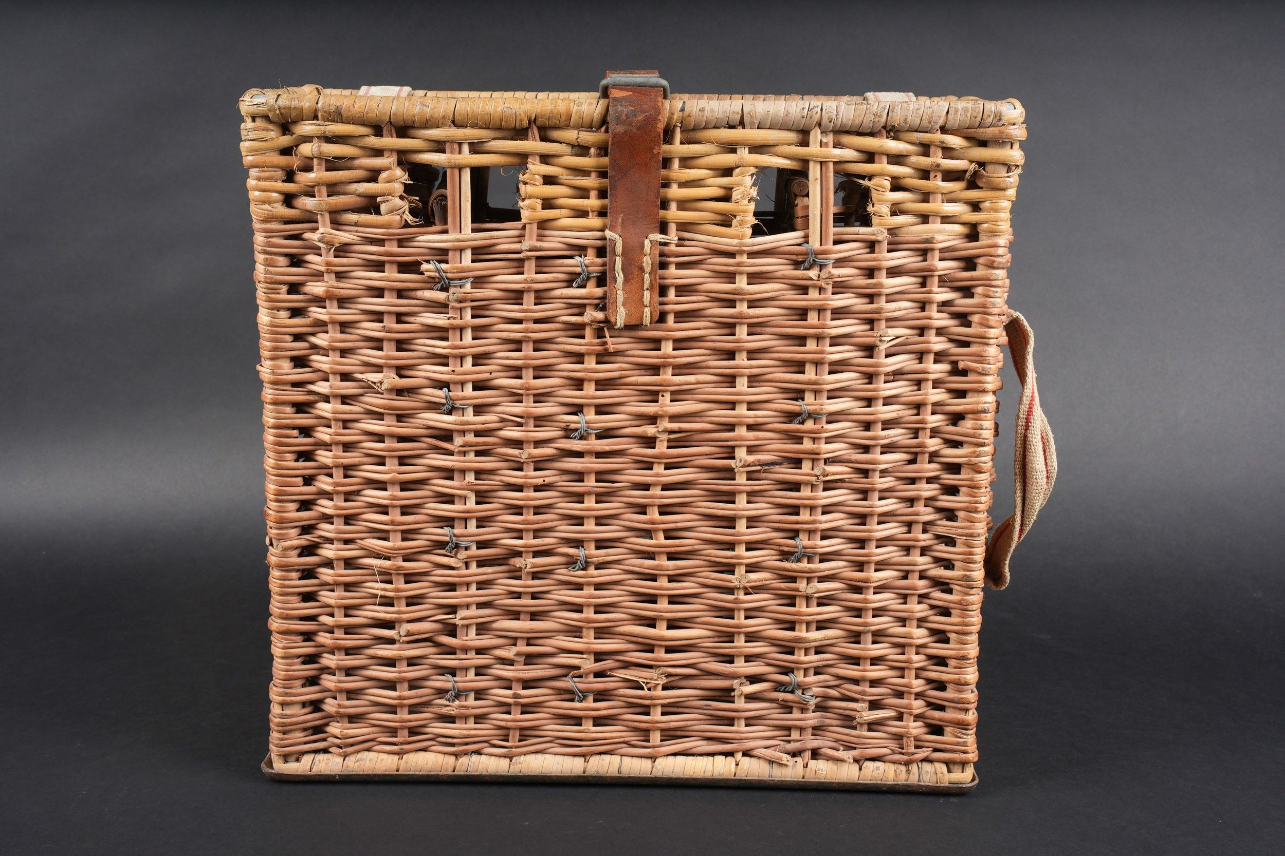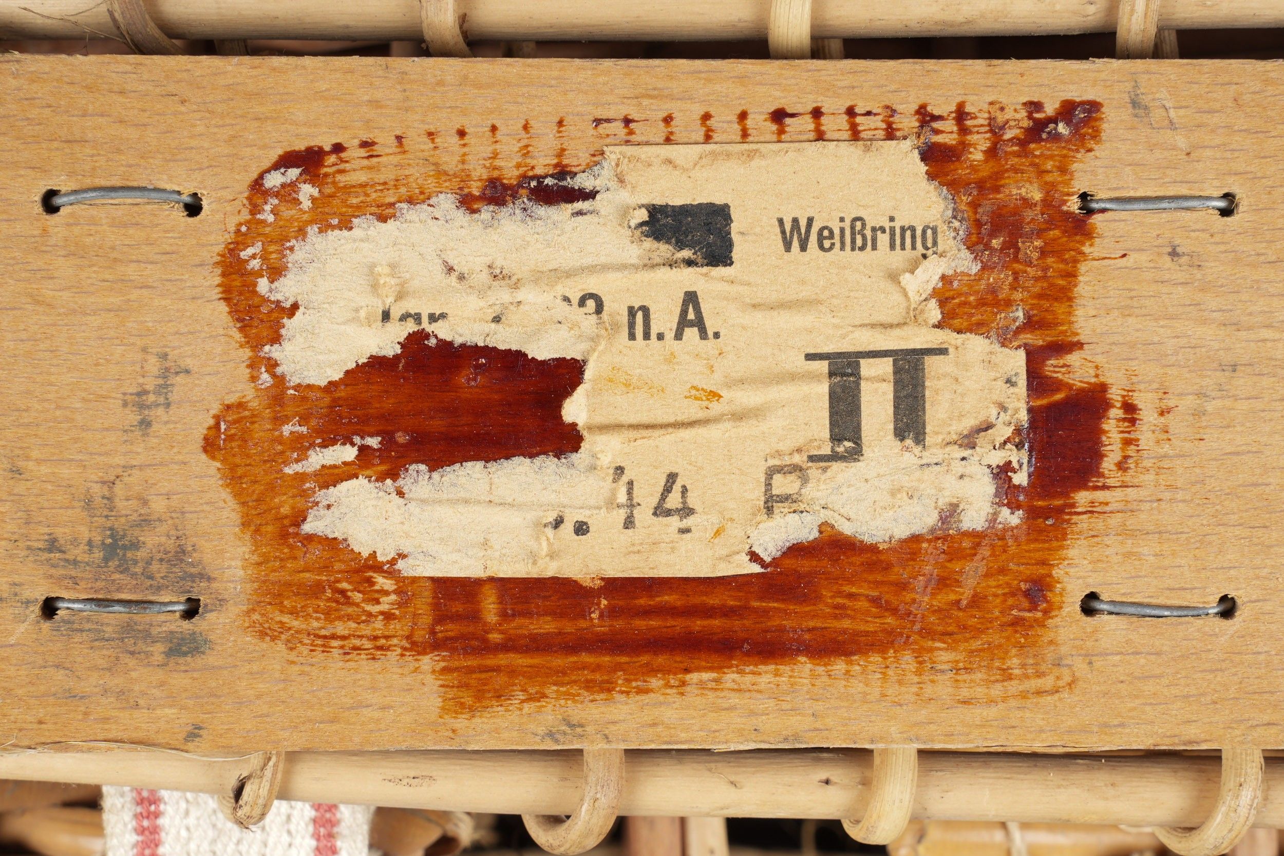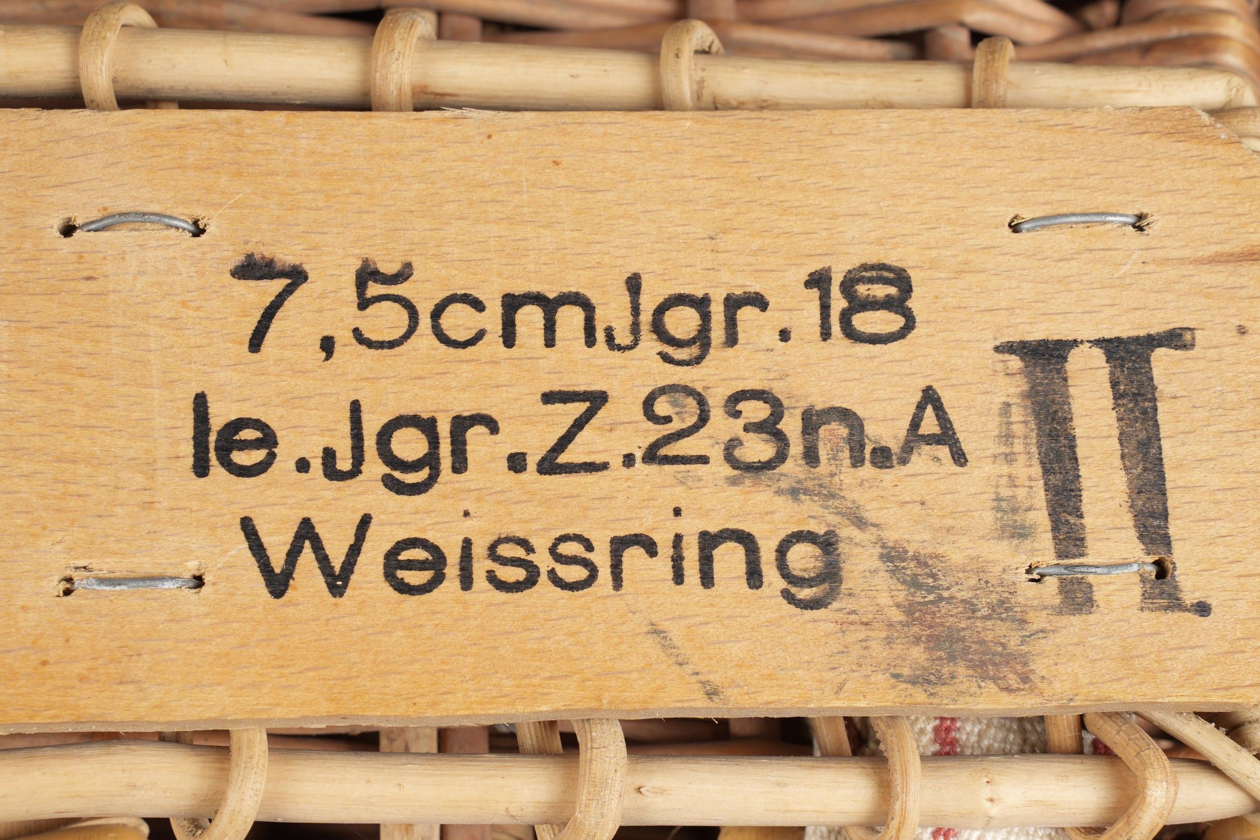 Basket for 4 shells Leichtes InfanterieGeschütz 18. Made of wicker. Metal bottom. Four compartments, the central one has canvas reinforcement. Complete wooden lid, held in place by strips of cloth. Brown leather strap closure. Markings under lid 7.5 cmjgr 18 Le JGR Z 23nA Weissring II . Waa eagle, made by AJC 1940. Label present but incomplete, dated 1944. The side carrying handle is present. Slight wear and patina. Condition I-. Basket for four 7.5 cm Leichtes Infanteriegeschütz 18 shells. Wicker body with metal base. Four compartments, central one reinforced with fabric. Complete wooden lid held by cloth bands. Leather closure strap intact. Marked under the lid 7,5 cm Jgr 18 Le JGR Z 23nA Weissring II with Waa eagle, made by AJC 1940. Label partially preserved, dated 1944. Side carrying handle present. Slight wear and patina on the piece. Condition I-