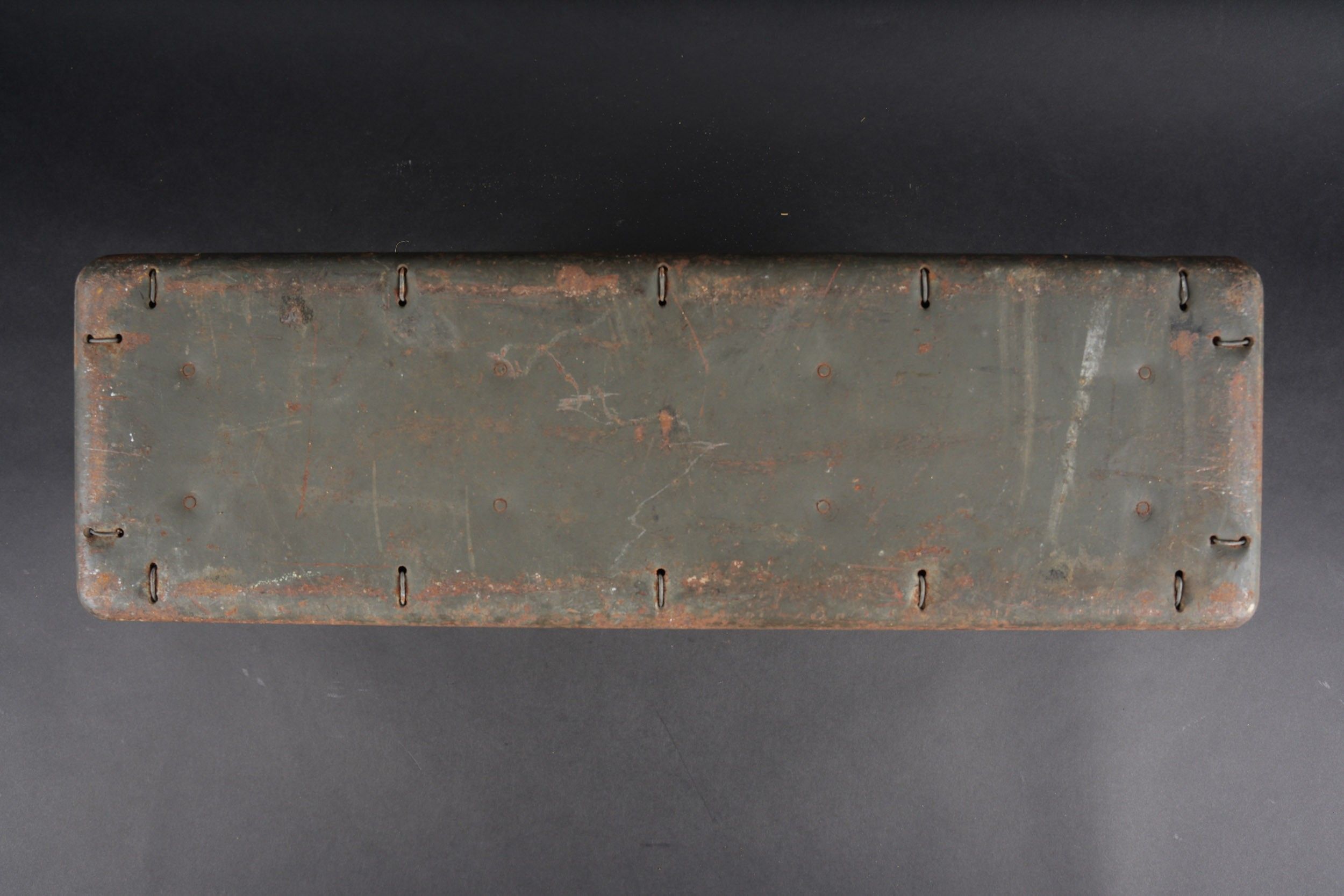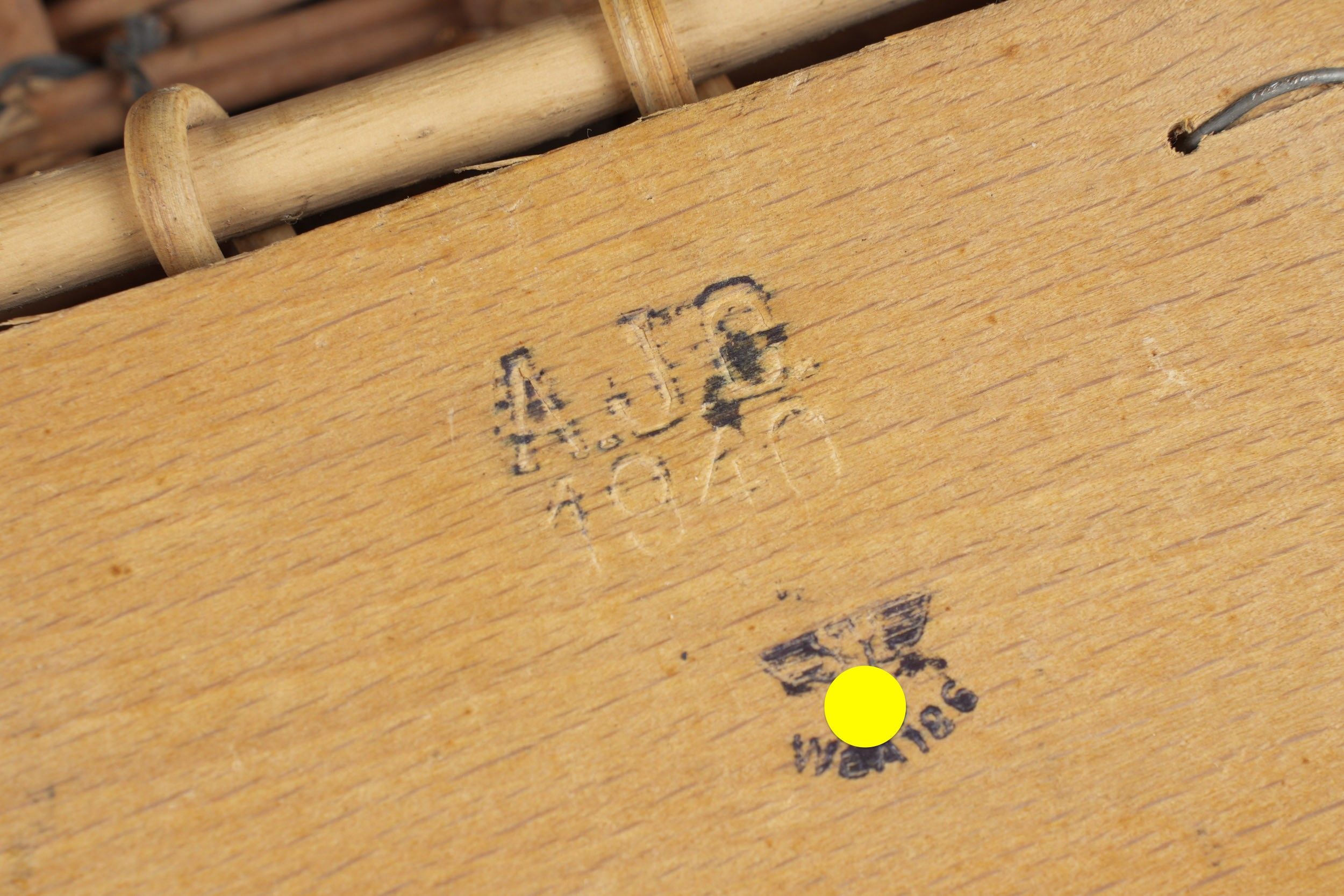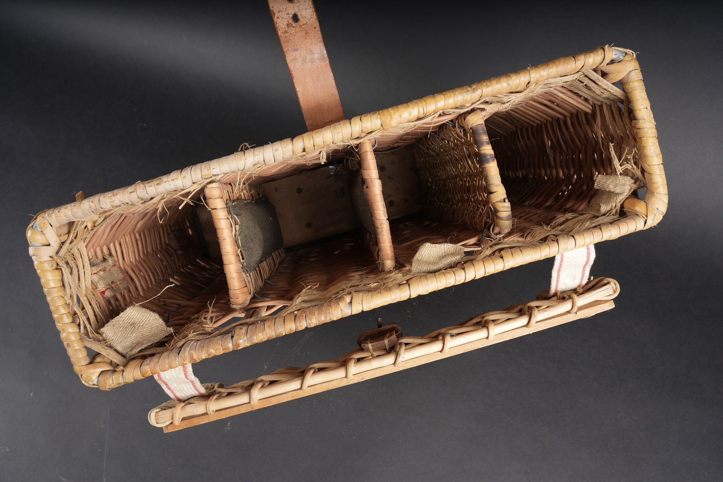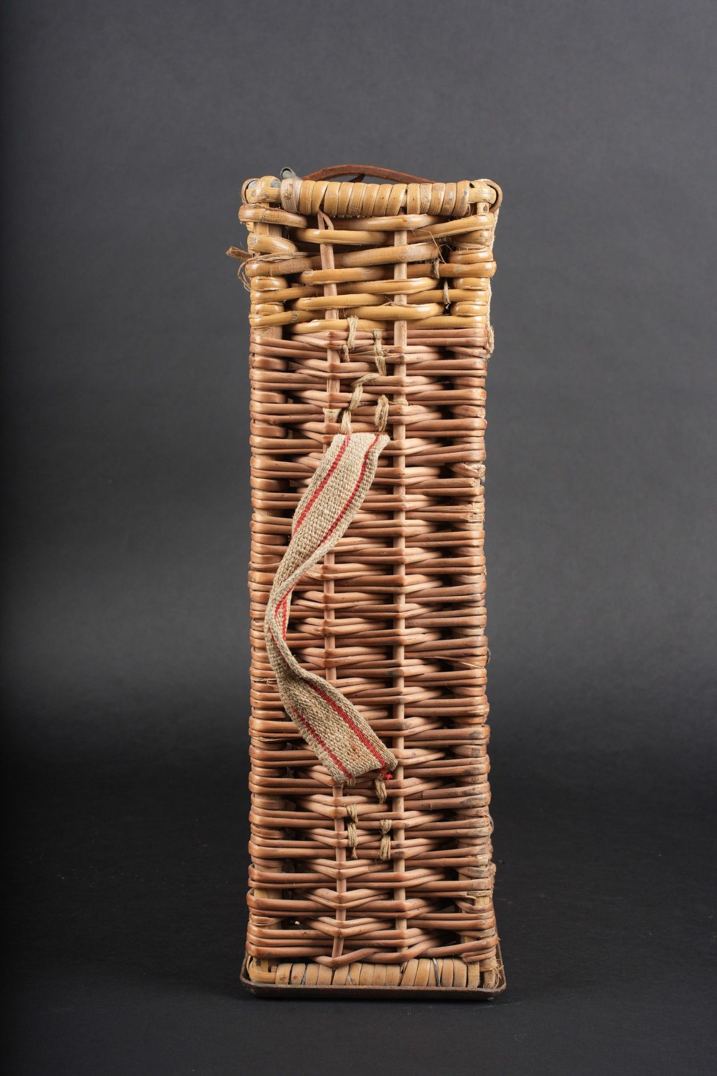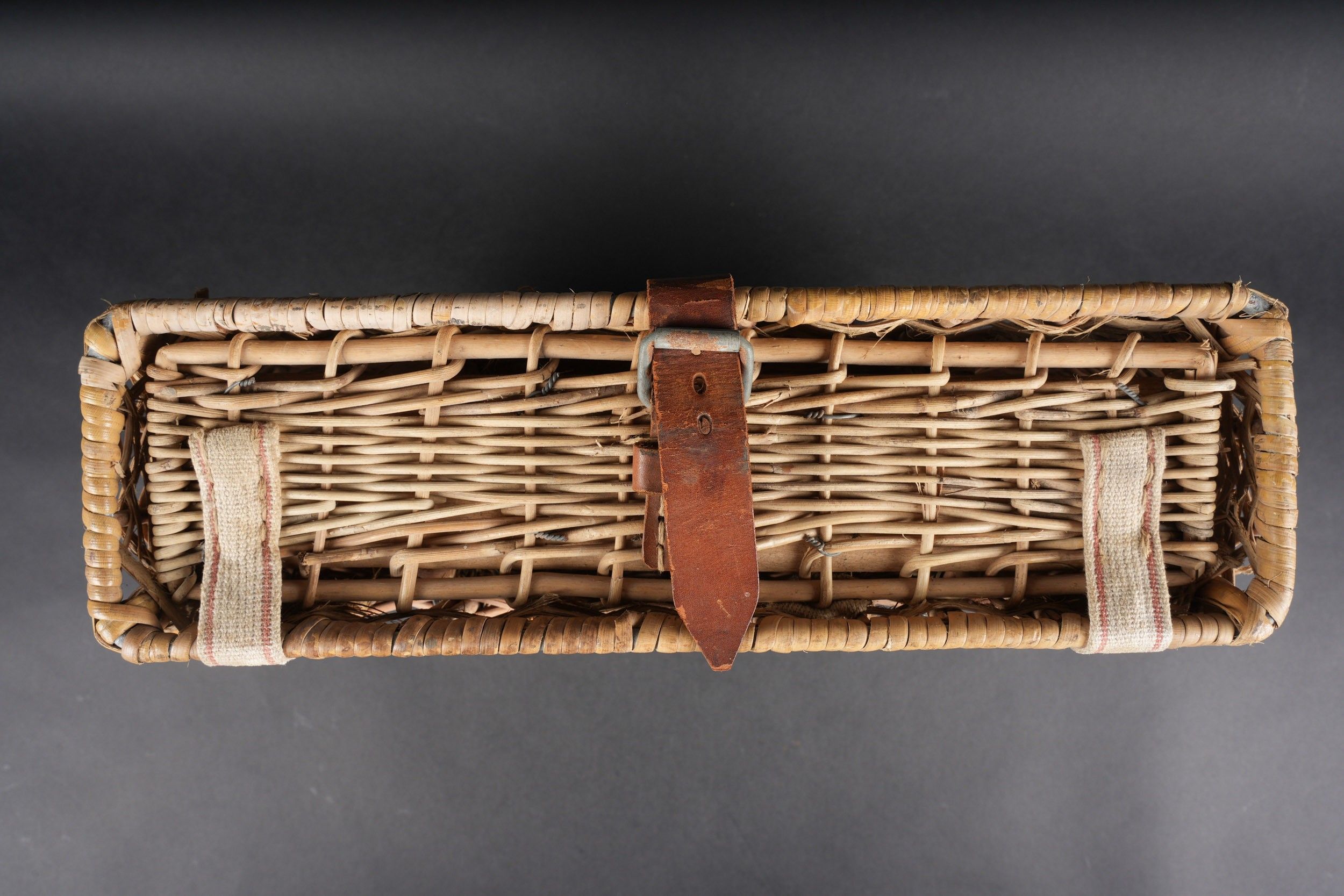 Basket for 4 shells Leichtes InfanterieGeschütz 18. Made of wicker. Metal bottom. Four compartments, the central one has canvas reinforcement. Complete wooden lid, held in place by strips of cloth. Brown leather strap closure. Markings under lid 7.5 cmjgr 18 Le JGR Z 23nA Weissring II . Waa eagle, made by AJC 1940. Label present but incomplete, dated 1944. The side carrying handle is present. Slight wear and patina. Condition I-. Basket for four 7.5 cm Leichtes Infanteriegeschütz 18 shells. Wicker body with metal base. Four compartments, central one reinforced with fabric. Complete wooden lid held by cloth bands. Leather closure strap intact. Marked under the lid 7,5 cm Jgr 18 Le JGR Z 23nA Weissring II with Waa eagle, made by AJC 1940. Label partially preserved, dated 1944. Side carrying handle present. Slight wear and patina on the piece. Condition I-