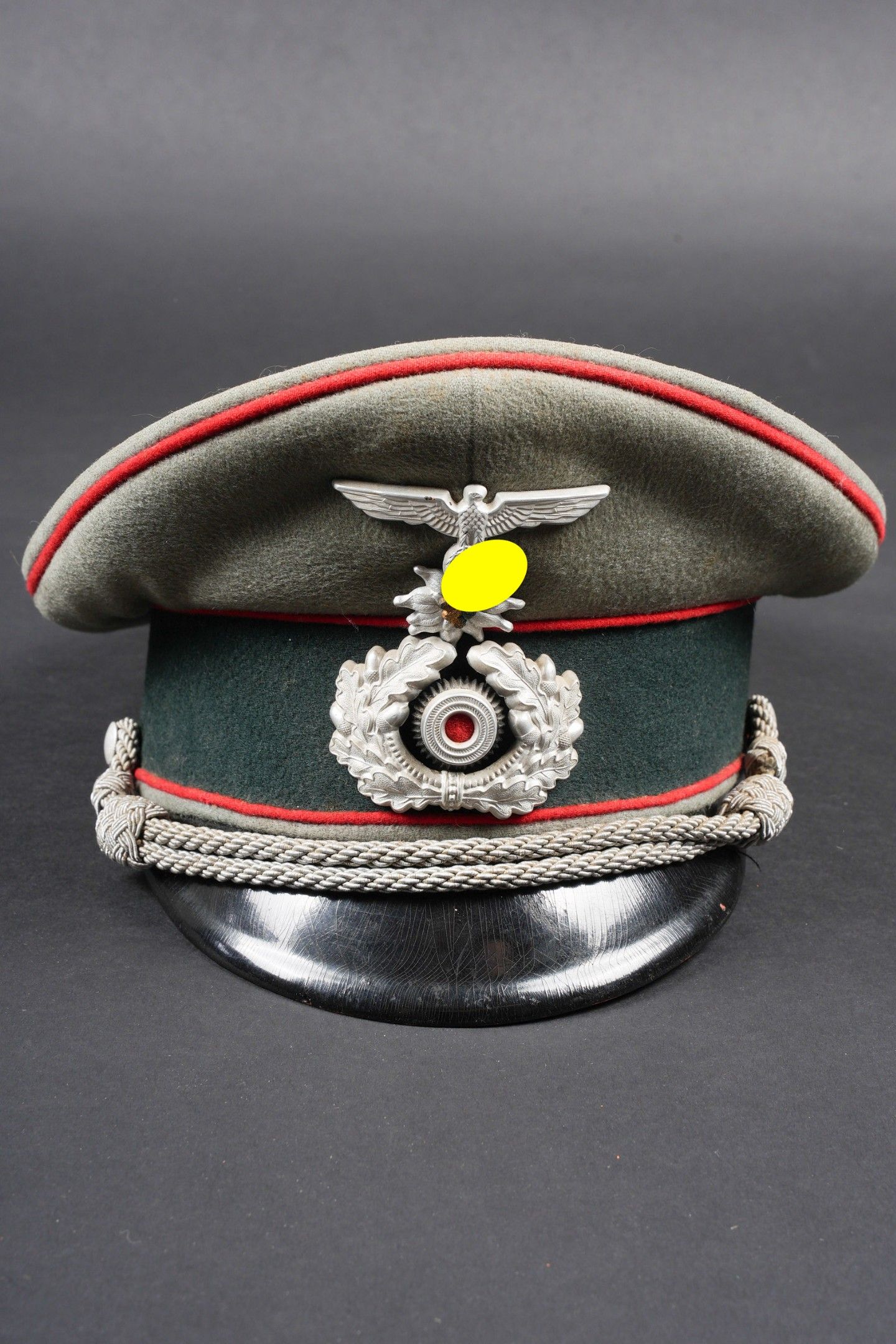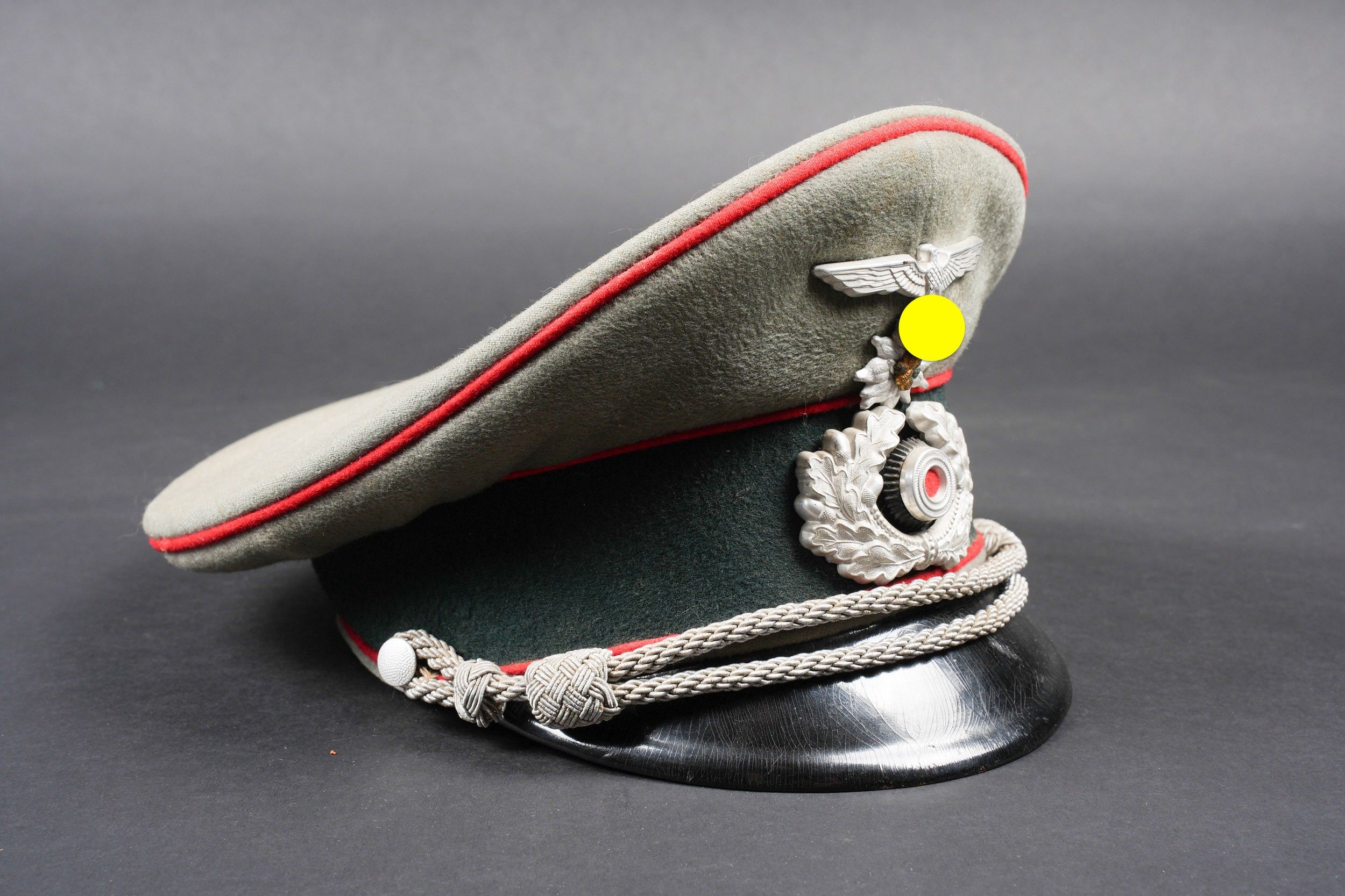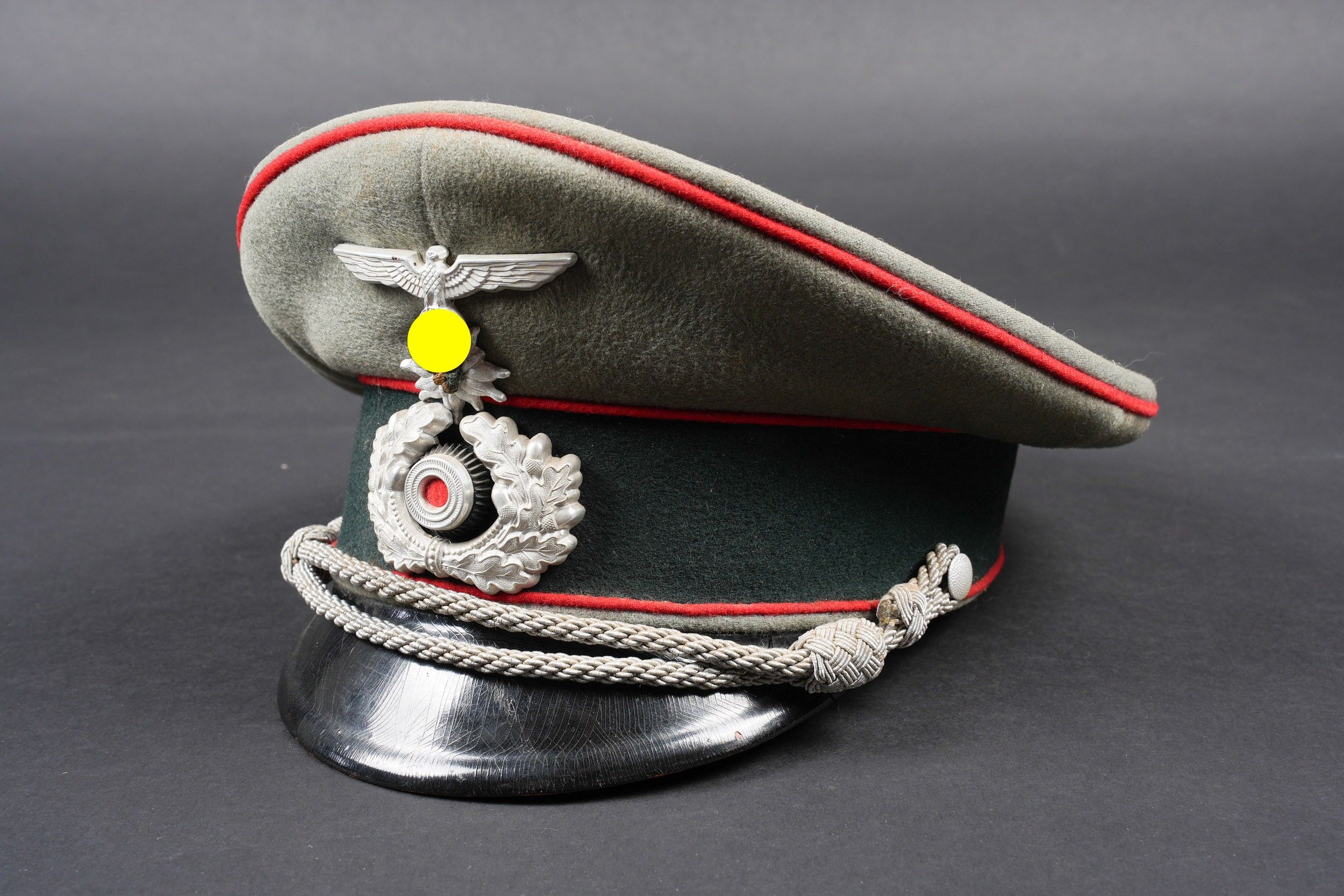 Artillery officer's cap. Feldgrau cloth. Triple red artillery piping. Headband in dark green cloth. Braided silver chinstrap. Metal insignia. The badges have not been dismantled in order to check the fastenings. The mountain troops edelweiss was added later. Interior lined in unbleached silky fabric. Mica is complete, but partially dismantled. Tan leather sweatband, partially torn. Some wear and patina, as well as a few moth marks. Condition II+. German artillery officer cap in Feldgrau cloth with triple red piping for artillery and dark green band. Silver braided chinstrap. Metal insignia not removed for inspection. A postwar Edelweiss badge from mountain troops added later. Cream silk-lined interior with mica present but partially detached. Tan leather sweatband partially torn. Some wear and patina on the piece with light moth traces. Condition II+