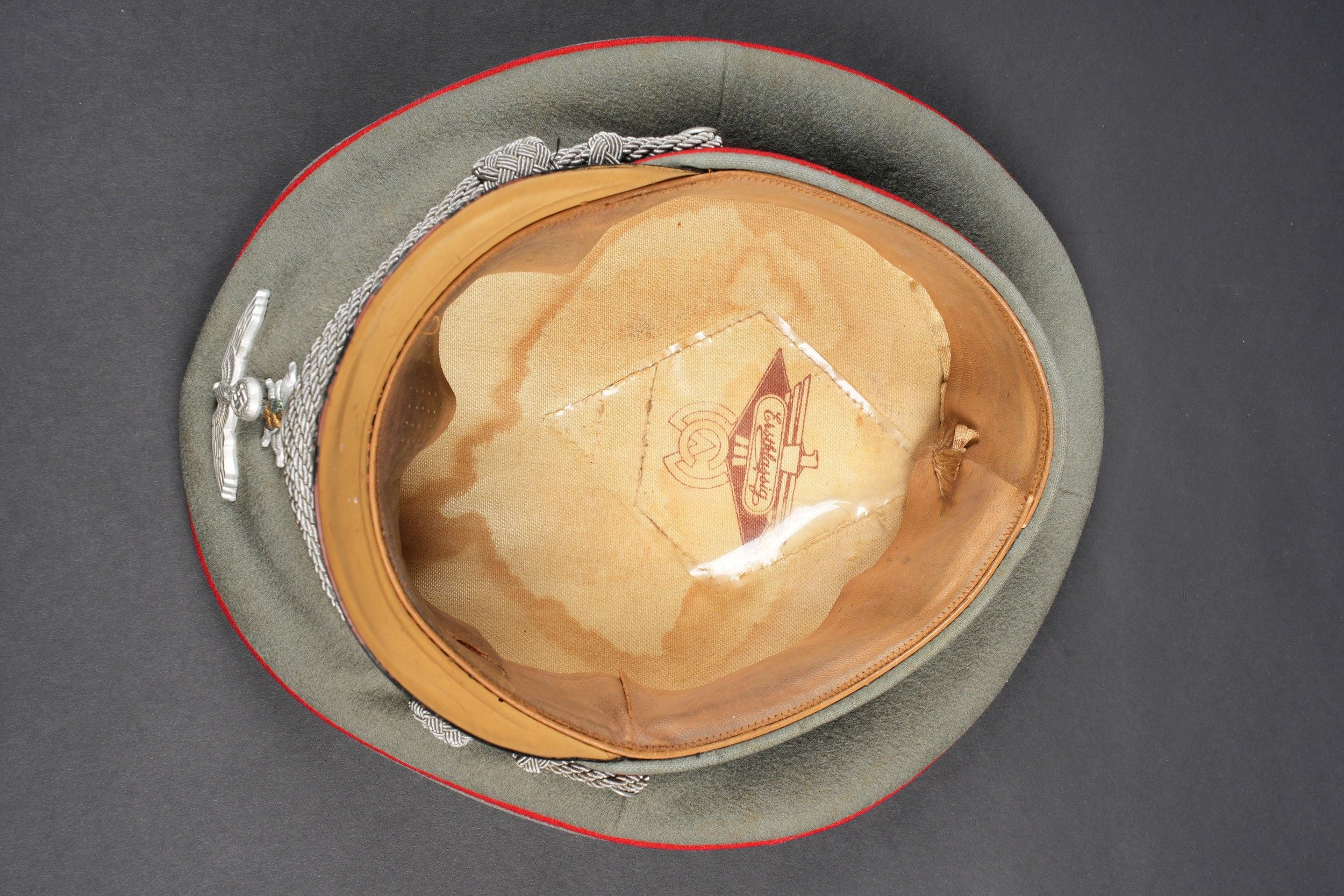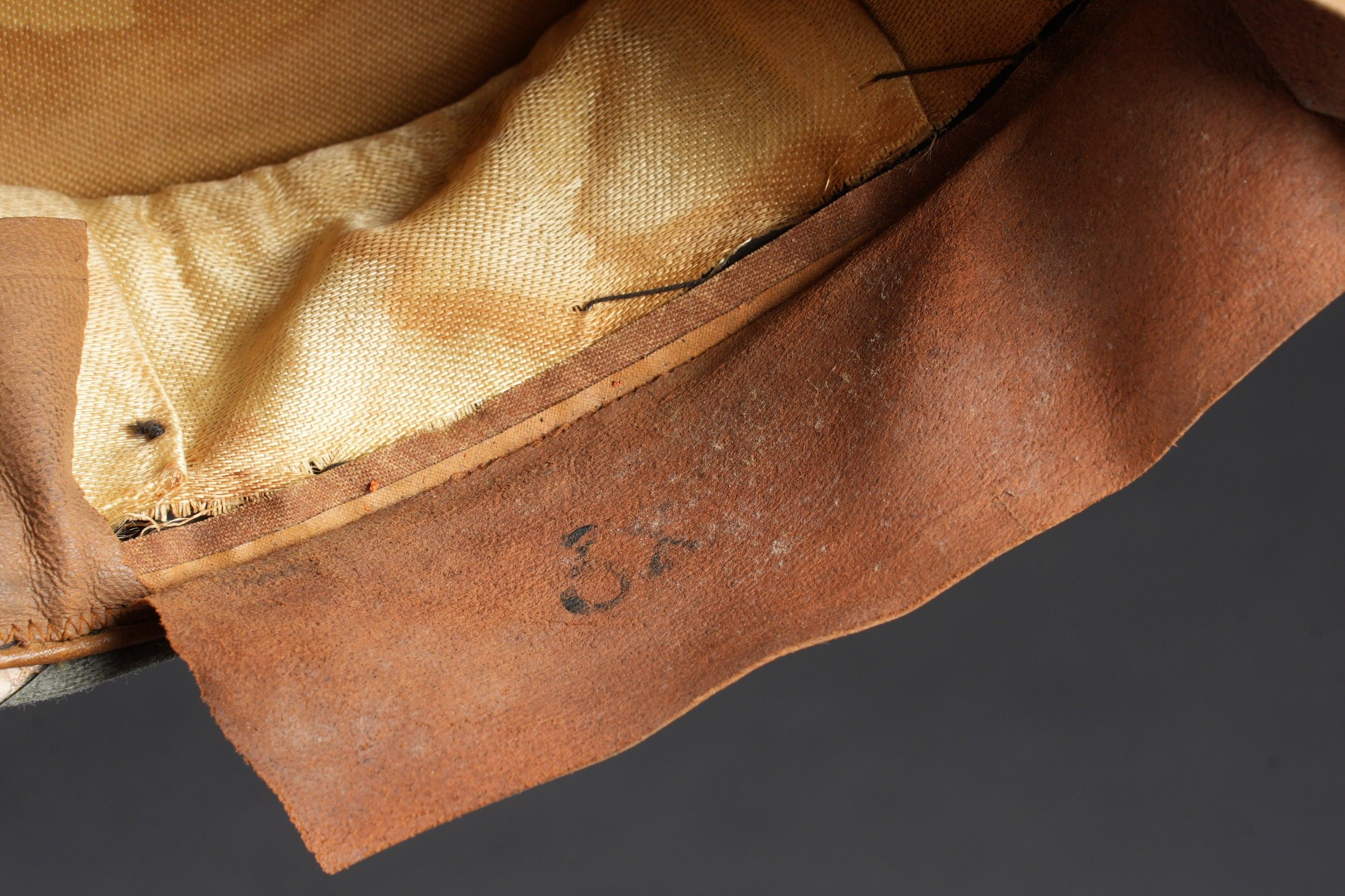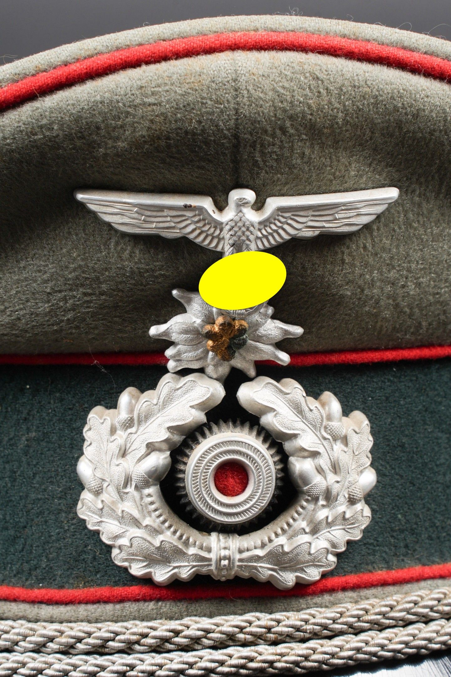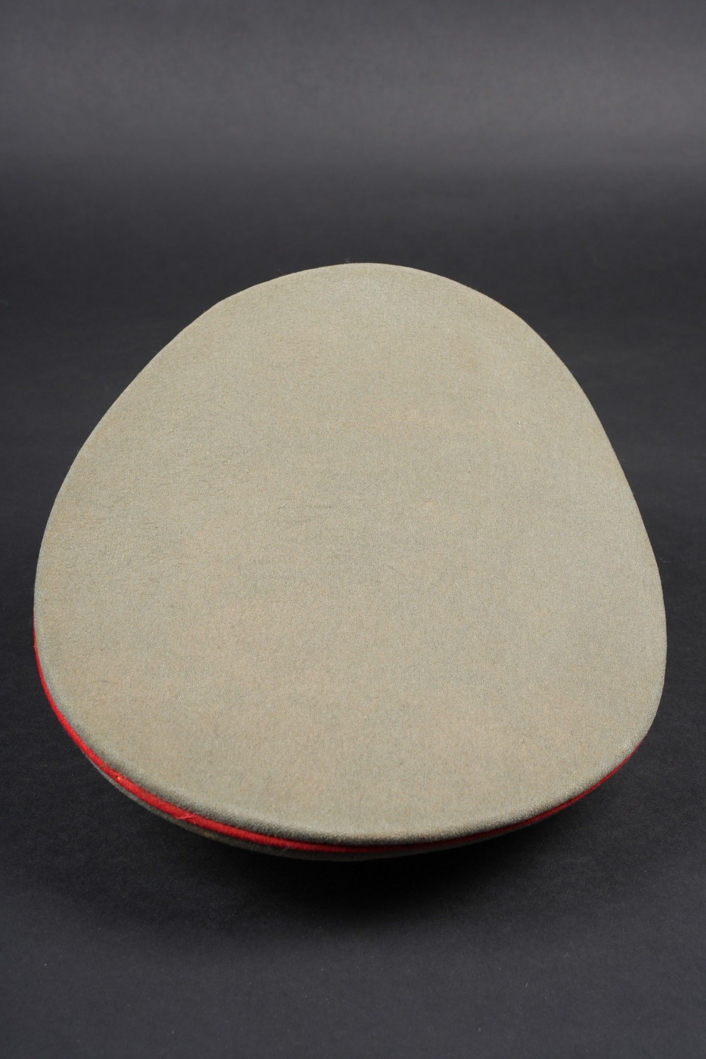 Artillery officer's cap. Feldgrau cloth. Triple red artillery piping. Headband in dark green cloth. Braided silver chinstrap. Metal insignia. The badges have not been dismantled in order to check the fastenings. The mountain troops edelweiss was added later. Interior lined in unbleached silky fabric. Mica is complete, but partially dismantled. Tan leather sweatband, partially torn. Some wear and patina, as well as a few moth marks. Condition II+. German artillery officer cap in Feldgrau cloth with triple red piping for artillery and dark green band. Silver braided chinstrap. Metal insignia not removed for inspection. A postwar Edelweiss badge from mountain troops added later. Cream silk-lined interior with mica present but partially detached. Tan leather sweatband partially torn. Some wear and patina on the piece with light moth traces. Condition II+