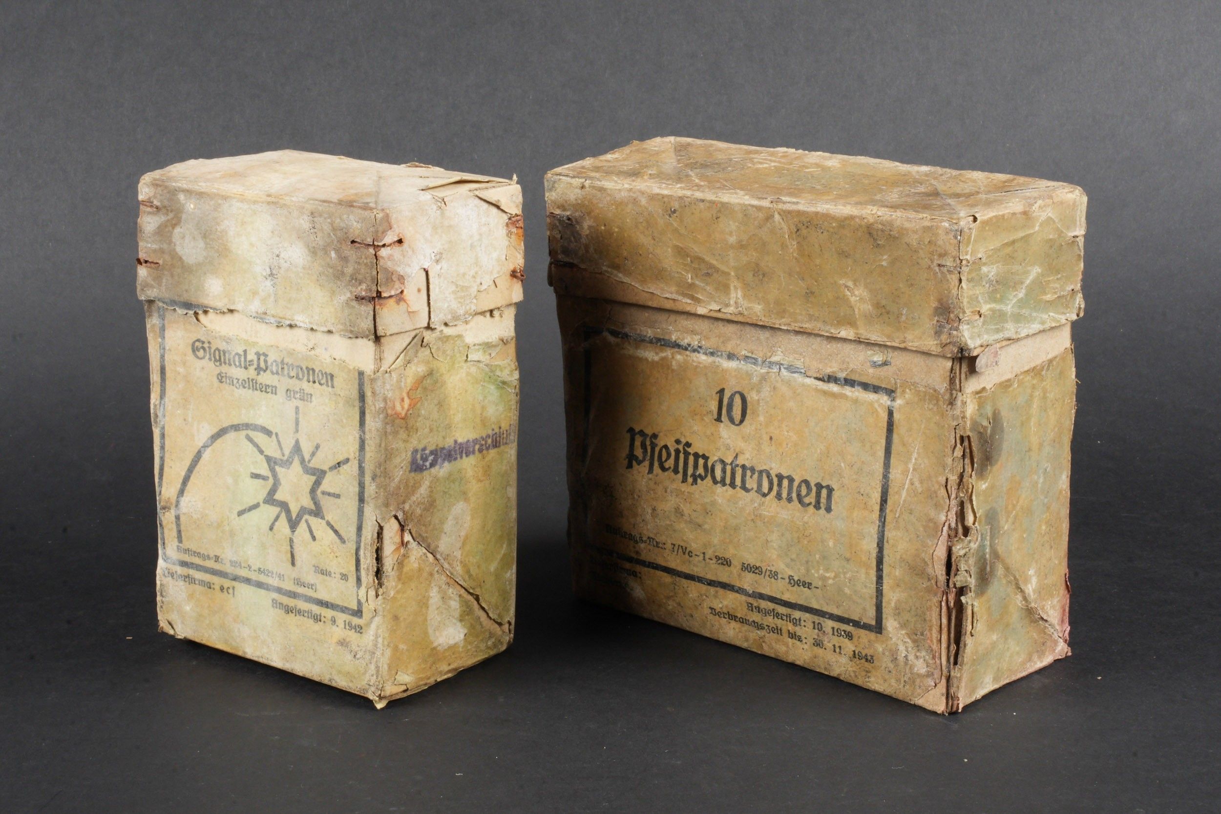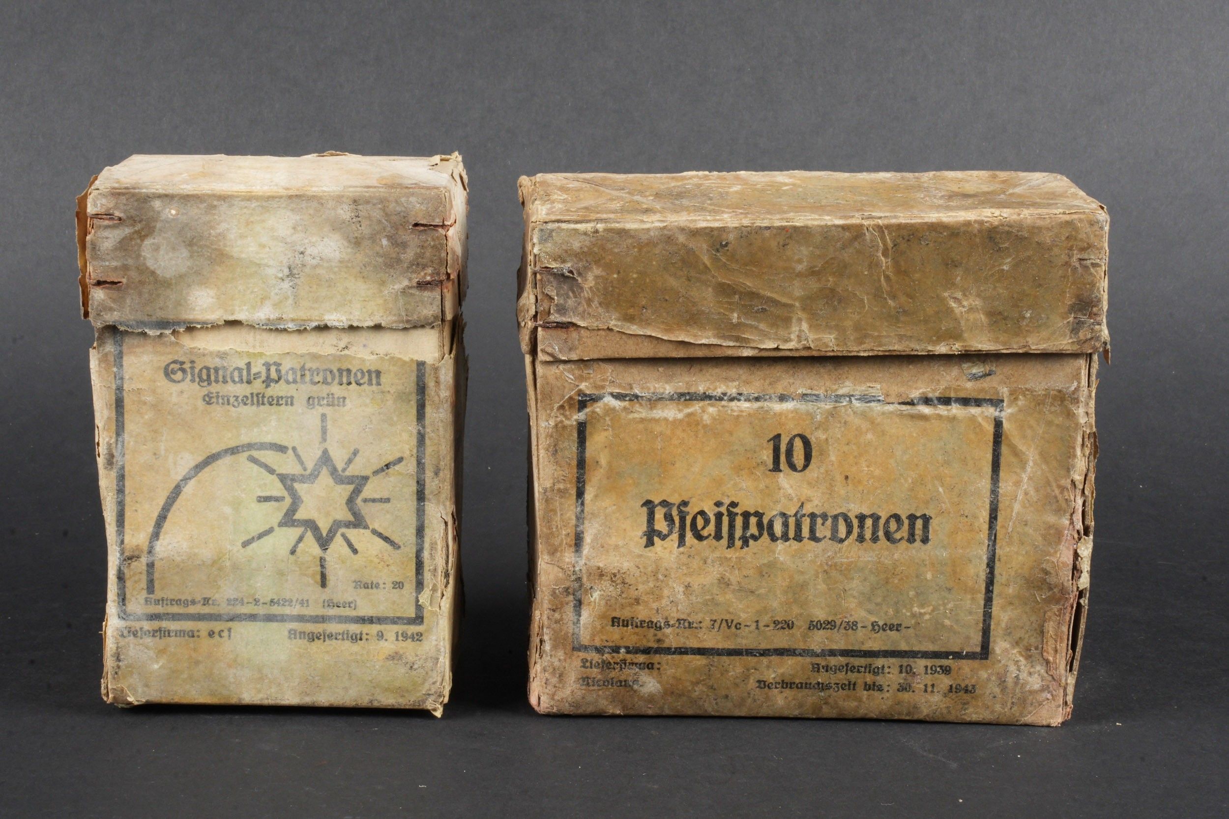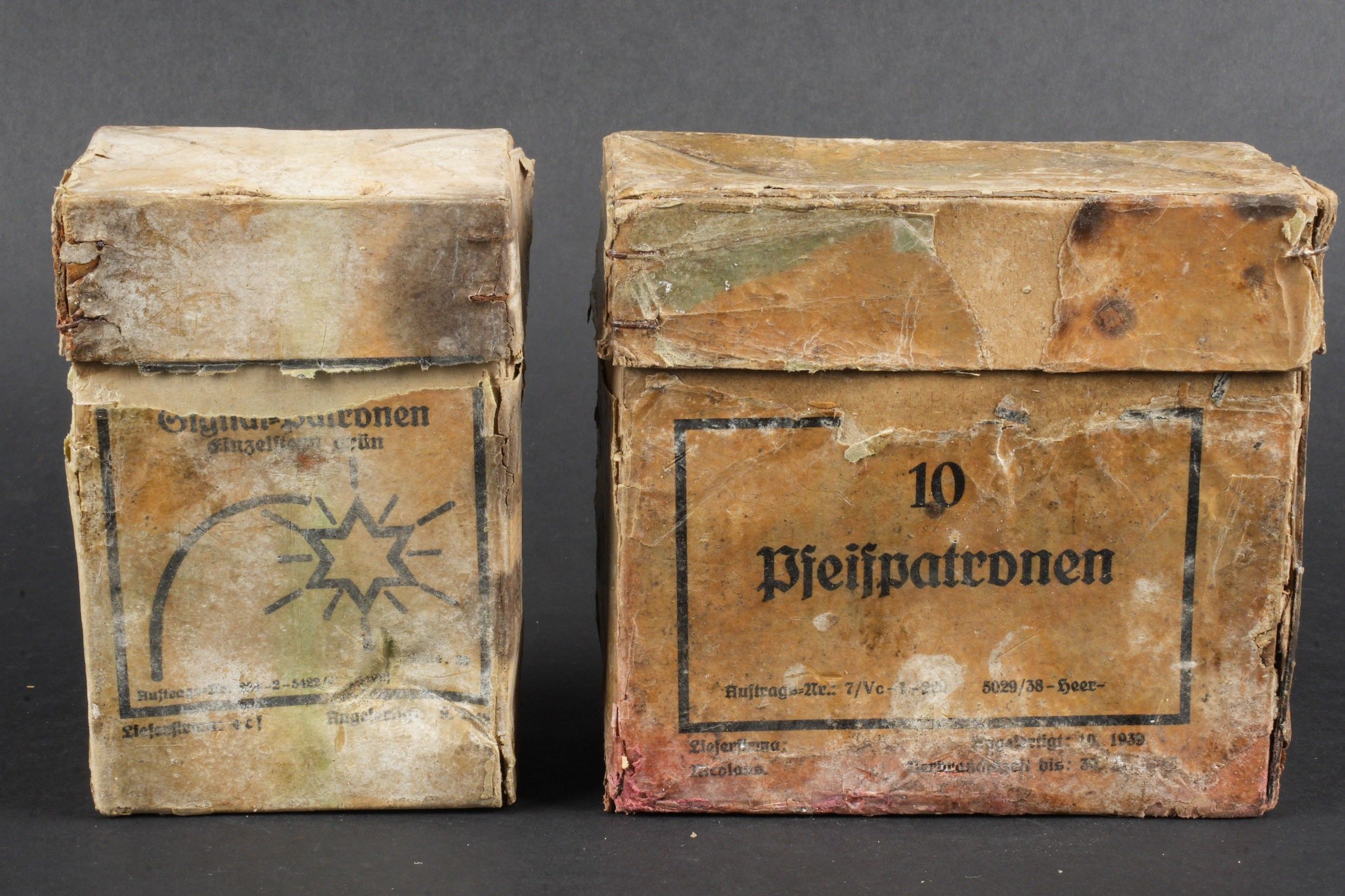 Boxes of flares. One cardboard box, empty and open, marked 10 Pfeifpatronen, dated 1939. A cardboard box, open and empty, marked Signal Patronen Einzelstern Grün, dated 1942. Some wear and patina to the parts, as well as a few tears and stains. Condition II+. P08 pistol holster in thick brown leather with functional closure strap and complete rear loops. Made by Jähnel, Breslau, 1940, with Waa eagle. Name marking under flap illegible. Disassembly tool missing. Some wear and patina on the piece. Condition II+
