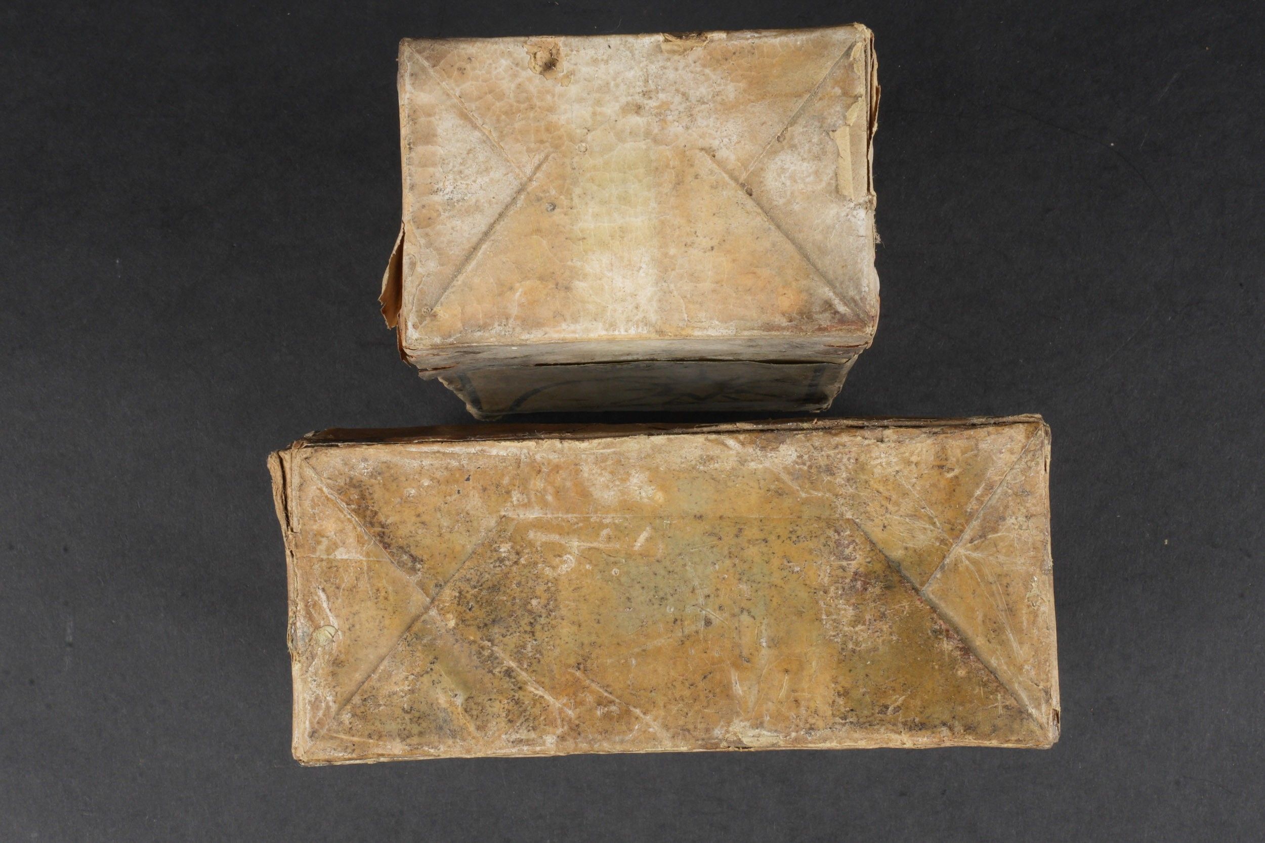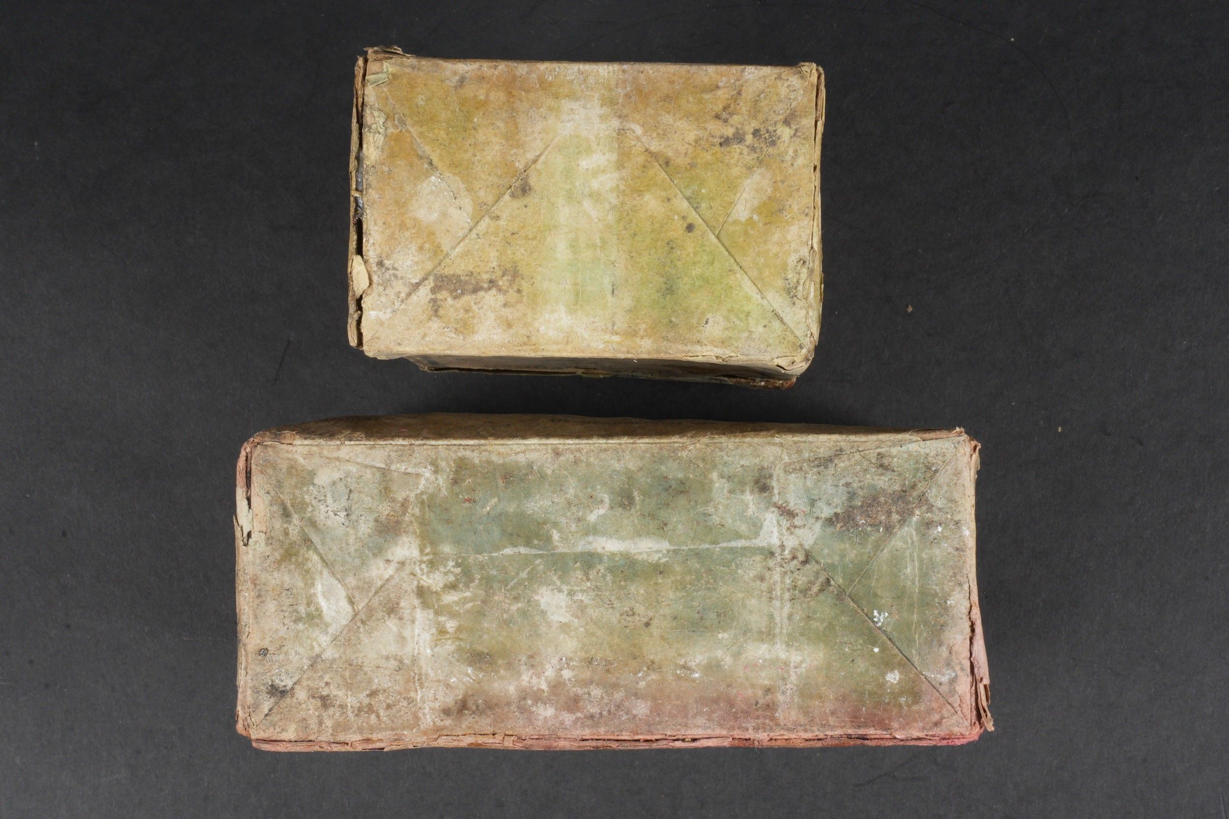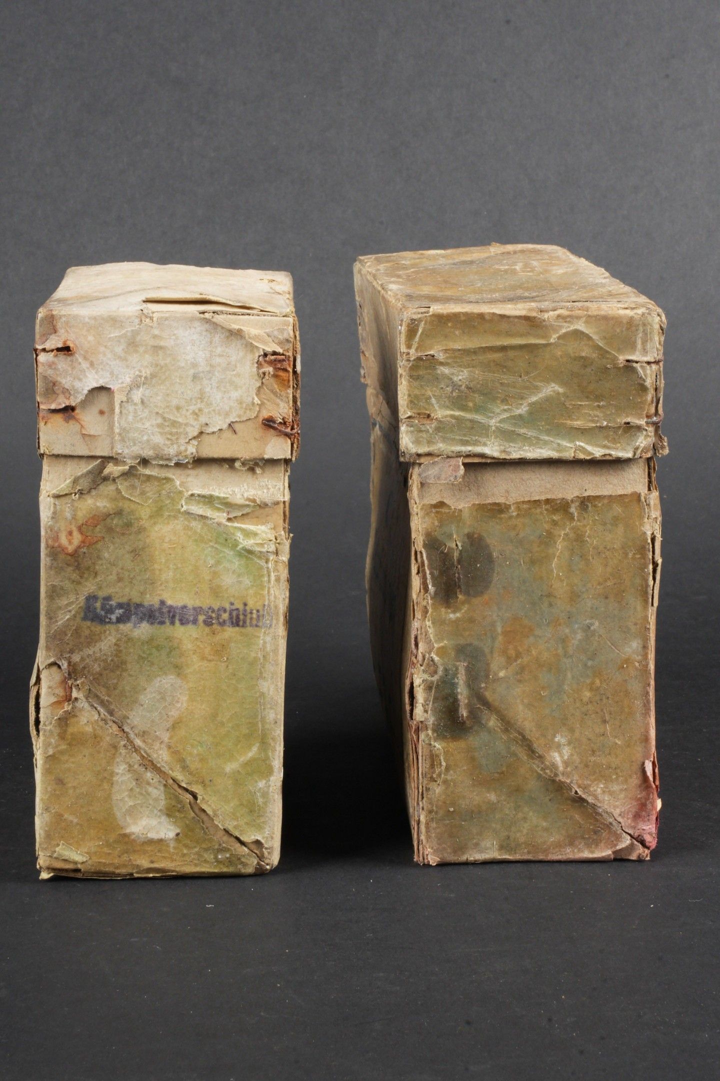 Boxes of flares. One cardboard box, empty and open, marked 10 Pfeifpatronen, dated 1939. A cardboard box, open and empty, marked Signal Patronen Einzelstern Grün, dated 1942. Some wear and patina to the parts, as well as a few tears and stains. Condition II+. P08 pistol holster in thick brown leather with functional closure strap and complete rear loops. Made by Jähnel, Breslau, 1940, with Waa eagle. Name marking under flap illegible. Disassembly tool missing. Some wear and patina on the piece. Condition II+