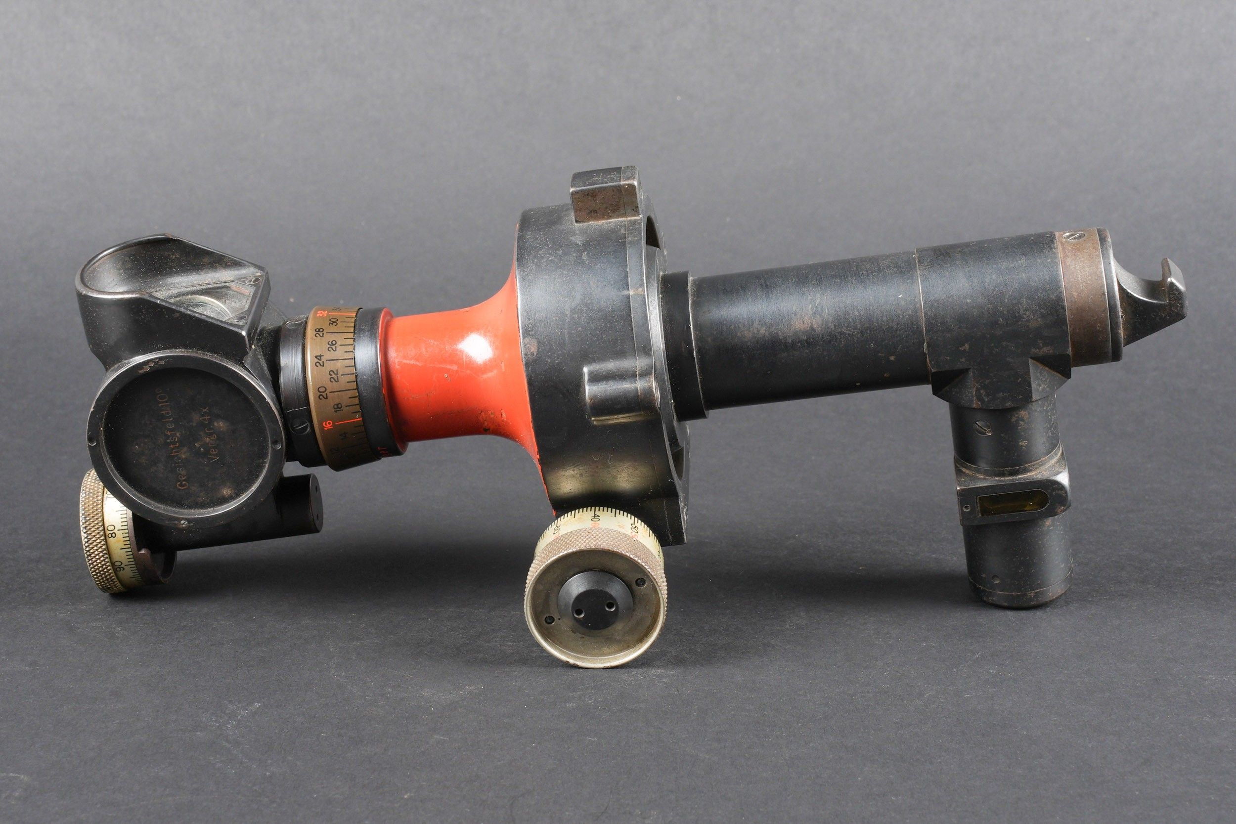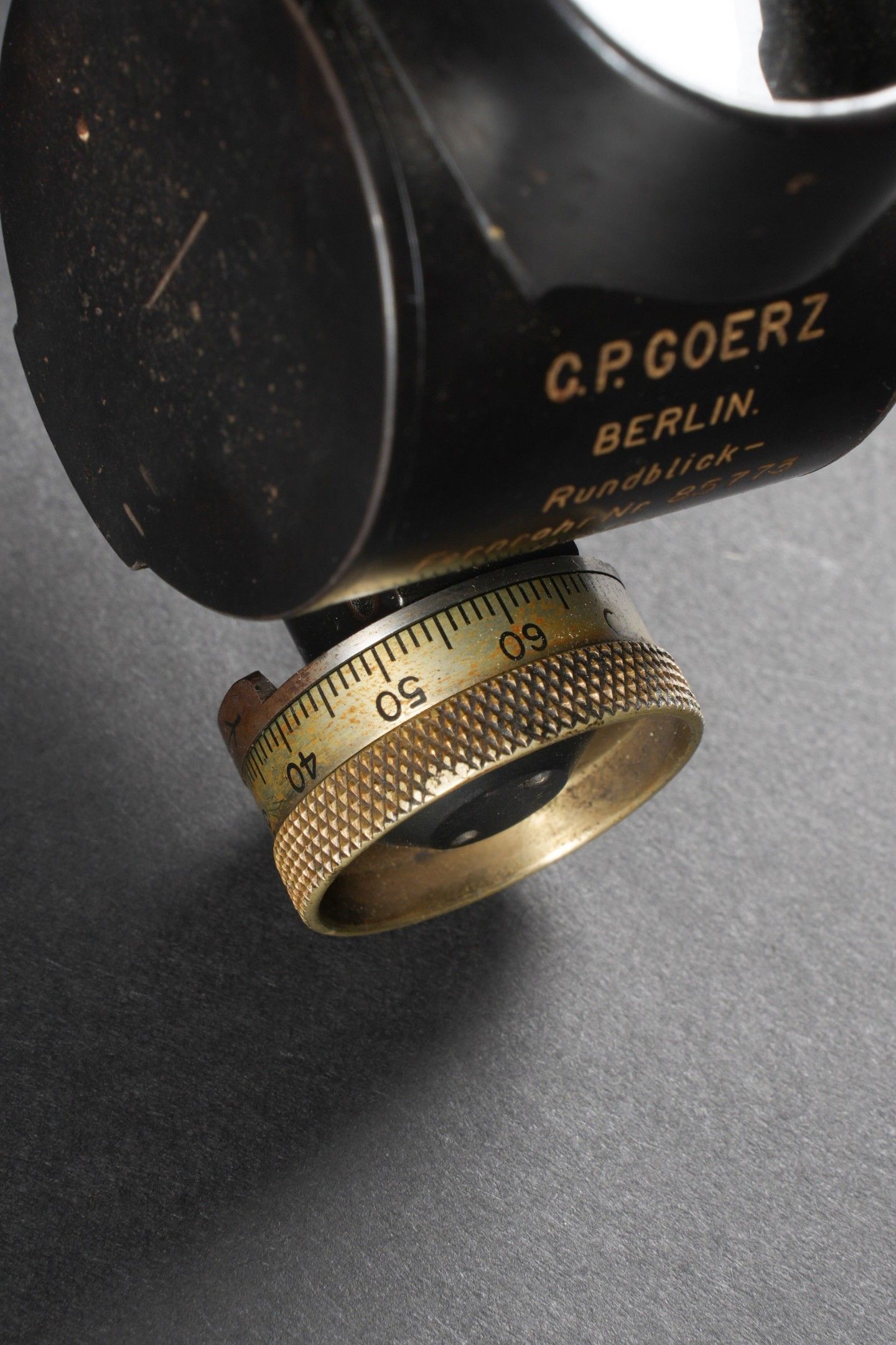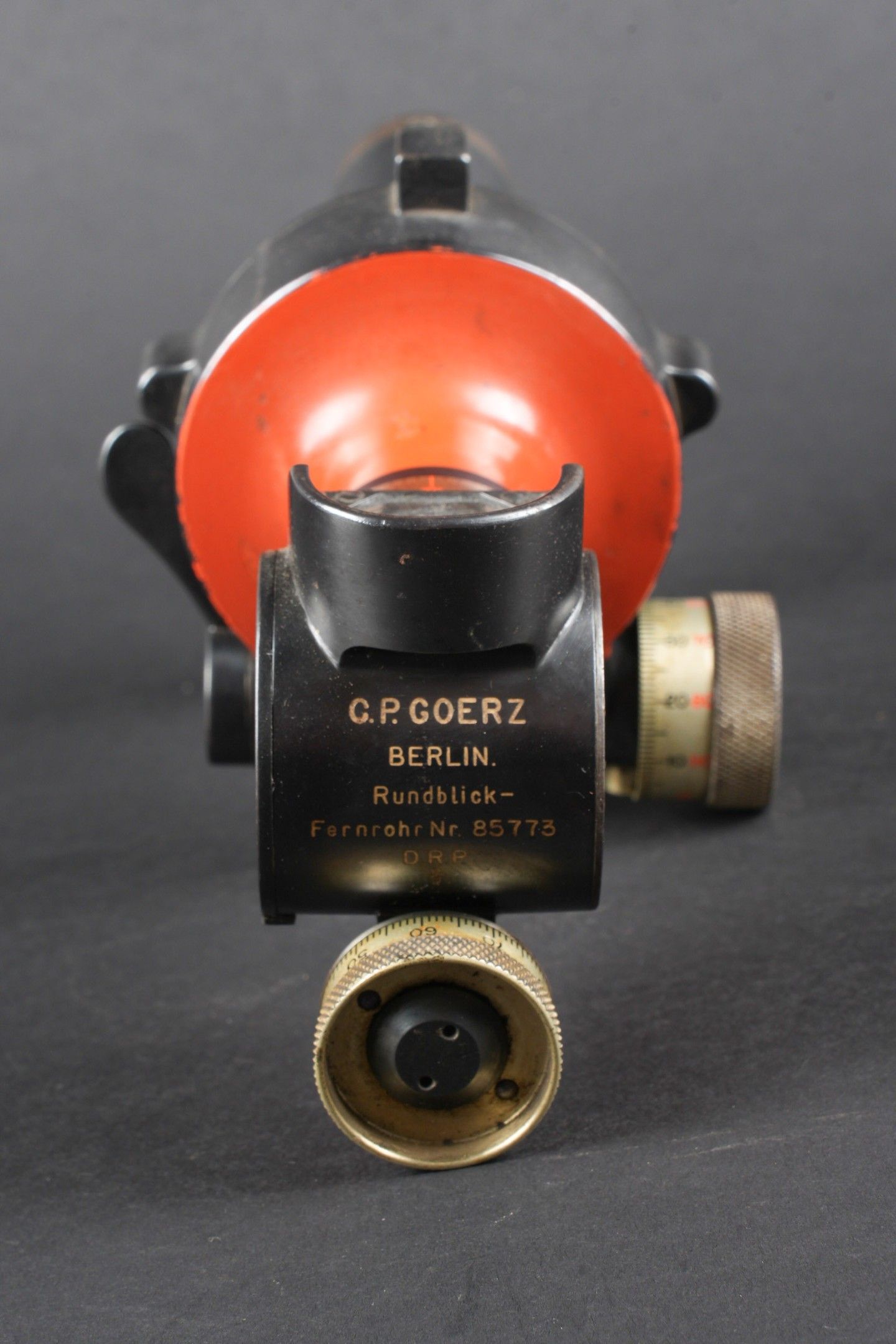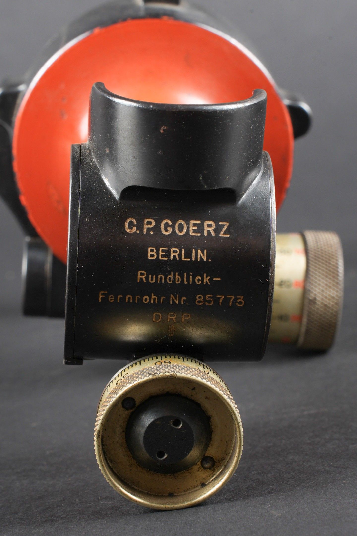 Artillery scope. Metal. 95% original colour. 95% original red colour. All moving parts are functional. Manufacture GP Goerz Berlin Rundblick Fernrohr Nr 85773 DRP. Clear and graduated optics, showing some stains. Slight wear and oxidation. Condition I-. Artillery scope in metal with 95% of original finish and red colour. All moving parts functional. Marked GP Goerz Berlin Rundblick Fernrohr Nr 85773 DRP. Clear graduated optics with minor spotting. Slight wear and oxidation on the piece. Condition I-