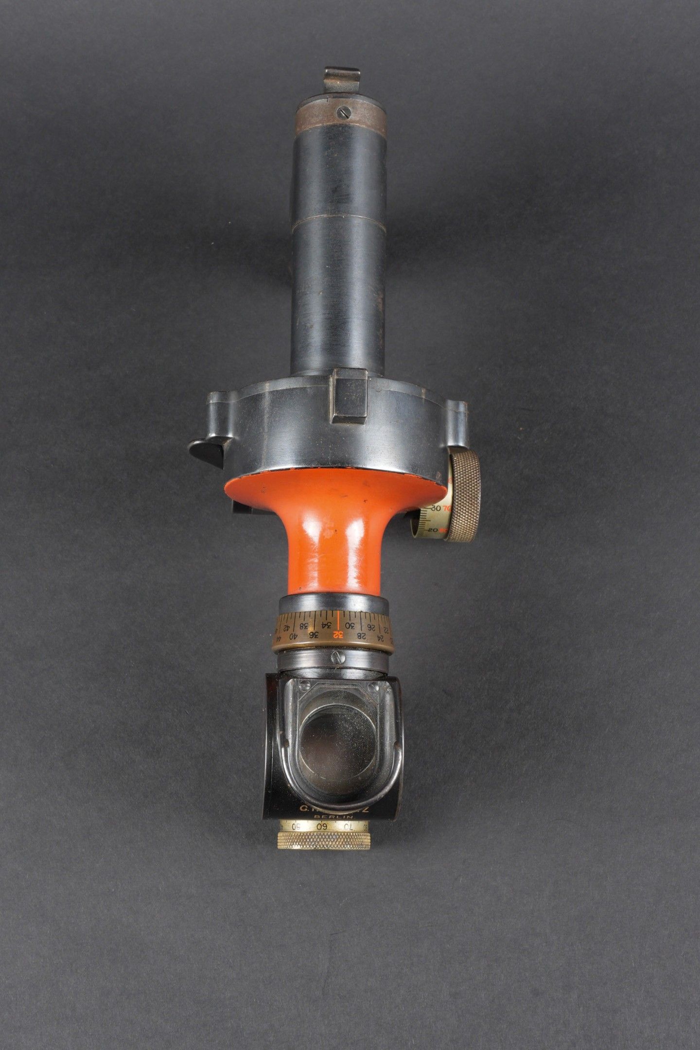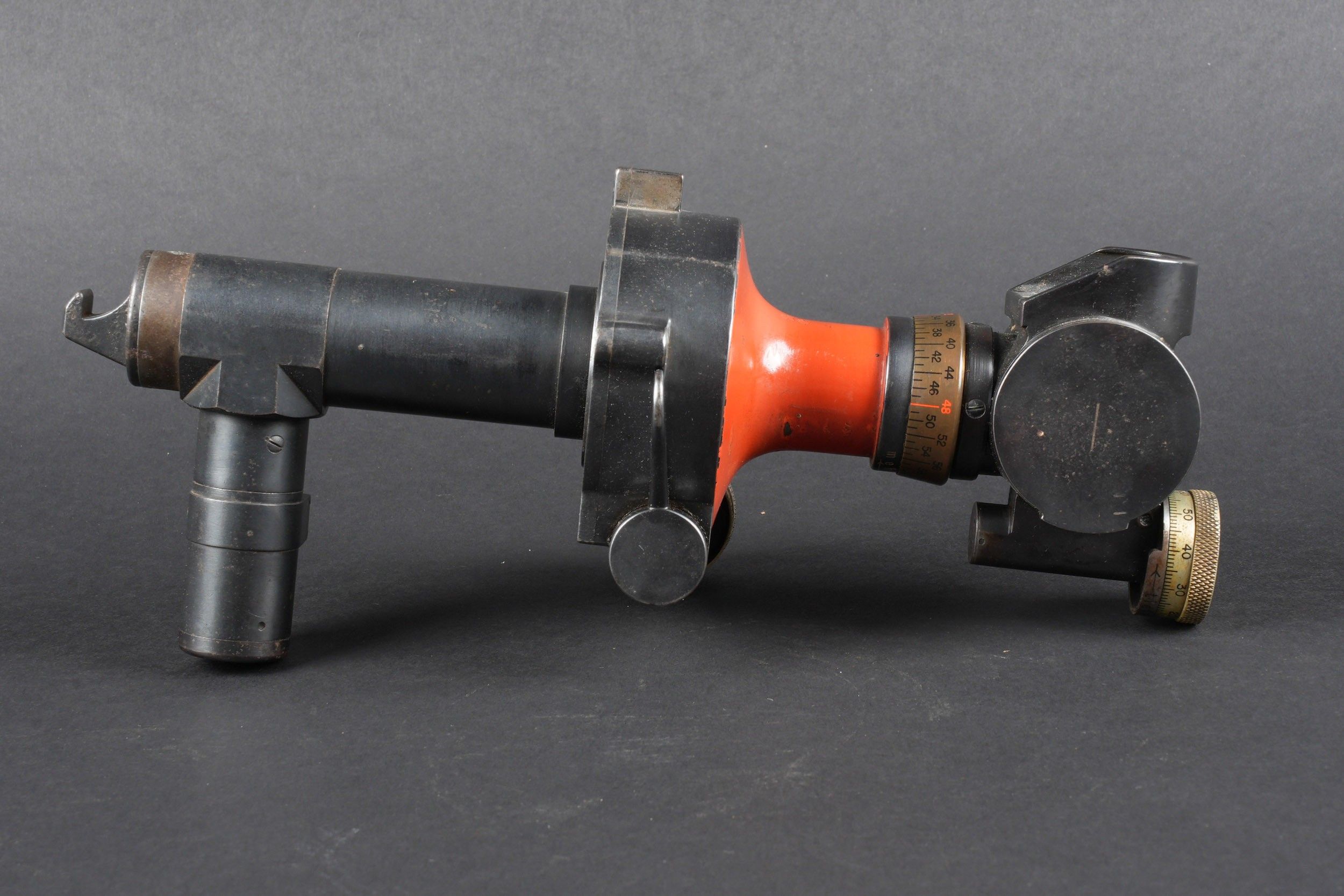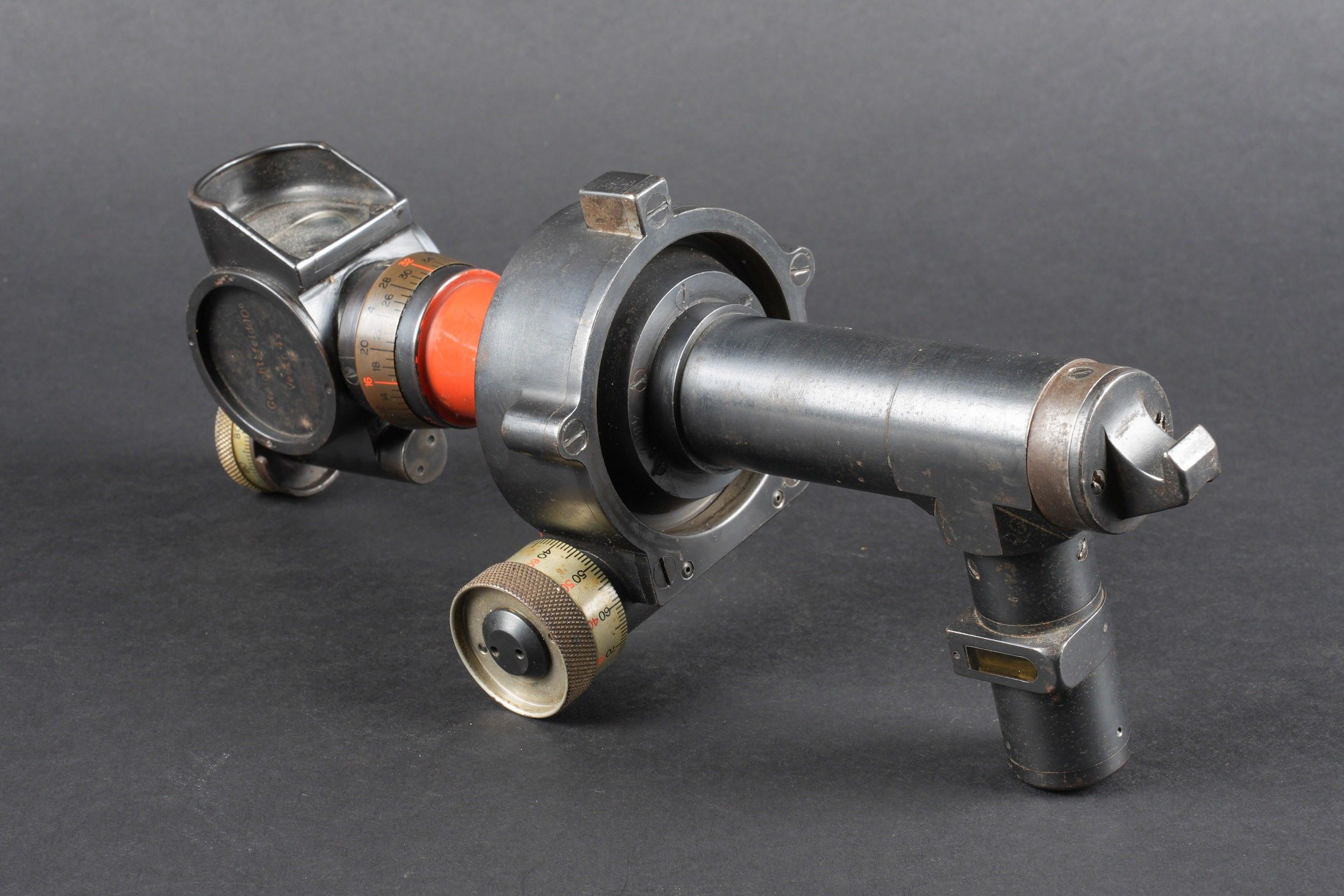 Artillery scope. Metal. 95% original colour. 95% original red colour. All moving parts are functional. Manufacture GP Goerz Berlin Rundblick Fernrohr Nr 85773 DRP. Clear and graduated optics, showing some stains. Slight wear and oxidation. Condition I-. Artillery scope in metal with 95% of original finish and red colour. All moving parts functional. Marked GP Goerz Berlin Rundblick Fernrohr Nr 85773 DRP. Clear graduated optics with minor spotting. Slight wear and oxidation on the piece. Condition I-