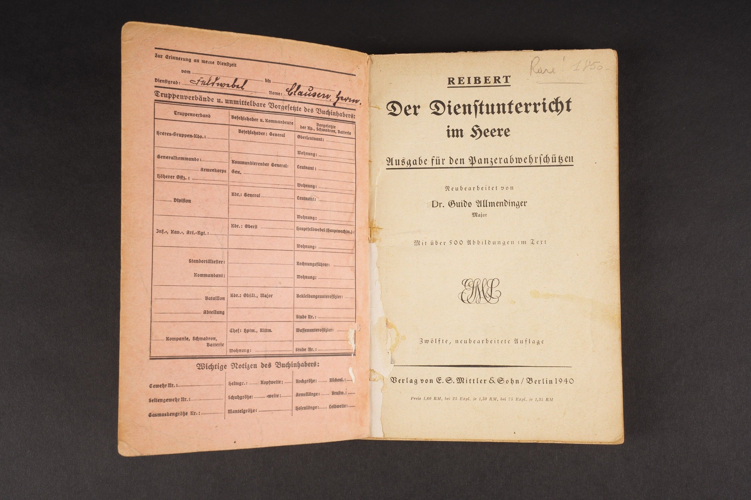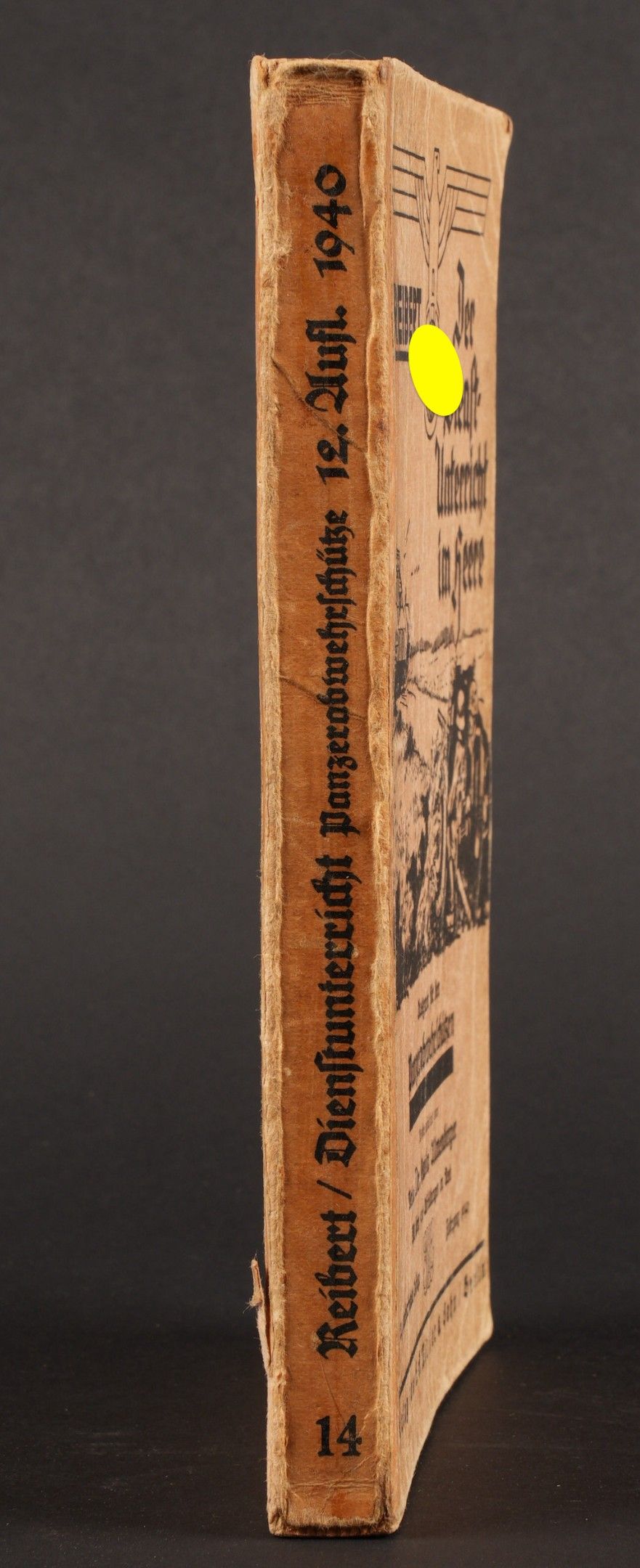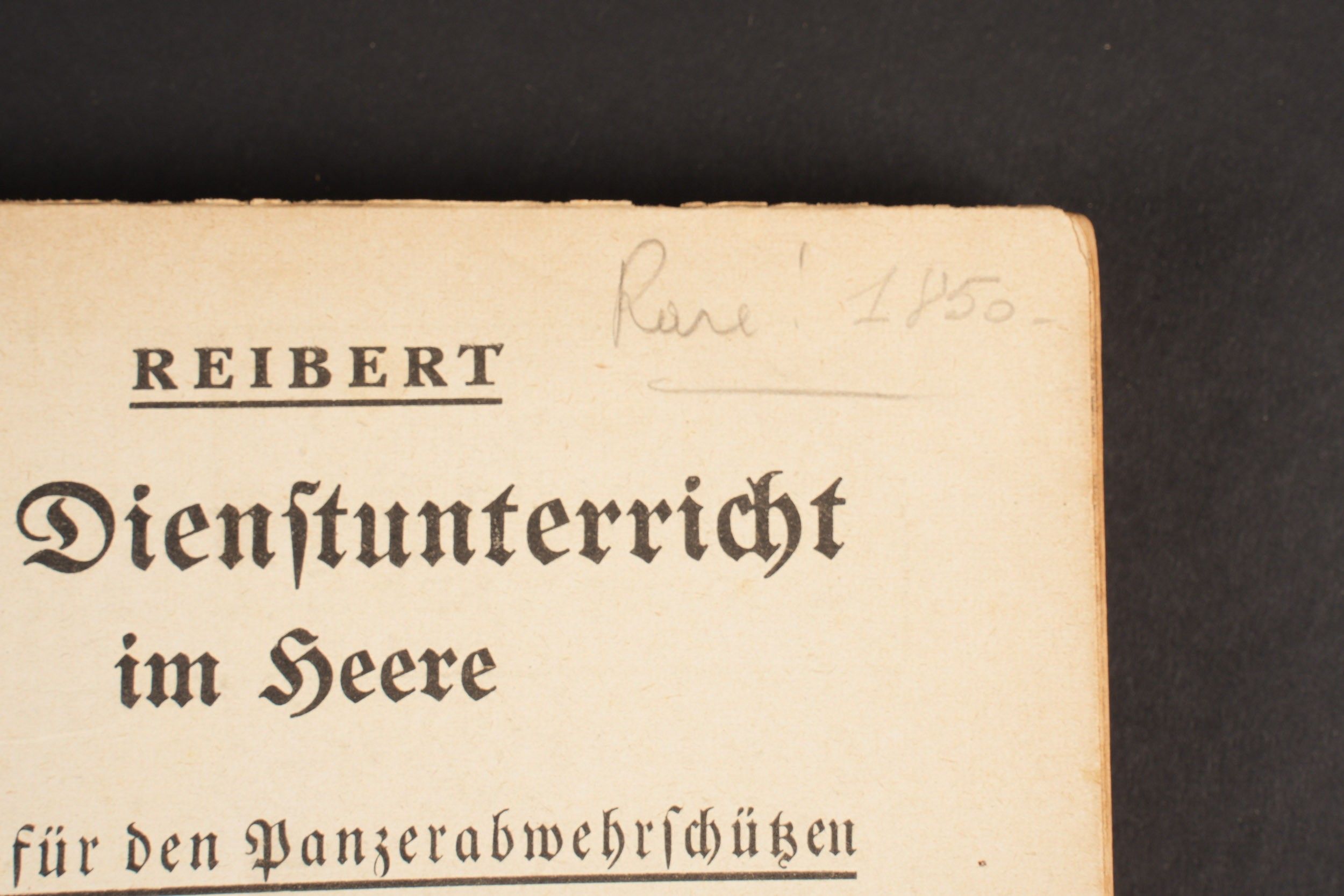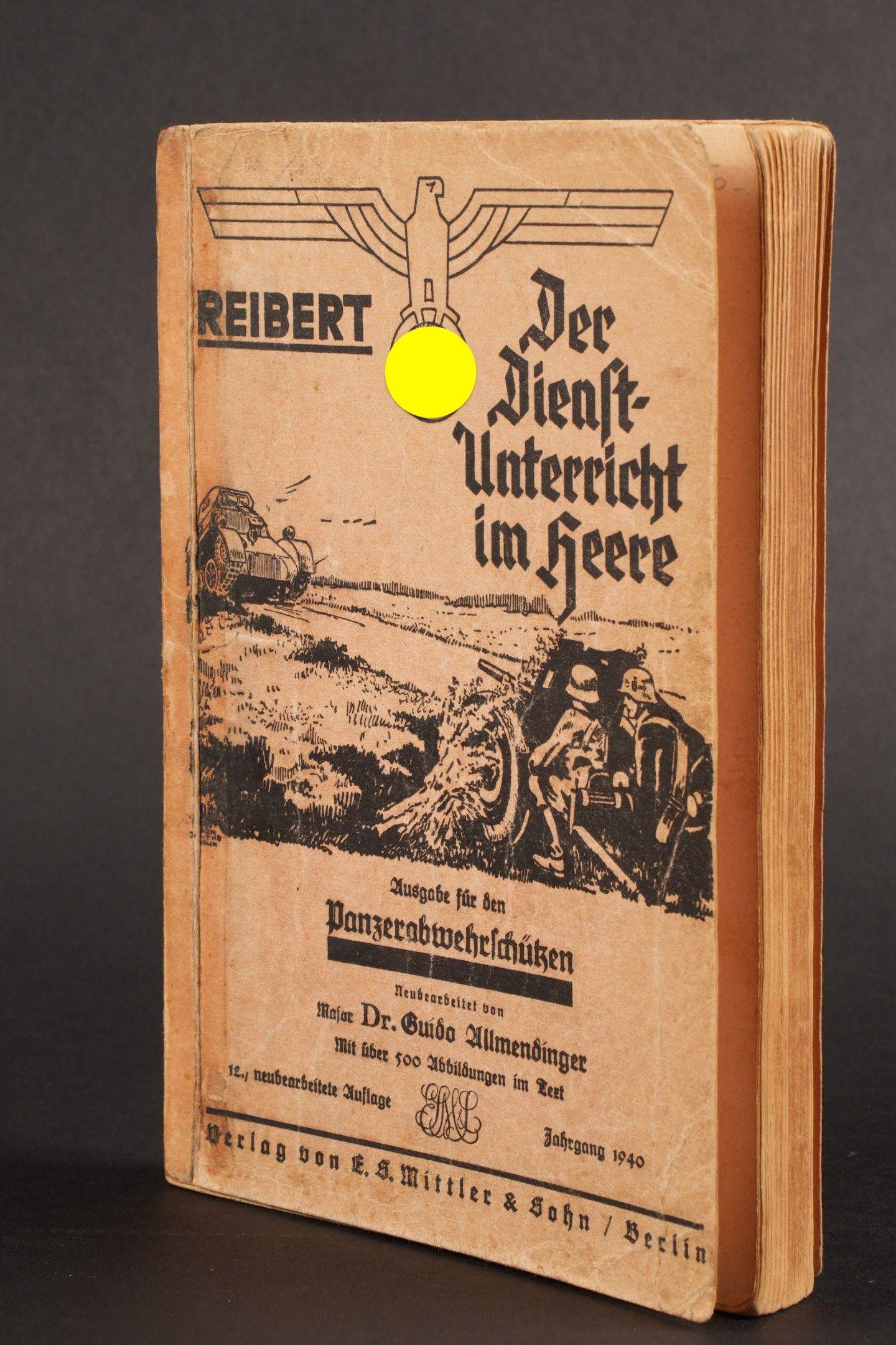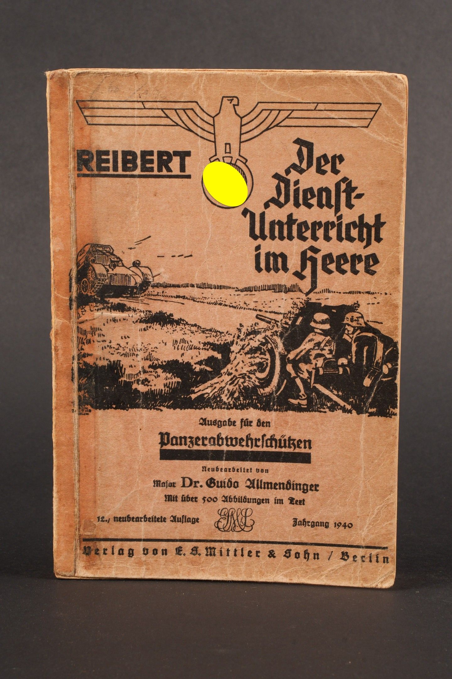 Reibert de l'artillerie. Beautiful hardback cover. Ausgabe für den Panzerabwehrschützen. Dated 1940. The first page is missing. Some wear and patina to be noted. Condition II+. Artillery Reibert manual with cardboard cover. Ausgabe für den Panzerabwehrschützen dated 1940. First page missing. Some wear and patina on the piece. Condition II+