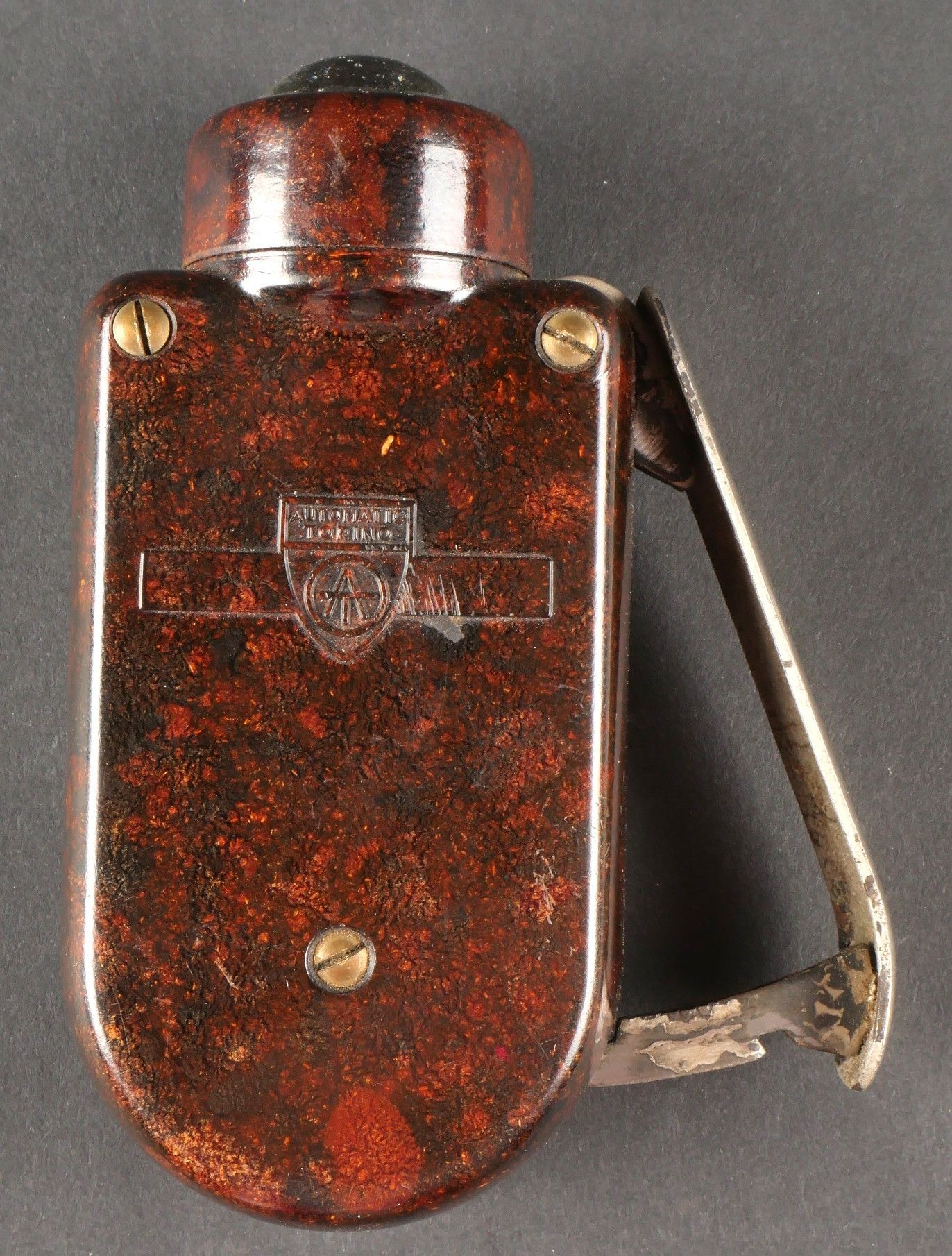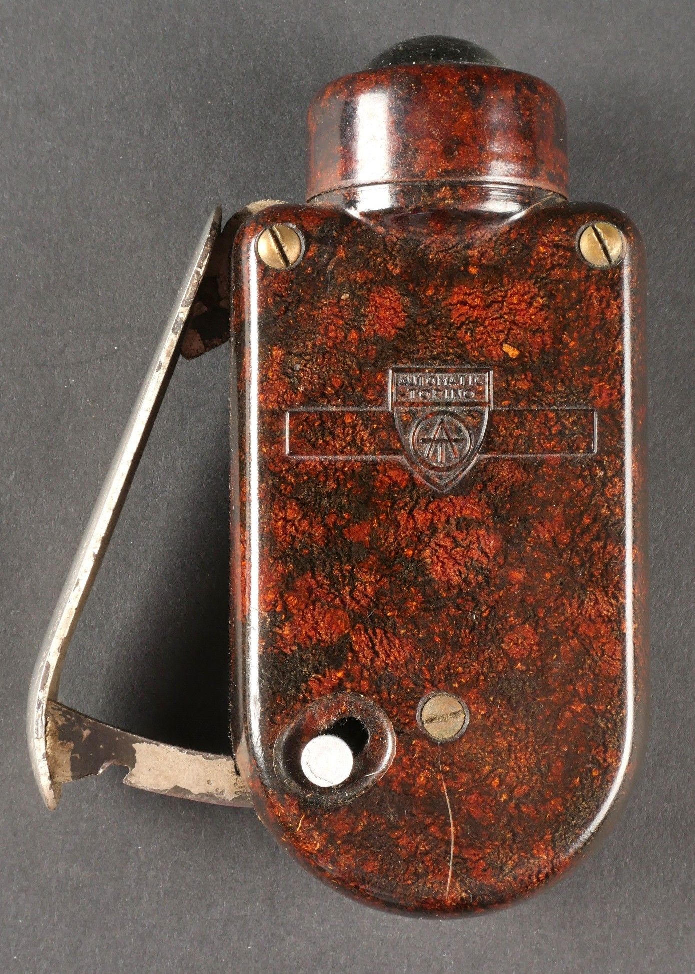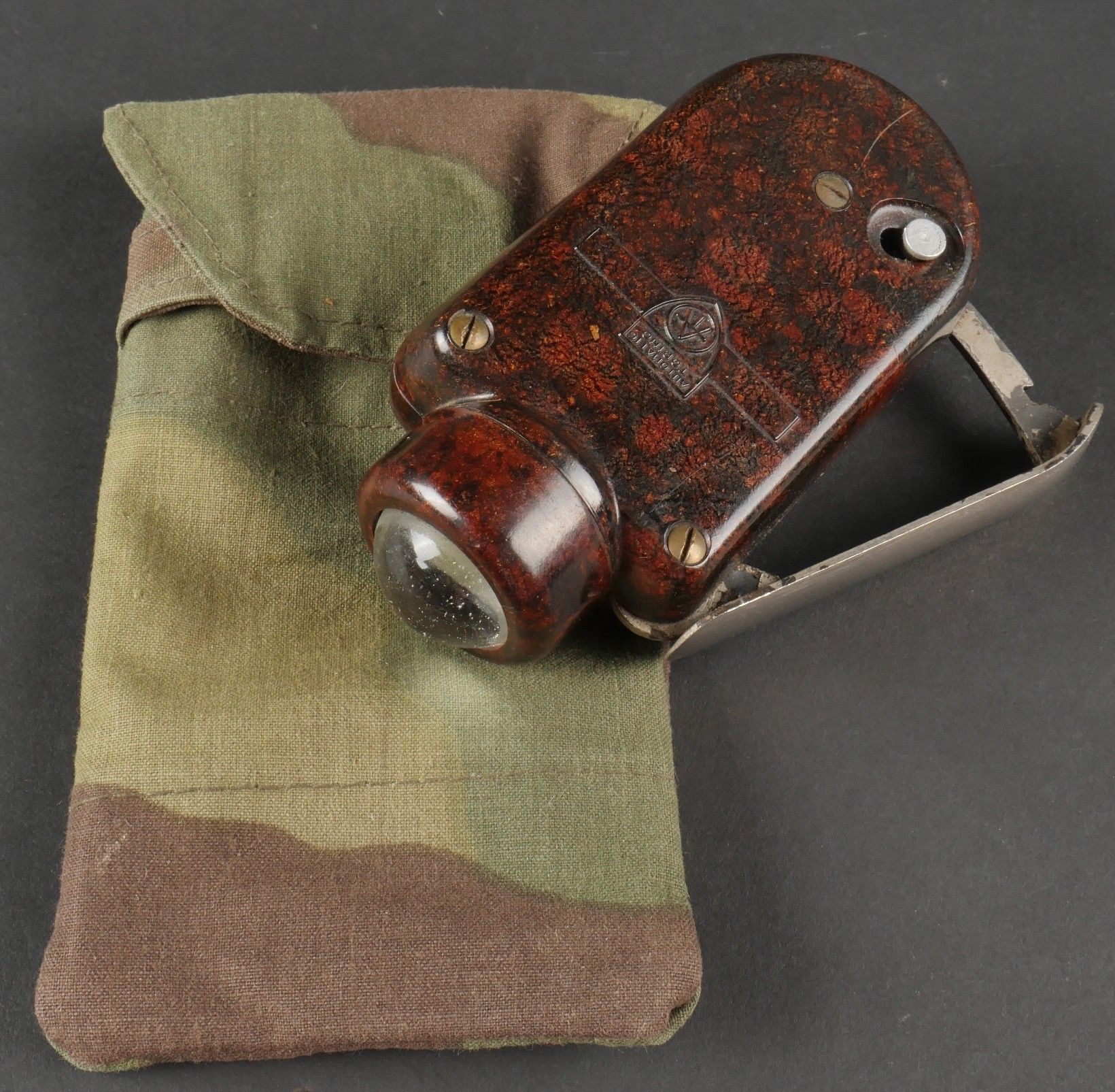 German torch. In bakelite. Dynamo model. Functional. Complete bulb. Automatic Torino manufacture. Cover made from a piece of Italian tent canvas. Made in the field. Some wear and patina. Condition II+. German flashlight in bakelite, dynamo model, fully functional with complete bulb. Made by Automatic Torino. Field-made carrying pouch sewn from Italian tent fabric. Some wear and patina on the piece. Condition II+