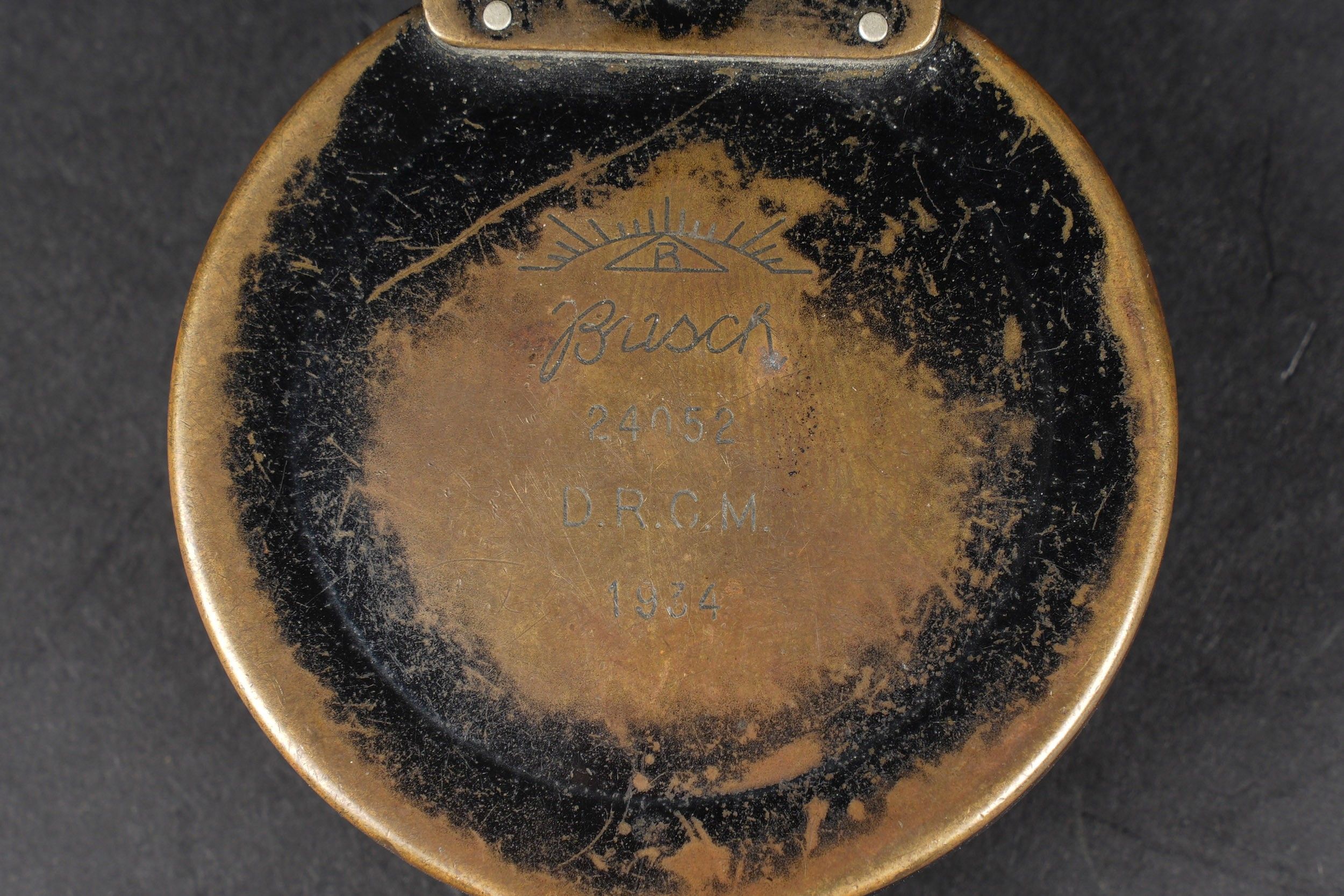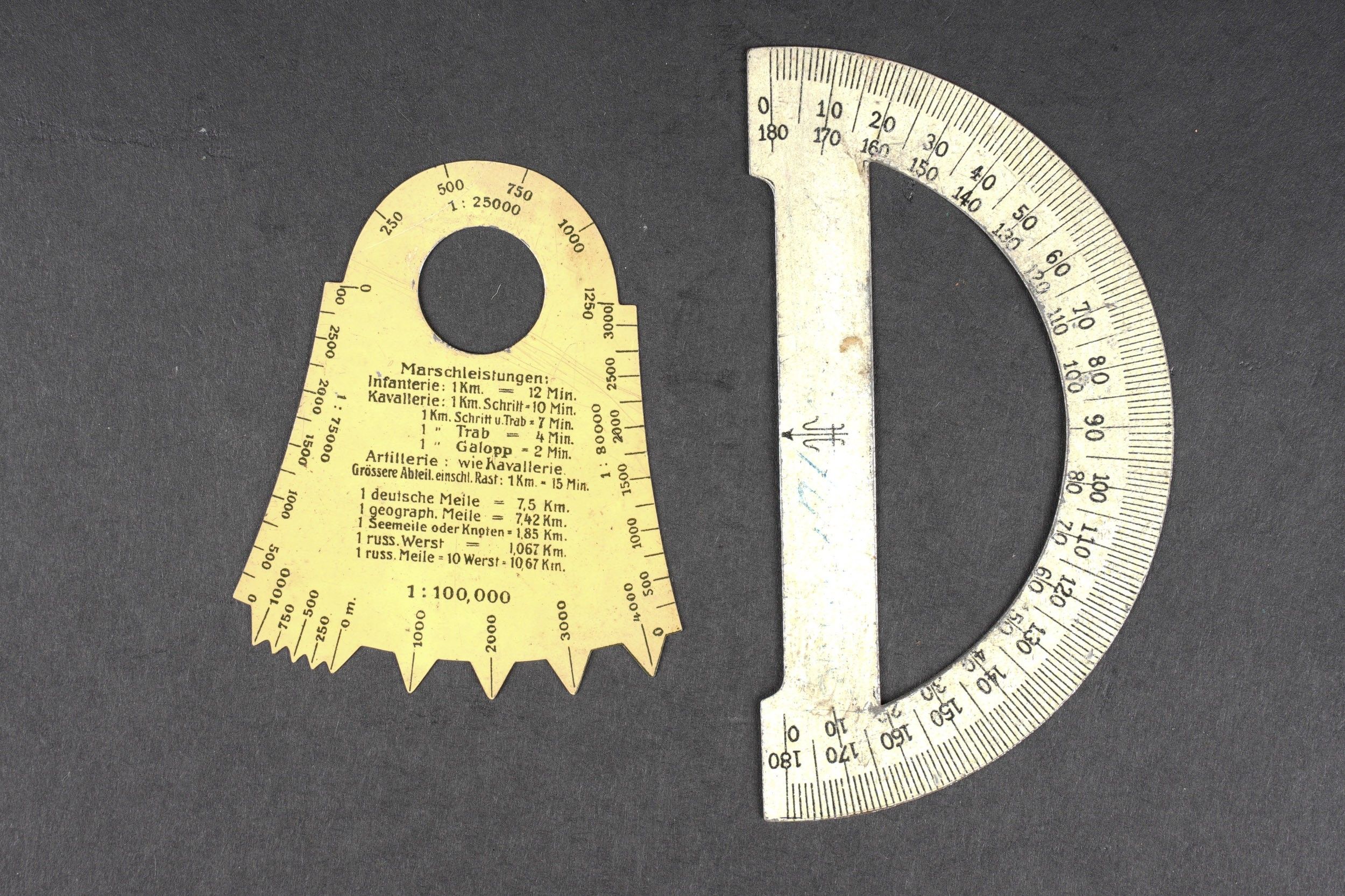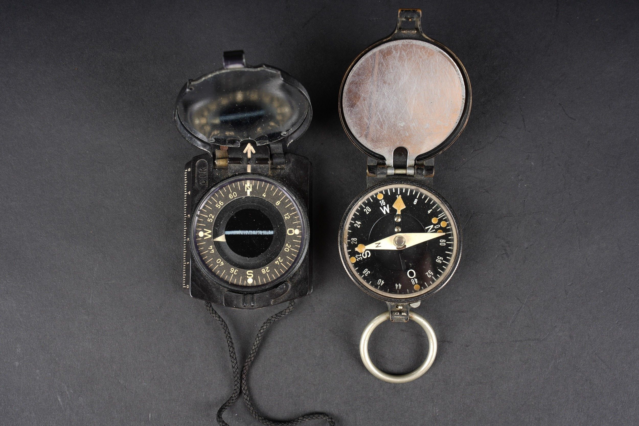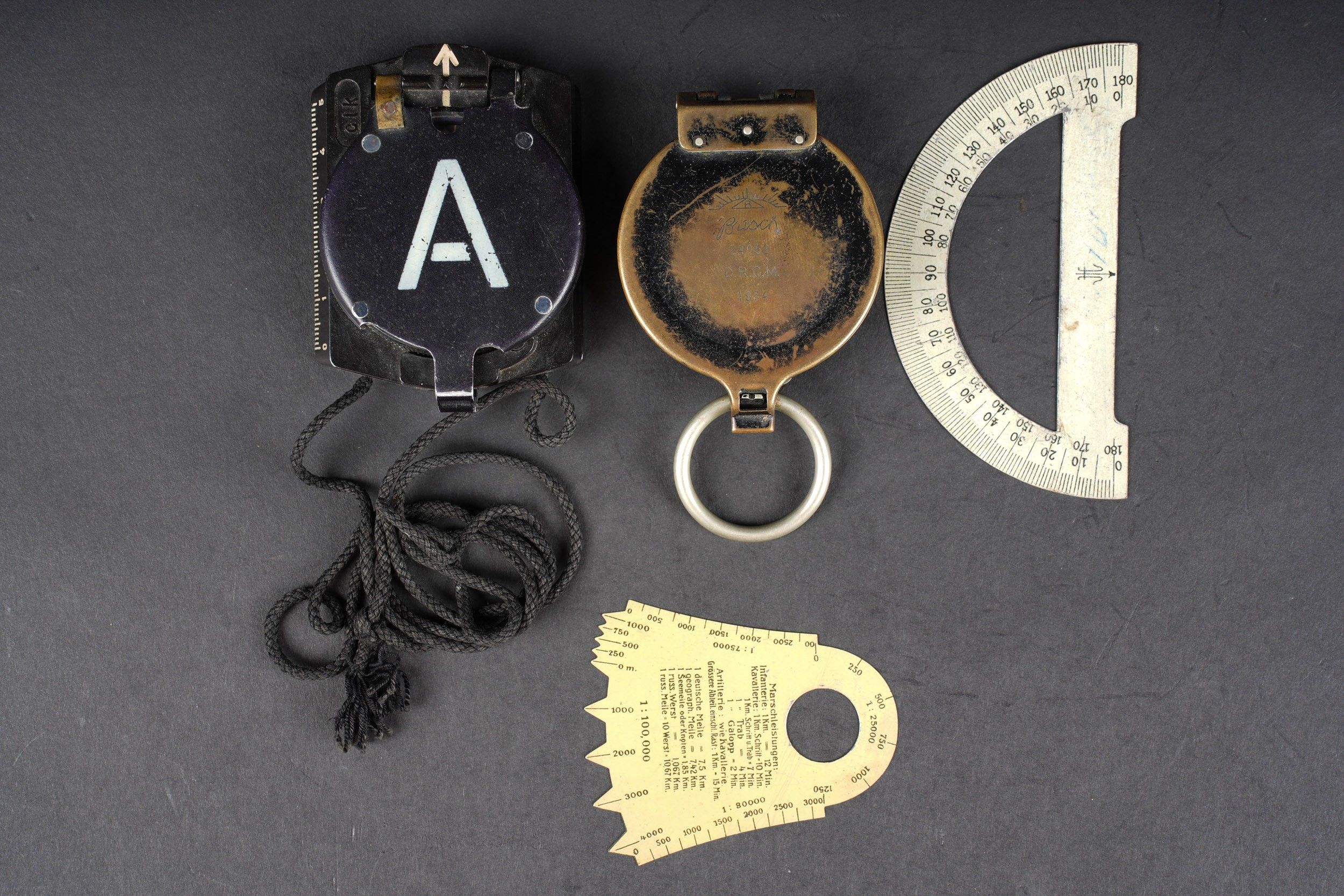 German compasses. Comprising one metal compass, functional, grenadier ring complete. Lid marked Busch 24052 DRGM 1934, heavily worn. A metal and black bakelite compass. Lid marked A. Functional. Made by CLK. Two SS runes are hand engraved on the back. The carrying cord is present. A metal protractor, manufacturer's logo present. A Marschleistungen measuring instrument. Some wear and patina to be noted. Condition II+. German compasses including one metal compass, functional, with complete suspension ring, marked Busch 24052 DRGM 1934, heavily worn. One metal and black bakelite compass, lid marked with letter A, functional, made by CLK. Two hand-engraved SS runes on reverse. Includes carrying cord. Also with a metal protractor bearing maker's logo and a Marschleistungen measuring instrument. Some wear and patina on the pieces. Condition II+