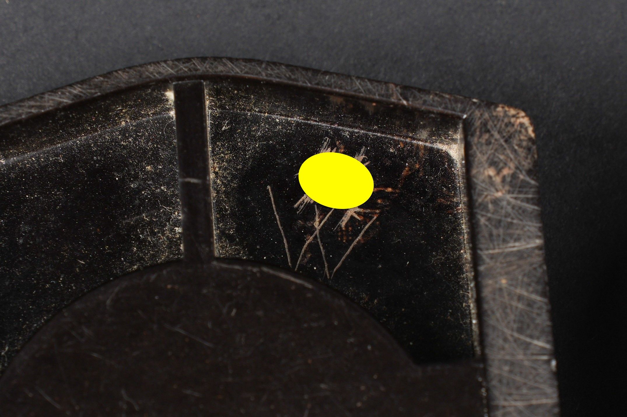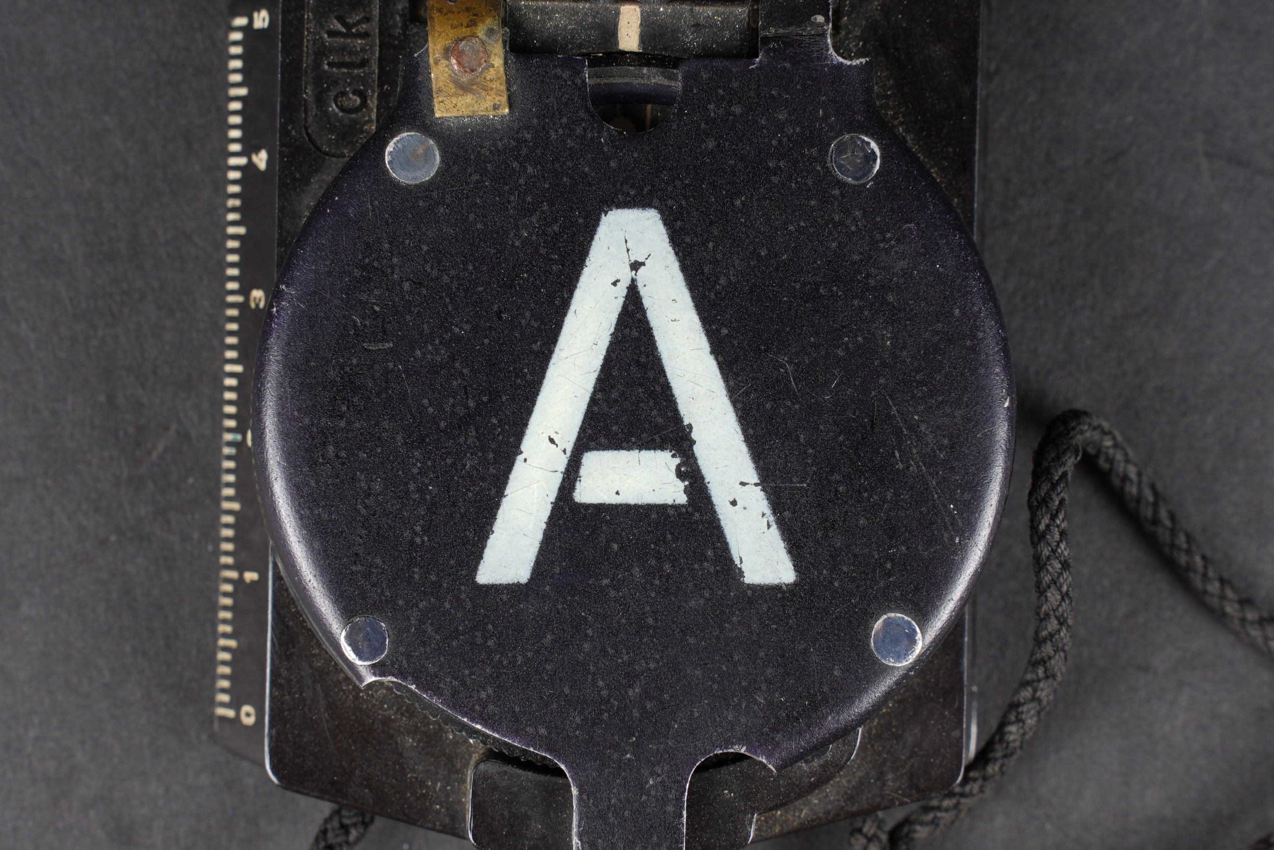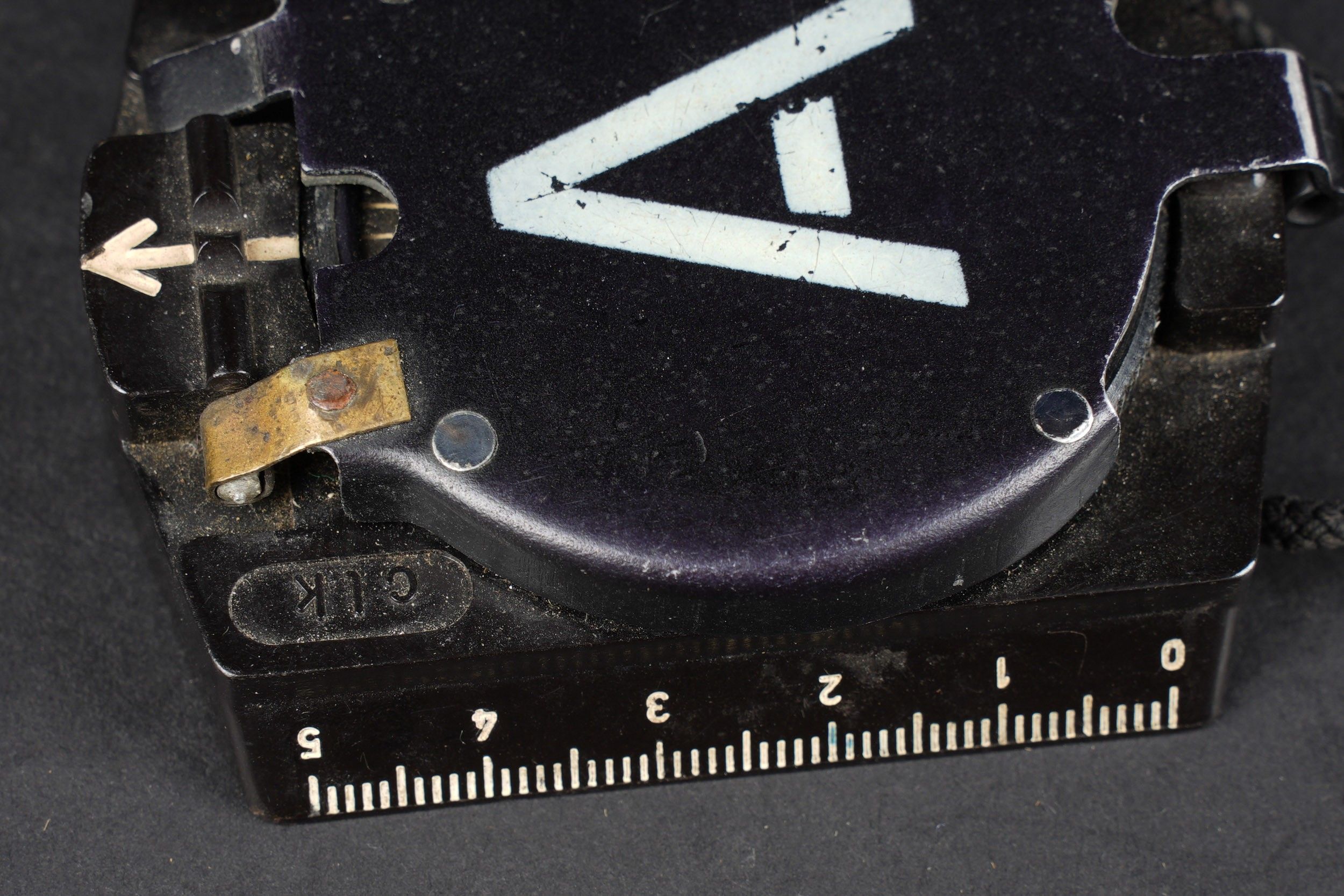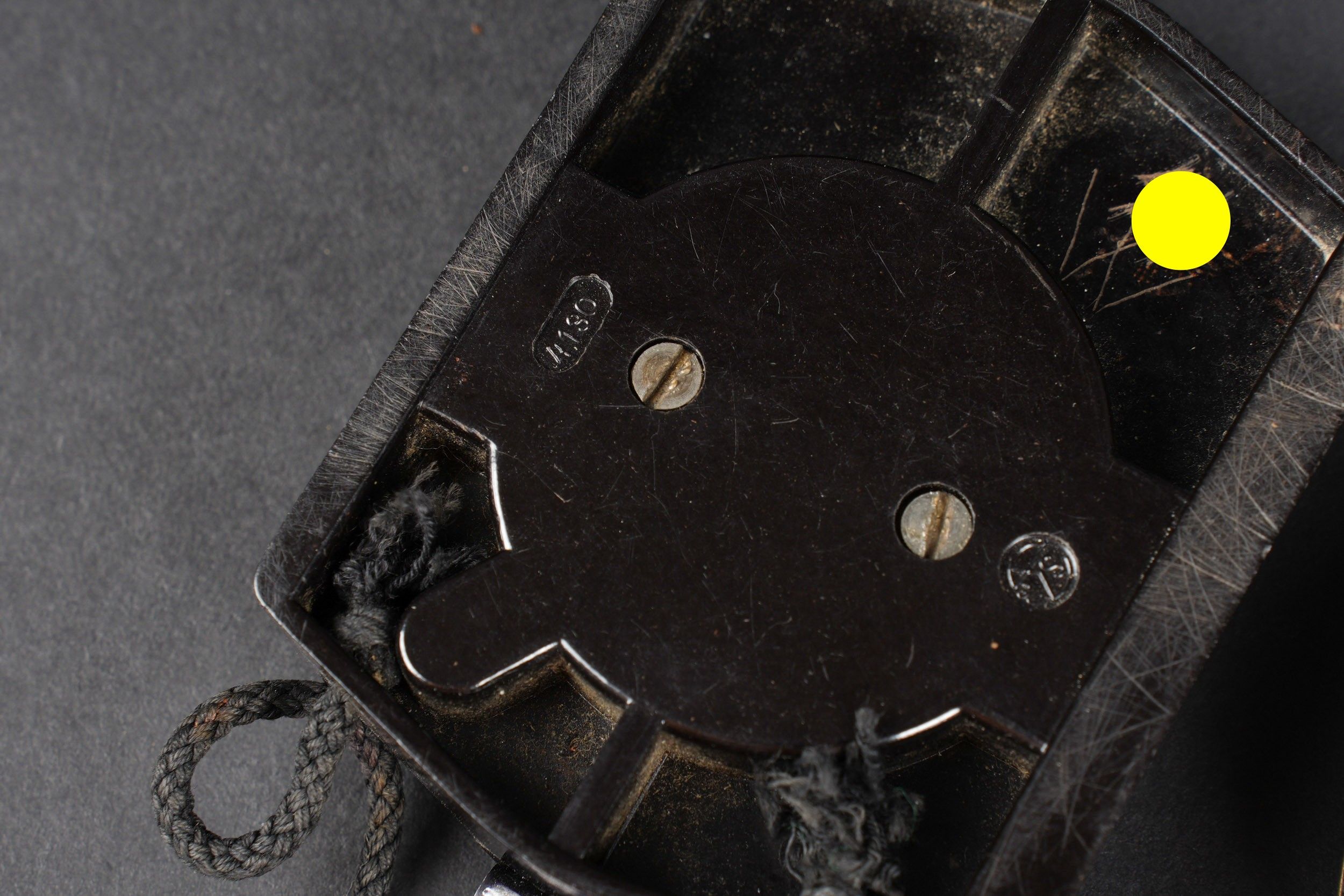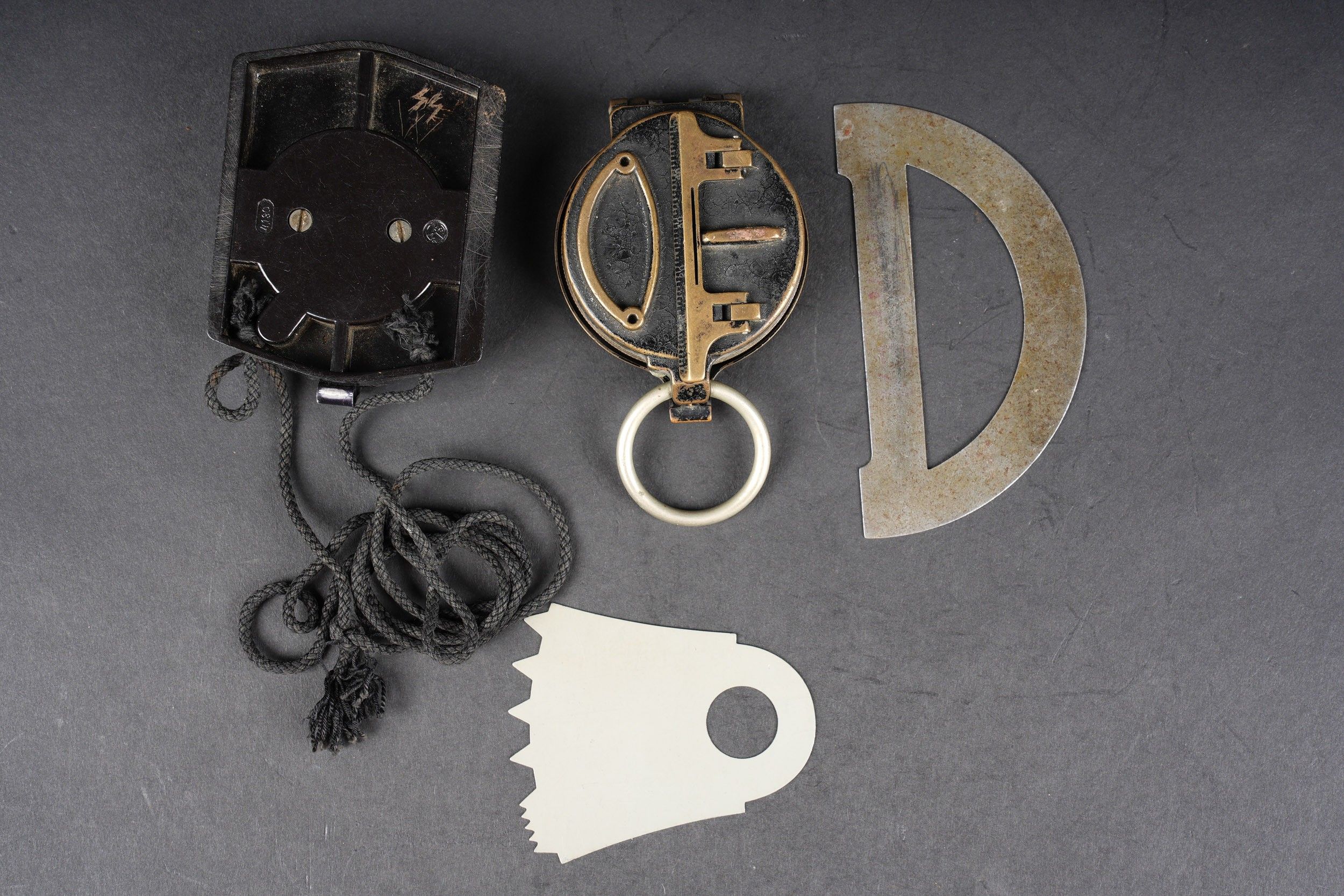 German compasses. Comprising one metal compass, functional, grenadier ring complete. Lid marked Busch 24052 DRGM 1934, heavily worn. A metal and black bakelite compass. Lid marked A. Functional. Made by CLK. Two SS runes are hand engraved on the back. The carrying cord is present. A metal protractor, manufacturer's logo present. A Marschleistungen measuring instrument. Some wear and patina to be noted. Condition II+. German compasses including one metal compass, functional, with complete suspension ring, marked Busch 24052 DRGM 1934, heavily worn. One metal and black bakelite compass, lid marked with letter A, functional, made by CLK. Two hand-engraved SS runes on reverse. Includes carrying cord. Also with a metal protractor bearing maker's logo and a Marschleistungen measuring instrument. Some wear and patina on the pieces. Condition II+