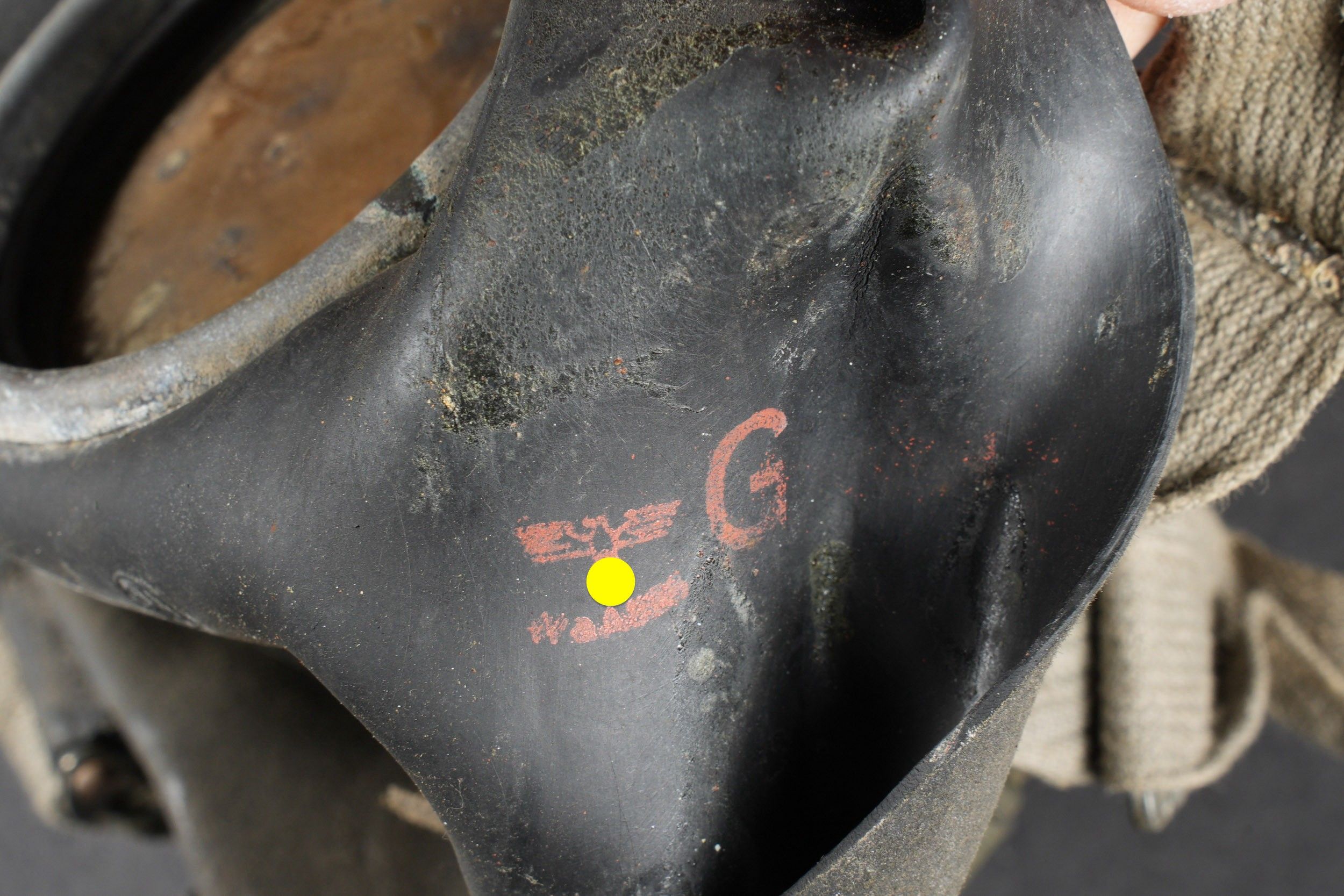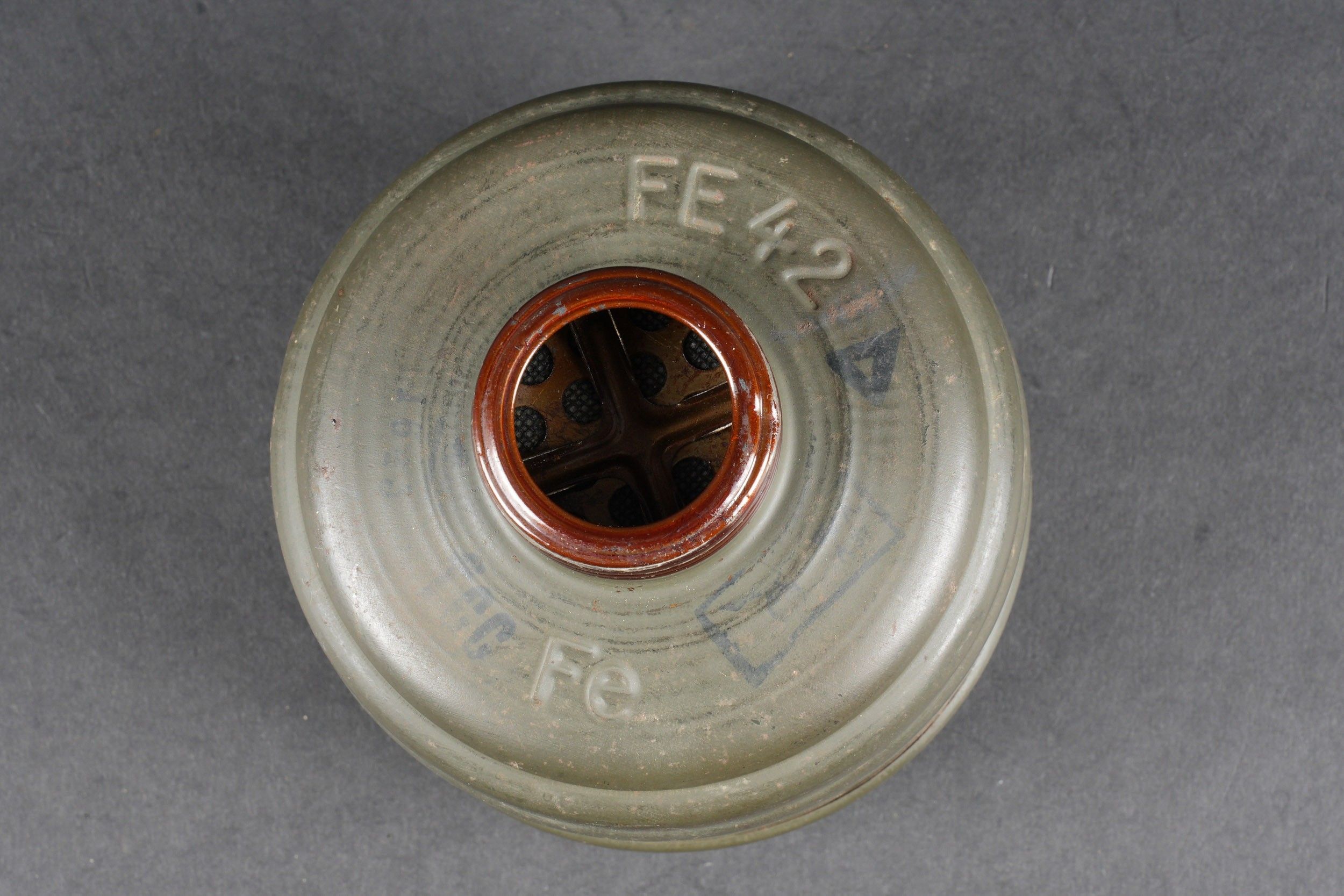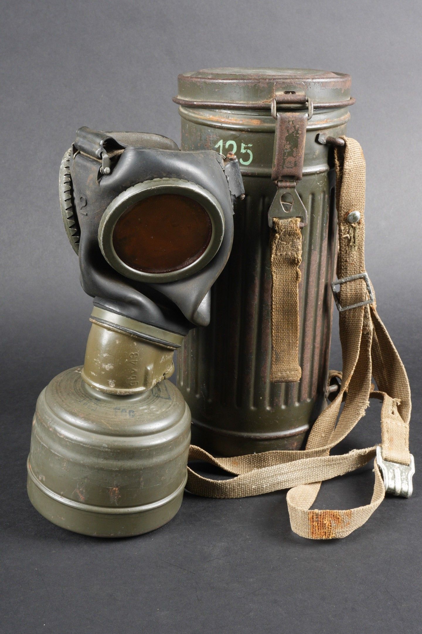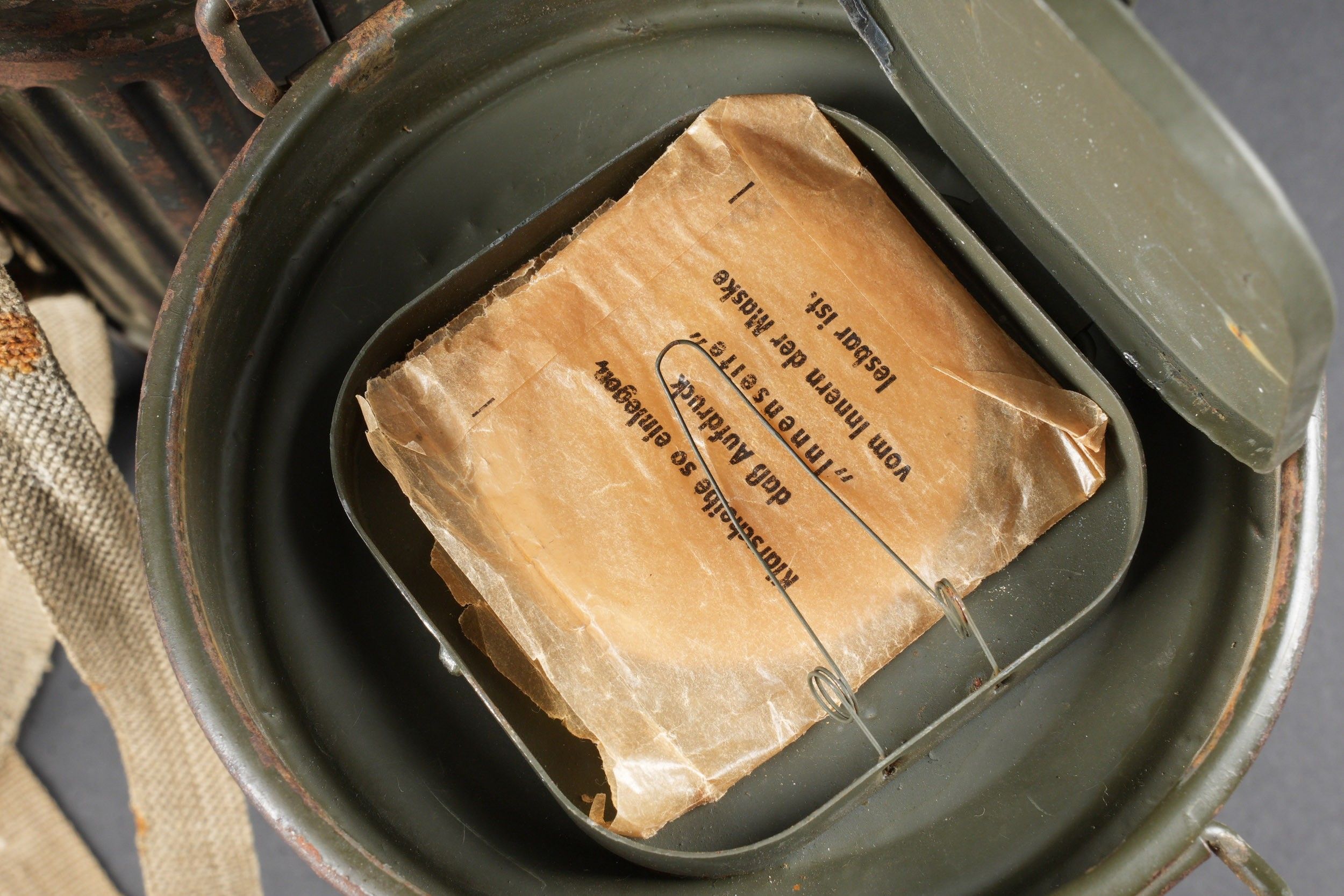 German anti-gas mask. Long metal case, 70% Feldgrau paint. All straps are present. Markings 125 painted in light green paint on the side of the case. Manufactured in 1940. Spare lenses, cloth and spider are present. Rubber mask, size 2, all straps present. FE 42 filter, complete. Some wear and patina. Condition II+. German gas mask with long metal canister retaining 70% of original Feldgrau paint. All straps present. Green 125 marking painted on side. Dated 1940. Includes spare lenses, cleaning cloth, and spider insert. Rubber mask, size 2, with all straps intact. Filter FE 42 complete. Some wear and patina on the piece. Condition II+