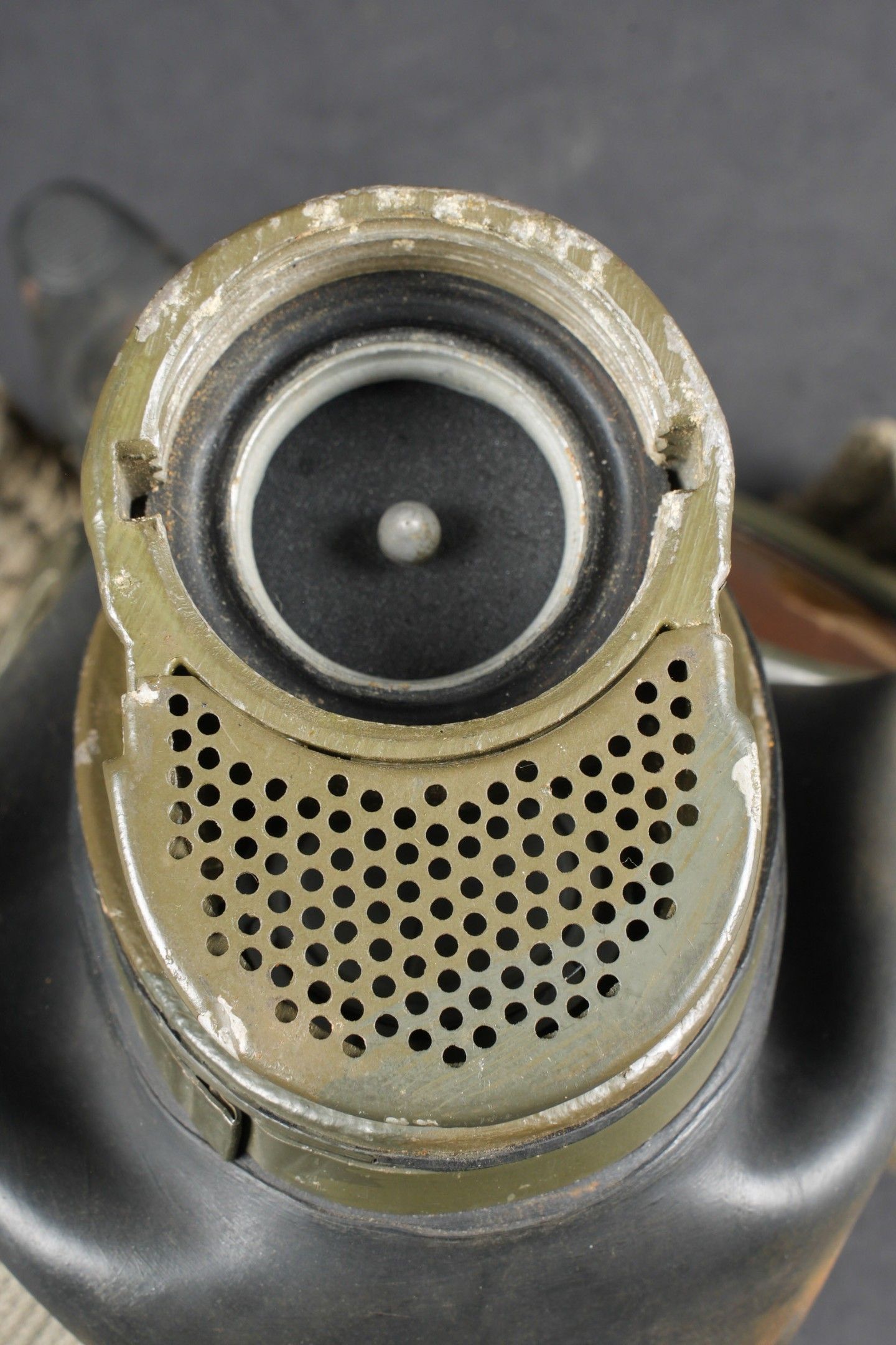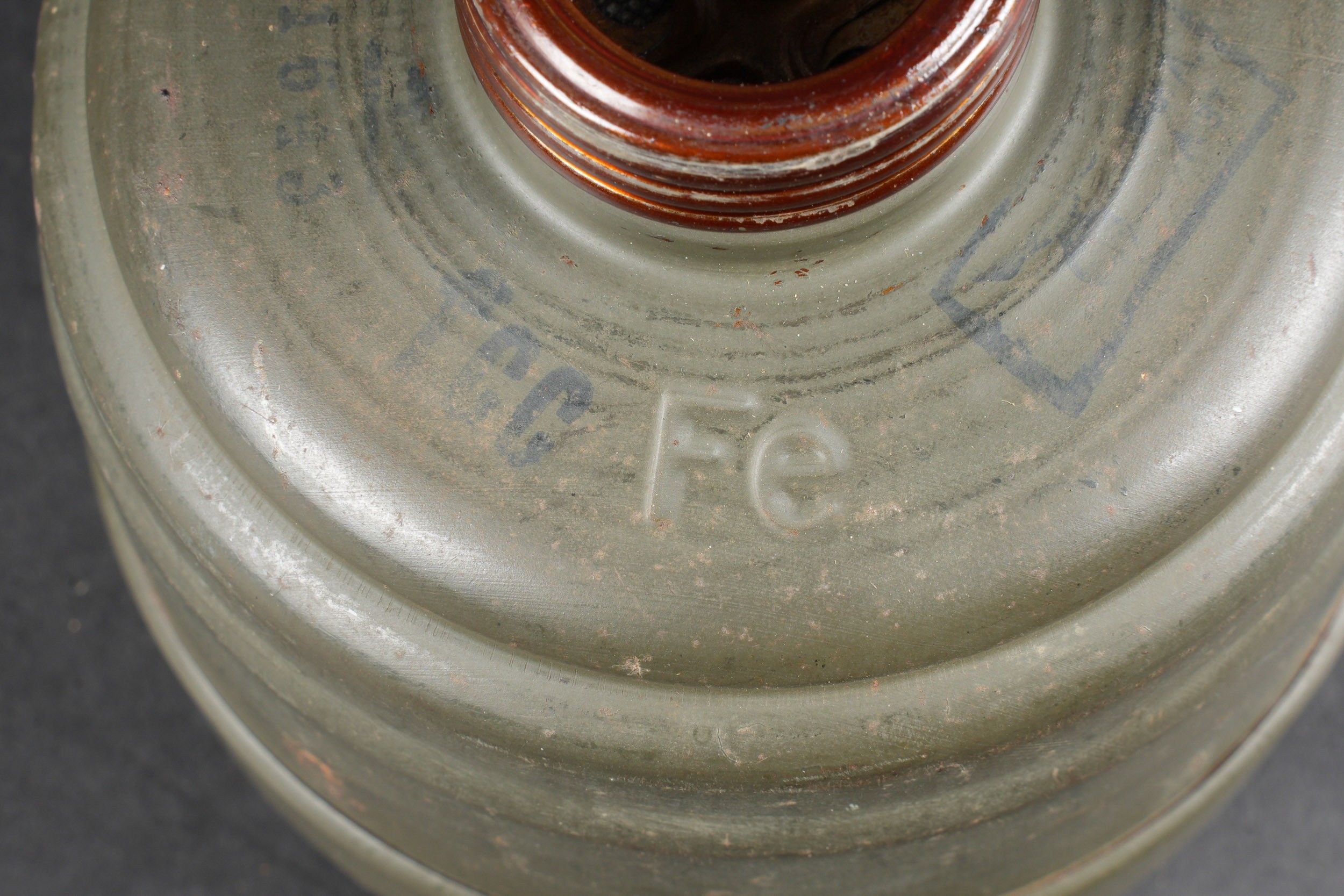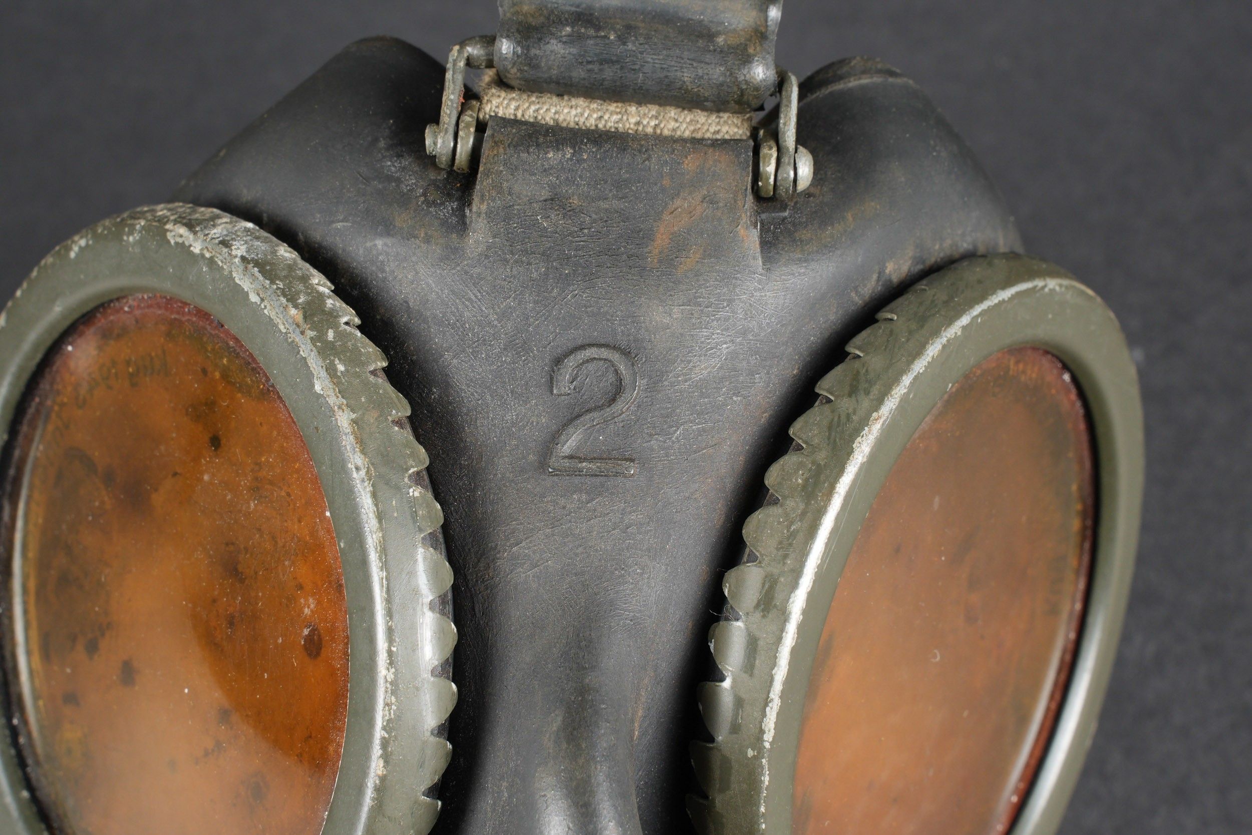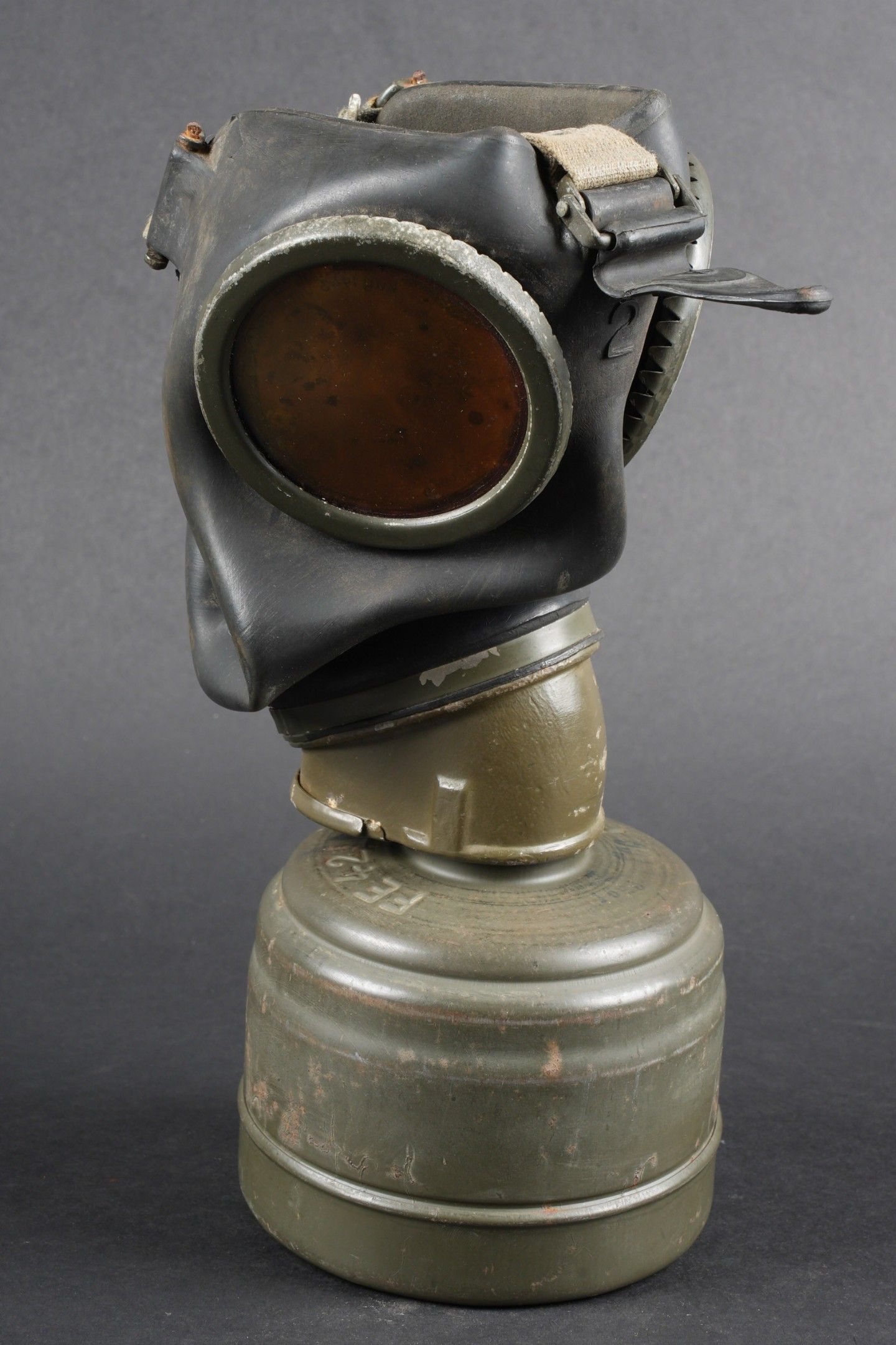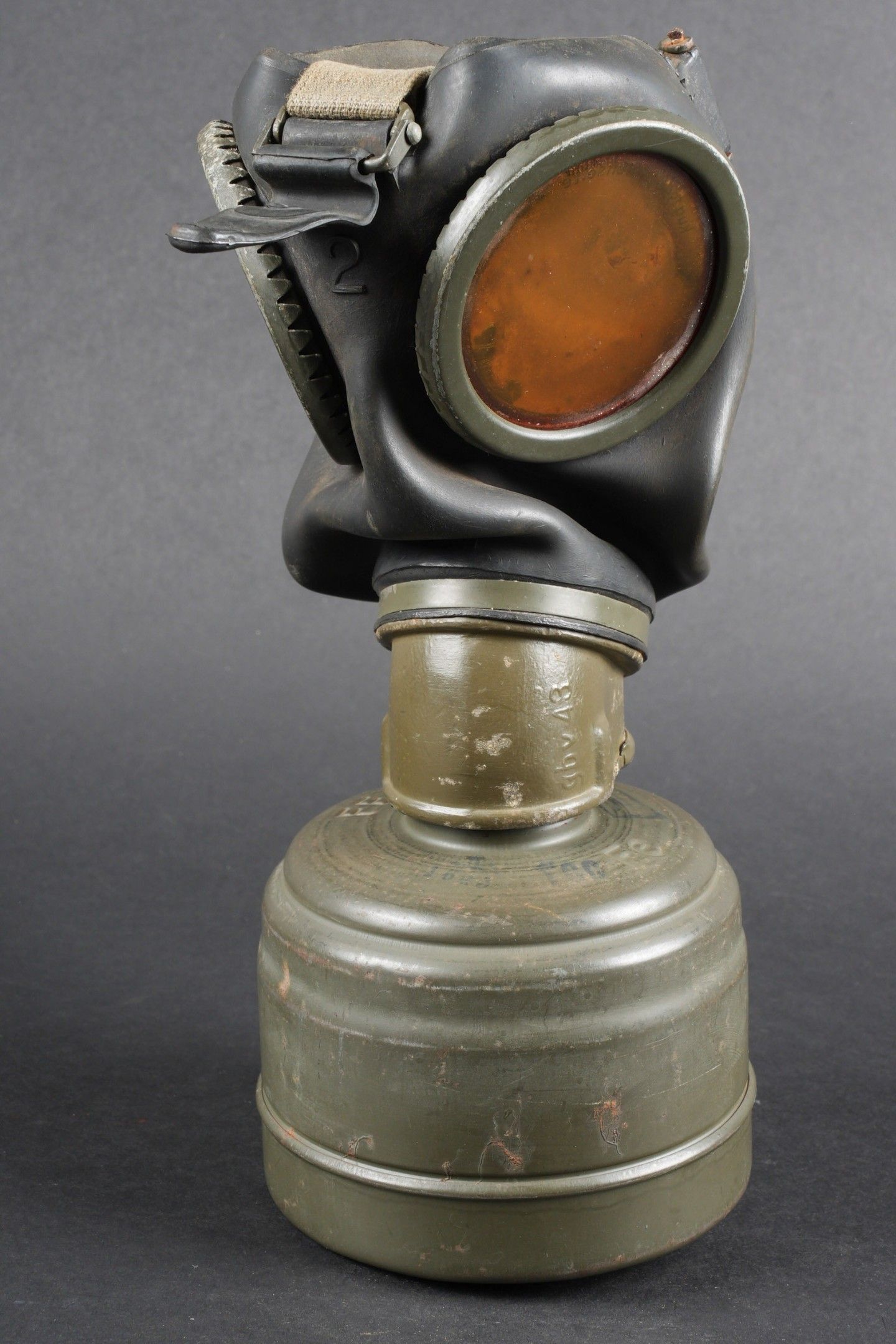 German anti-gas mask. Long metal case, 70% Feldgrau paint. All straps are present. Markings 125 painted in light green paint on the side of the case. Manufactured in 1940. Spare lenses, cloth and spider are present. Rubber mask, size 2, all straps present. FE 42 filter, complete. Some wear and patina. Condition II+. German gas mask with long metal canister retaining 70% of original Feldgrau paint. All straps present. Green 125 marking painted on side. Dated 1940. Includes spare lenses, cleaning cloth, and spider insert. Rubber mask, size 2, with all straps intact. Filter FE 42 complete. Some wear and patina on the piece. Condition II+