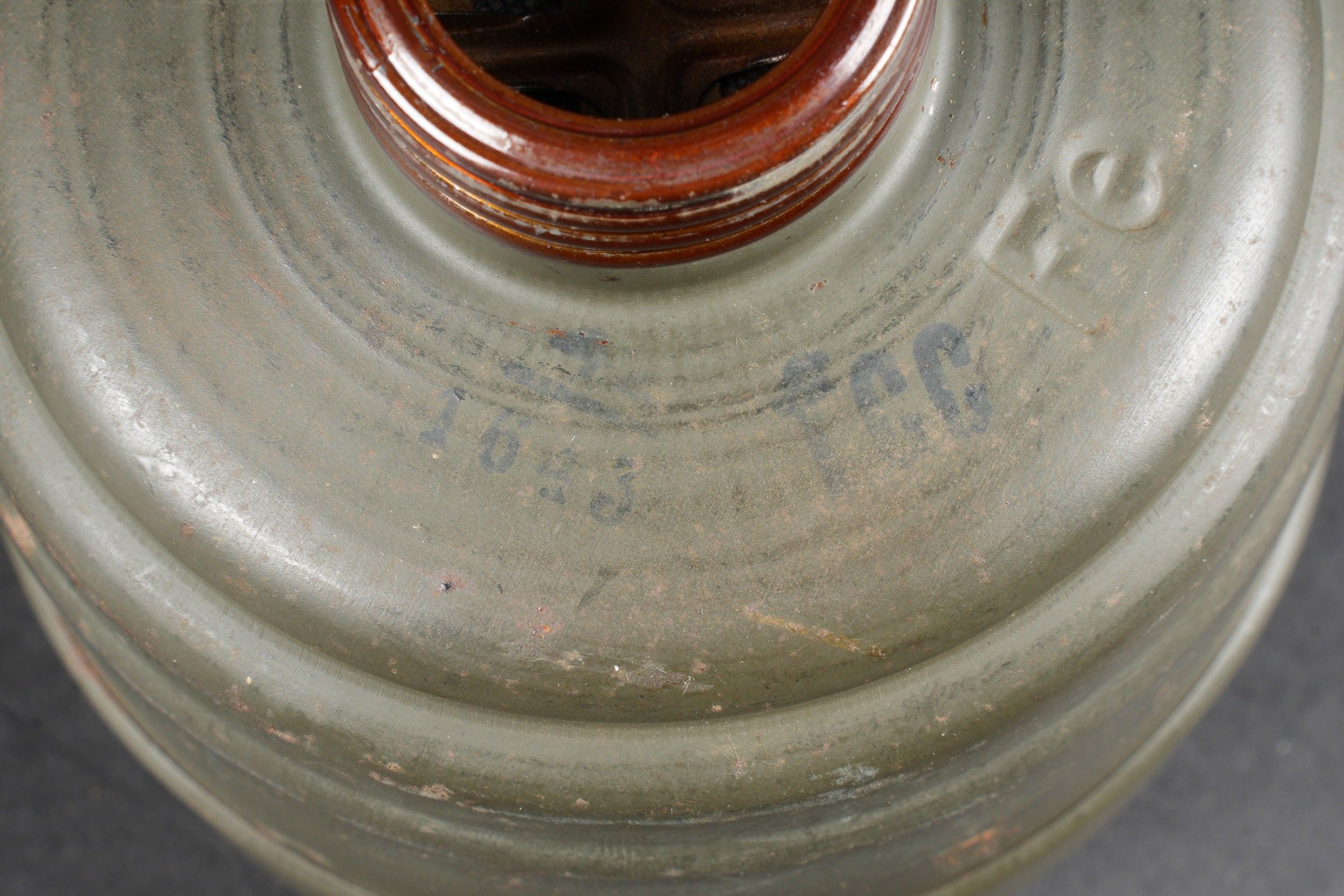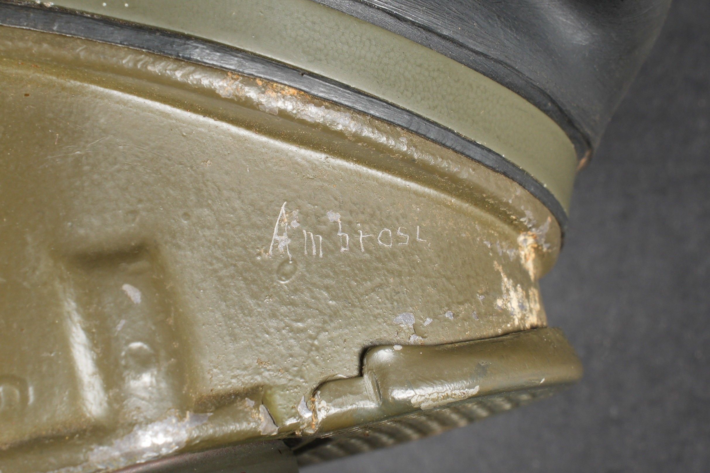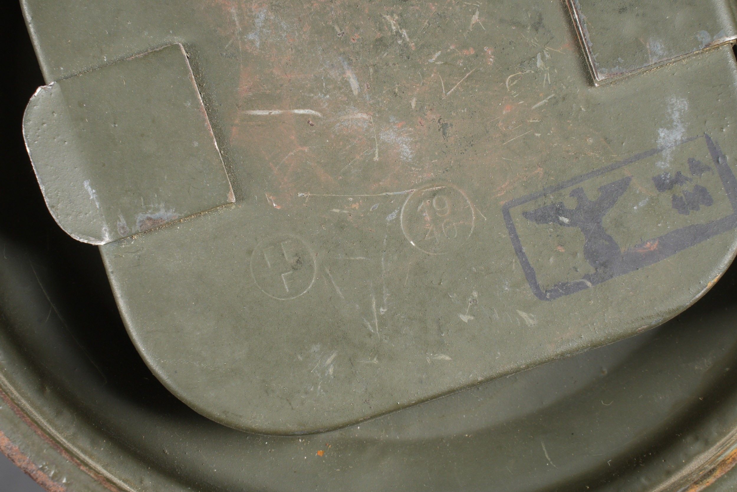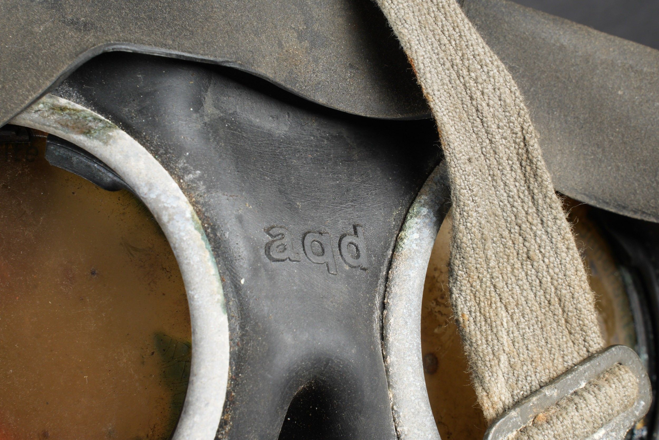 German anti-gas mask. Long metal case, 70% Feldgrau paint. All straps are present. Markings 125 painted in light green paint on the side of the case. Manufactured in 1940. Spare lenses, cloth and spider are present. Rubber mask, size 2, all straps present. FE 42 filter, complete. Some wear and patina. Condition II+. German gas mask with long metal canister retaining 70% of original Feldgrau paint. All straps present. Green 125 marking painted on side. Dated 1940. Includes spare lenses, cleaning cloth, and spider insert. Rubber mask, size 2, with all straps intact. Filter FE 42 complete. Some wear and patina on the piece. Condition II+