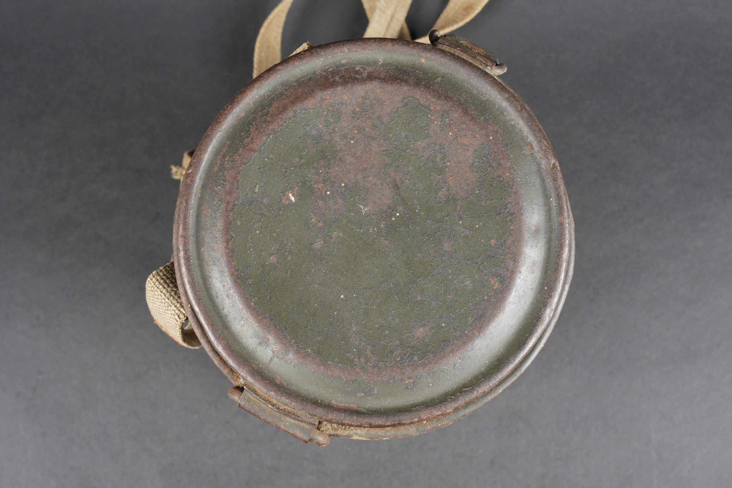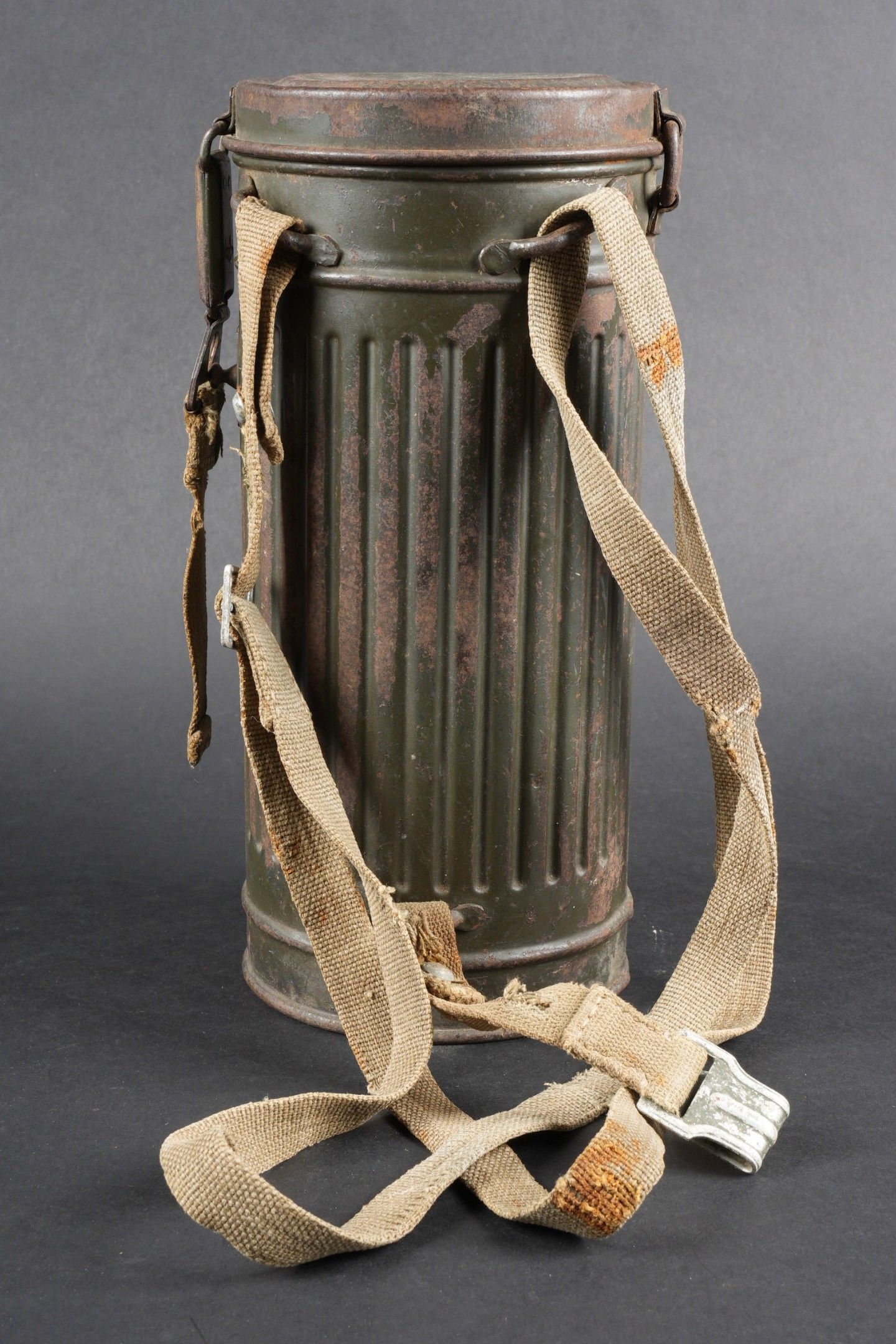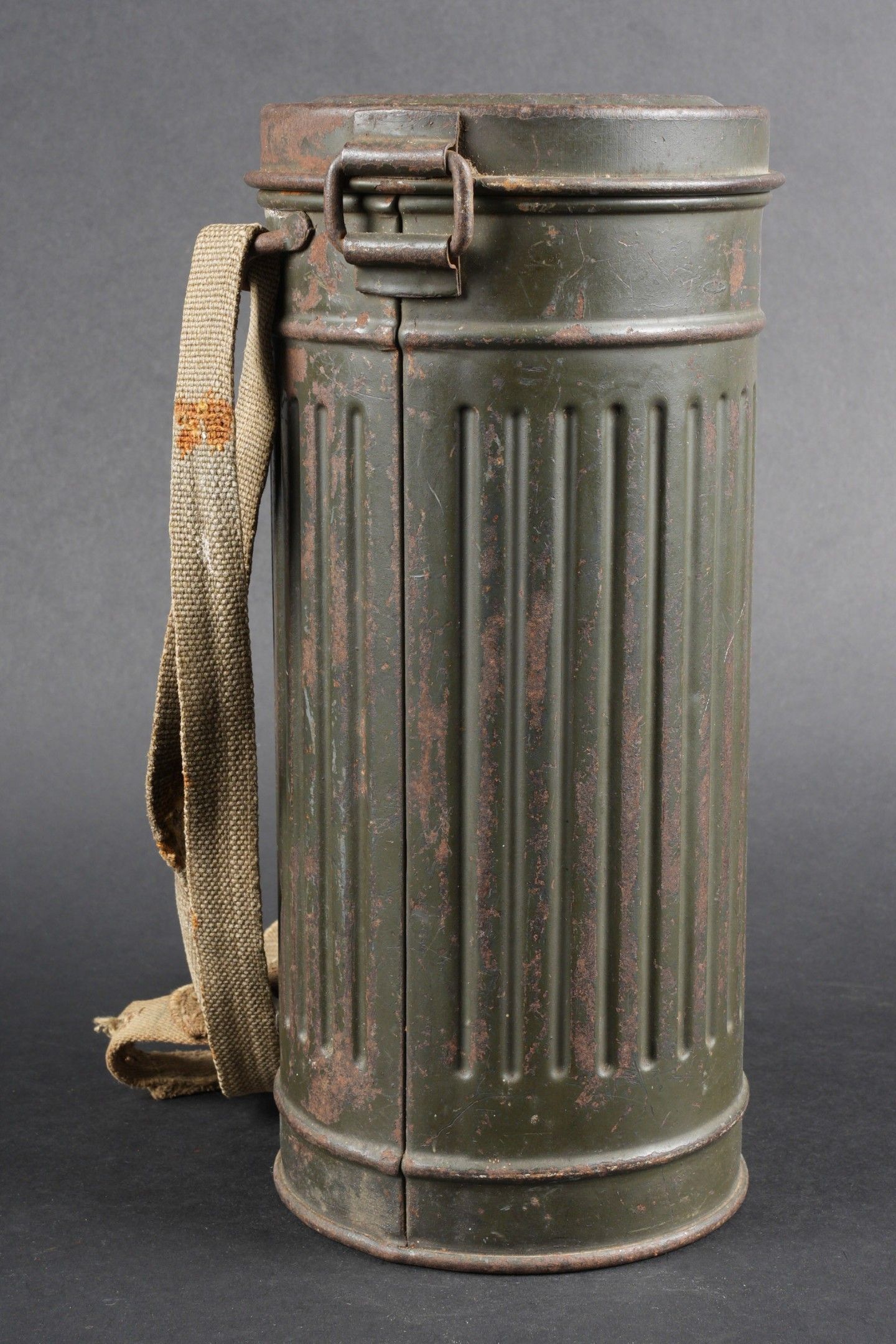 German anti-gas mask. Long metal case, 70% Feldgrau paint.