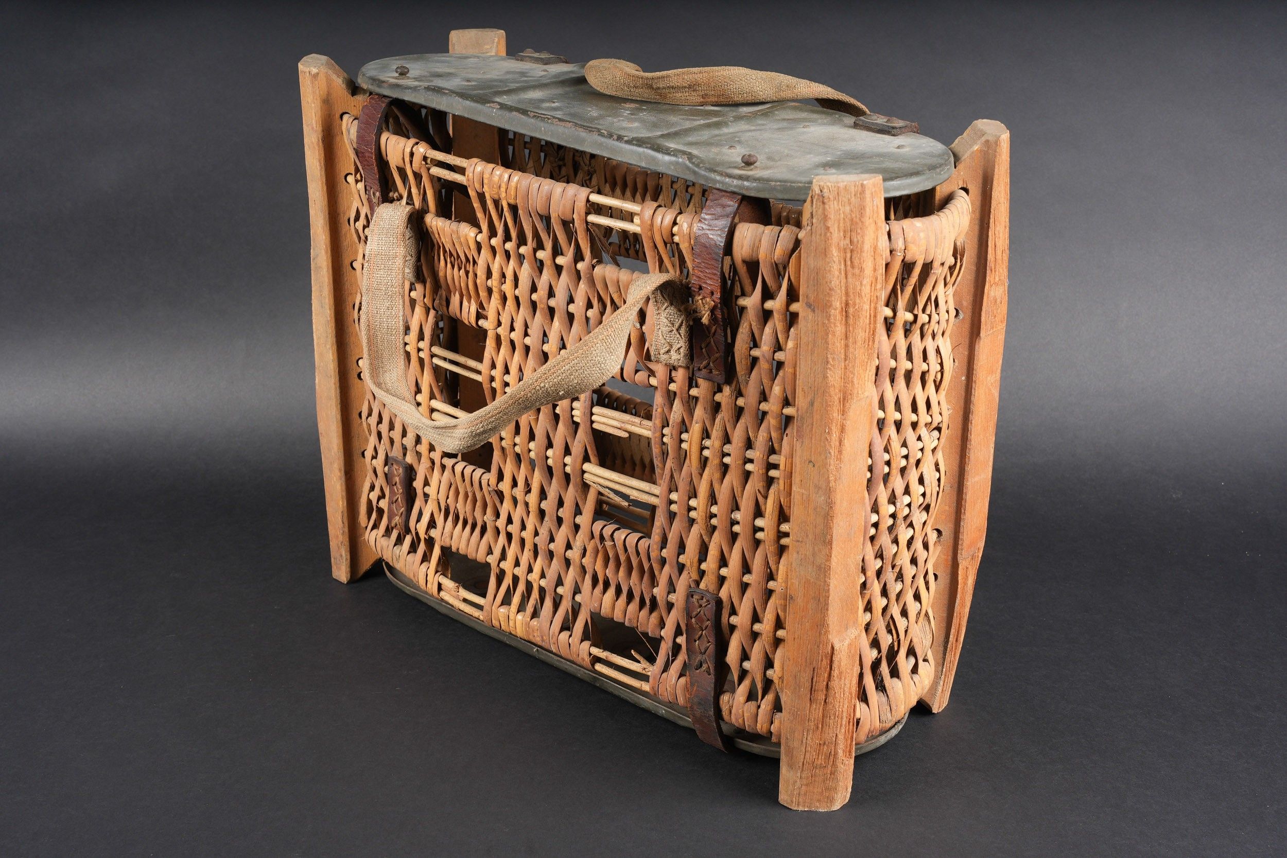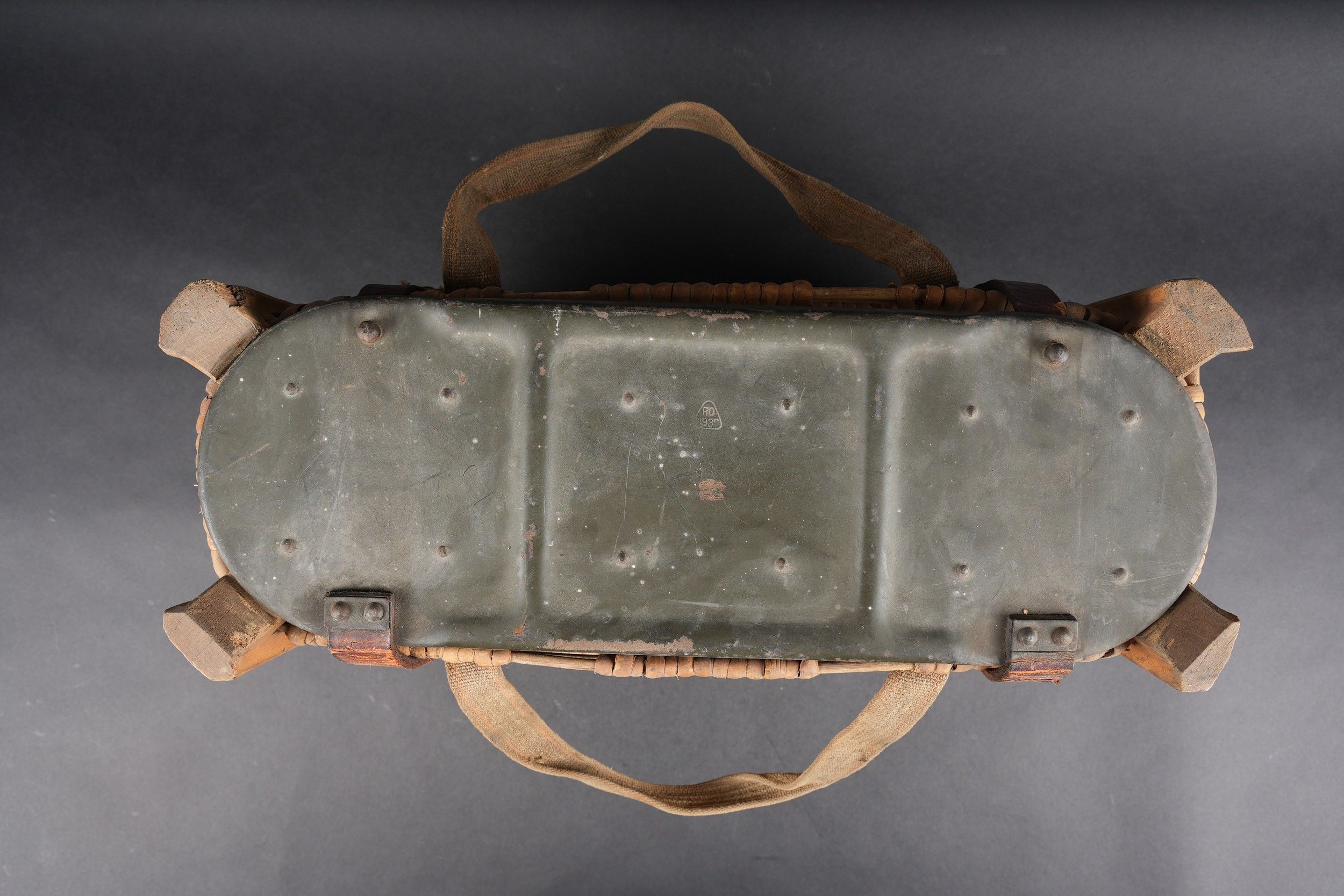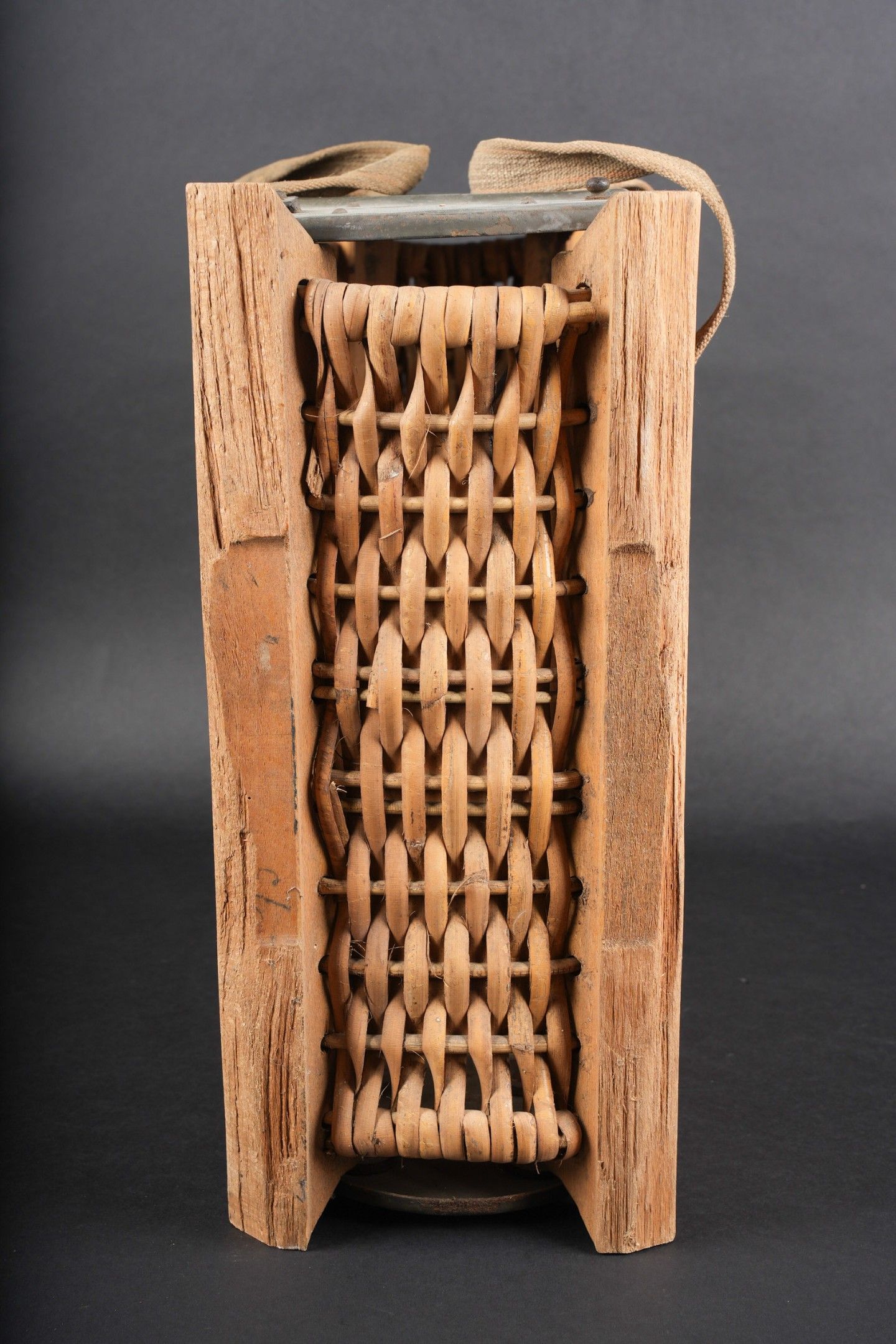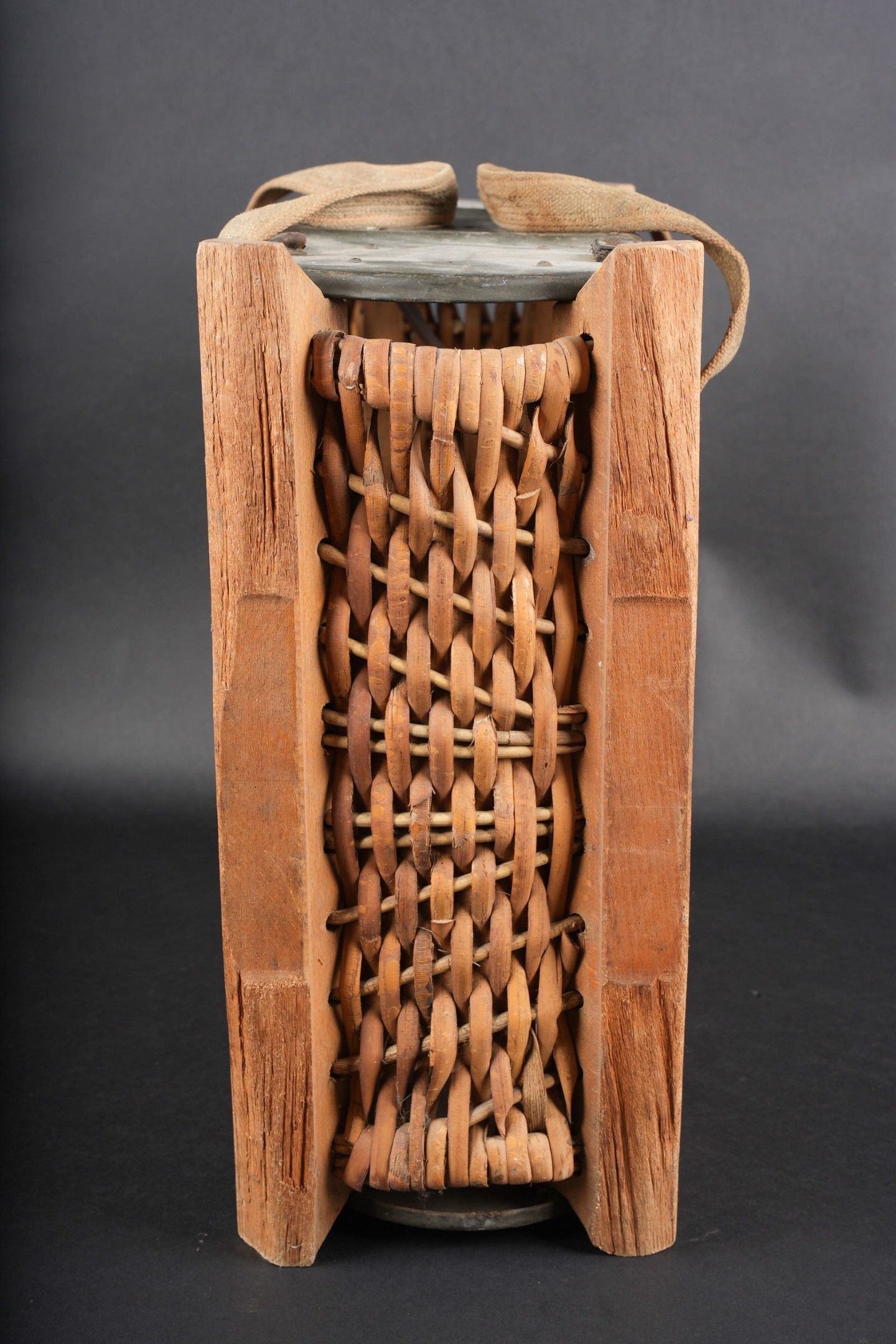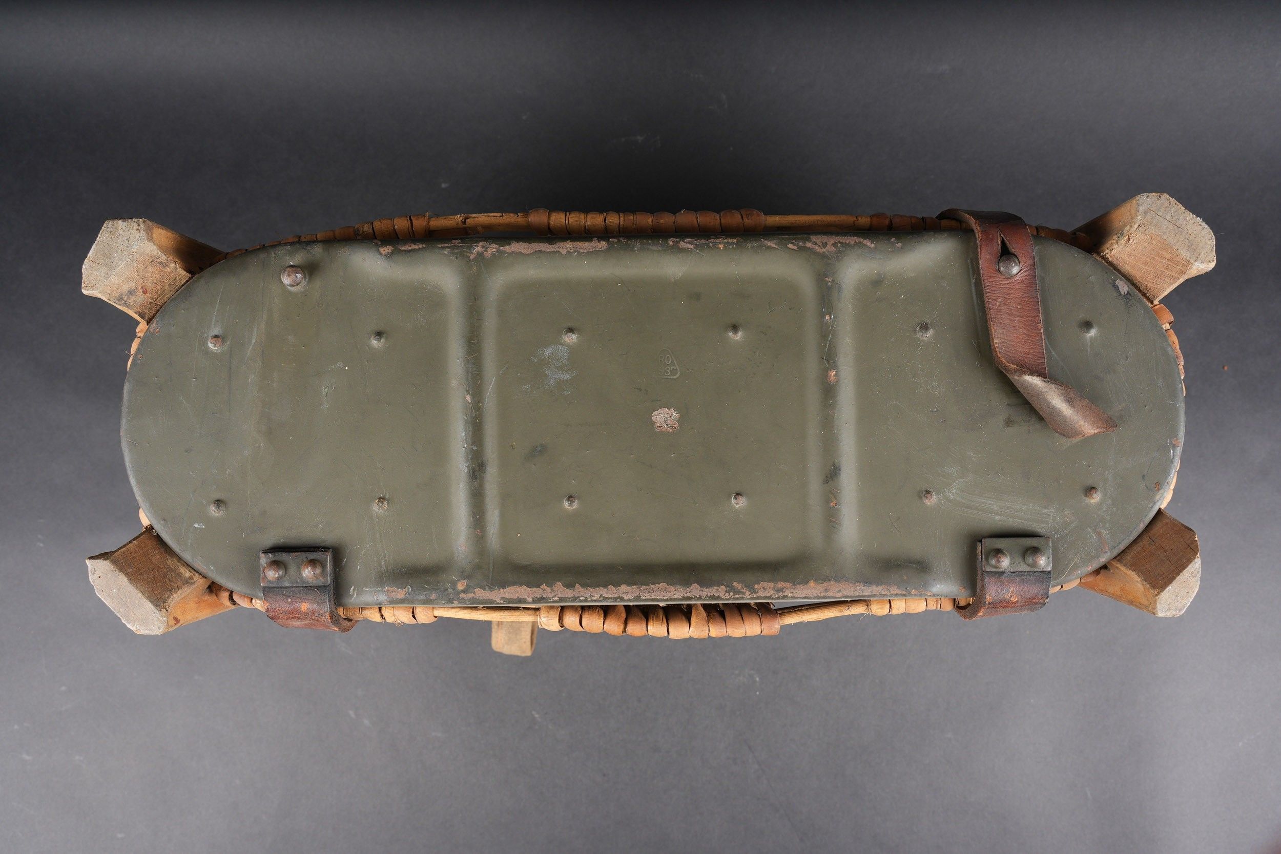 Wicker basket for 6 x 10 cm le.F.H.18 sockets. Wood and wicker frame. The canvas carrying straps are present. Wooden base and lid. The internal racks are present. The wooden frame on the sides is incomplete. The leather straps are complete. 80% Feldgrau paintwork. Lid marked RO 1939 with Waa eagle. Some wear and patina. Condition II+. Wicker basket for six 10 cm le.F.H.18 shell cases with wooden and wicker frame. Canvas carrying straps intact. Wooden bottom and lid. Internal racks present but partial wooden side structure. Leather straps complete. 80% of original Feldgrau paint. Lid marked RO 1939 with Waa eagle. Some wear and patina on the piece. Condition II+