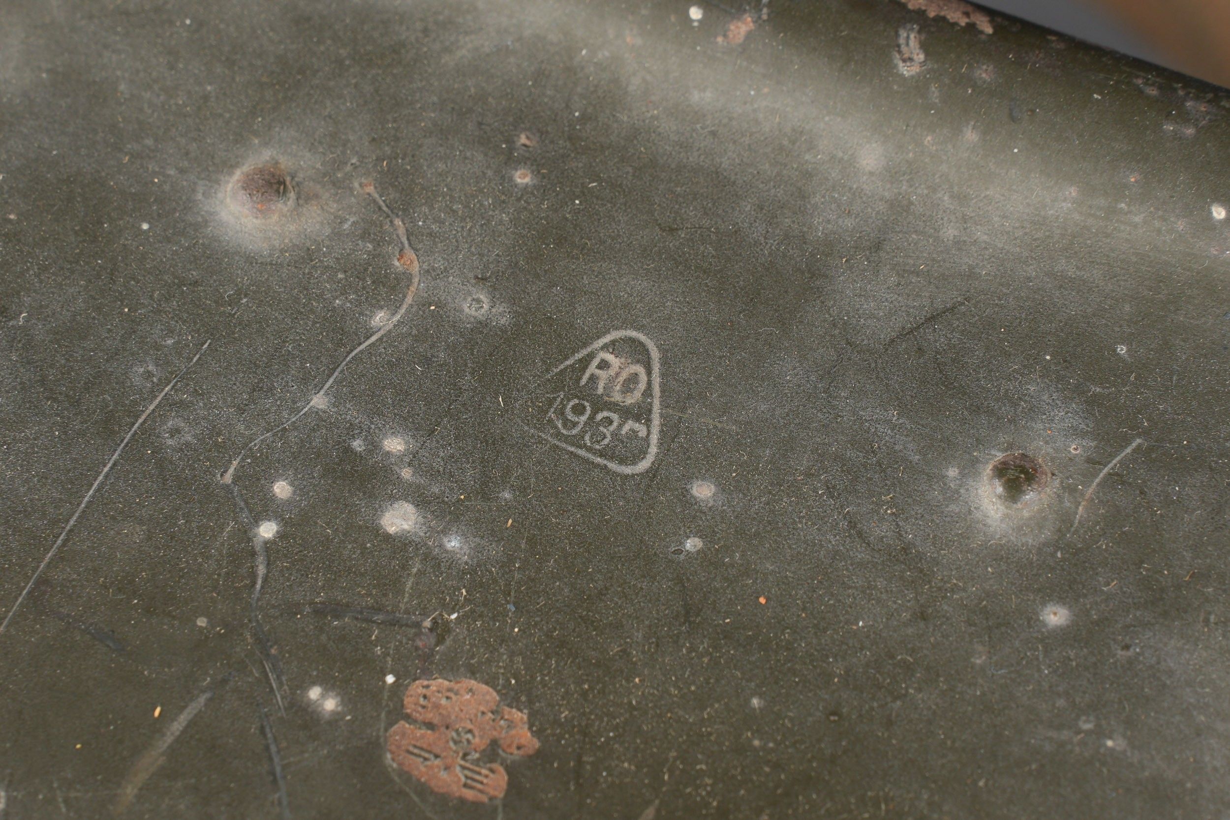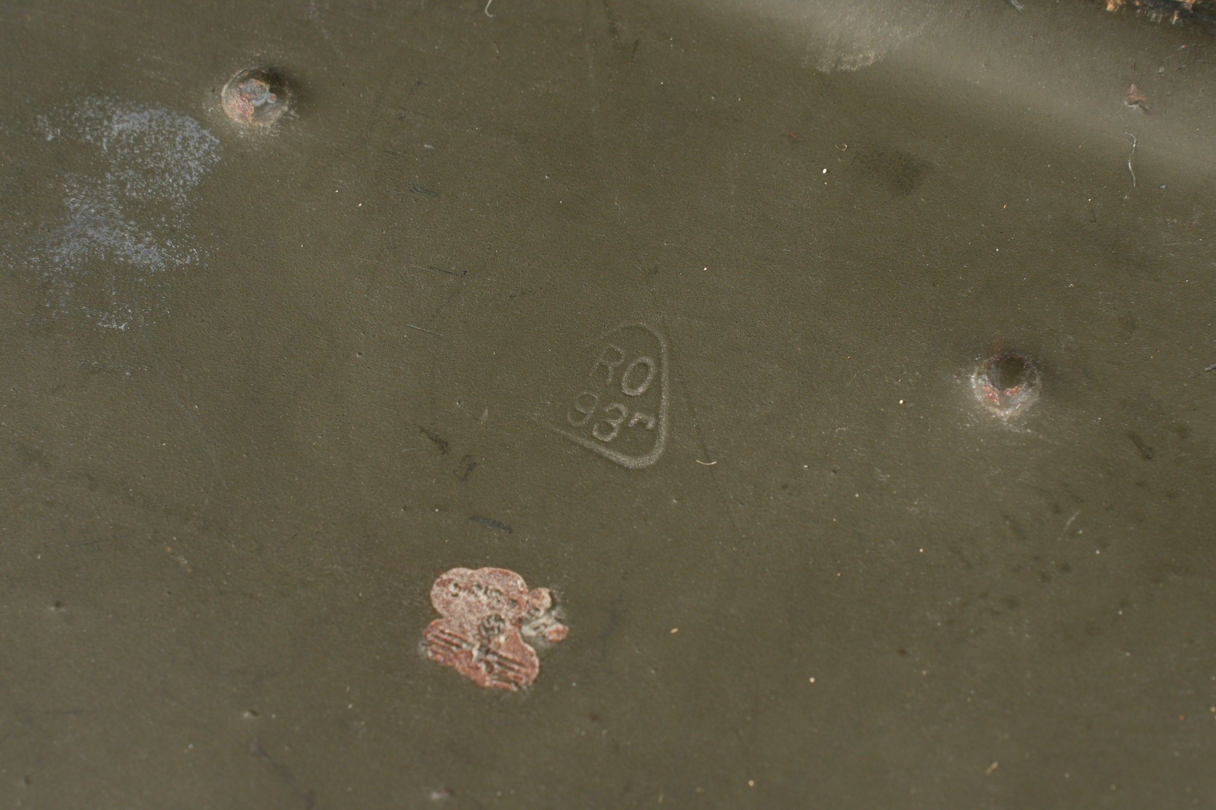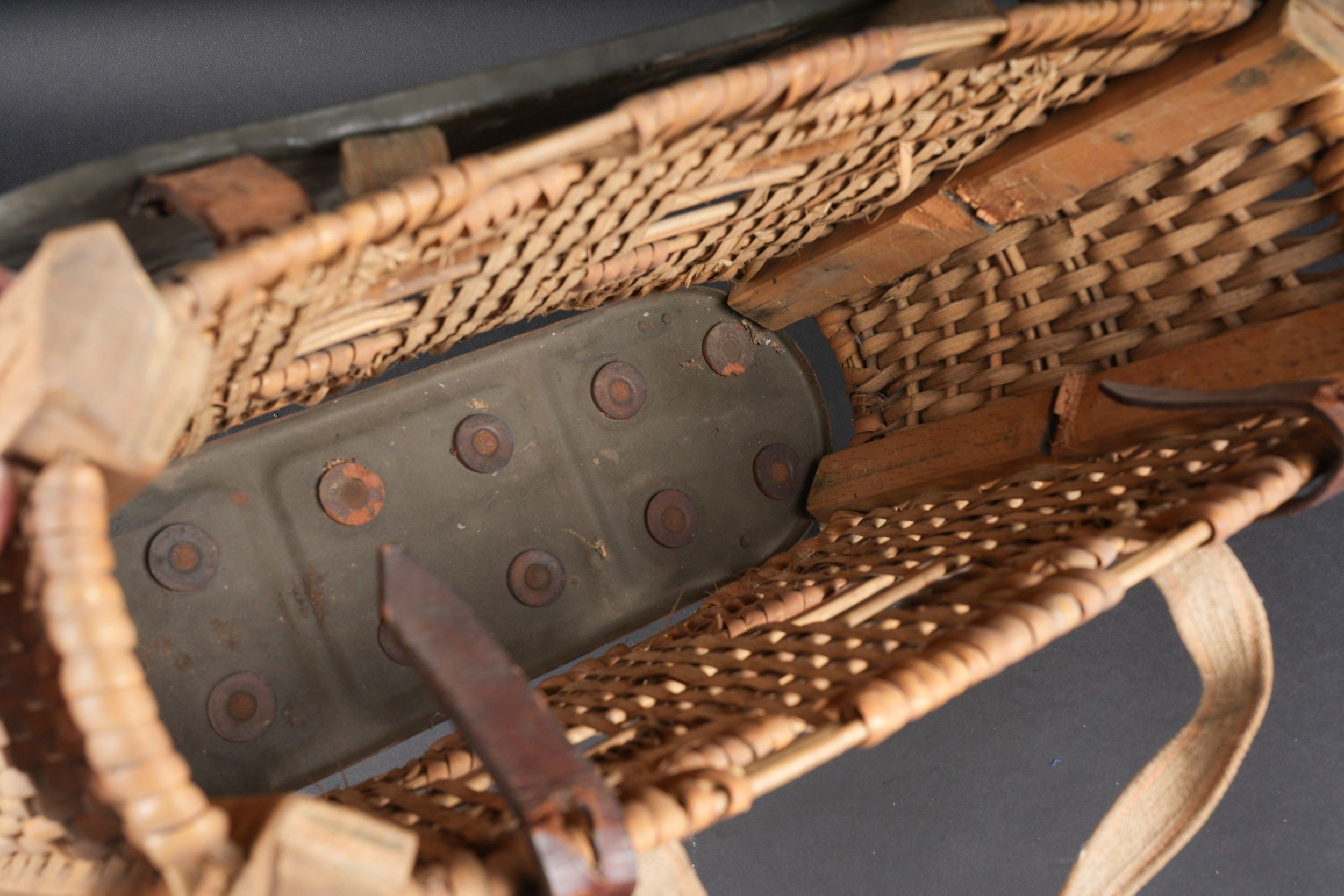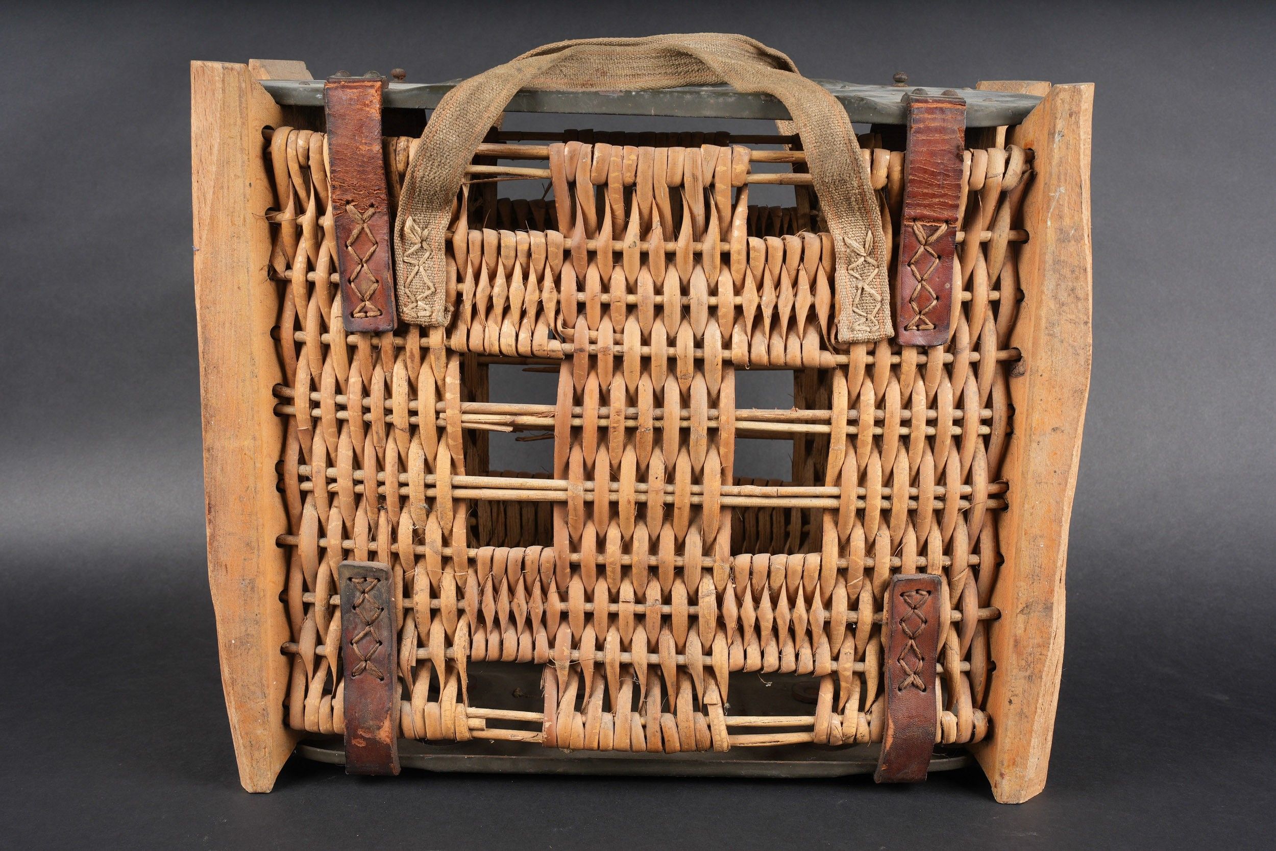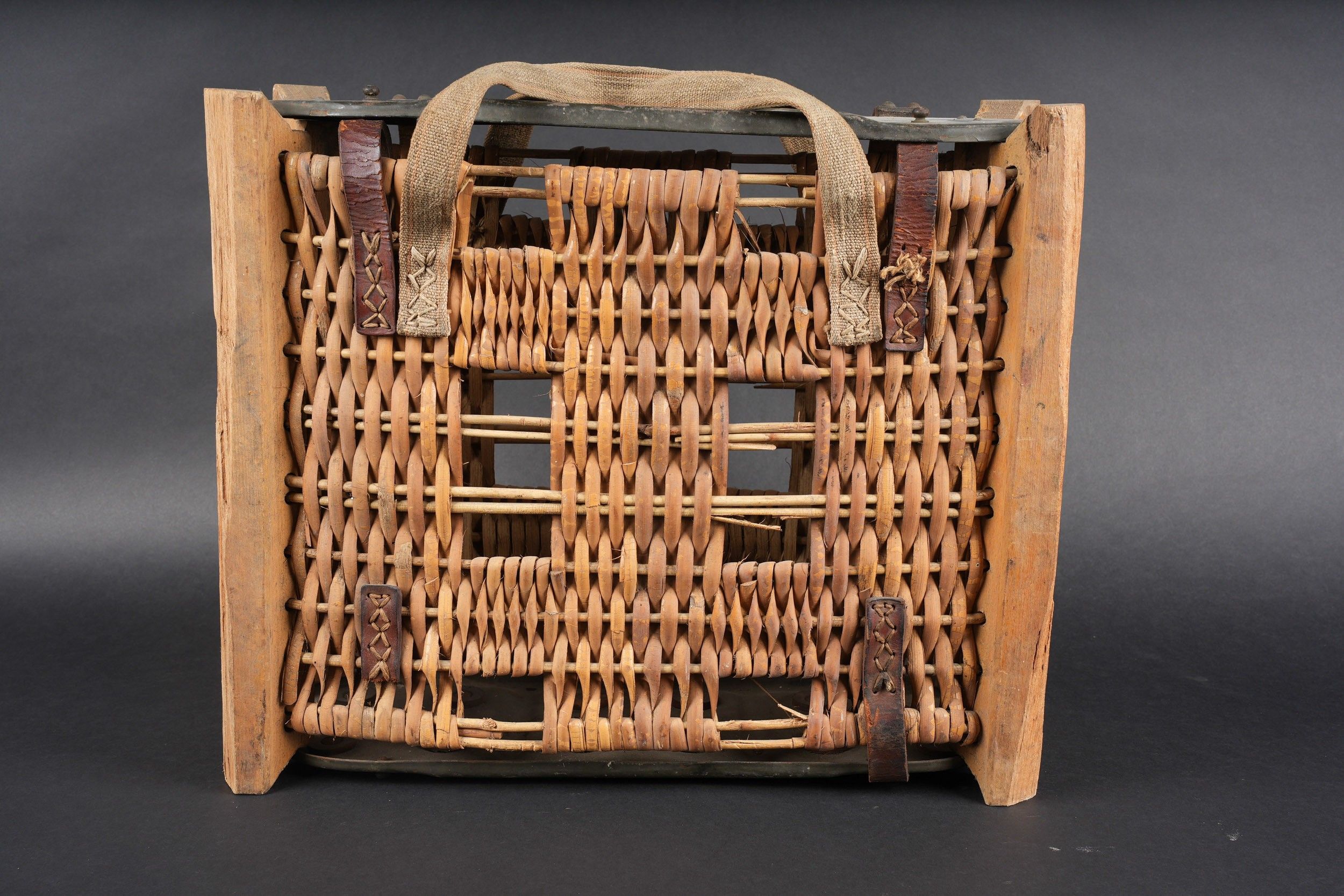 Wicker basket for 6 x 10 cm le.F.H.18 sockets. Wood and wicker frame. The canvas carrying straps are present. Wooden base and lid. The internal racks are present. The wooden frame on the sides is incomplete. The leather straps are complete. 80% Feldgrau paintwork. Lid marked RO 1939 with Waa eagle. Some wear and patina. Condition II+. Wicker basket for six 10 cm le.F.H.18 shell cases with wooden and wicker frame. Canvas carrying straps intact. Wooden bottom and lid. Internal racks present but partial wooden side structure. Leather straps complete. 80% of original Feldgrau paint. Lid marked RO 1939 with Waa eagle. Some wear and patina on the piece. Condition II+