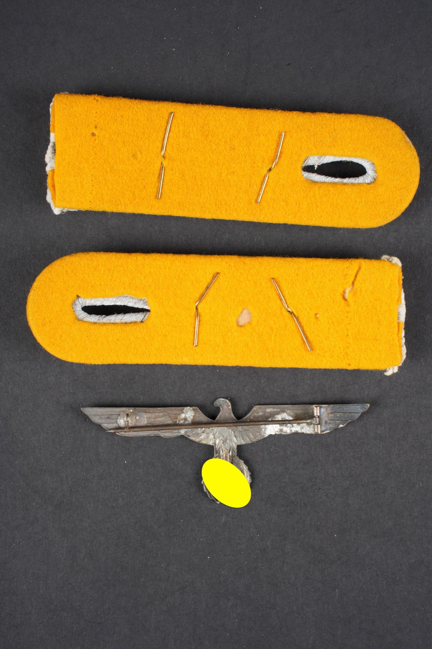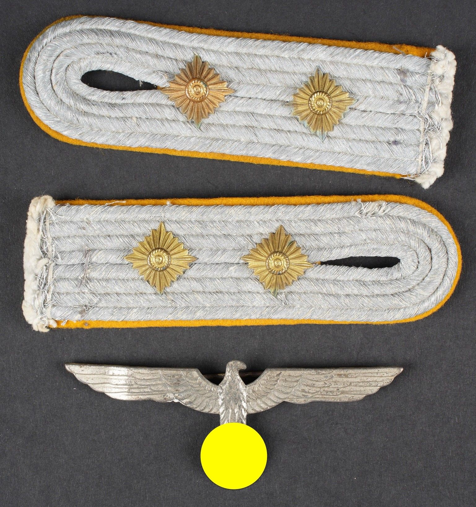 Cavalry officer badges. Comprising a homogeneous pair of Hauptmann shoulder tabs, Cavalry yellow gold piping. A silver-coloured metal chest eagle for summer dress, complete attachment, no visible markings. Some wear and patina. Condition II+. Cavalry officer insignia set including a matching pair of Hauptmann shoulder boards with golden-yellow cavalry piping and a metal breast eagle for summer tunic in silver colour with complete attachment and no visible markings. Some wear and patina on the pieces. Condition II+