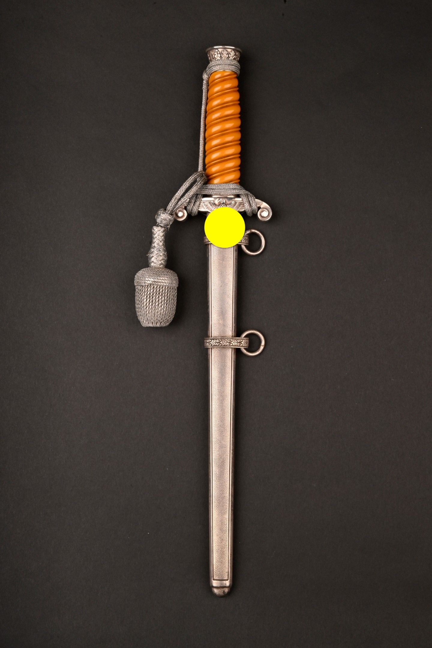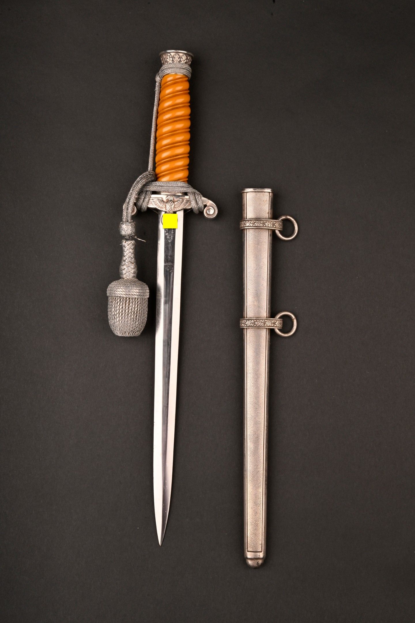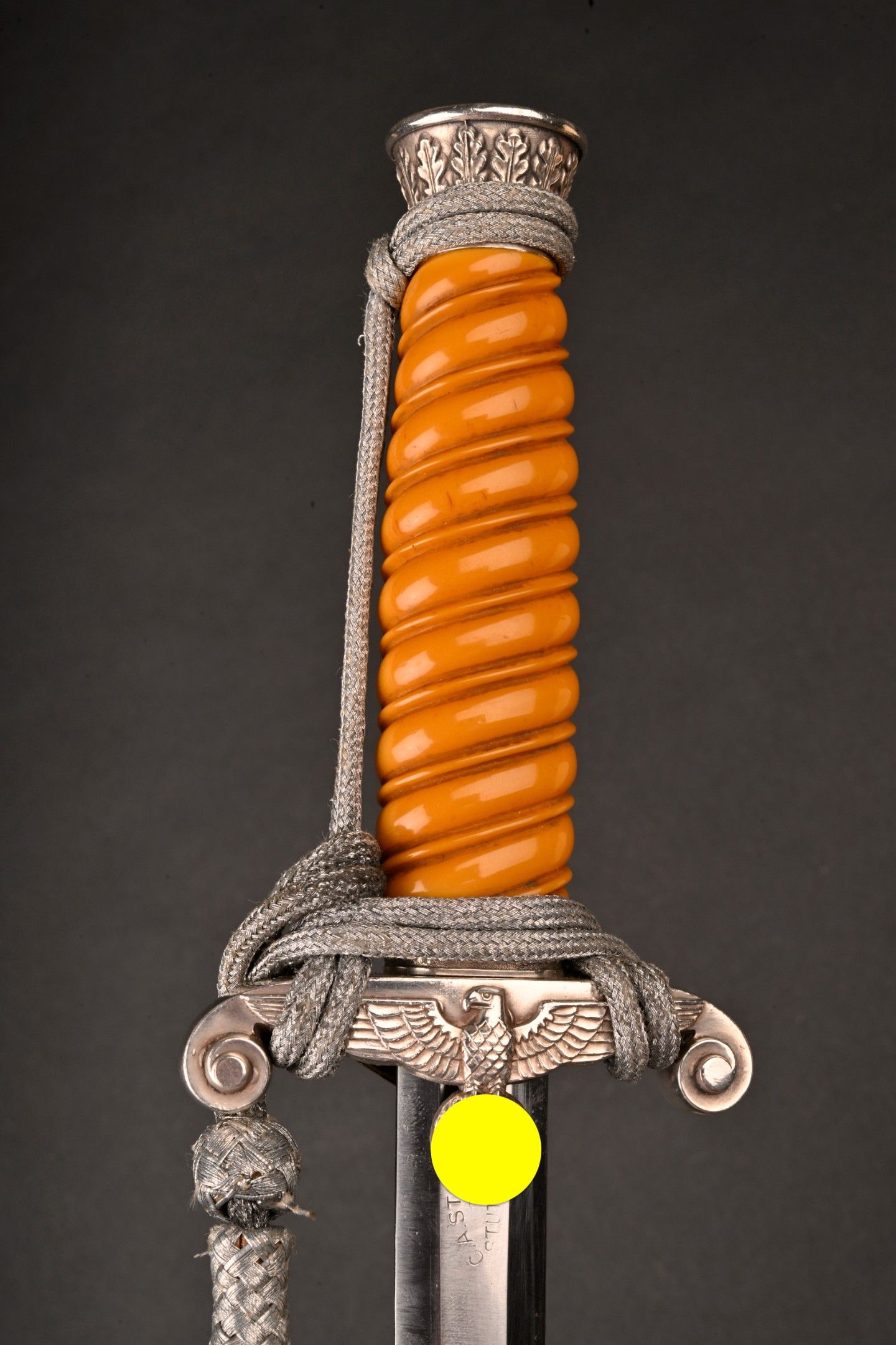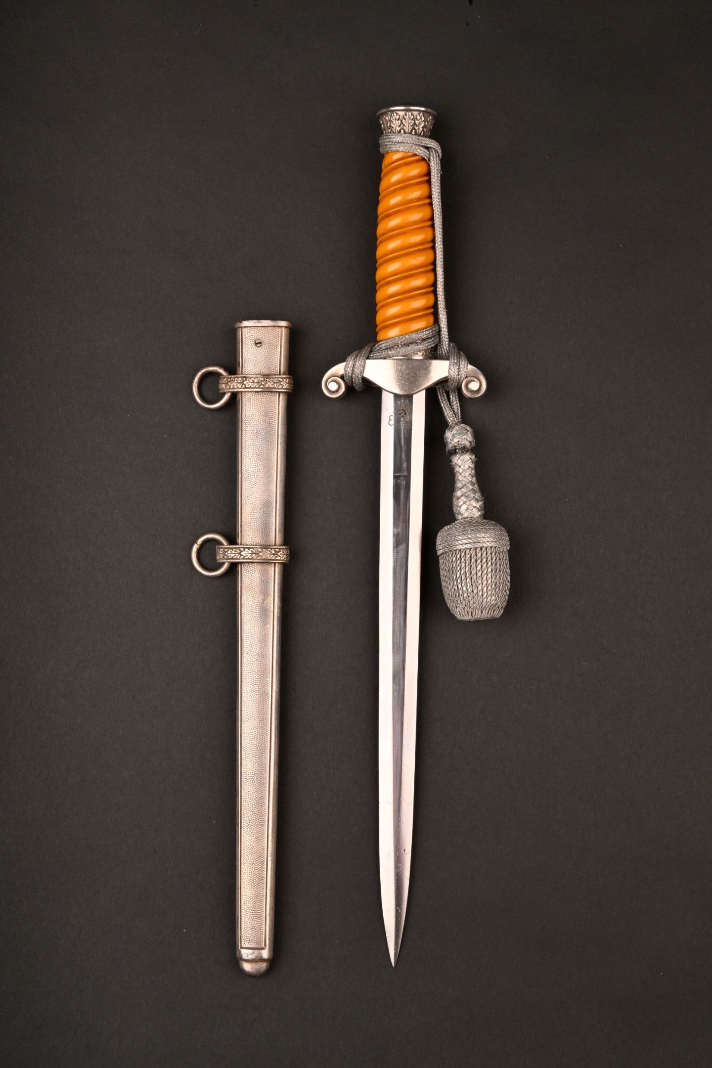 Heer officer's dagger, model 1935 Carl Eickhorn. Manufacturers sell their daggers directly from their own factory outlets or through specialist military retailers. In this case, distributors can have their name embossed on the heel of the blade, on the side opposite the manufacturer's logo. In reality, however, this is not a very common procedure, and only a handful of examples have this unique marking. This is the case for this dagger produced by Carl Eickhorn, which was sold by C.A. Staehle in Stuttgart, as indicated by the marking on the obverse of the blade. The spindle is a beautiful yellow-orange colour and the handle fittings are in cast brass covered with high-quality silver plating, as is the case with early makers. A small piece of leather is fitted under the hilt to seal the scabbard and cushion the impact when the blade is inserted into the scabbard. The blade is in fine condition and bears the maker's mark of Carl Eickhorn on the reverse, one of two types used from 1935 to 1941. The scabbard is made of silver-plated steel as it was when this model was first produced. The dagger is fitted with its regulation strap. A fine Heer dagger whose distributor's markings make it a rare item. Heer officer dagger model 1935 by Carl Eickhorn. Sold through distributor C.A. Staehle Stuttgart, whose name is stamped on the blade's obverse opposite the manufacturer logo. Amber-colored grip in excellent condition. Fittings in cast brass with quality silver plating typical of early production. Small leather buffer under the crossguard ensures scabbard seal and shock absorption. Blade in very good condition with early-style Eickhorn squirrel logo used between 1935 and 1941. Nickel-plated steel scabbard from early production. Complete with regulation portepee. Rare distributor marking makes this a desirable piece.