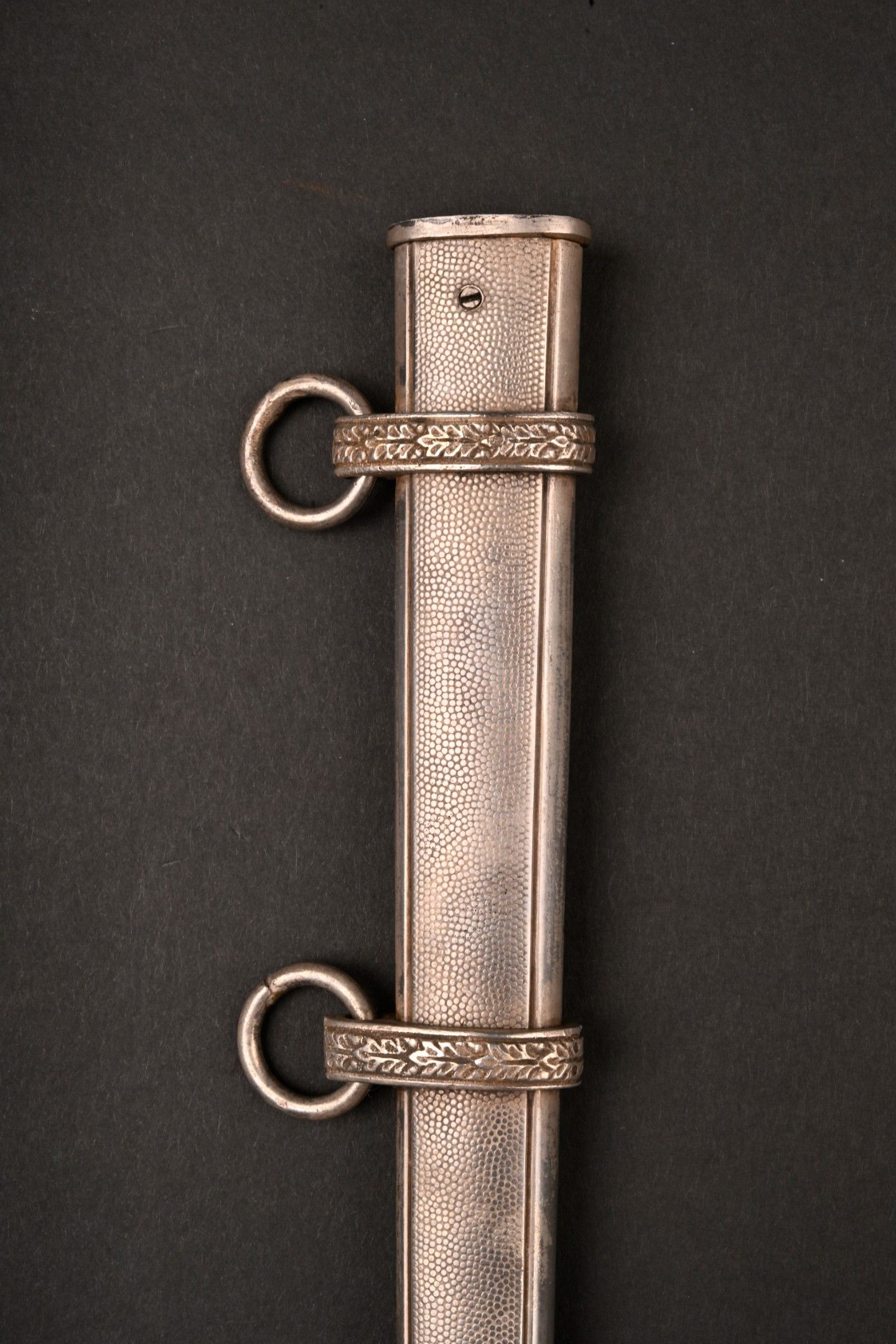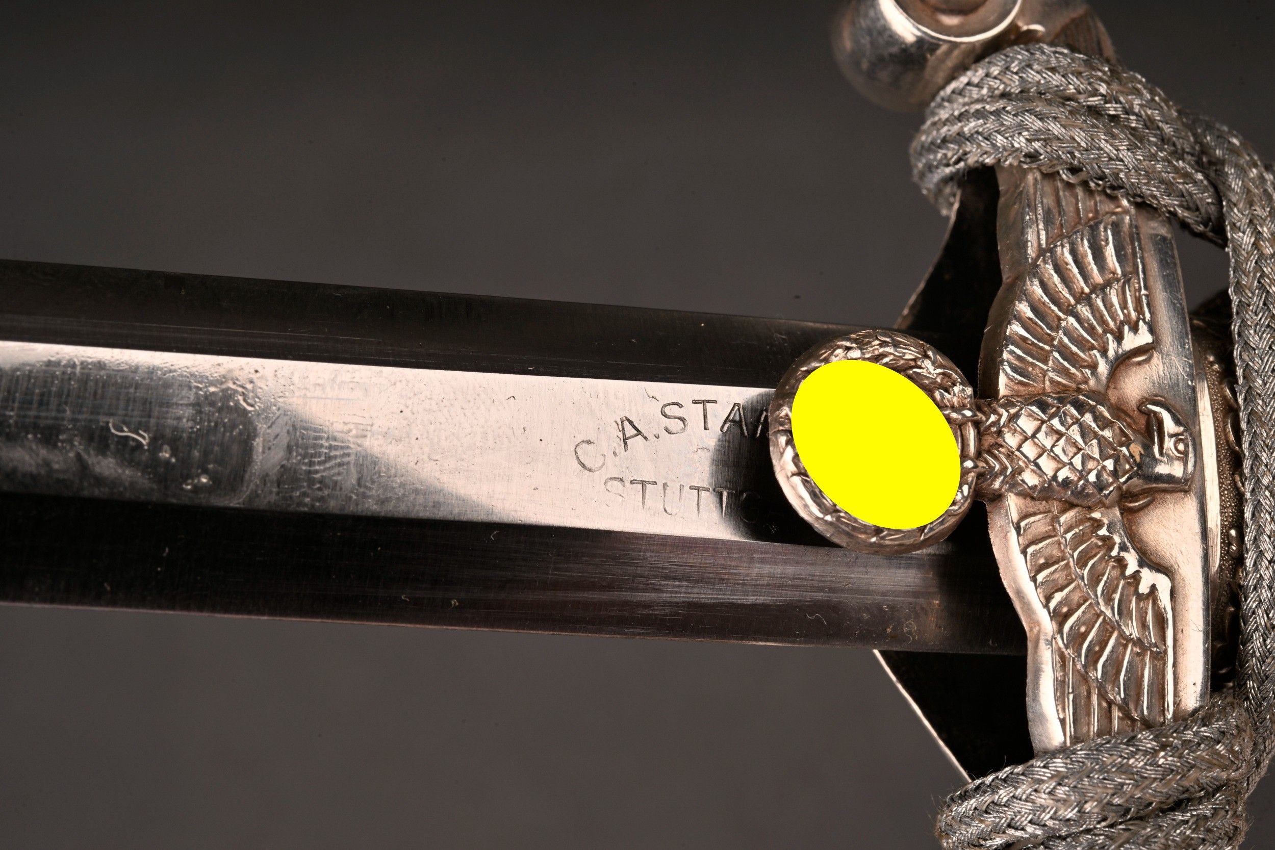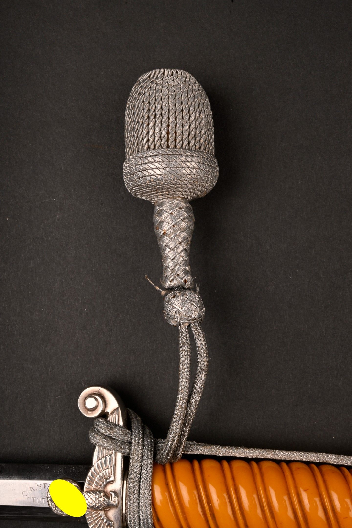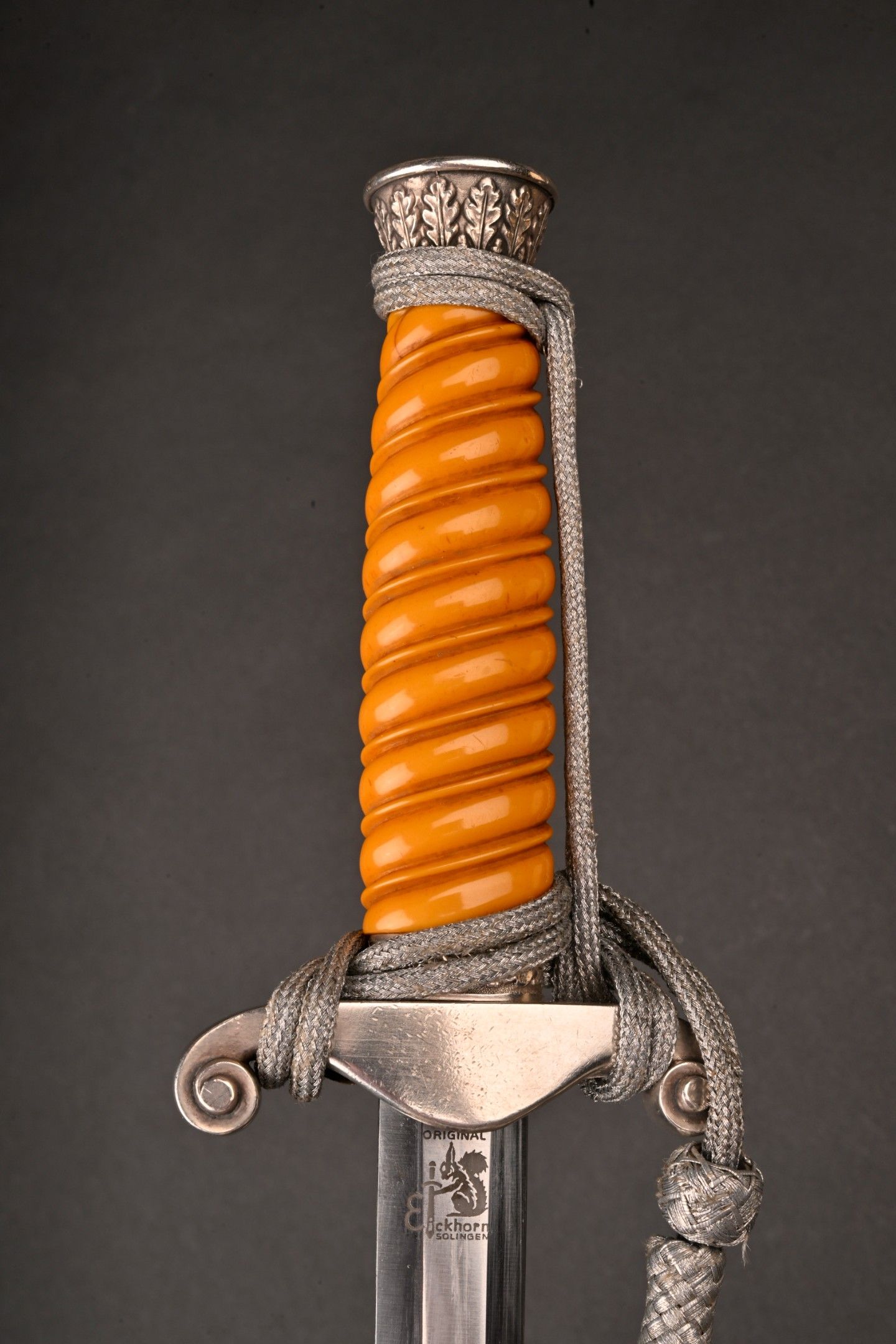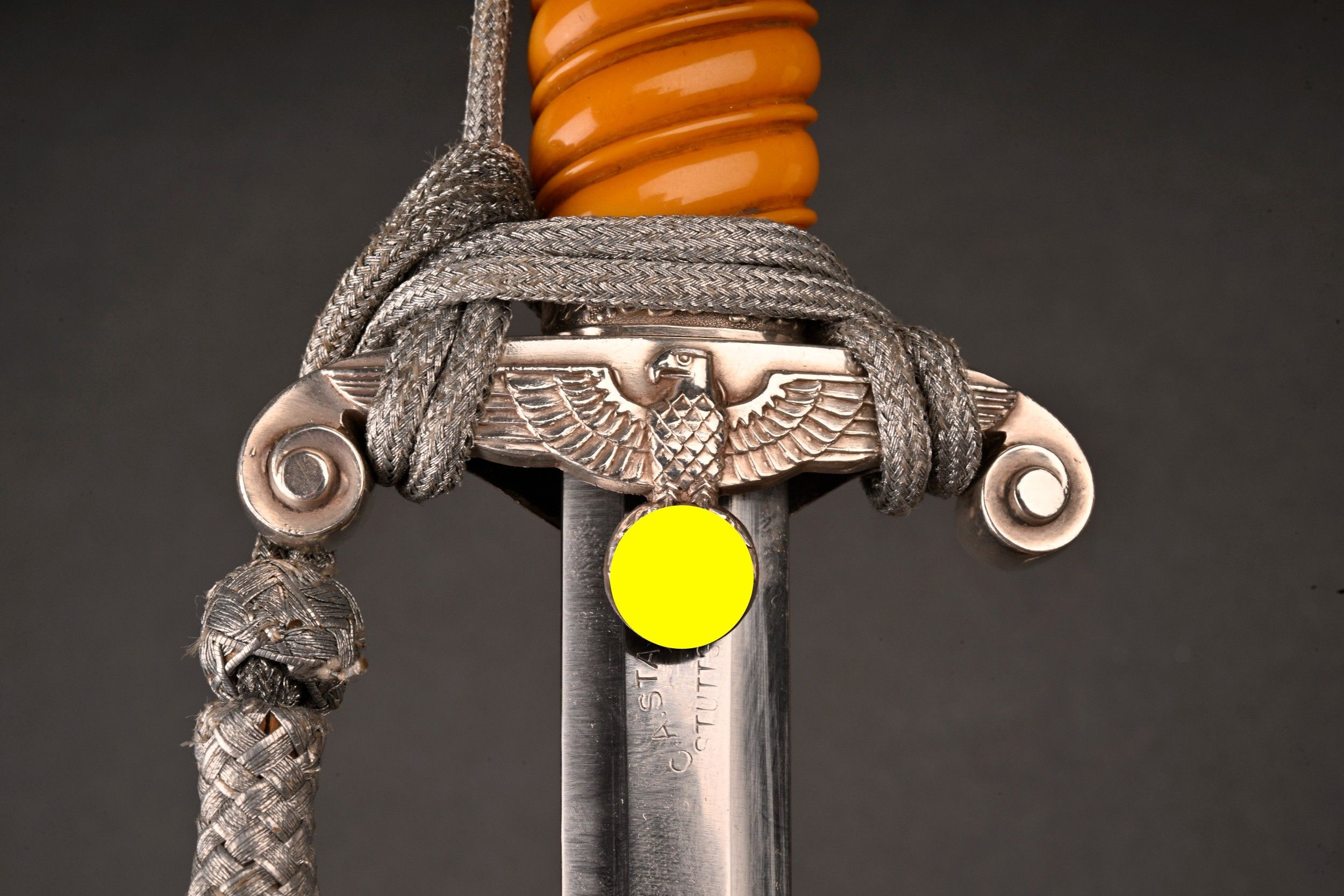 Heer officer's dagger, model 1935 Carl Eickhorn. Manufacturers sell their daggers directly from their own factory outlets or through specialist military retailers. In this case, distributors can have their name embossed on the heel of the blade, on the side opposite the manufacturer's logo. In reality, however, this is not a very common procedure, and only a handful of examples have this unique marking. This is the case for this dagger produced by Carl Eickhorn, which was sold by C.A. Staehle in Stuttgart, as indicated by the marking on the obverse of the blade. The spindle is a beautiful yellow-orange colour and the handle fittings are in cast brass covered with high-quality silver plating, as is the case with early makers. A small piece of leather is fitted under the hilt to seal the scabbard and cushion the impact when the blade is inserted into the scabbard. The blade is in fine condition and bears the maker's mark of Carl Eickhorn on the reverse, one of two types used from 1935 to 1941. The scabbard is made of silver-plated steel as it was when this model was first produced. The dagger is fitted with its regulation strap. A fine Heer dagger whose distributor's markings make it a rare item. Heer officer dagger model 1935 by Carl Eickhorn. Sold through distributor C.A. Staehle Stuttgart, whose name is stamped on the blade's obverse opposite the manufacturer logo. Amber-colored grip in excellent condition. Fittings in cast brass with quality silver plating typical of early production. Small leather buffer under the crossguard ensures scabbard seal and shock absorption. Blade in very good condition with early-style Eickhorn squirrel logo used between 1935 and 1941. Nickel-plated steel scabbard from early production. Complete with regulation portepee. Rare distributor marking makes this a desirable piece.