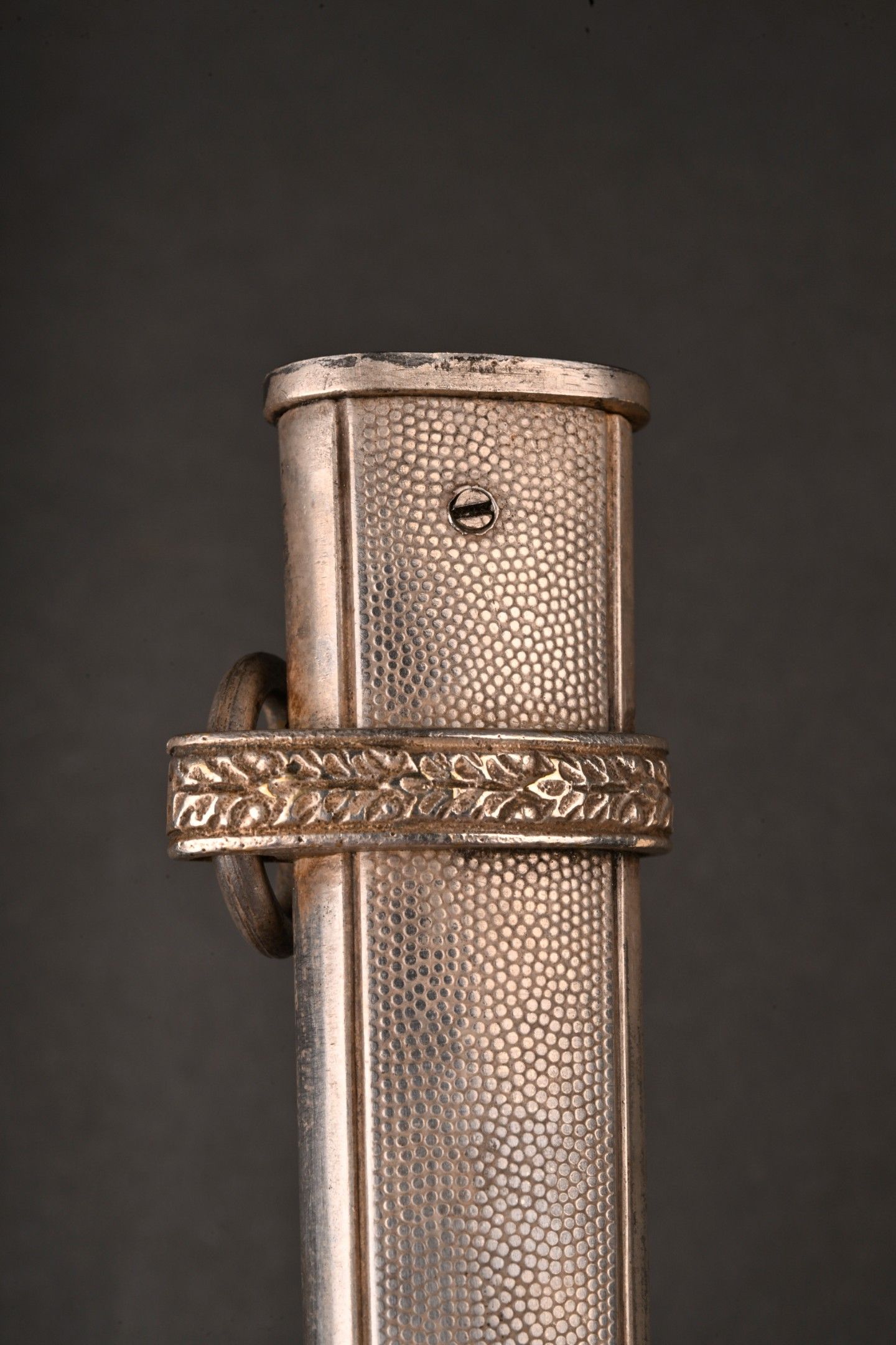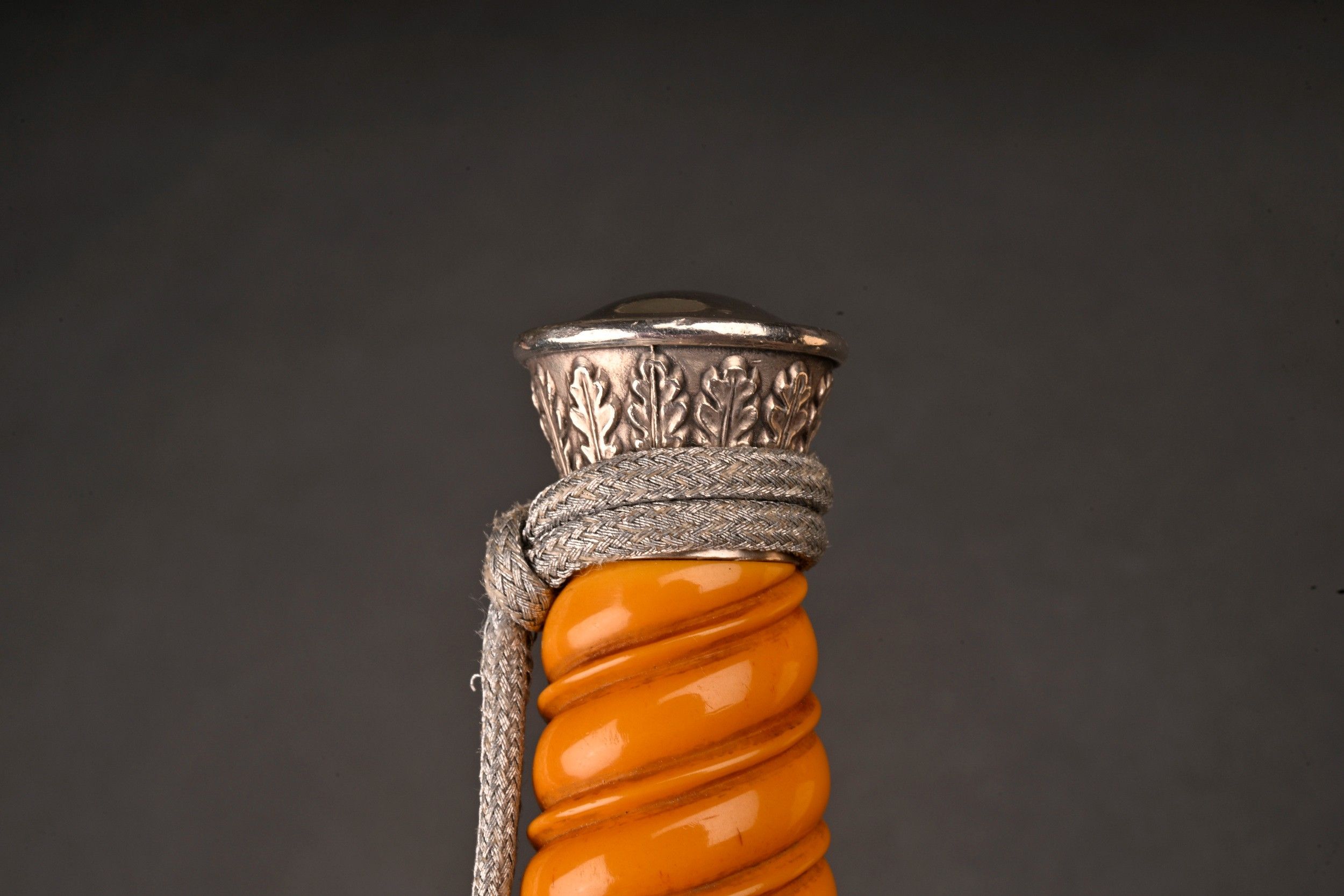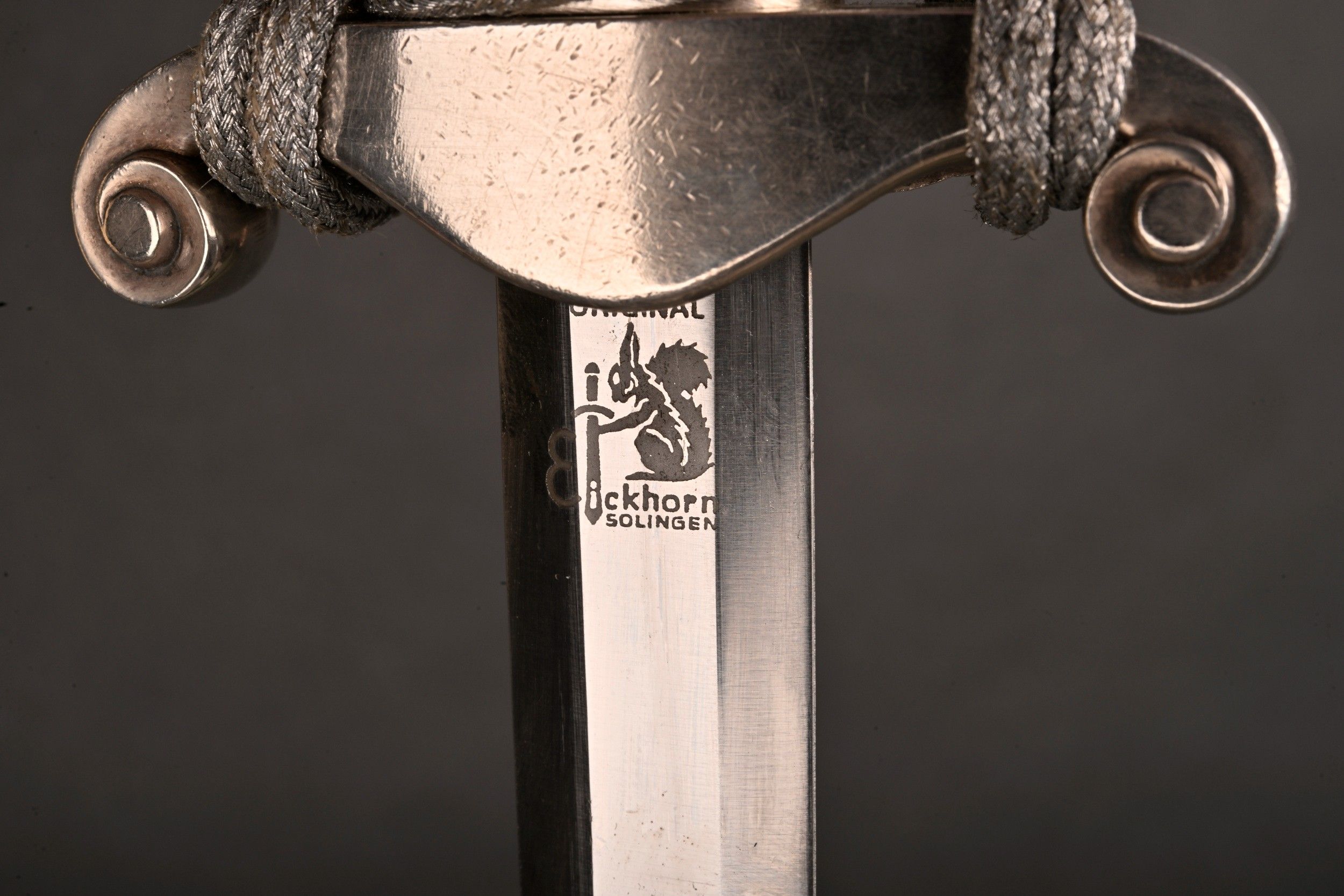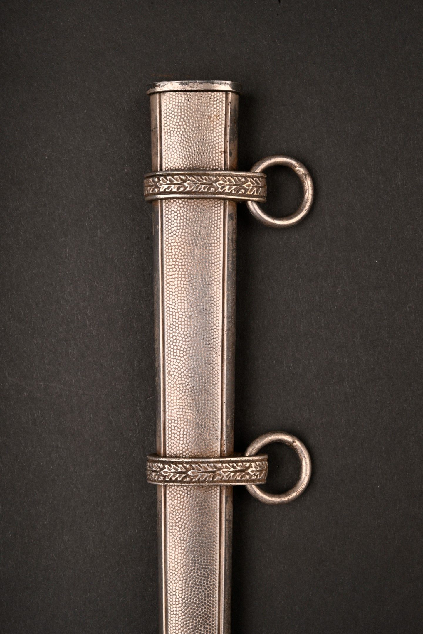Heer officer's dagger, model 1935 Carl Eickhorn. Manufacturers sell their daggers directly from their own factory outlets or through specialist military retailers. In this case, distributors can have their name embossed on the heel of the blade, on the side opposite the manufacturer's logo. In reality, however, this is not a very common procedure, and only a handful of examples have this unique marking. This is the case for this dagger produced by Carl Eickhorn, which was sold by C.A. Staehle in Stuttgart, as indicated by the marking on the obverse of the blade. The spindle is a beautiful yellow-orange colour and the handle fittings are in cast brass covered with high-quality silver plating, as is the case with early makers. A small piece of leather is fitted under the hilt to seal the scabbard and cushion the impact when the blade is inserted into the scabbard. The blade is in fine condition and bears the maker's mark of Carl Eickhorn on the reverse, one of two types used from 1935 to 1941. The scabbard is made of silver-plated steel as it was when this model was first produced. The dagger is fitted with its regulation strap. A fine Heer dagger whose distributor's markings make it a rare item. Heer officer dagger model 1935 by Carl Eickhorn. Sold through distributor C.A. Staehle Stuttgart, whose name is stamped on the blade's obverse opposite the manufacturer logo. Amber-colored grip in excellent condition. Fittings in cast brass with quality silver plating typical of early production. Small leather buffer under the crossguard ensures scabbard seal and shock absorption. Blade in very good condition with early-style Eickhorn squirrel logo used between 1935 and 1941. Nickel-plated steel scabbard from early production. Complete with regulation portepee. Rare distributor marking makes this a desirable piece.