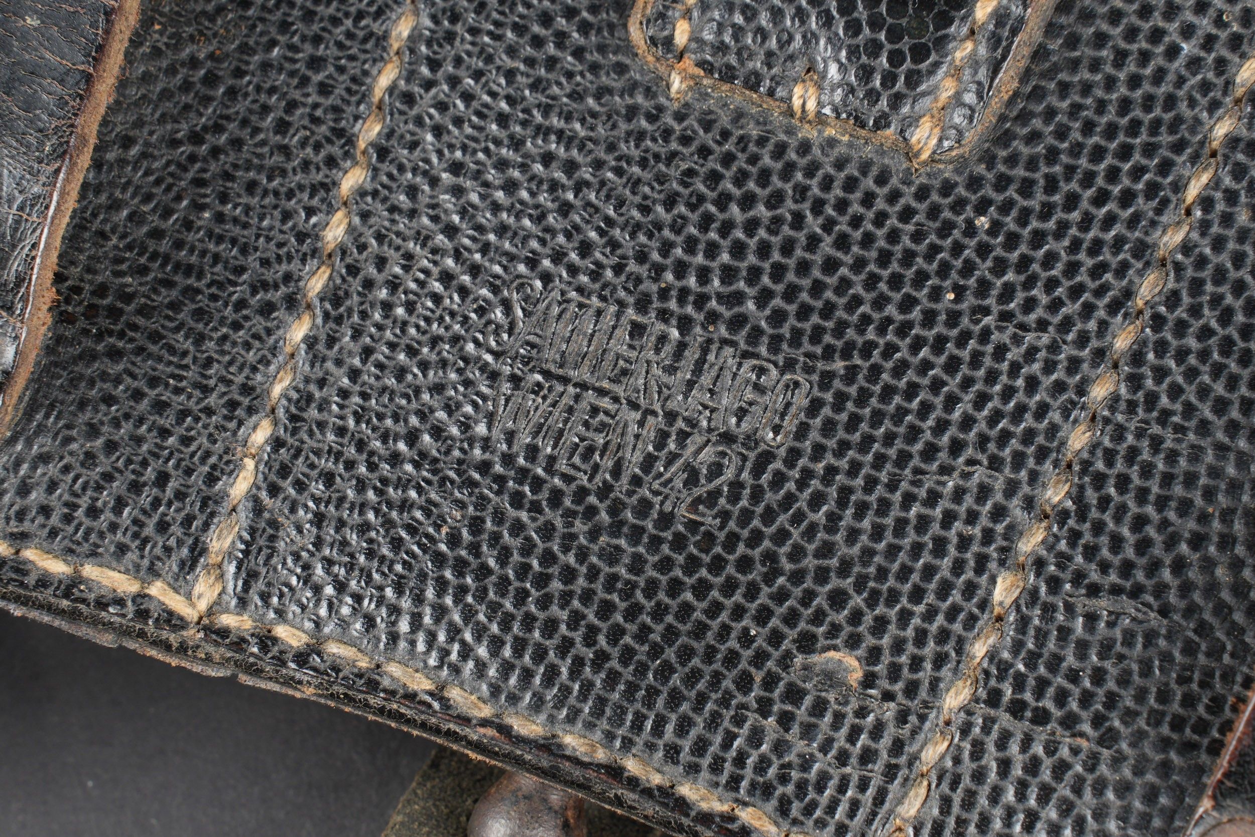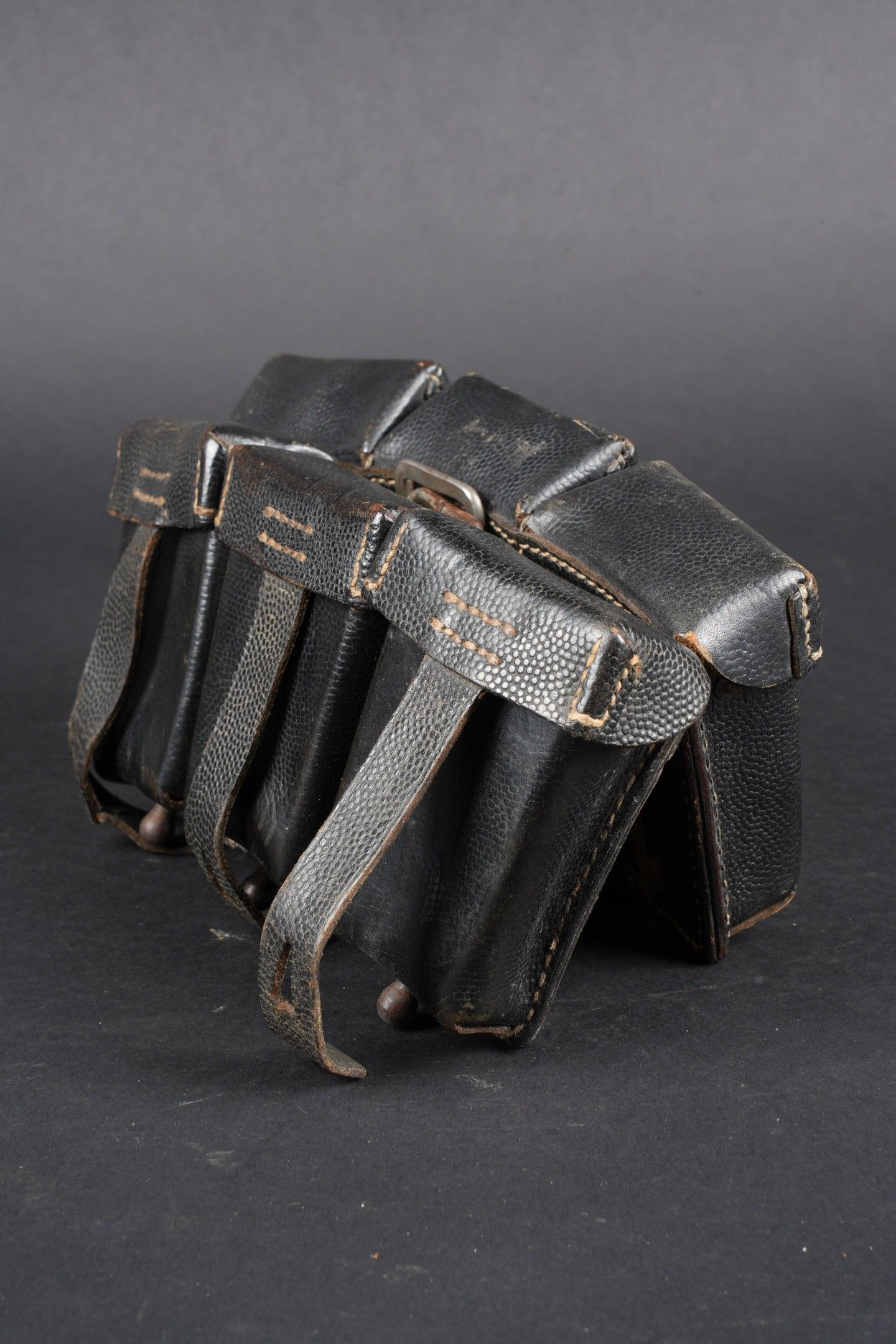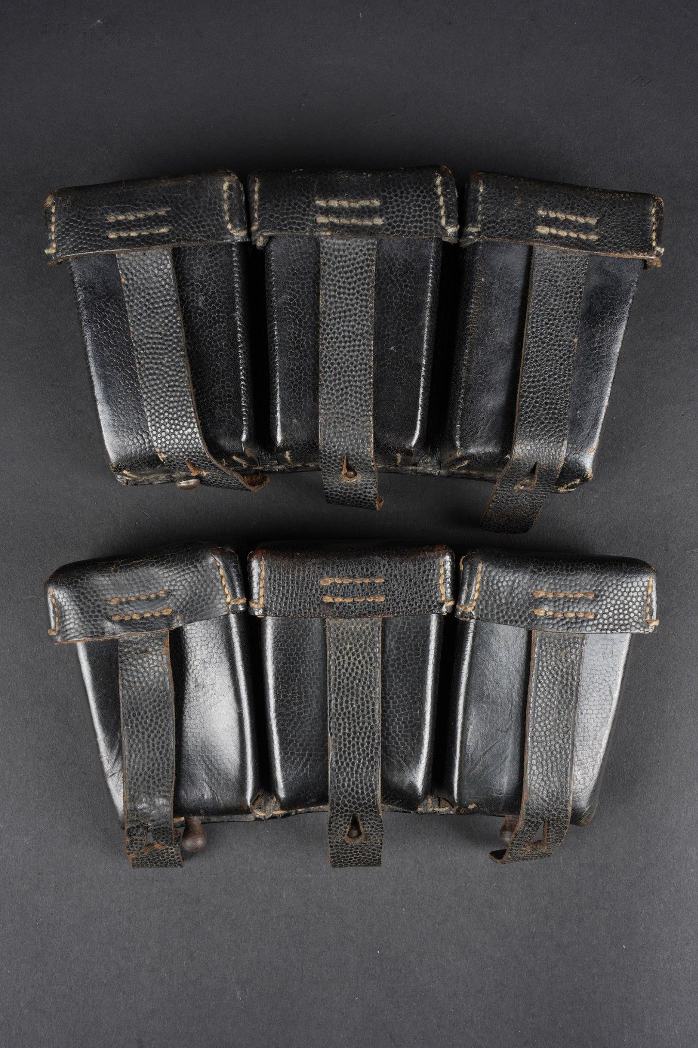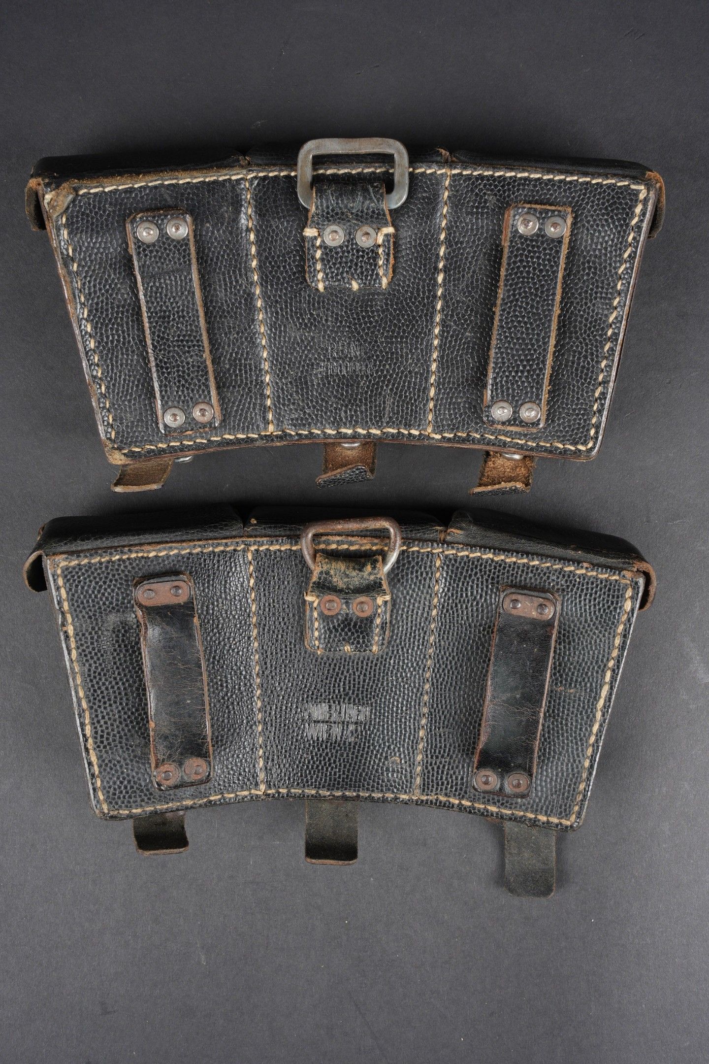 Mauser 98K cartridge belts. Inconsistent pair in black grained leather. All straps are present, only one is partially torn. The rear rings are present. Markings Sattler Lago Wien 1942, and RBNr 010000005. One flap is stamped 266. Some wear and patina to parts. Condition II+. Pair of Mauser 98K cartridge pouches, non-matching, in black pebbled leather. All straps present, one partially torn. Rear D-rings intact. Marked Sattler Lago Wien 1942 and RBNr 010000005. One flap stamped 266. Some wear and patina on the pieces. Condition II+