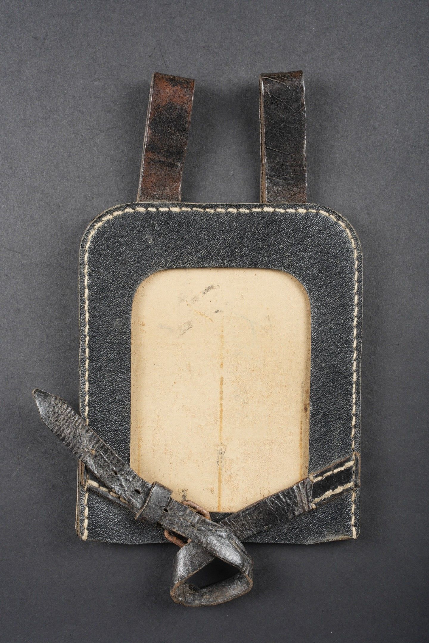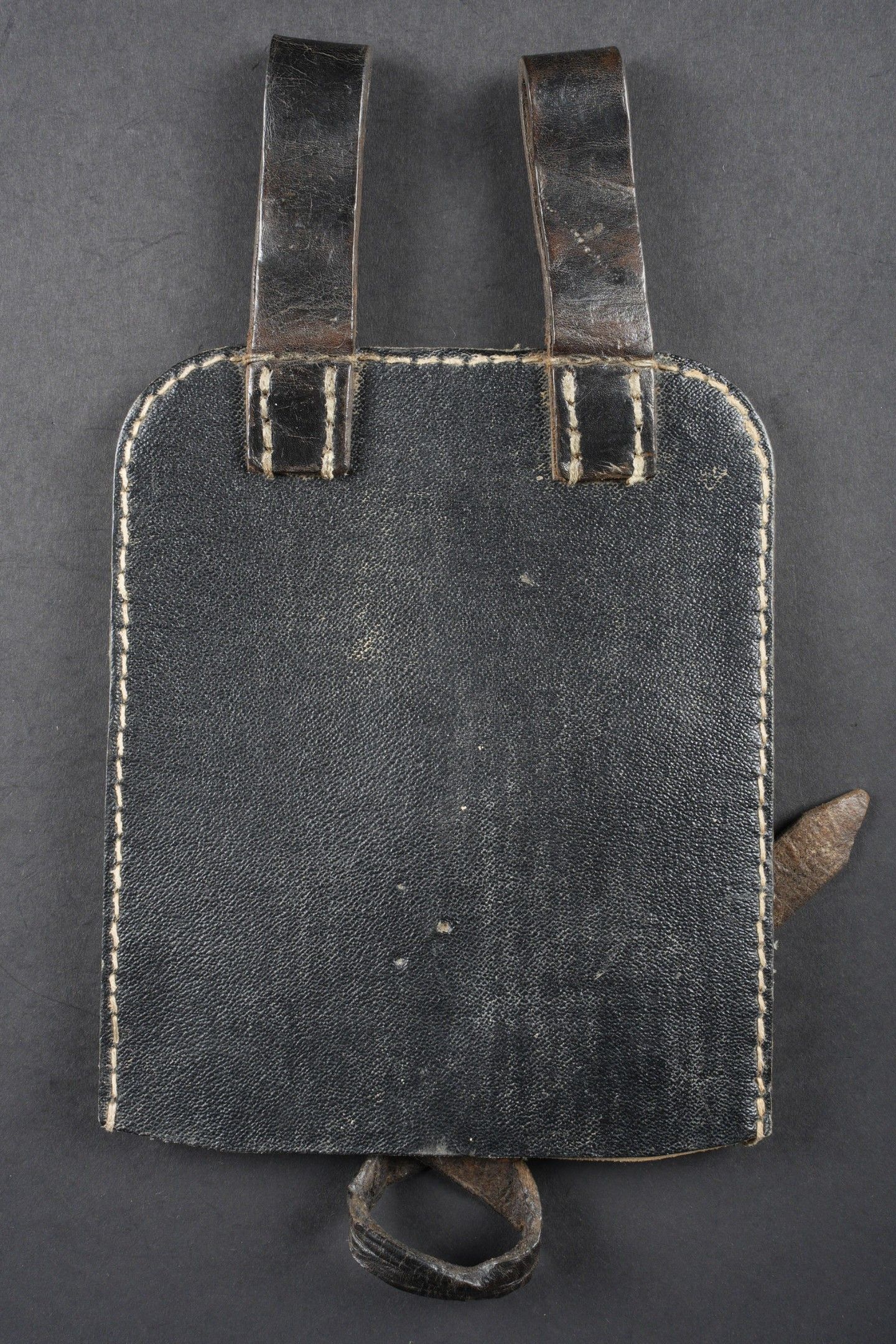 German shovel holder. Model for right shovel. Thick black leather, sandy yellow background, all straps and belt loops are present. Buckle partially oxidised. Manufacture illegible. Some wear and patina. Condition II+. German entrenching tool carrier for straight shovel. Thick black leather with sand-yellow backing. All straps and belt loops present. Metal fittings partially oxidised. Maker's mark illegible. Some wear and patina on the piece. Condition II+