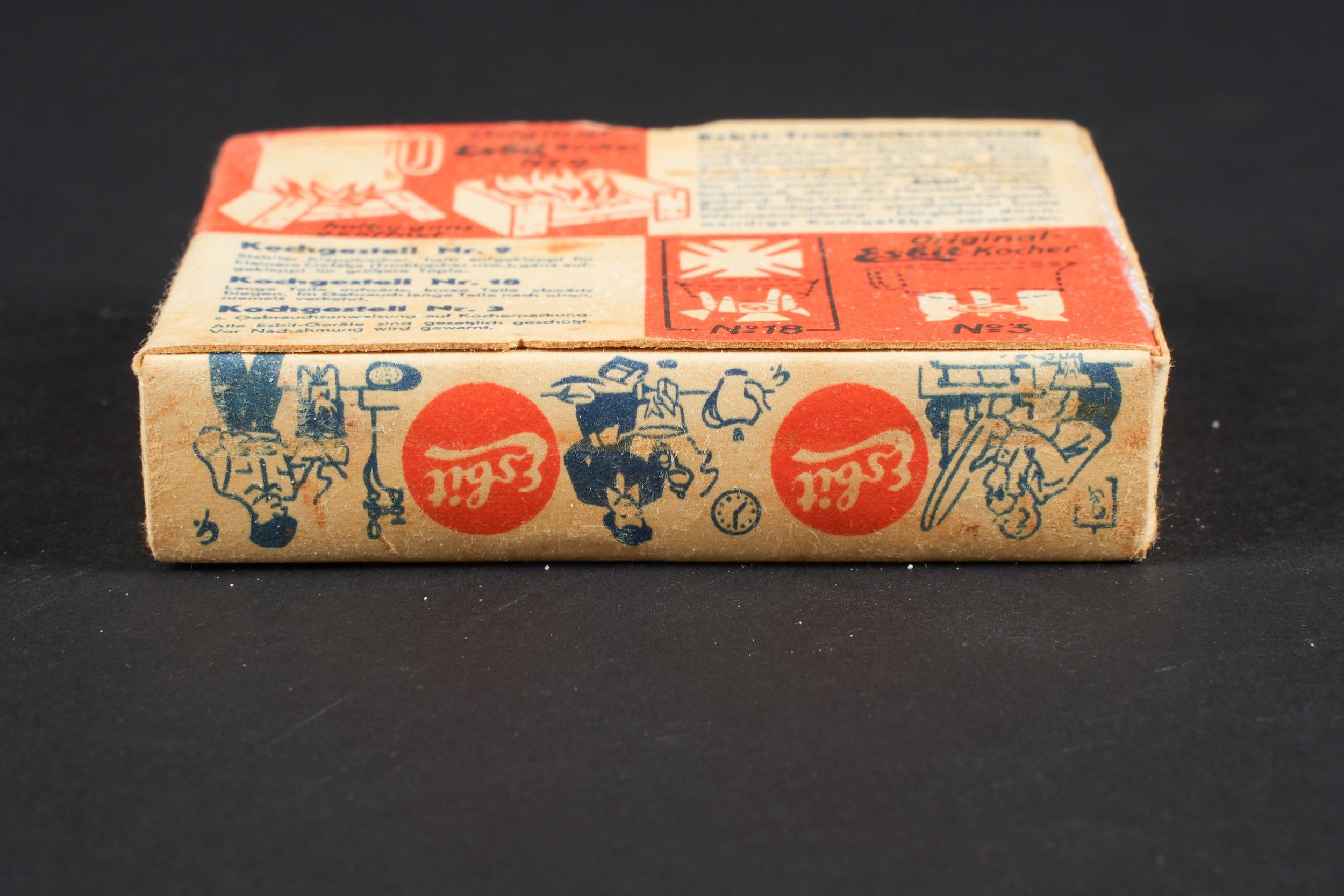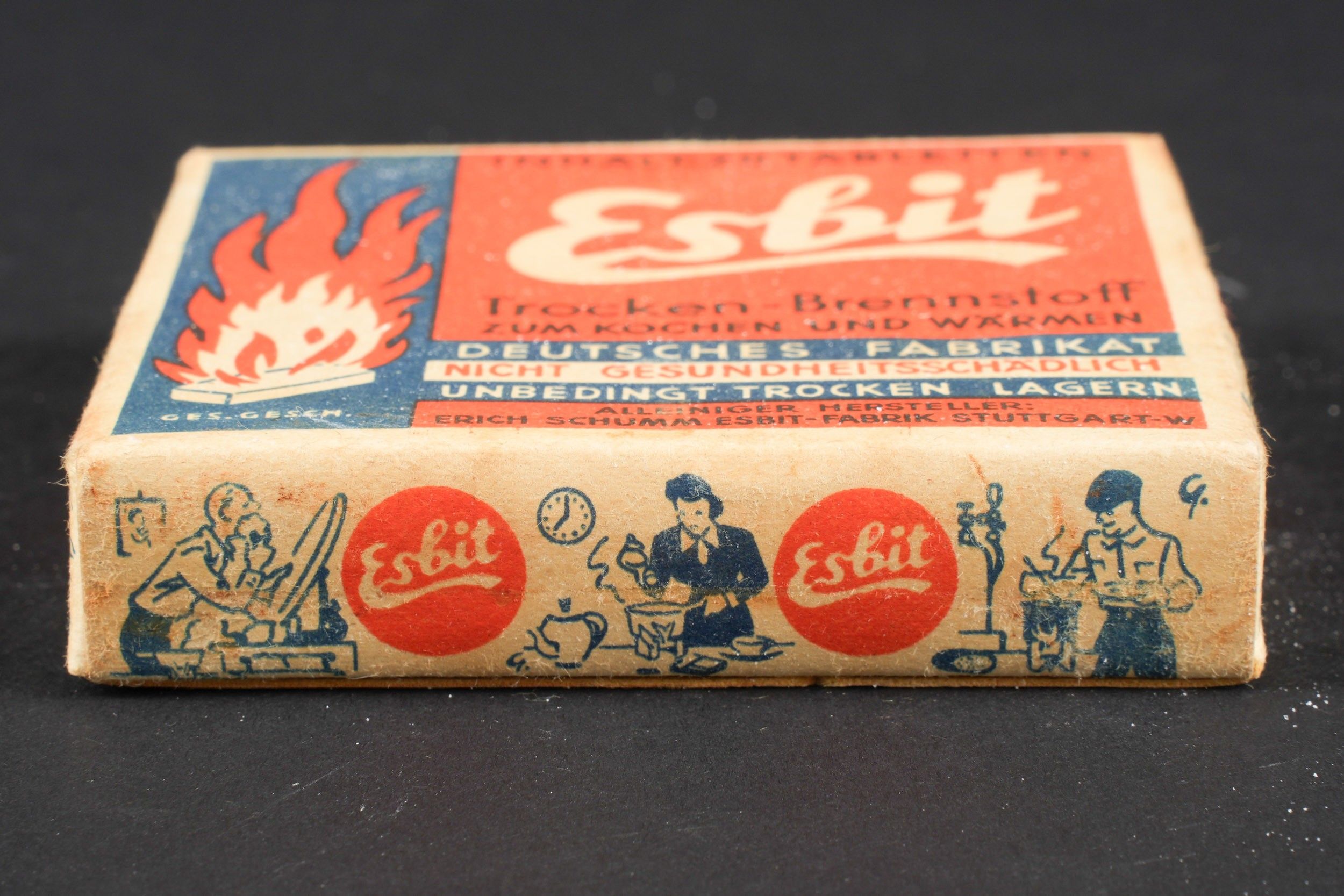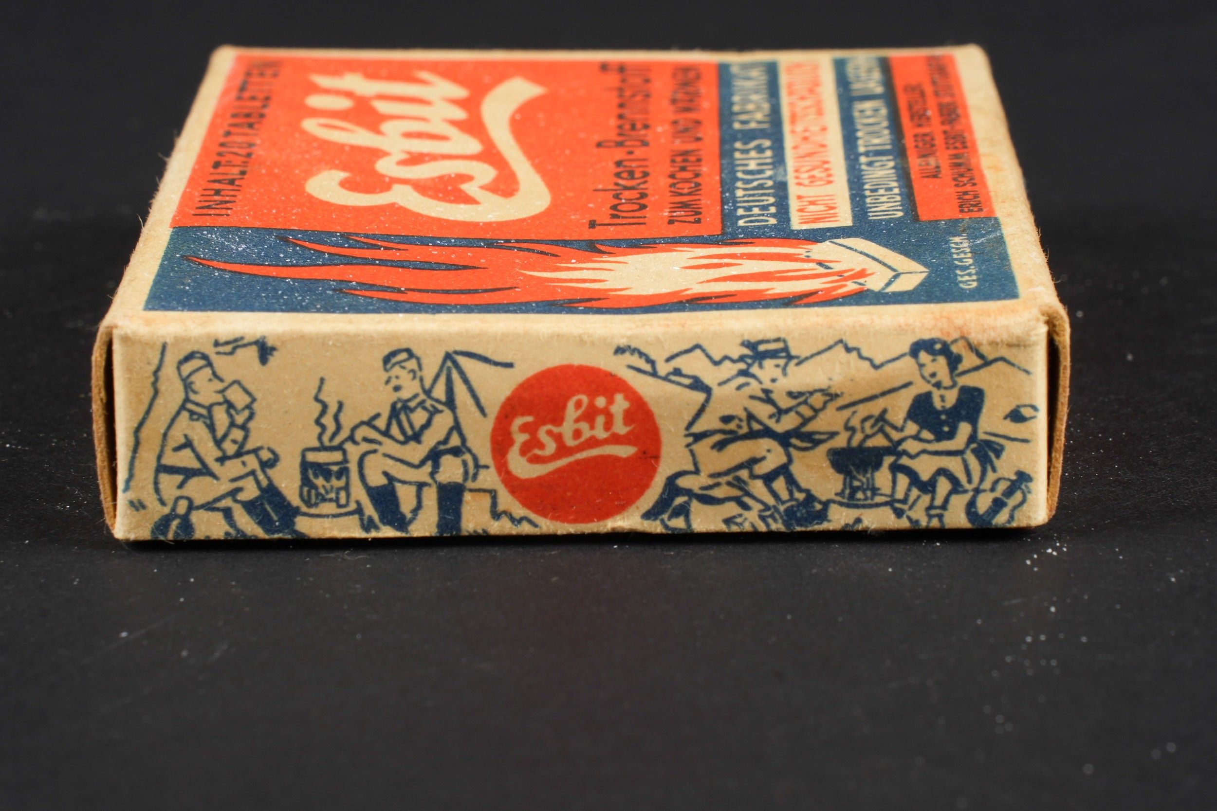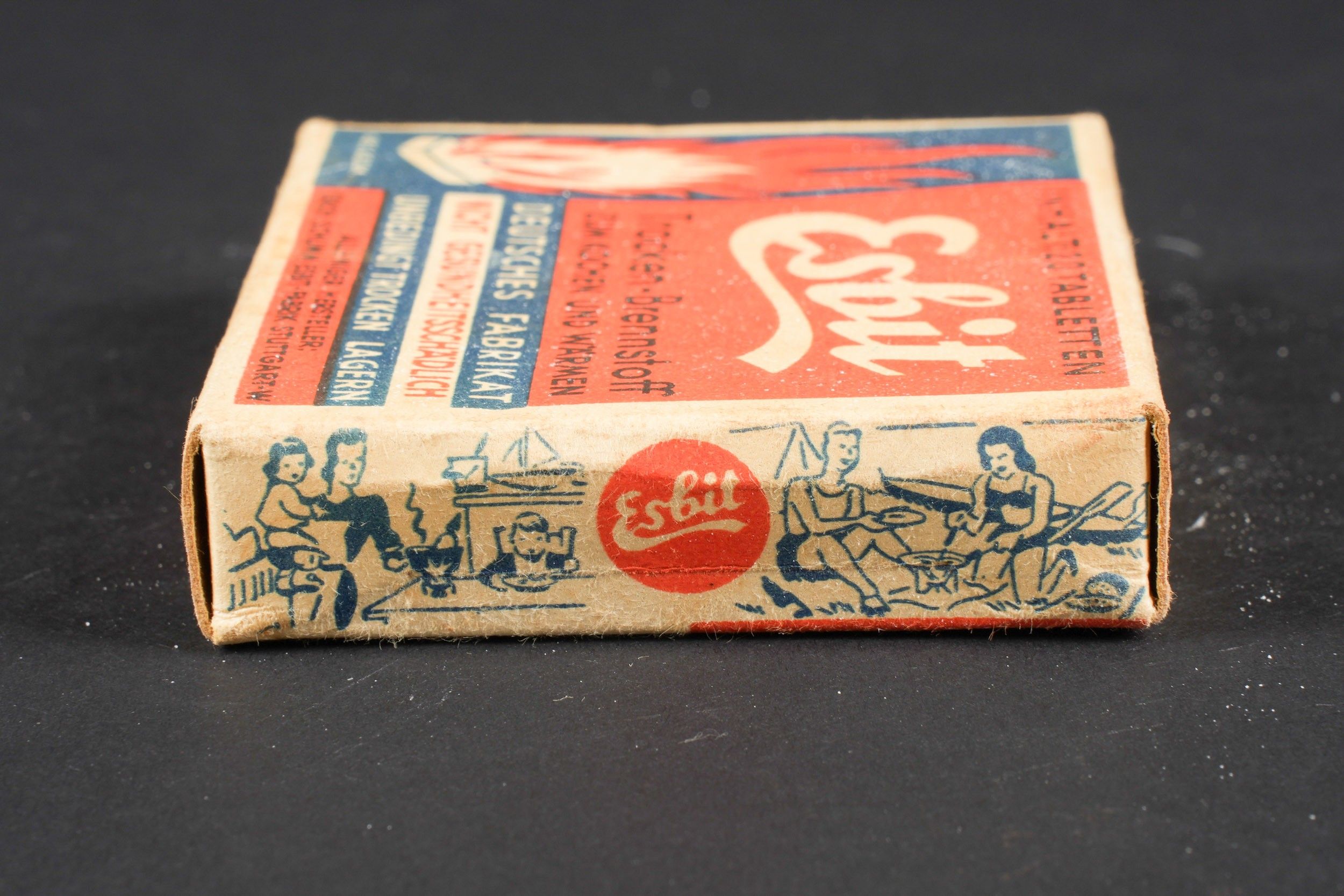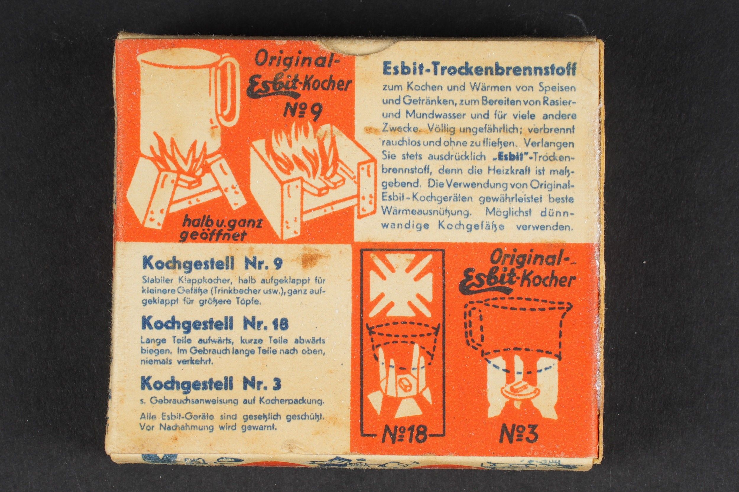 Esbit stove. Box of tablets to light the stove. In original packaging, never opened. Some wear and patina. Condition II+. Esbit stove. Box of solid fuel tablets for lighting the stove, still in original unopened packaging. Some wear and patina on the piece. Condition II+