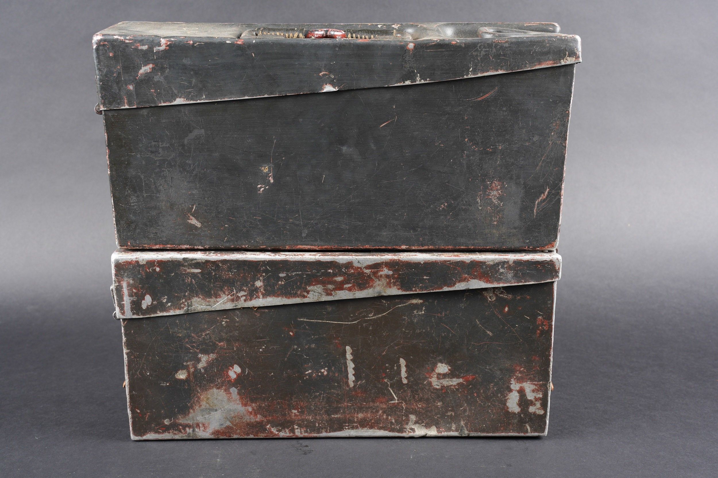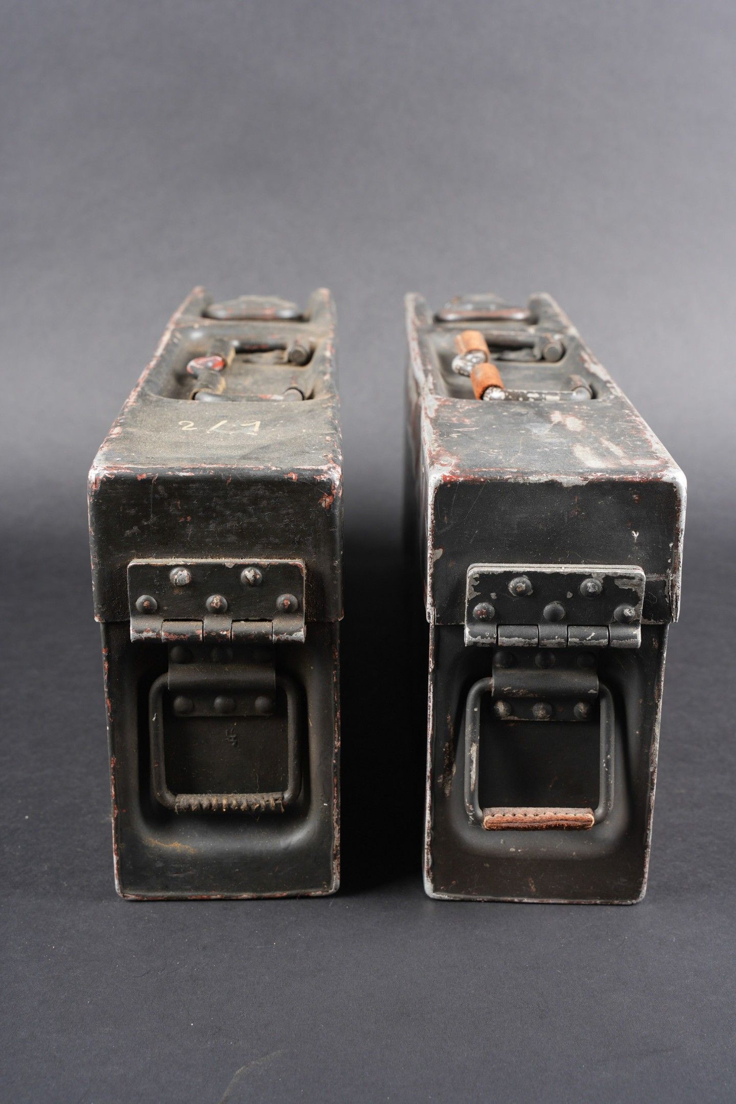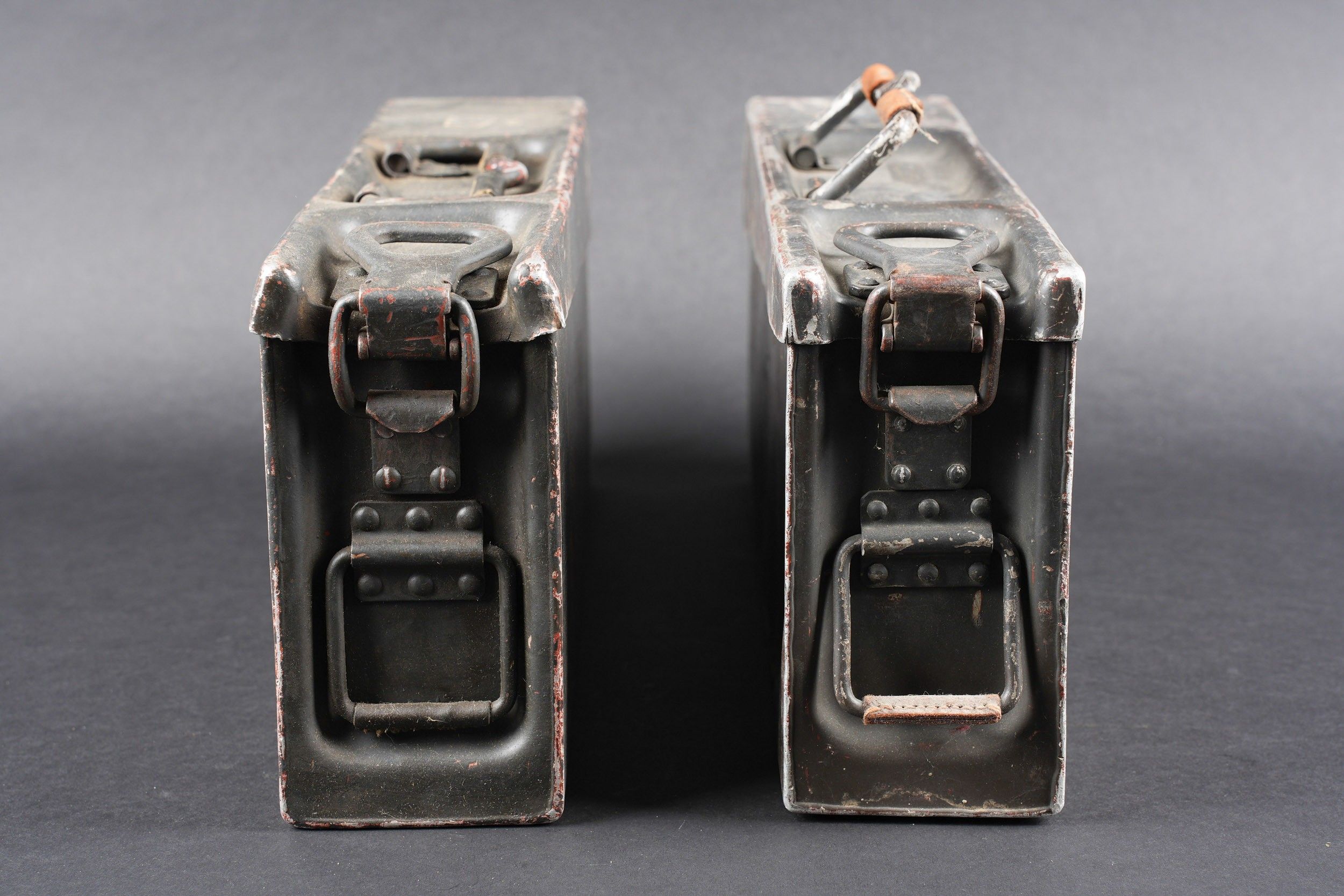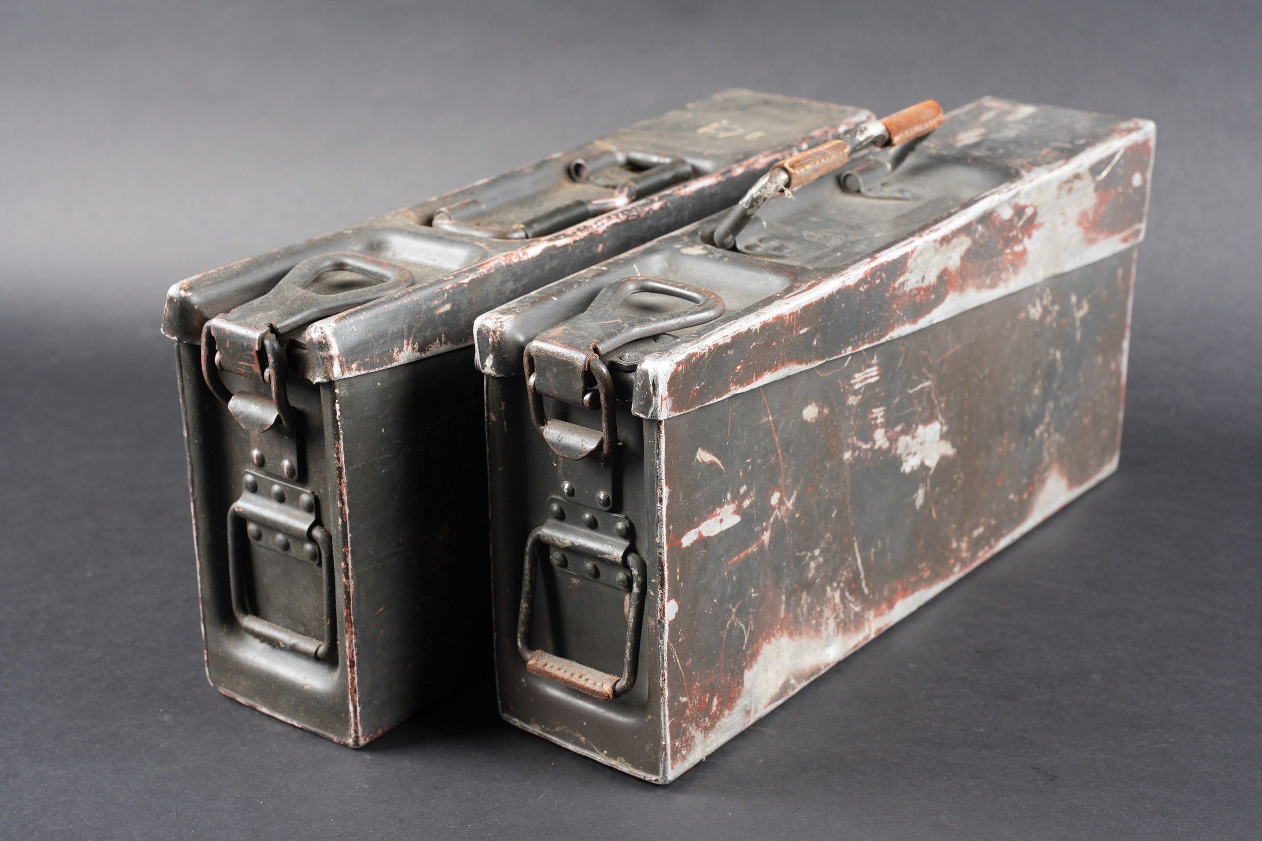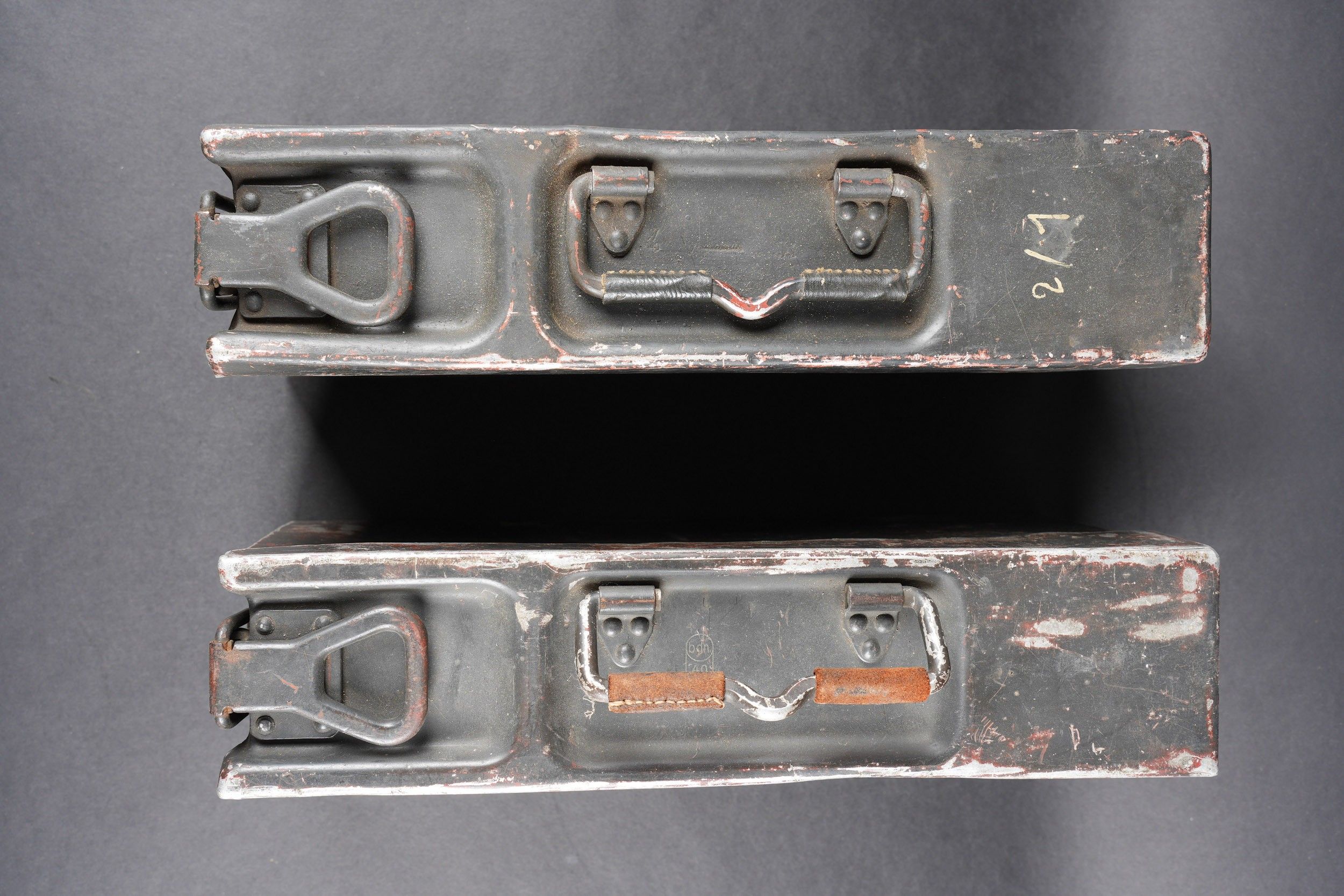 MG 3442 bodies. Comprising an MG aluminium body, 60% paintwork. The leather handle reinforcements are present. The locking hook is functional. BDN 40 manufacture, some dents visible. One aluminium case, 80% paint. Markings 21 on the lid. The handle leather reinforcements are present. The locking hook is functional. Dated 1940. Some wear and patina to parts. Condition II+. MG 3442 ammunition boxes. Includes one aluminium box retaining 60% of its paint, with leather handle reinforcements present and functional closure latch. Marked BDN 40 with a few visible dents. Another aluminium box with 80% paint, lid marked 21, leather handle reinforcements intact, and functional latch. Dated 1940. Some wear and patina on the pieces. Condition II+
