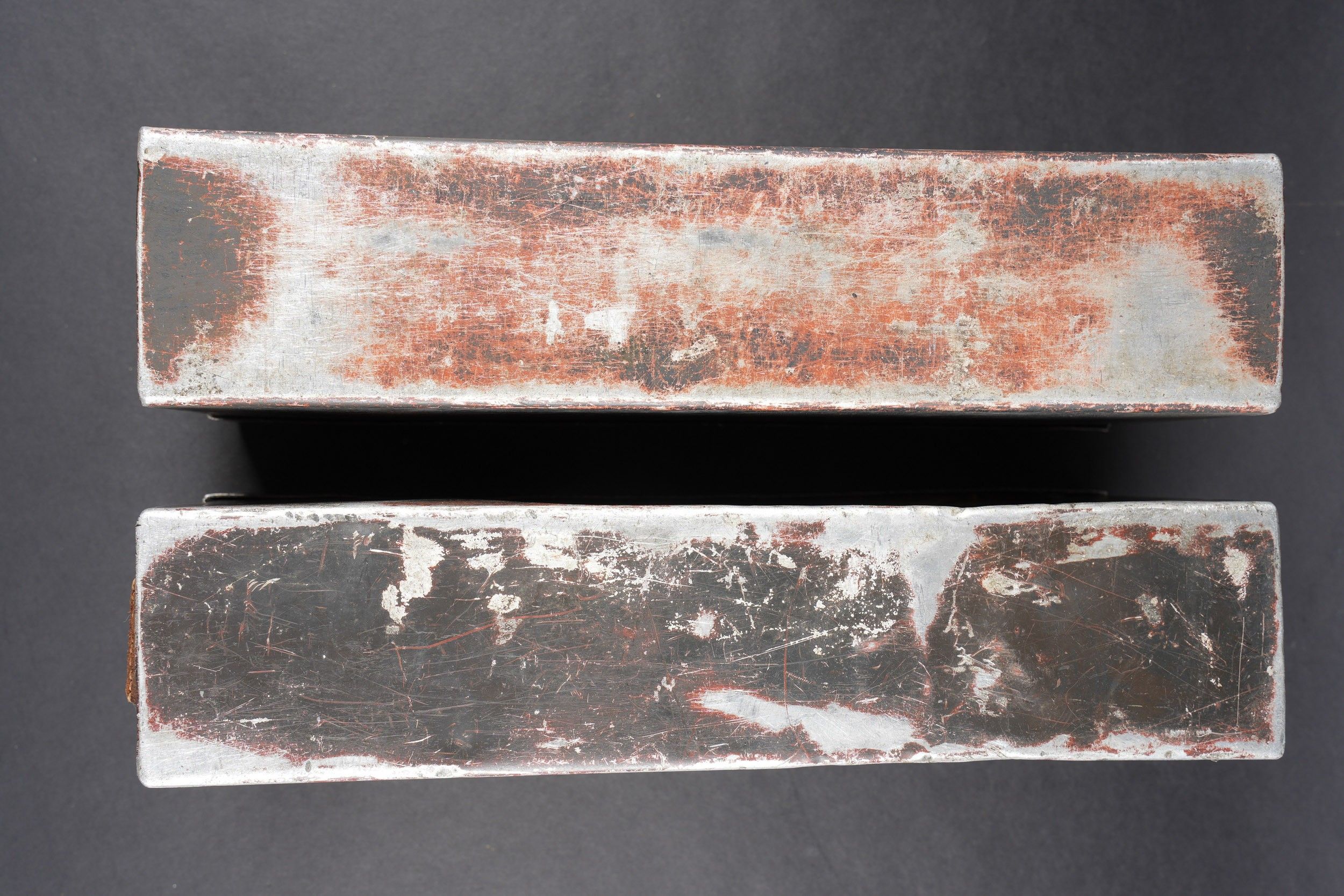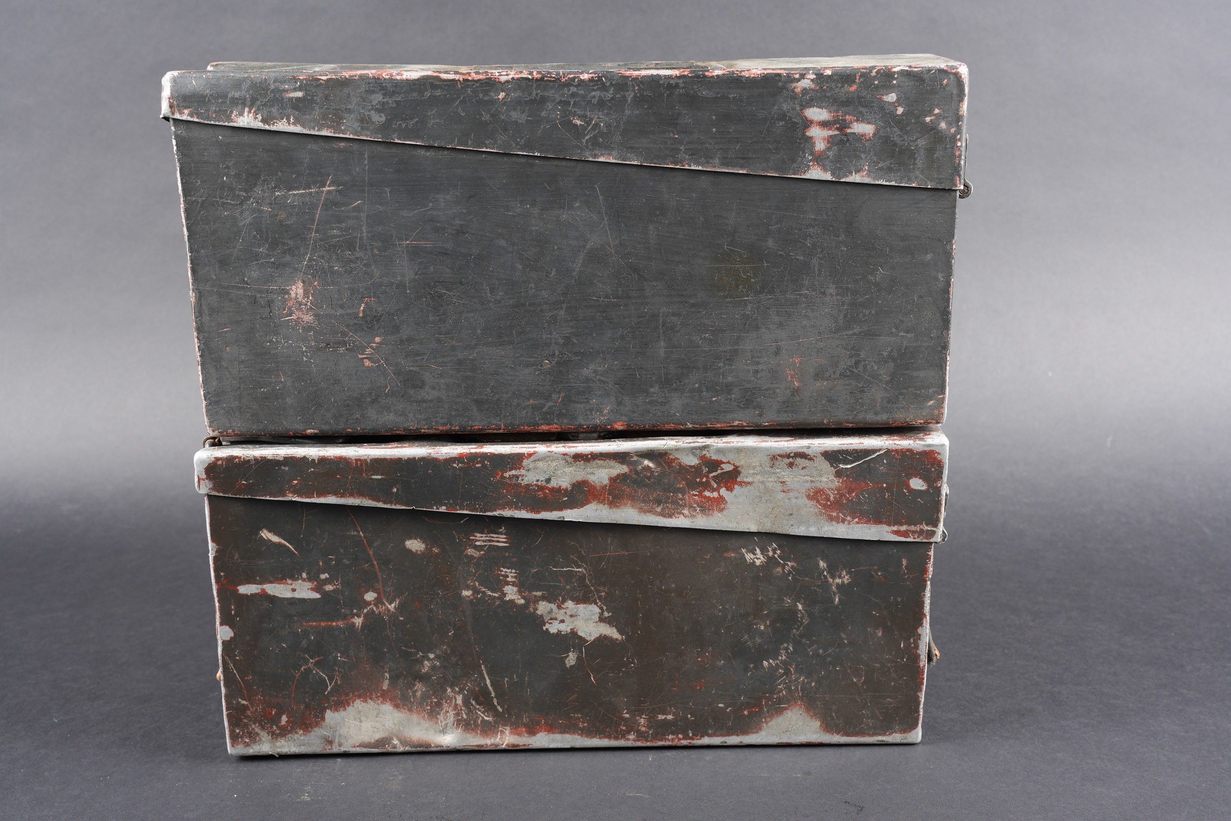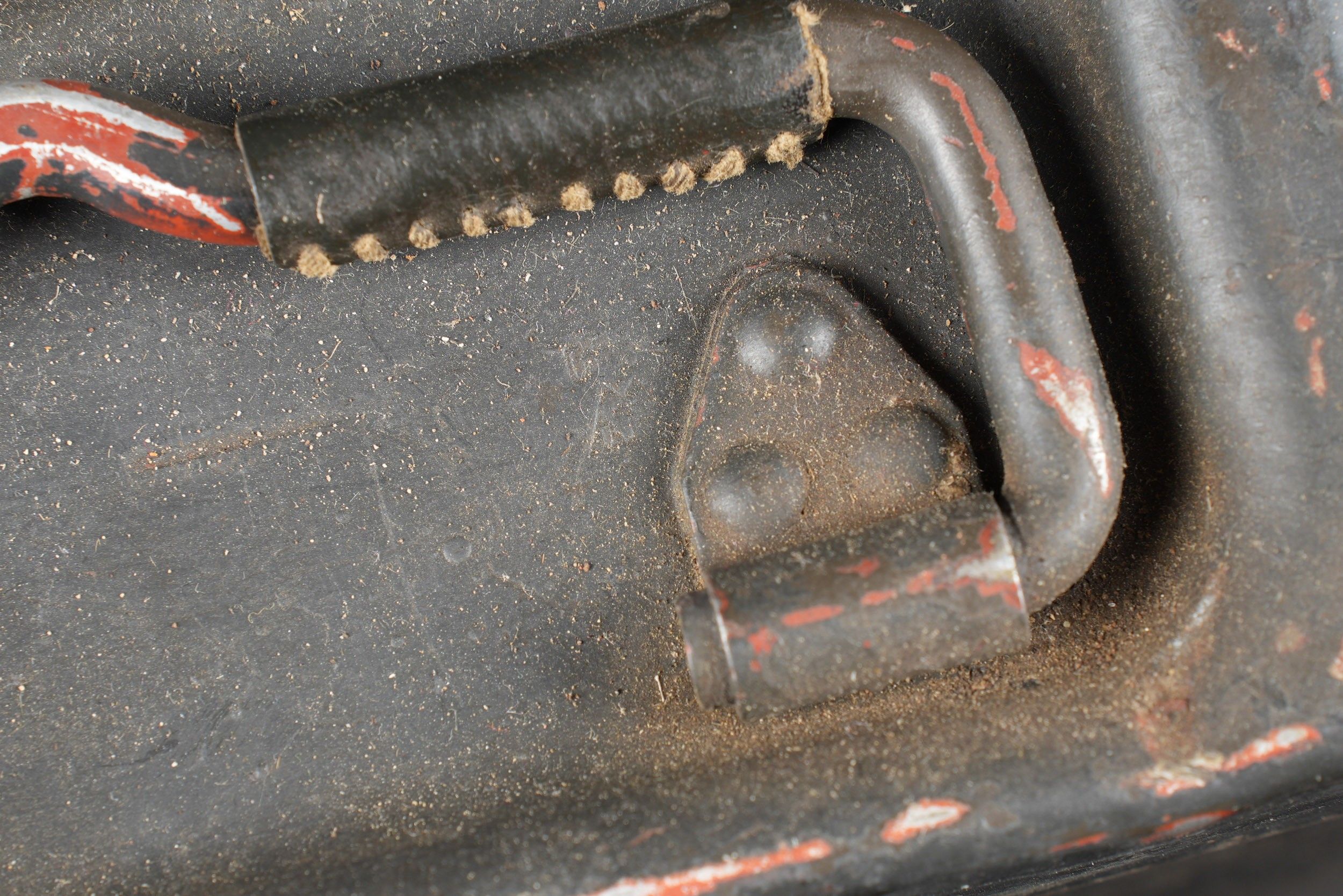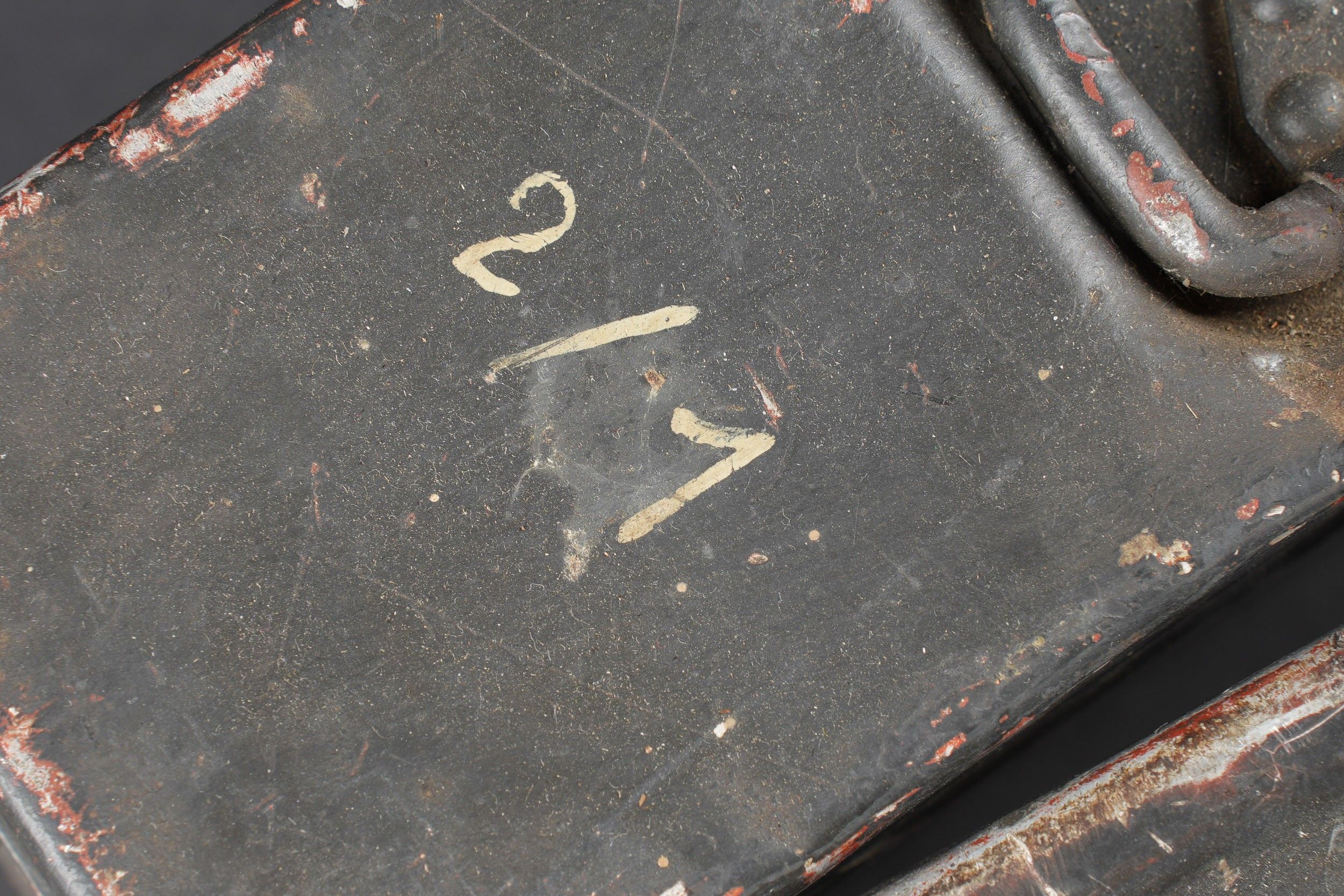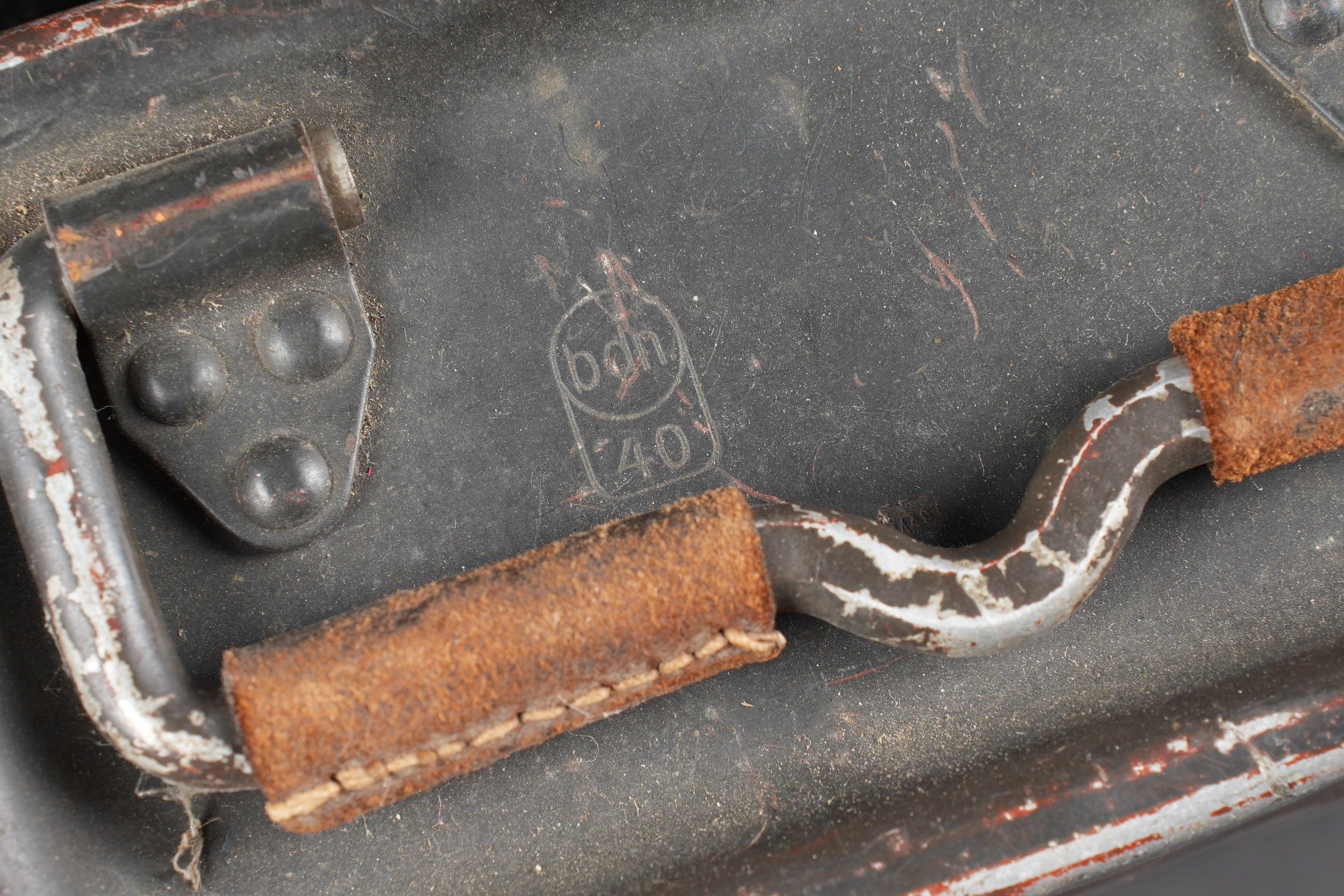 MG 3442 bodies. Comprising an MG aluminium body, 60% paintwork. The leather handle reinforcements are present. The locking hook is functional. BDN 40 manufacture, some dents visible. One aluminium case, 80% paint. Markings 21 on the lid. The handle leather reinforcements are present. The locking hook is functional. Dated 1940. Some wear and patina to parts. Condition II+. MG 3442 ammunition boxes. Includes one aluminium box retaining 60% of its paint, with leather handle reinforcements present and functional closure latch. Marked BDN 40 with a few visible dents. Another aluminium box with 80% paint, lid marked 21, leather handle reinforcements intact, and functional latch. Dated 1940. Some wear and patina on the pieces. Condition II+