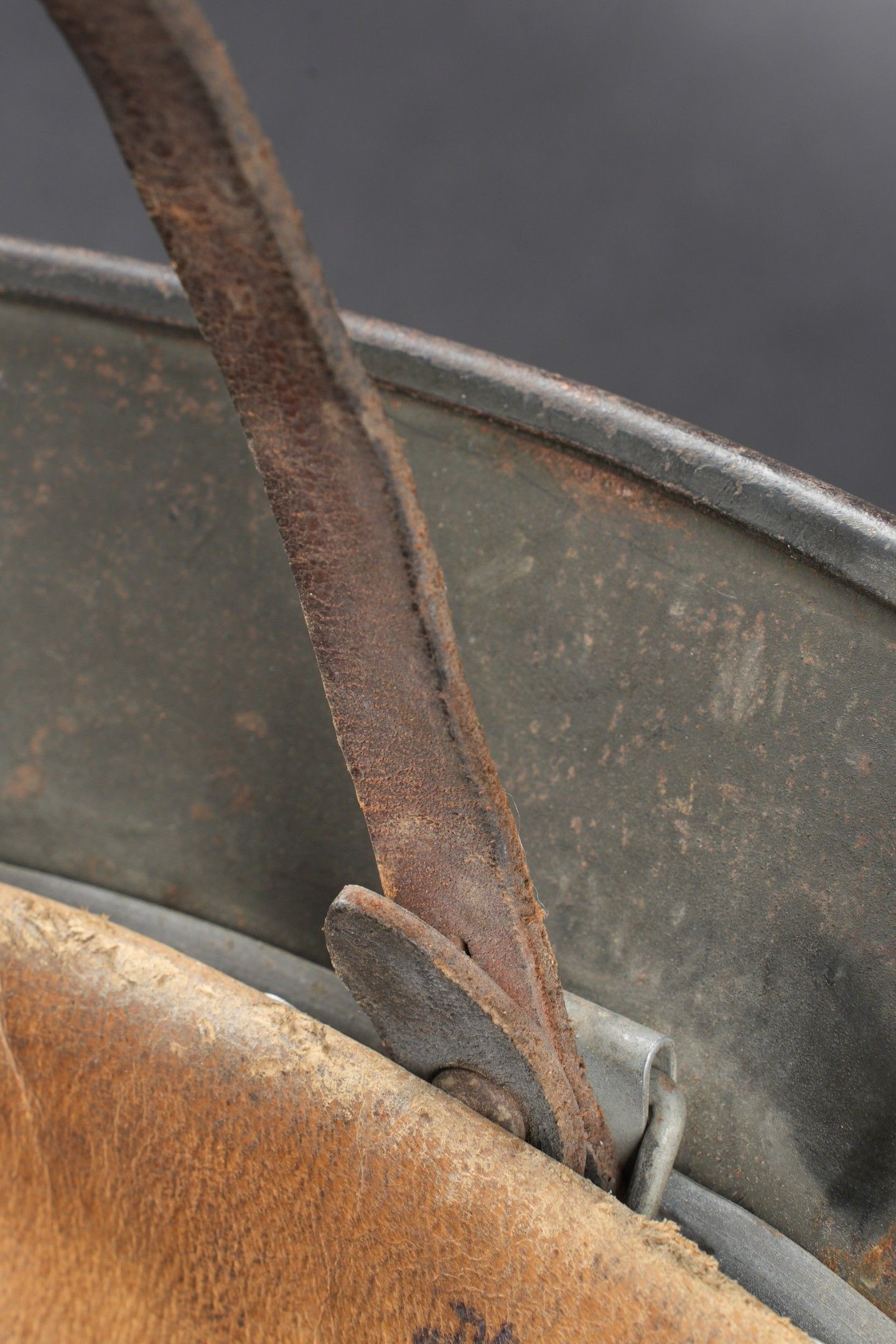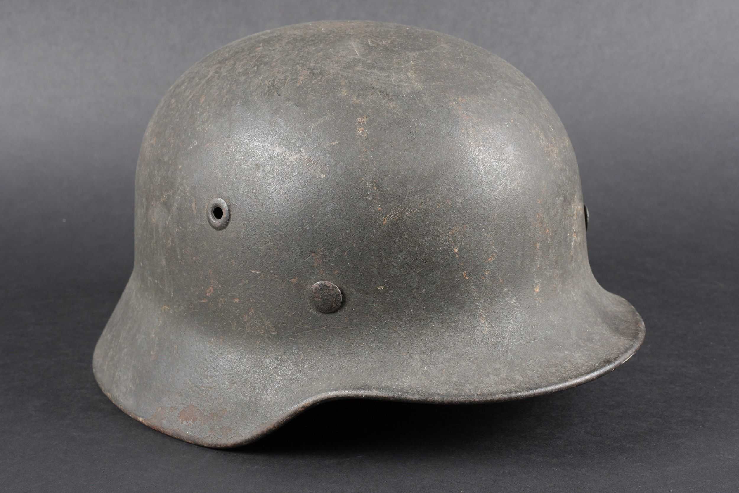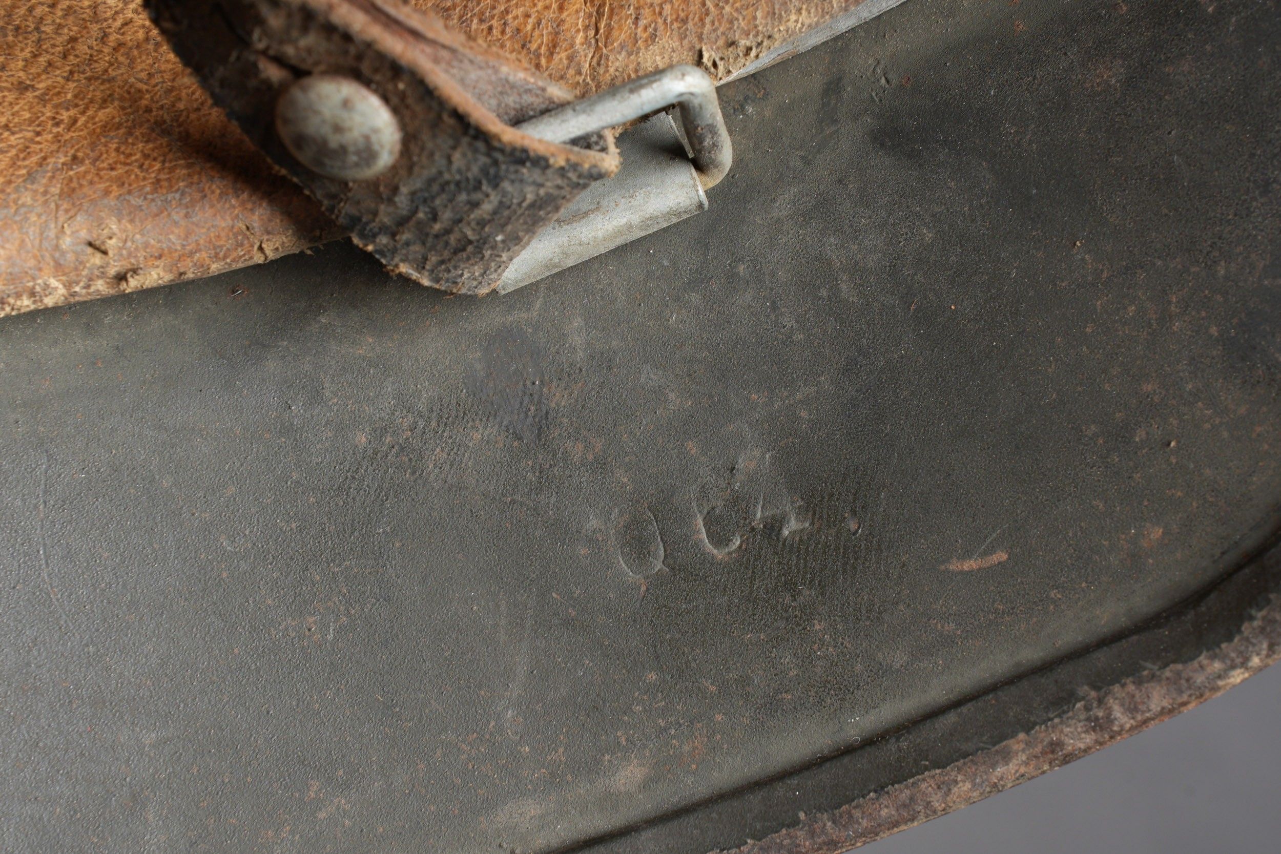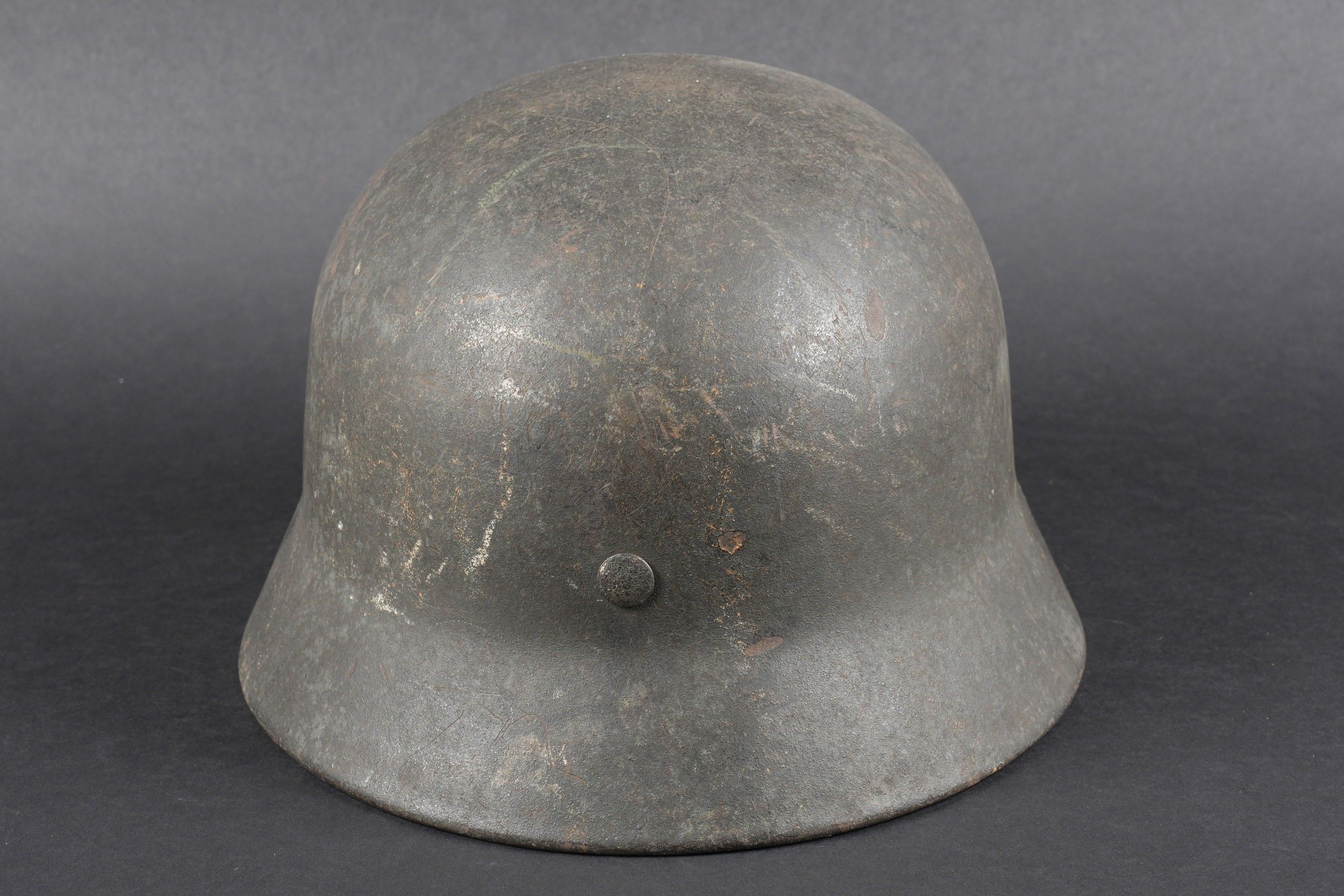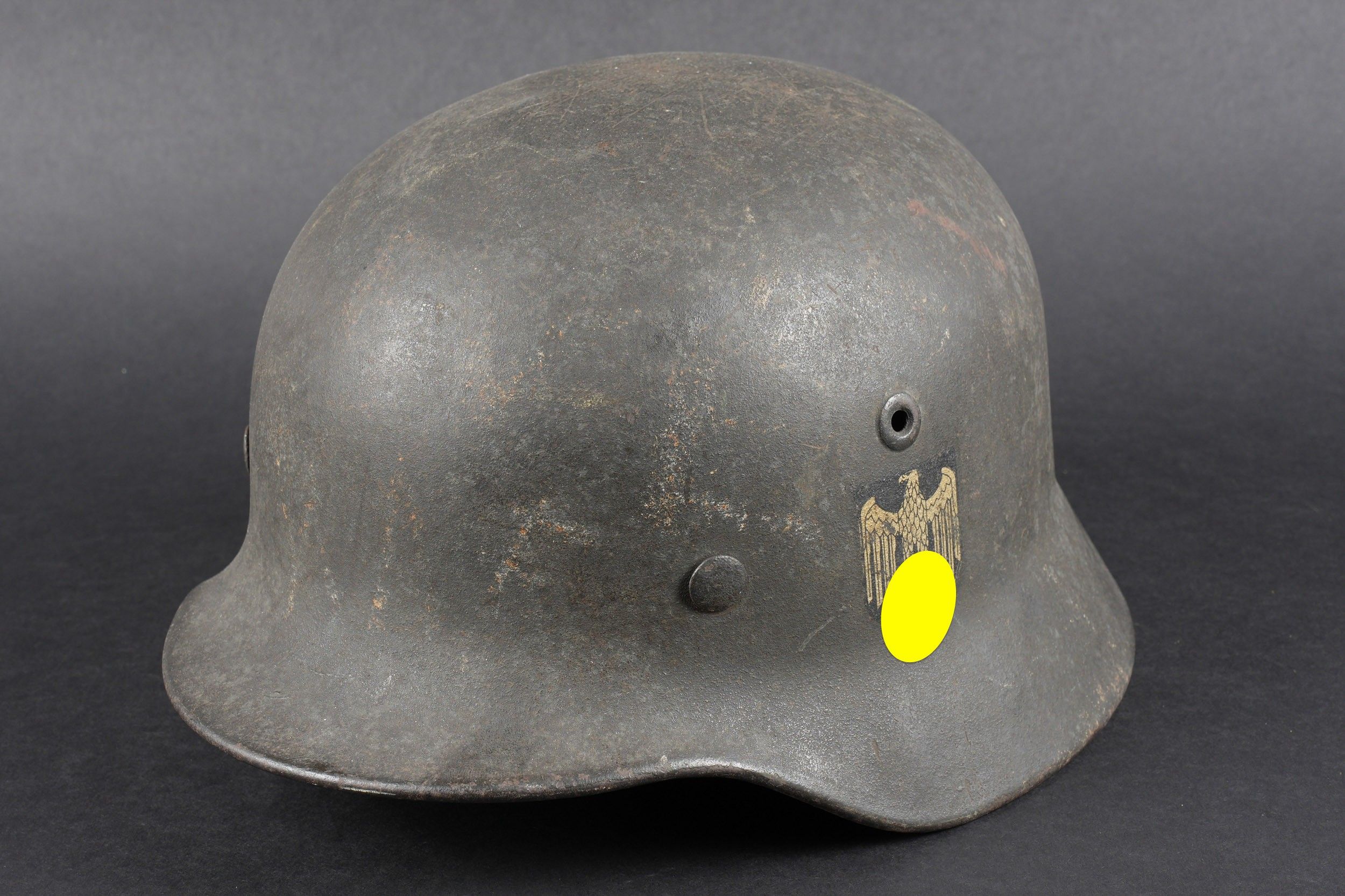 Heer helmet. M-40 helmet shell. Manufactured by Q64, lot number T610. Complete leather cap. Drawstring present. Illegible name inscription on cap. Exterior paintwork 90%. Heer eagle at 90%. Complete leather chinstrap, marked DLA 41. Some wear and patina. Condition II+. Heer helmet, M40 shell. Maker Q64, lot number T610. Complete leather liner with drawstring present. Name inscription illegible inside the liner. 90% of original exterior paint. Heer decal 90% visible. Complete leather chinstrap marked DLA 41. Some wear and patina on the piece. Condition II+