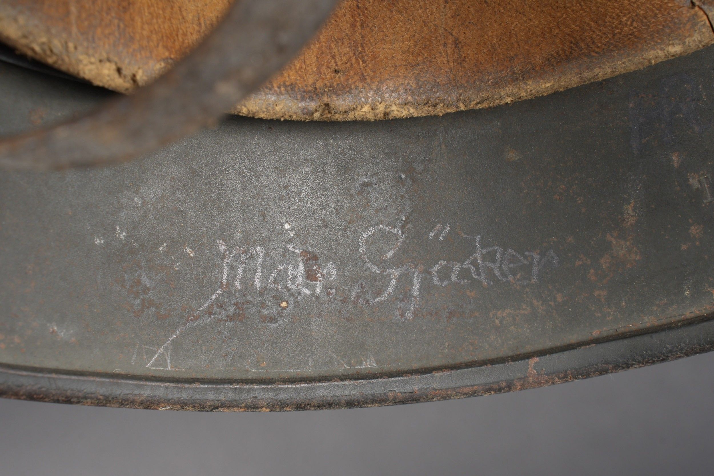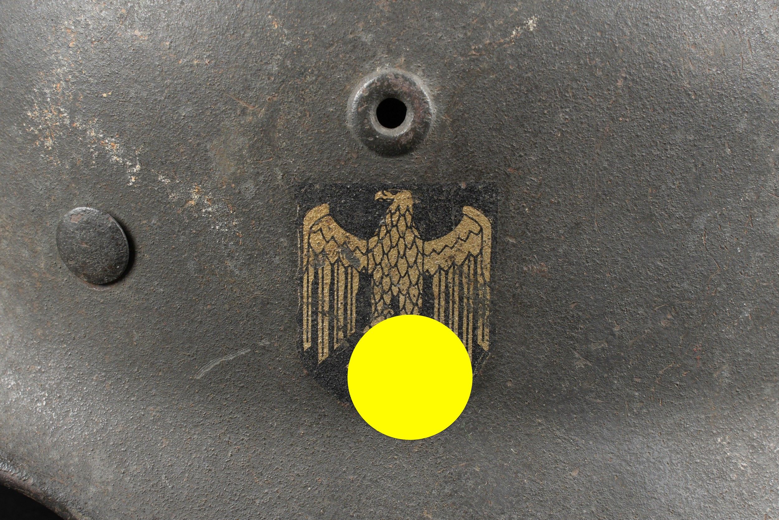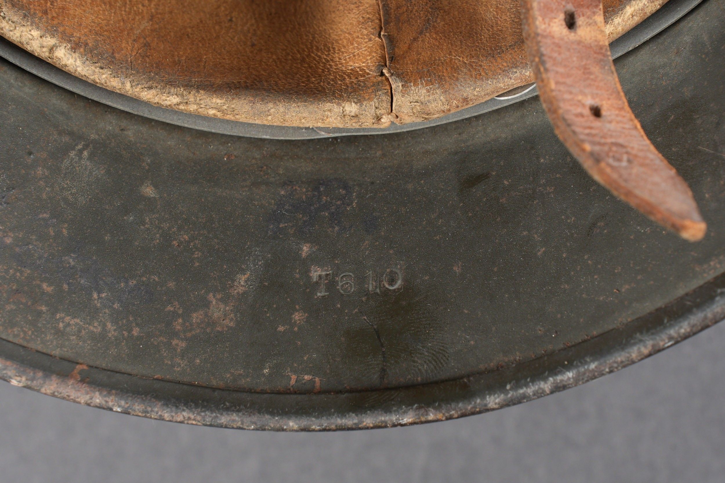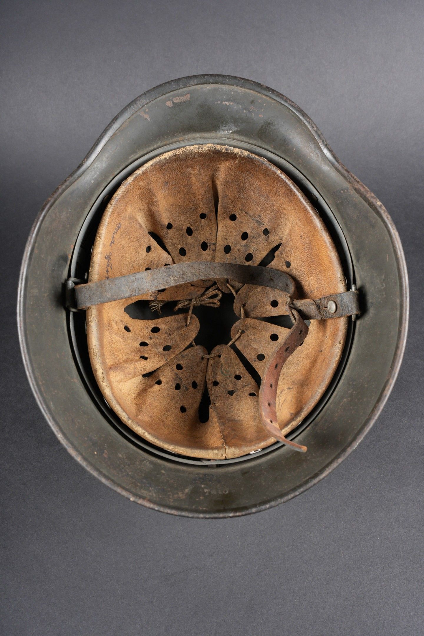 Heer helmet. M-40 helmet shell. Manufactured by Q64, lot number T610. Complete leather cap. Drawstring present. Illegible name inscription on cap. Exterior paintwork 90%. Heer eagle at 90%. Complete leather chinstrap, marked DLA 41. Some wear and patina. Condition II+. Heer helmet, M40 shell. Maker Q64, lot number T610. Complete leather liner with drawstring present. Name inscription illegible inside the liner. 90% of original exterior paint. Heer decal 90% visible. Complete leather chinstrap marked DLA 41. Some wear and patina on the piece. Condition II+