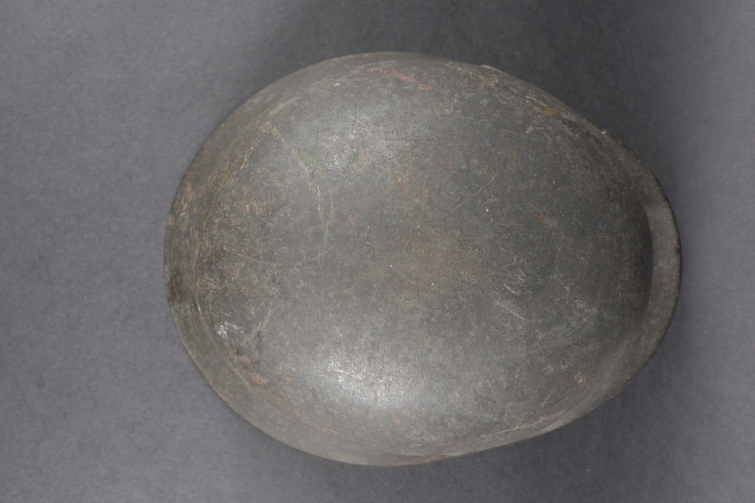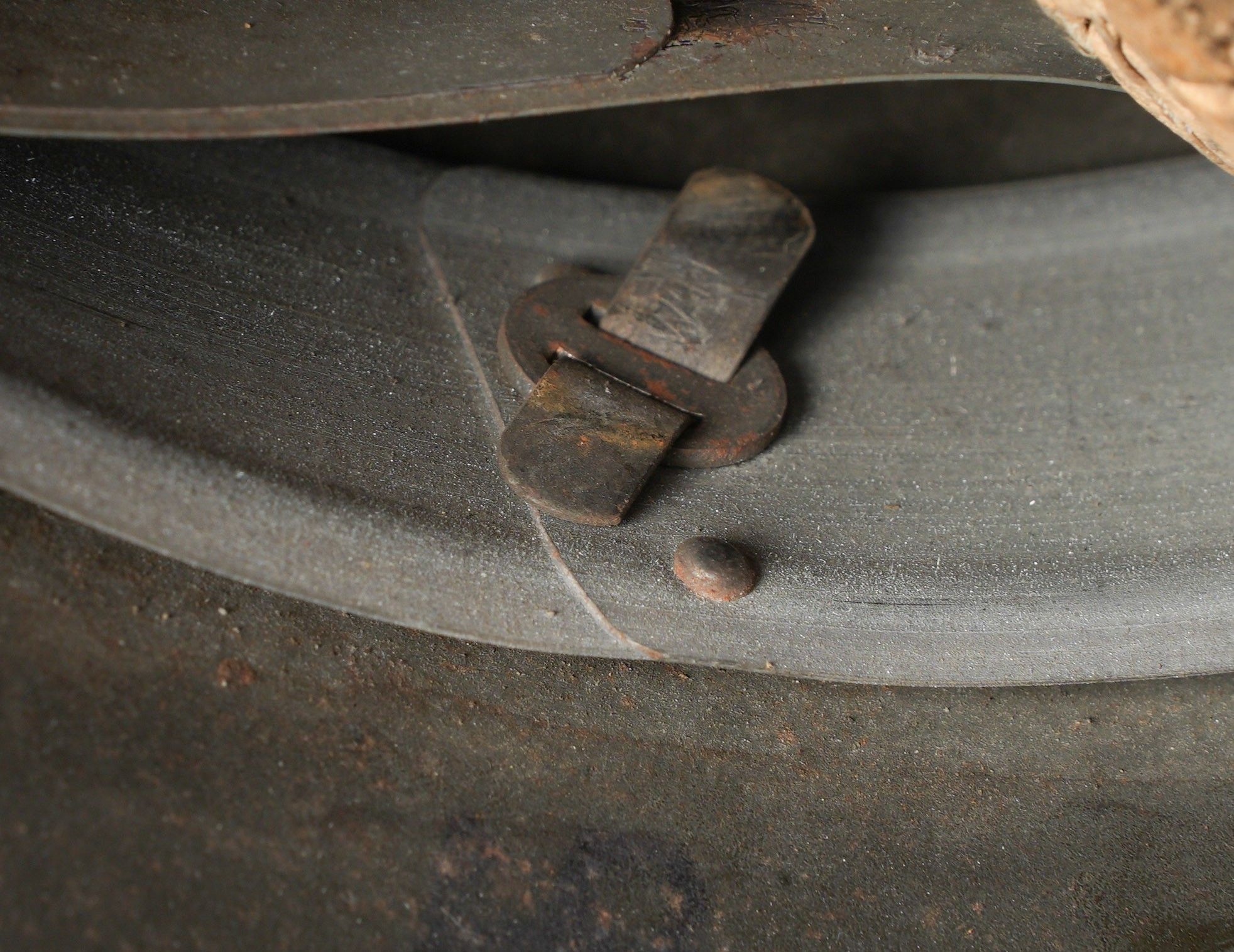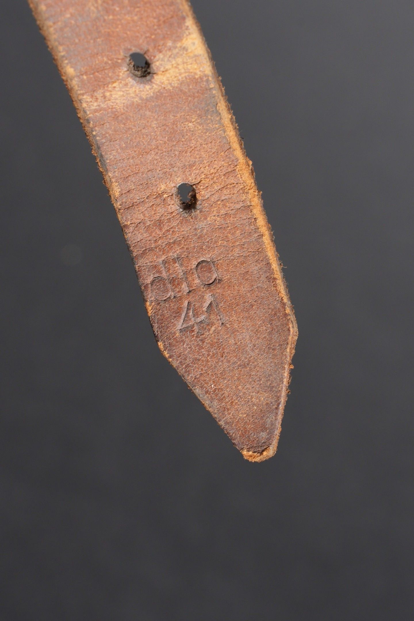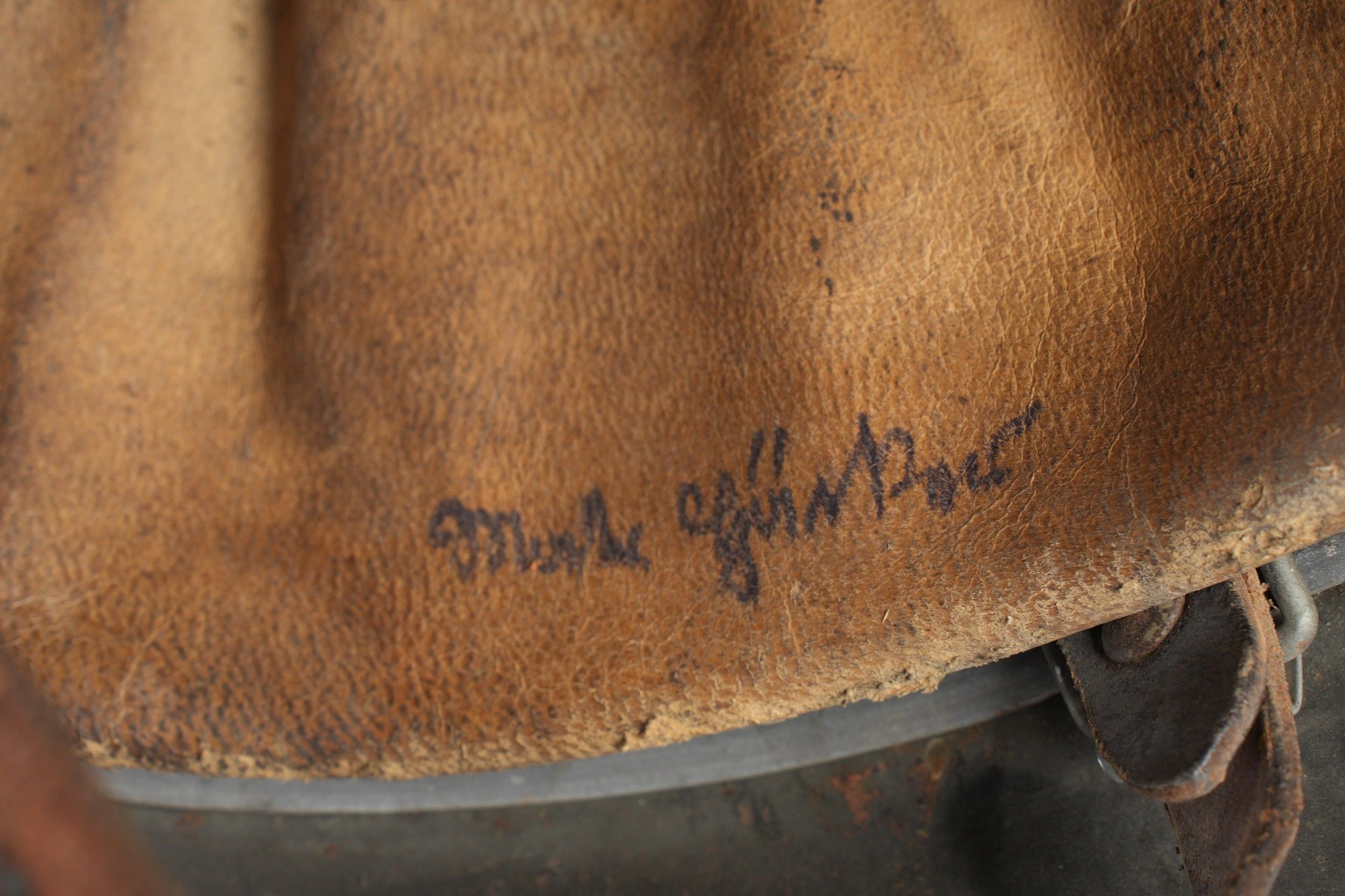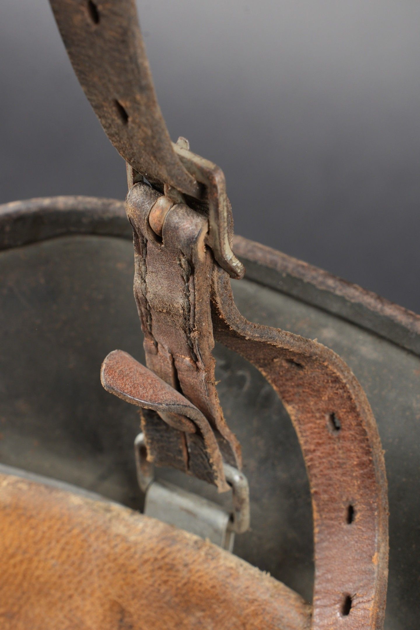 Heer helmet. M-40 helmet shell. Manufactured by Q64, lot number T610. Complete leather cap. Drawstring present. Illegible name inscription on cap. Exterior paintwork 90%. Heer eagle at 90%. Complete leather chinstrap, marked DLA 41. Some wear and patina. Condition II+. Heer helmet, M40 shell. Maker Q64, lot number T610. Complete leather liner with drawstring present. Name inscription illegible inside the liner. 90% of original exterior paint. Heer decal 90% visible. Complete leather chinstrap marked DLA 41. Some wear and patina on the piece. Condition II+