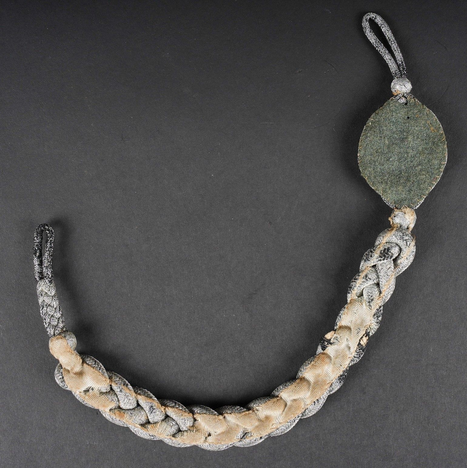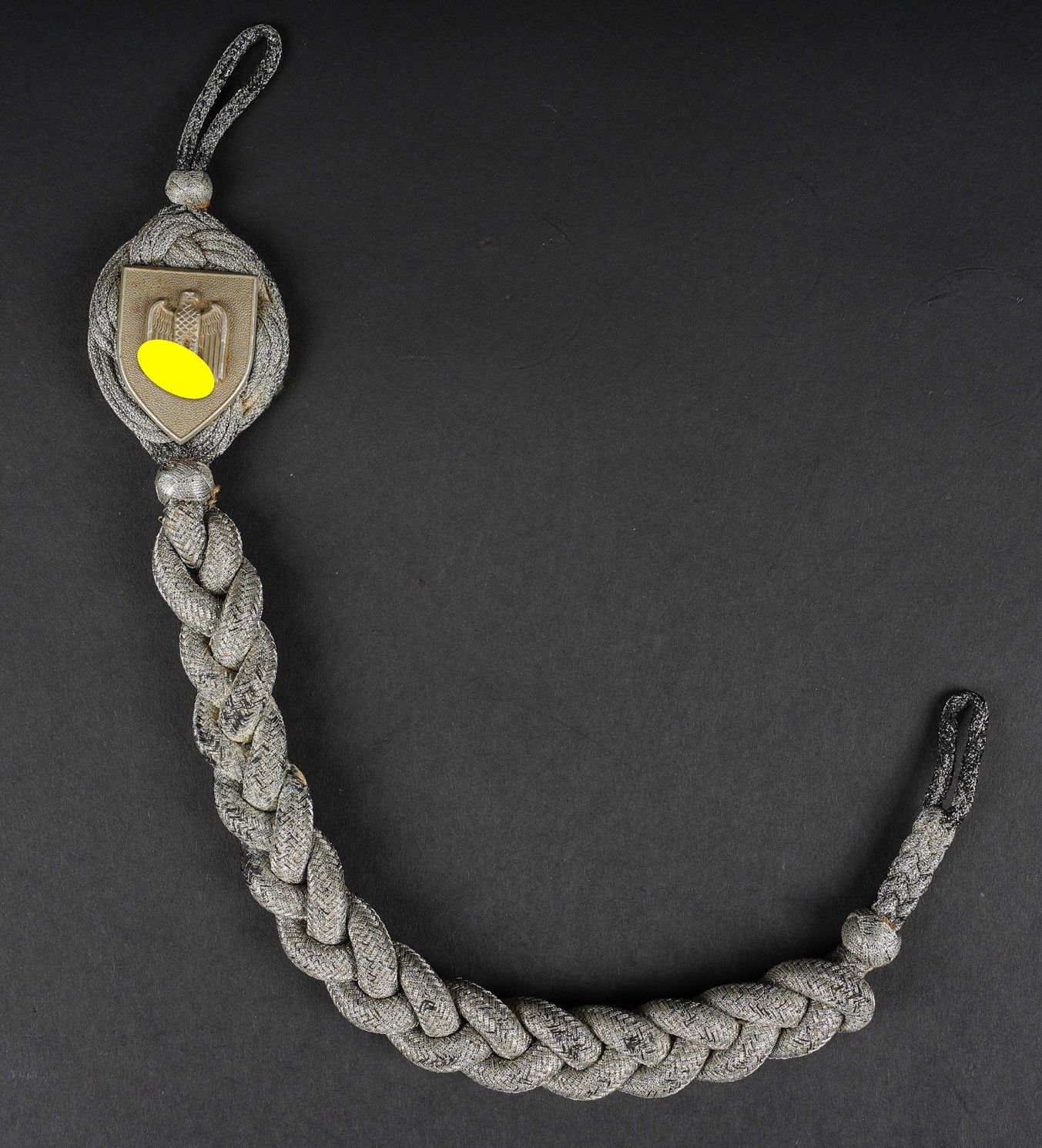Heer shooter's lanyard. Complete silver braid. Badge showing a Heer eagle in a shield. Back lined in white satinette and Feldgrau cloth. Some wear and patina to be noted. Condition II+. Heer marksman's lanyard. Complete silver braid with Heer eagle emblem on shield. Reverse lined with white satin and Feldgrau cloth. Some wear and patina on the piece. Condition II+