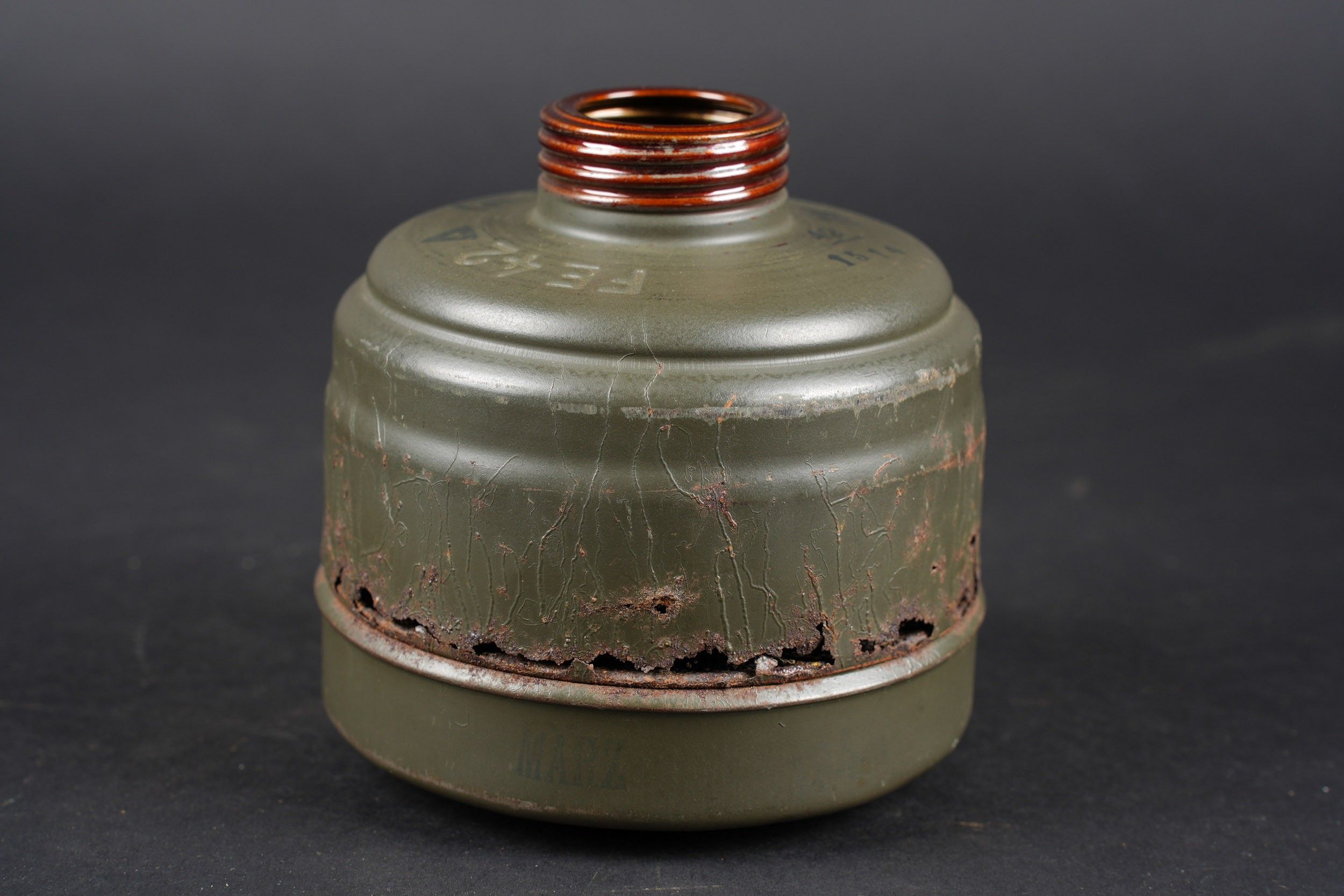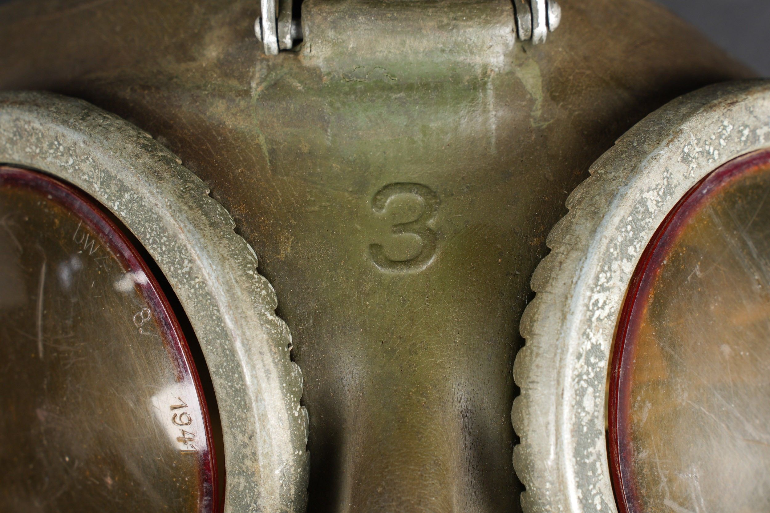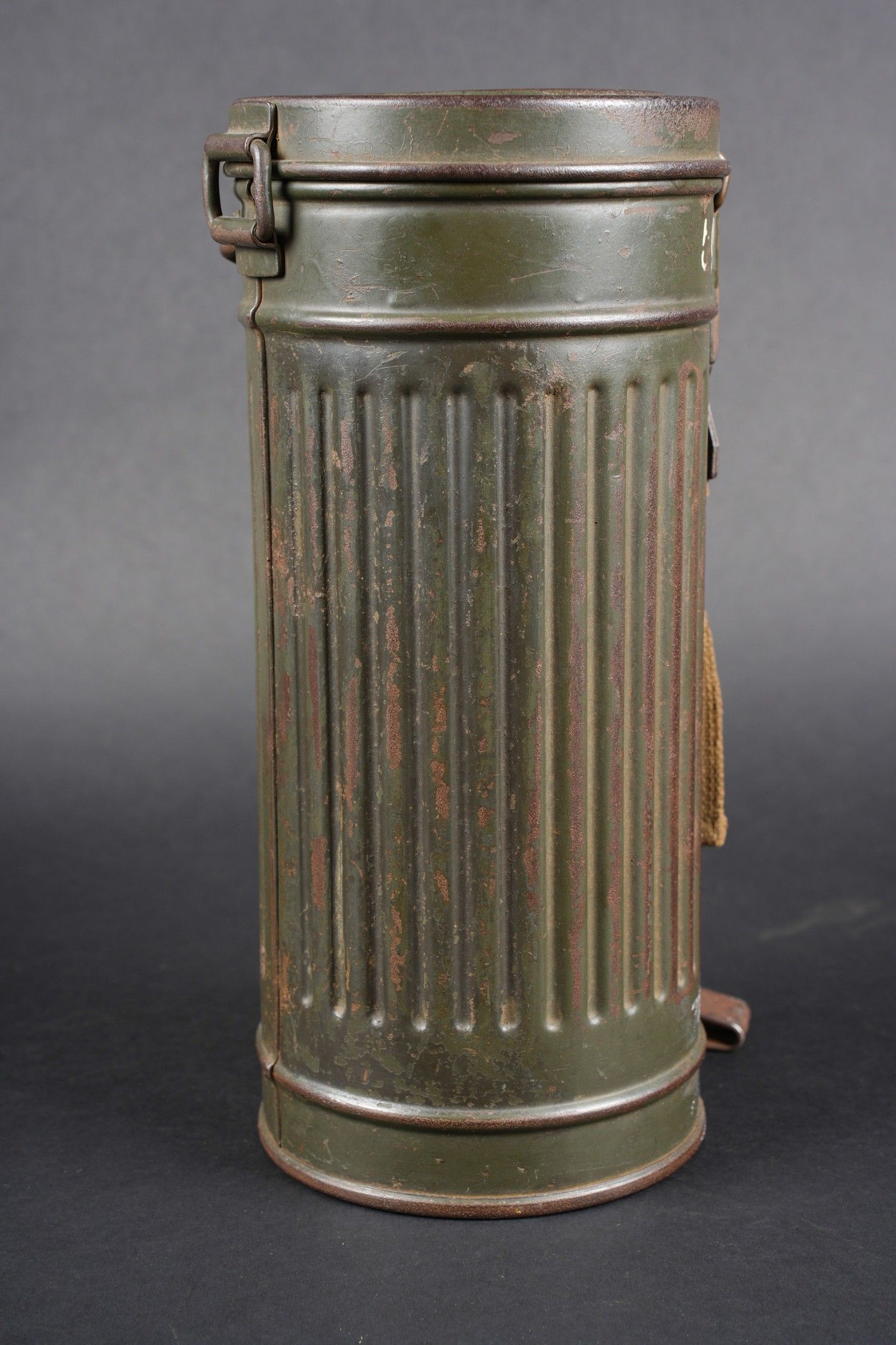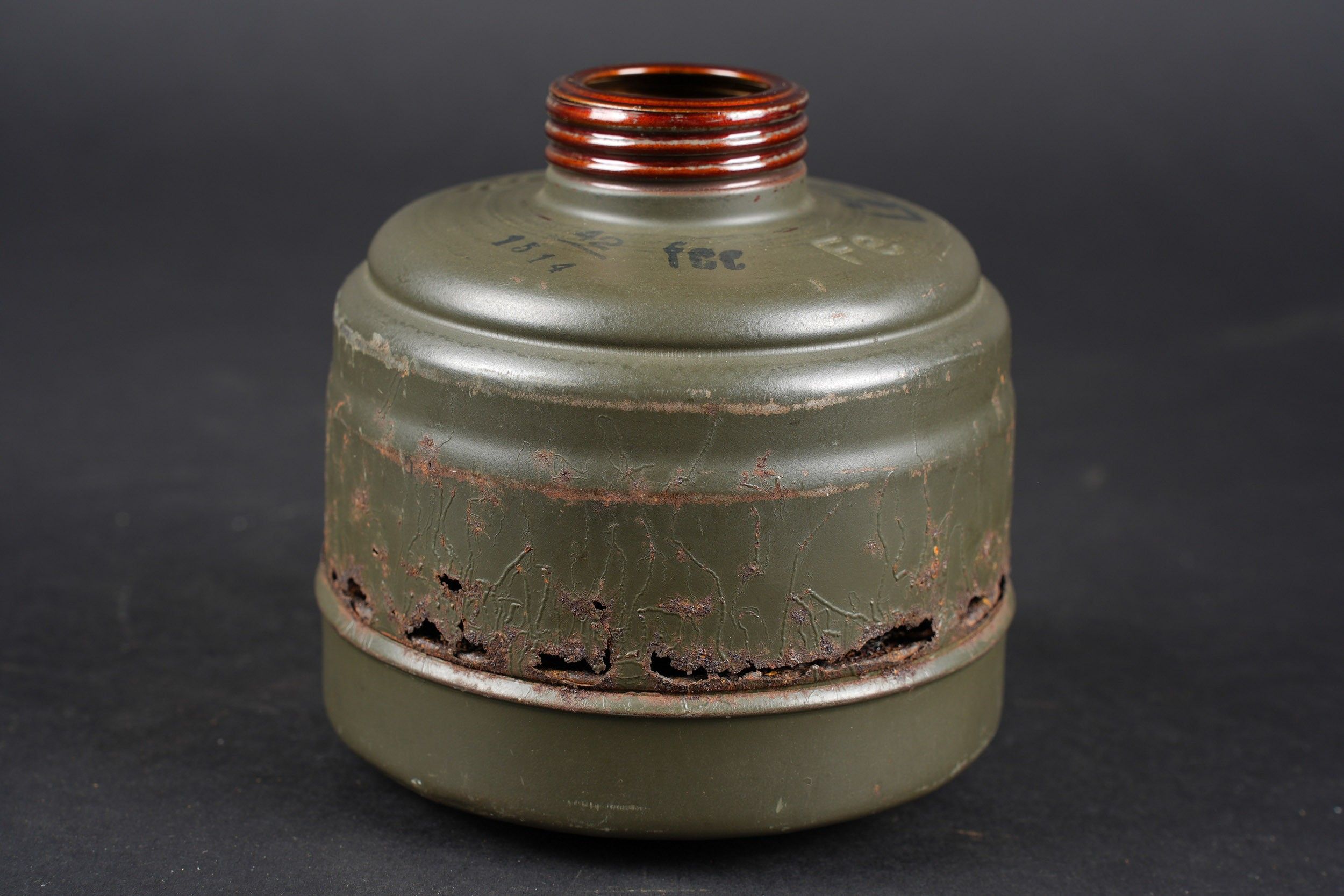 German anti-gas mask. Long metal case. 80% Feldgrau paint. Only the lid is oxidised with a few dents. Pull tab complete. Small strap present. The large strap is missing. Number 690 painted on the side of the case. Unreadable name indication in pencil on the spare lenses case. Spare lenses are present. Very soft rubber mask, size 3. All straps are present. Filter with traces of oxidation and missing edges. Dated 1942. Some wear and patina. Condition II+. German gas mask with long metal canister retaining 80% of original Feldgrau paint. Lid slightly oxidized with a few teeth. Pull tab complete. Small strap present, large carrying strap missing. Number 690 painted on side of canister. Illegible pencil-written name on spare lens compartment. Spare lenses included. Rubber mask, very supple, size 3, with all straps present. Filter shows oxidation and edge loss. Dated 1942. Some wear and patina on the piece. Condition II+